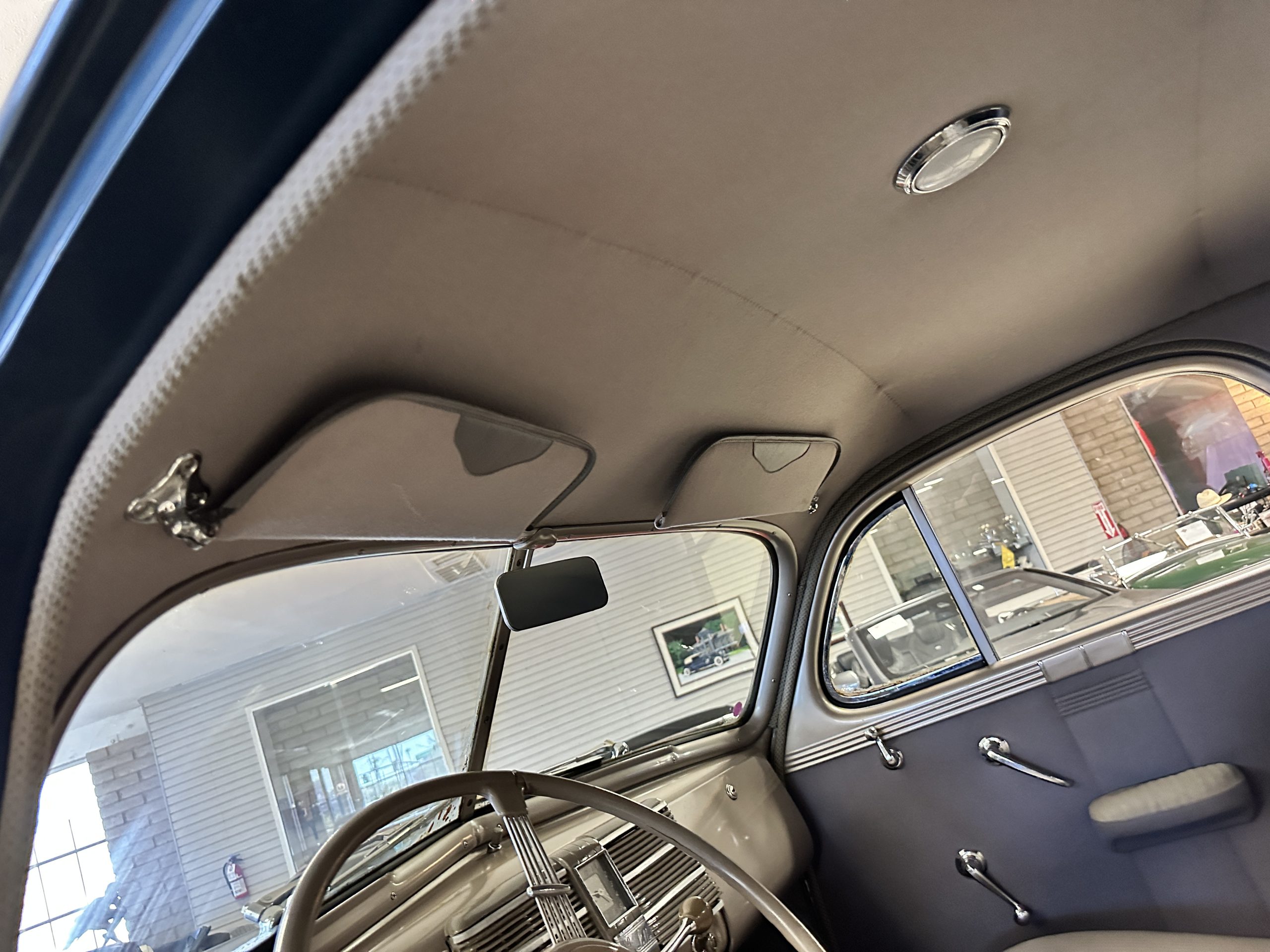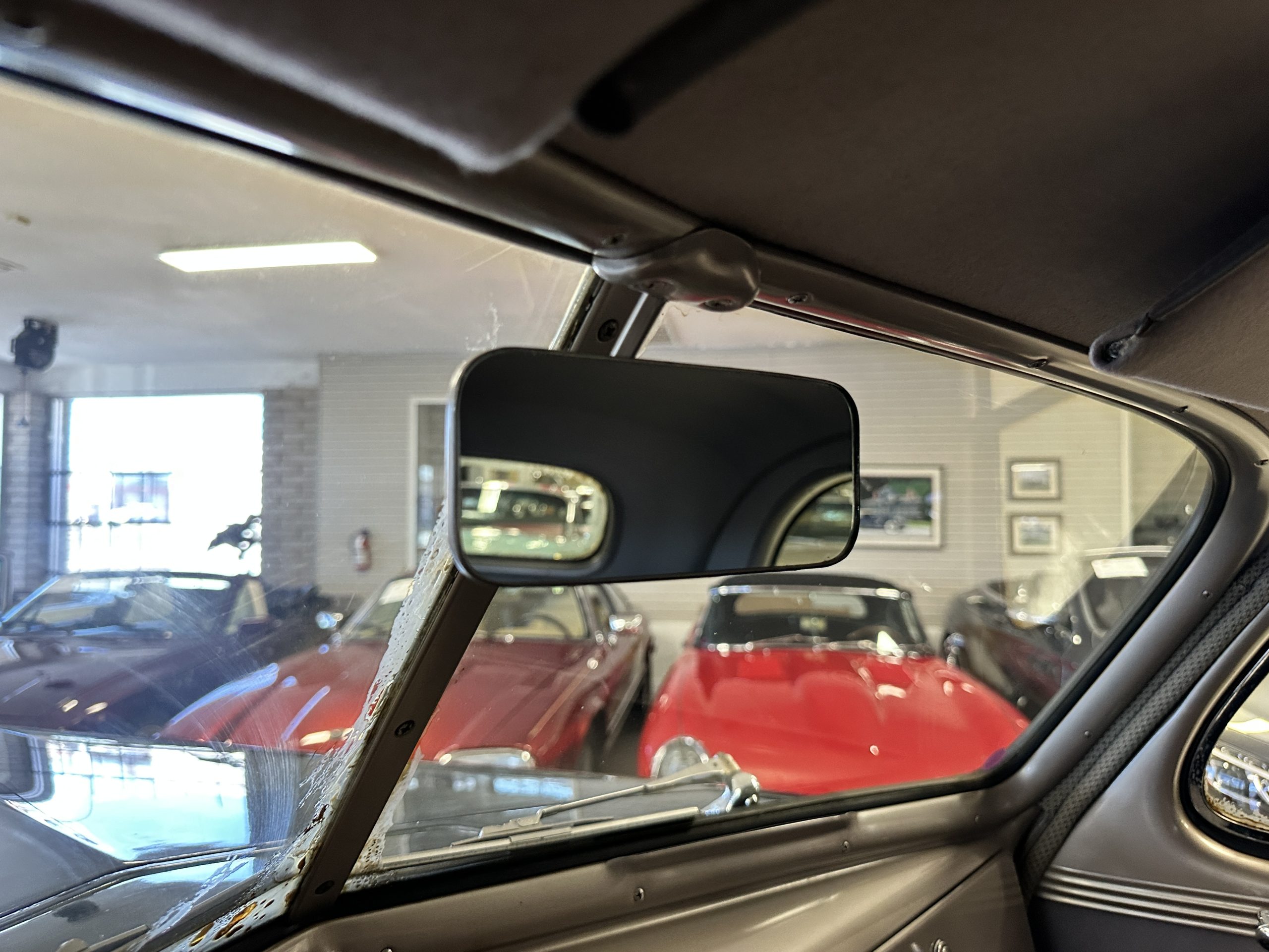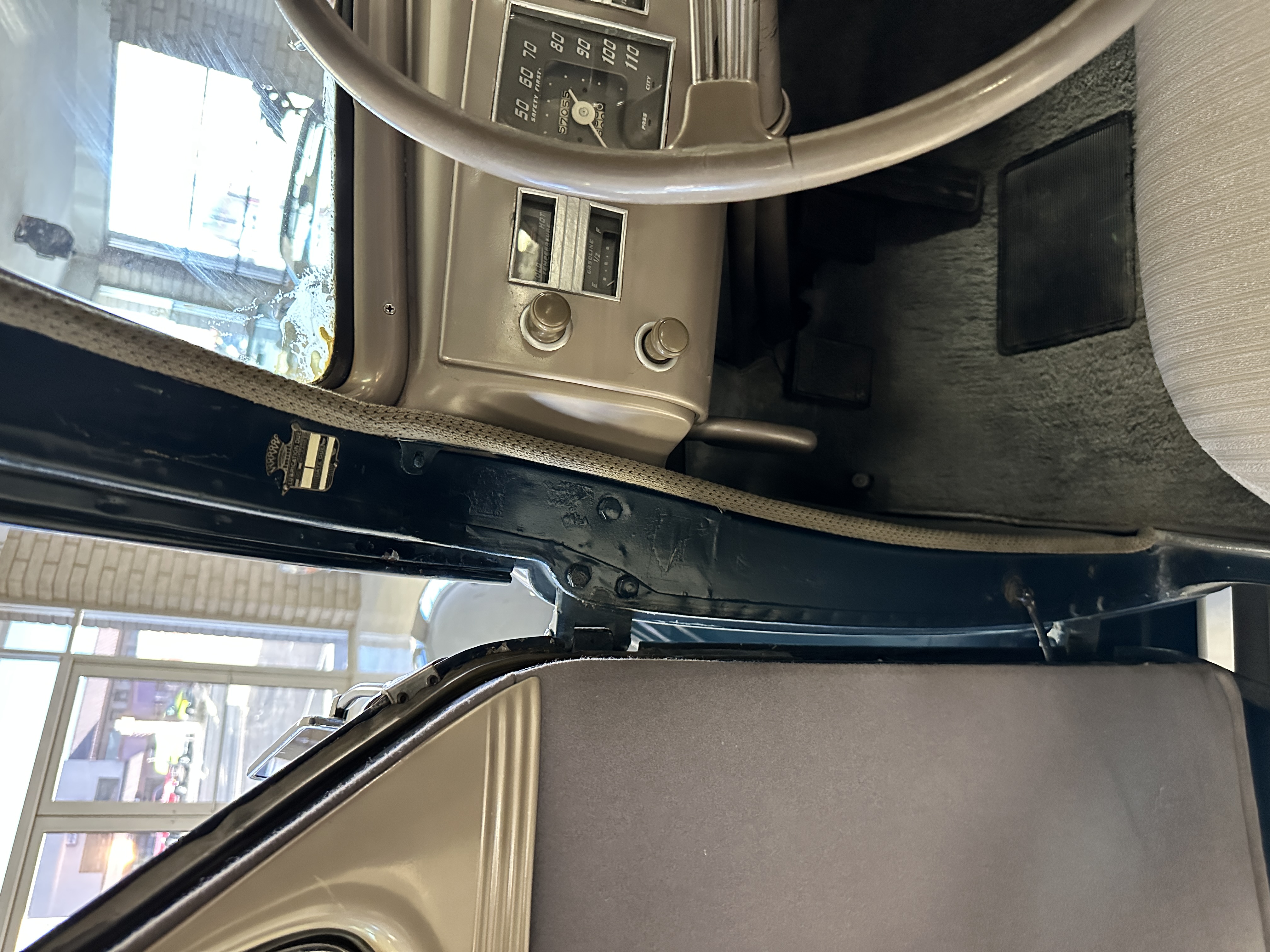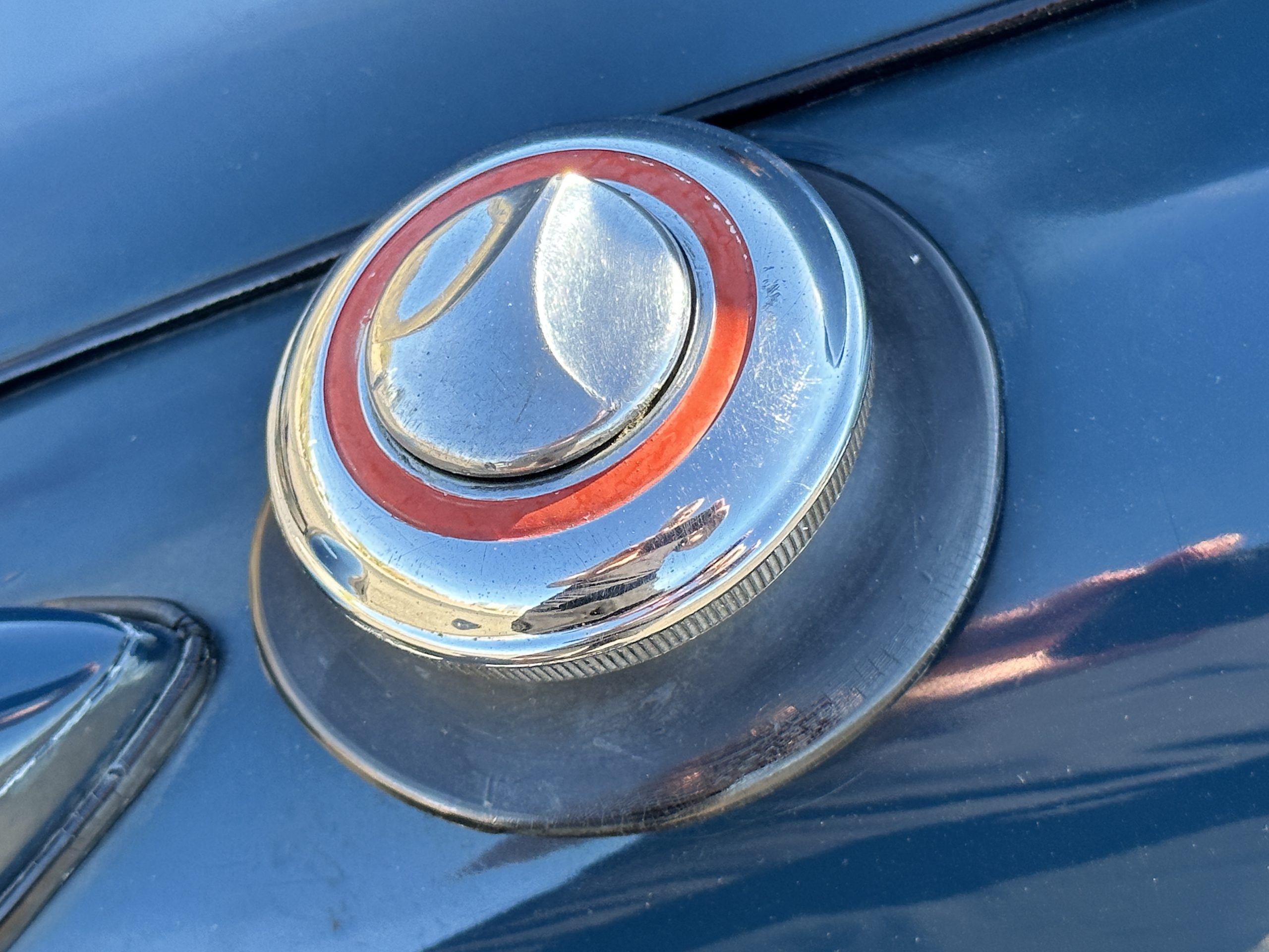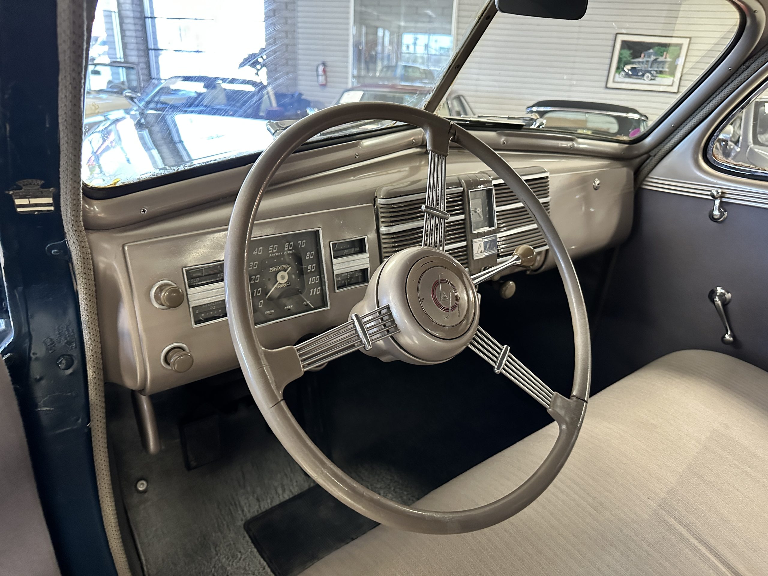 The livery is presented in Fairhaven Blue (Paint Code 11) and was repainted years ago in lacquer. There are areas of the paint where there is the normal lacquer cracking and a few small areas where the paint has peeled away. Most of the chrome is original and has light pitting. The bumpers and door handles have been re-chromed and look nice. We love the long front end devoid of side mounted tires. This makes the front end appear much longer and gives it a very sexy profile. The split windshield also gives it a fast look. Overall, the exterior is in tour quality condition enabling it to be shown at local car shows.