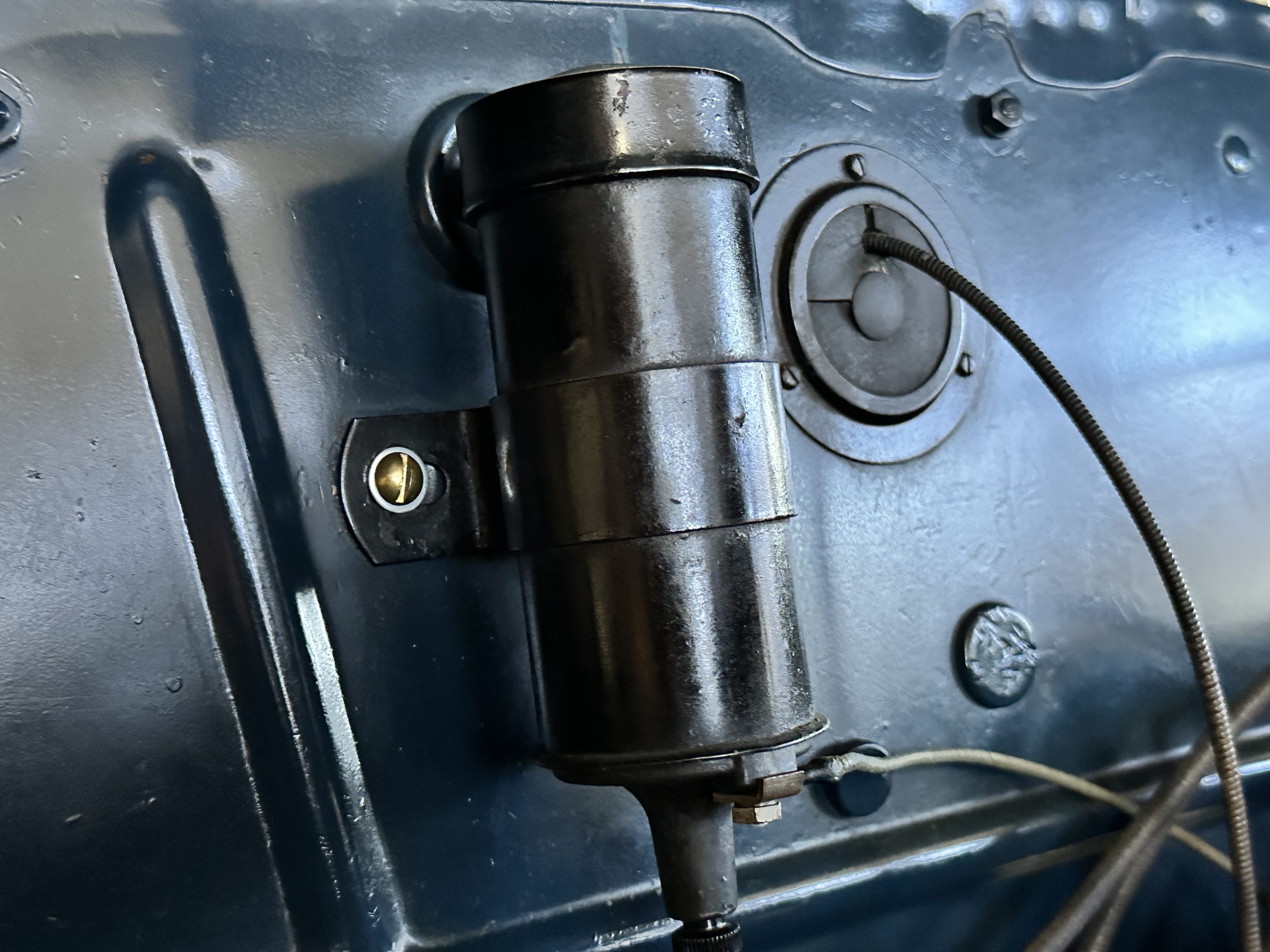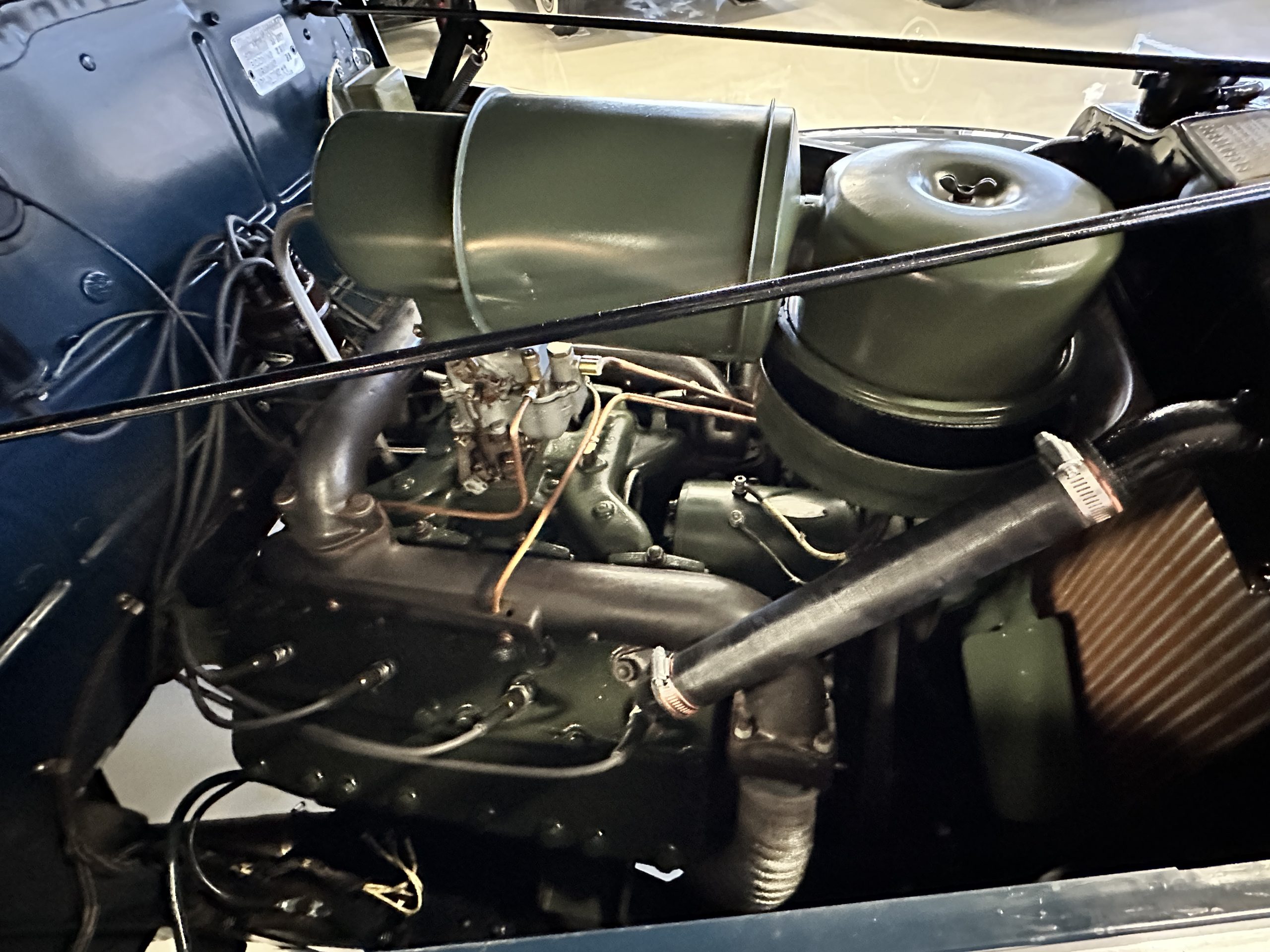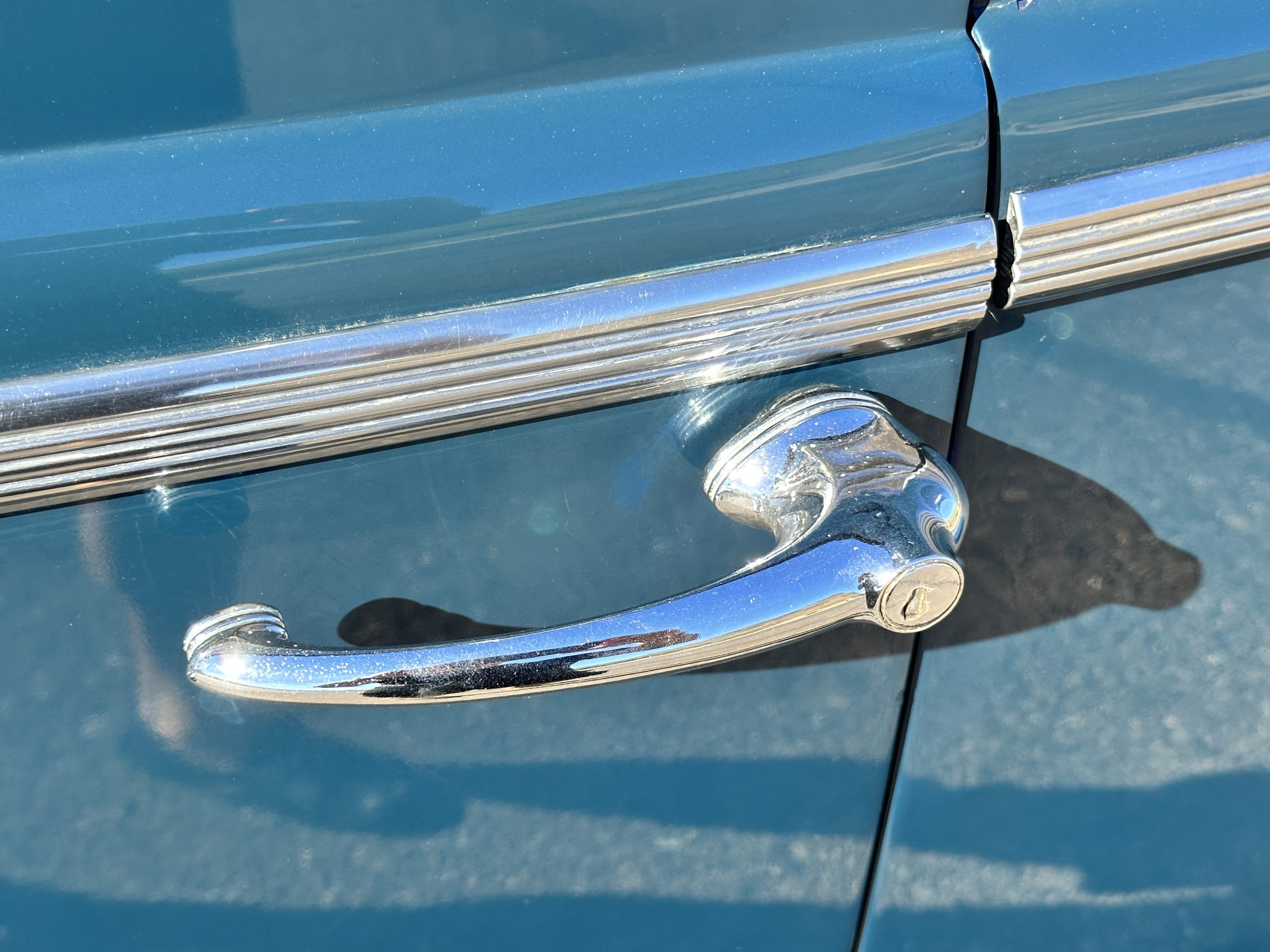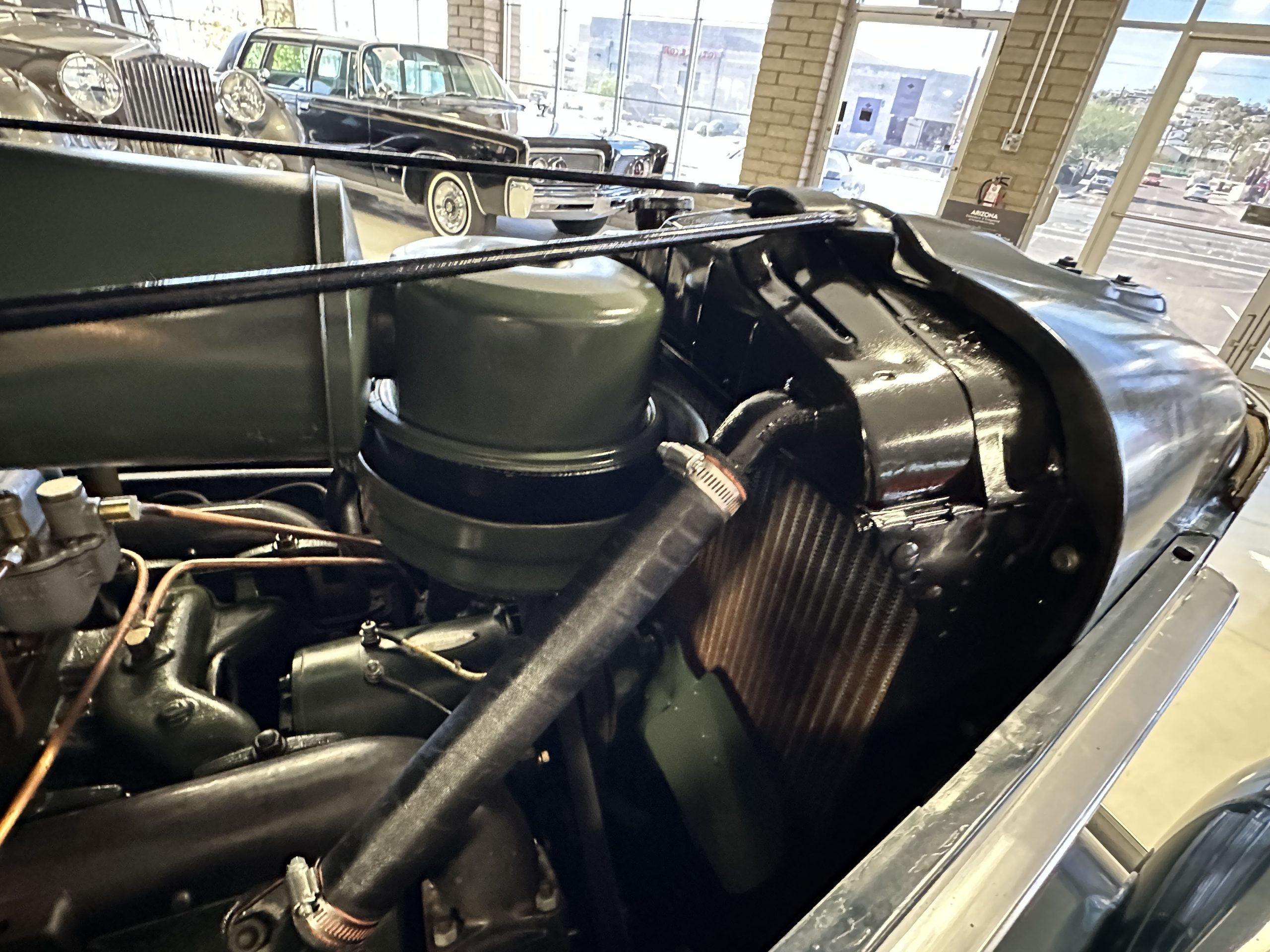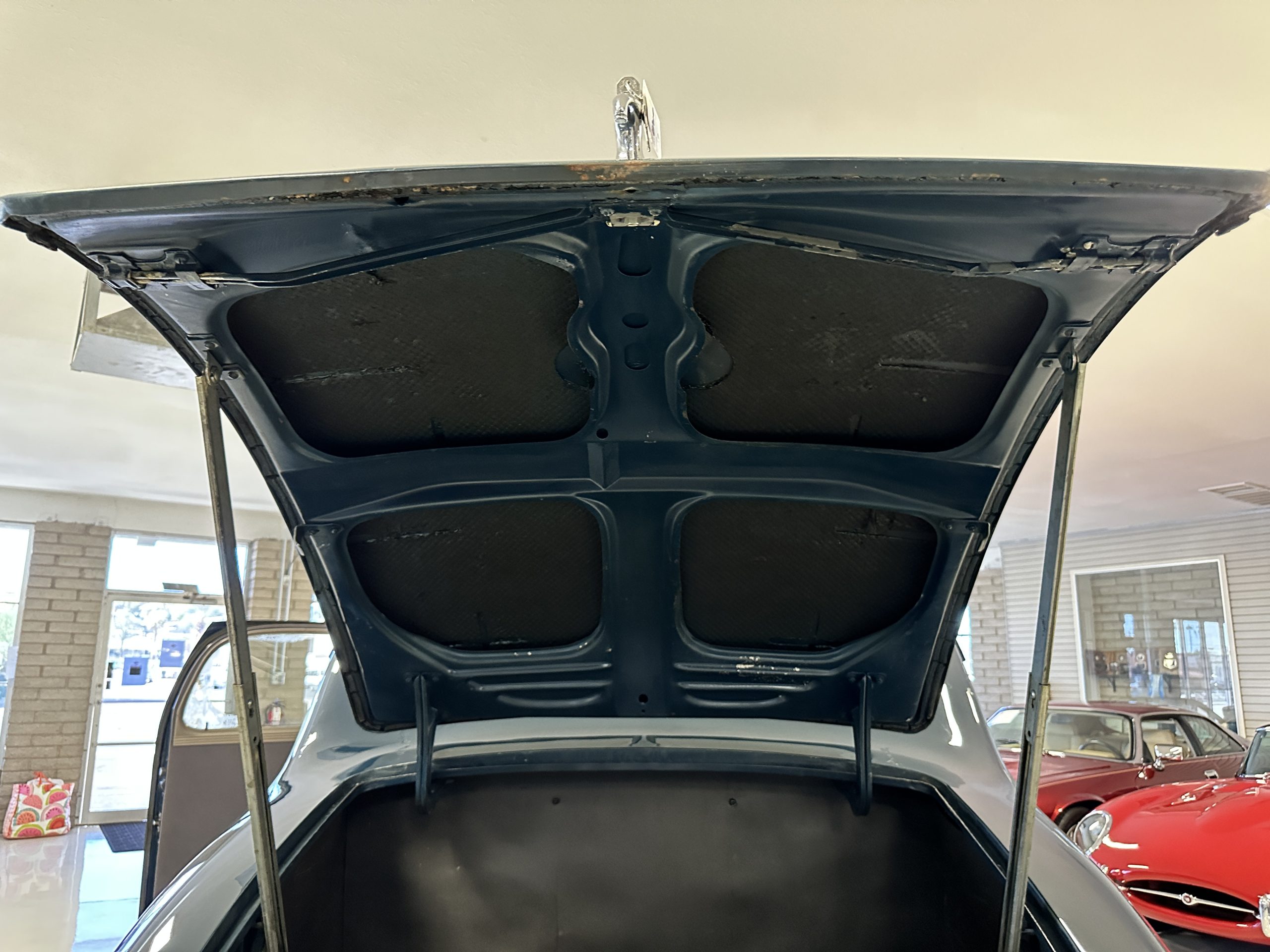 The livery is presented in Fairhaven Blue (Paint Code 11) and was repainted years ago in lacquer. There are areas of the paint where there is the normal lacquer cracking and a few small areas where the paint has peeled away. Most of the chrome is original and has light pitting. The bumpers and door handles have been re-chromed and look nice. We love the long front end devoid of side mounted tires. This makes the front end appear much longer and gives it a very sexy profile. The split windshield also gives it a fast look. Overall, the exterior is in tour quality condition enabling it to be shown at local car shows.