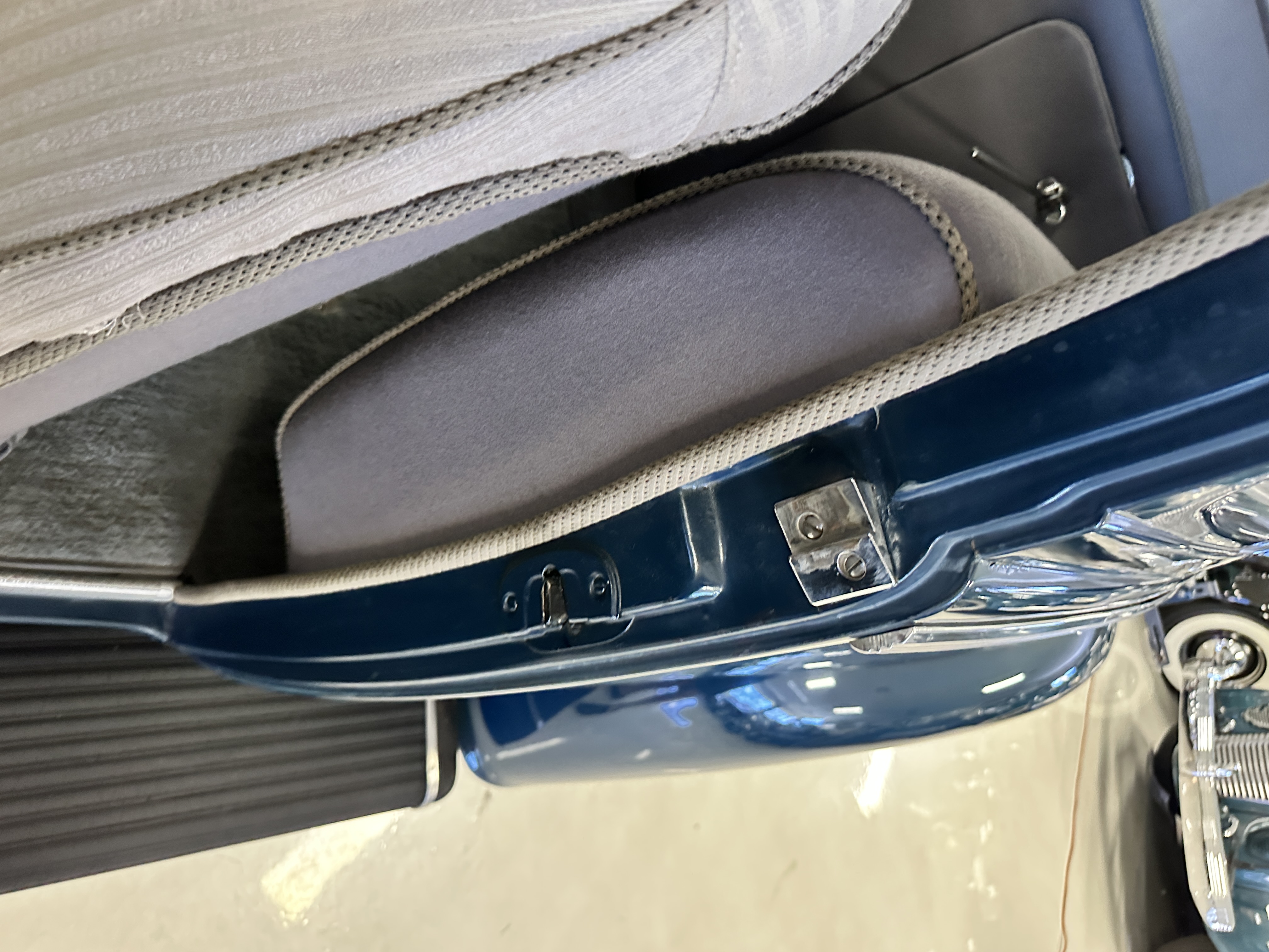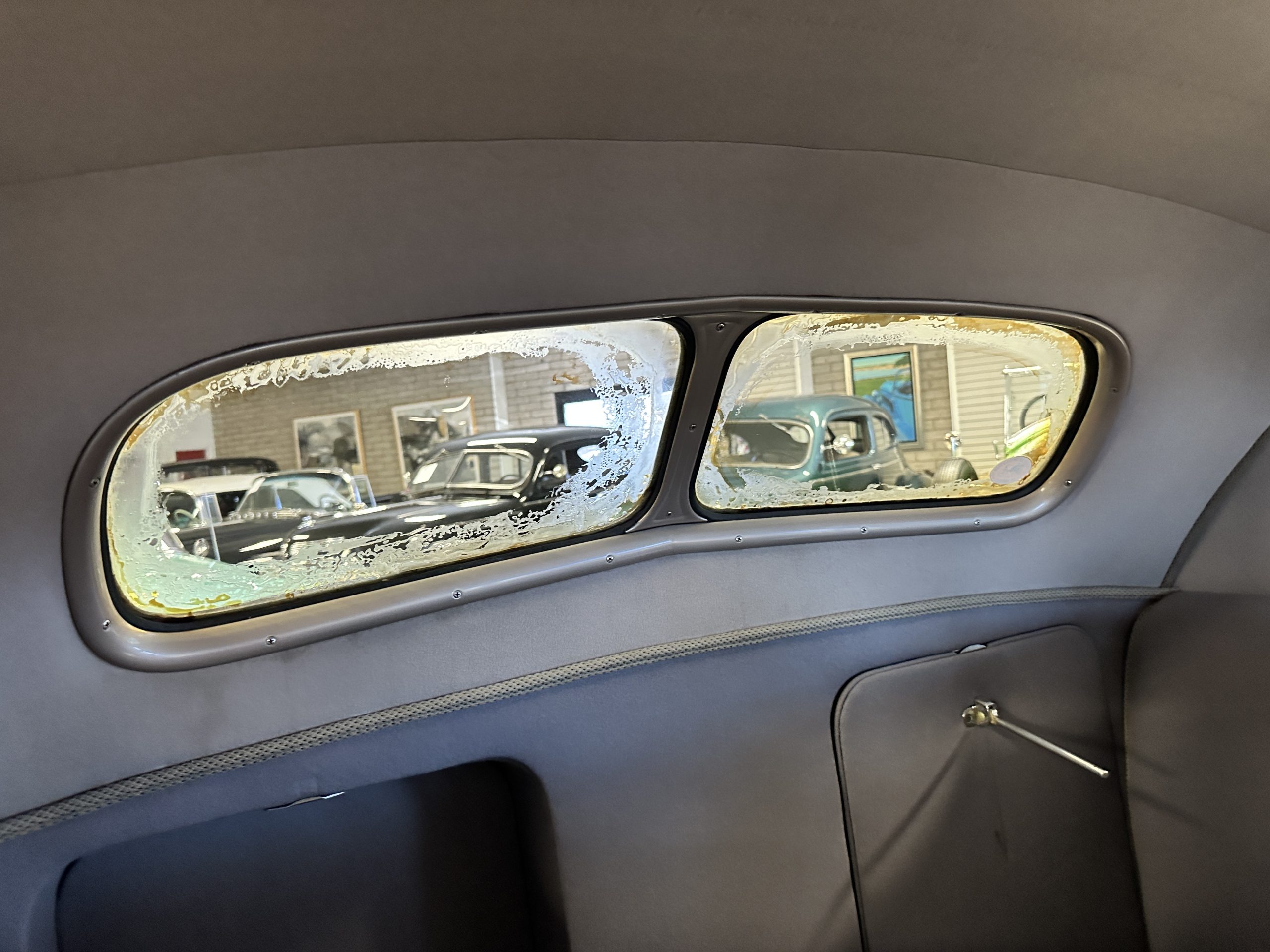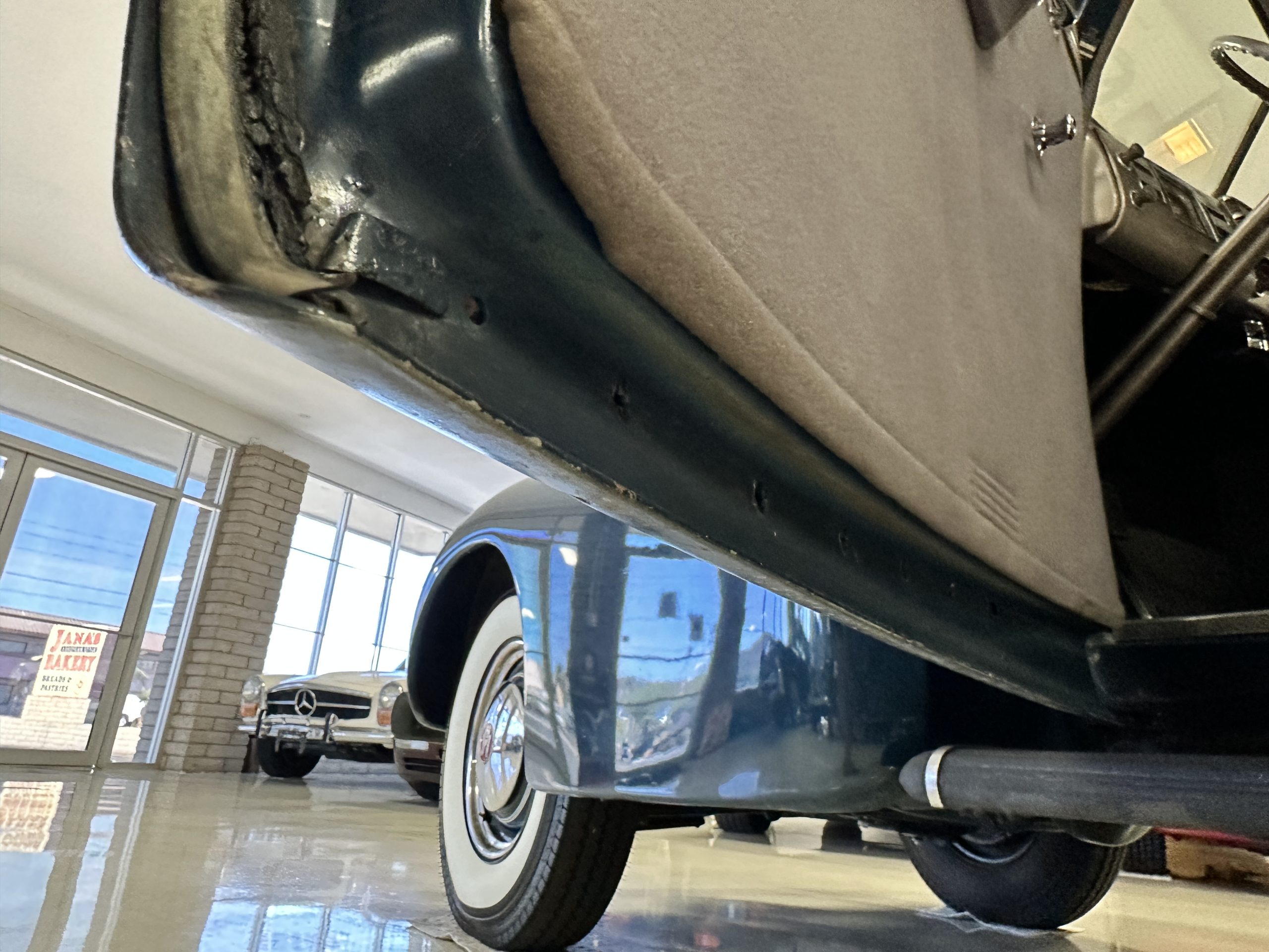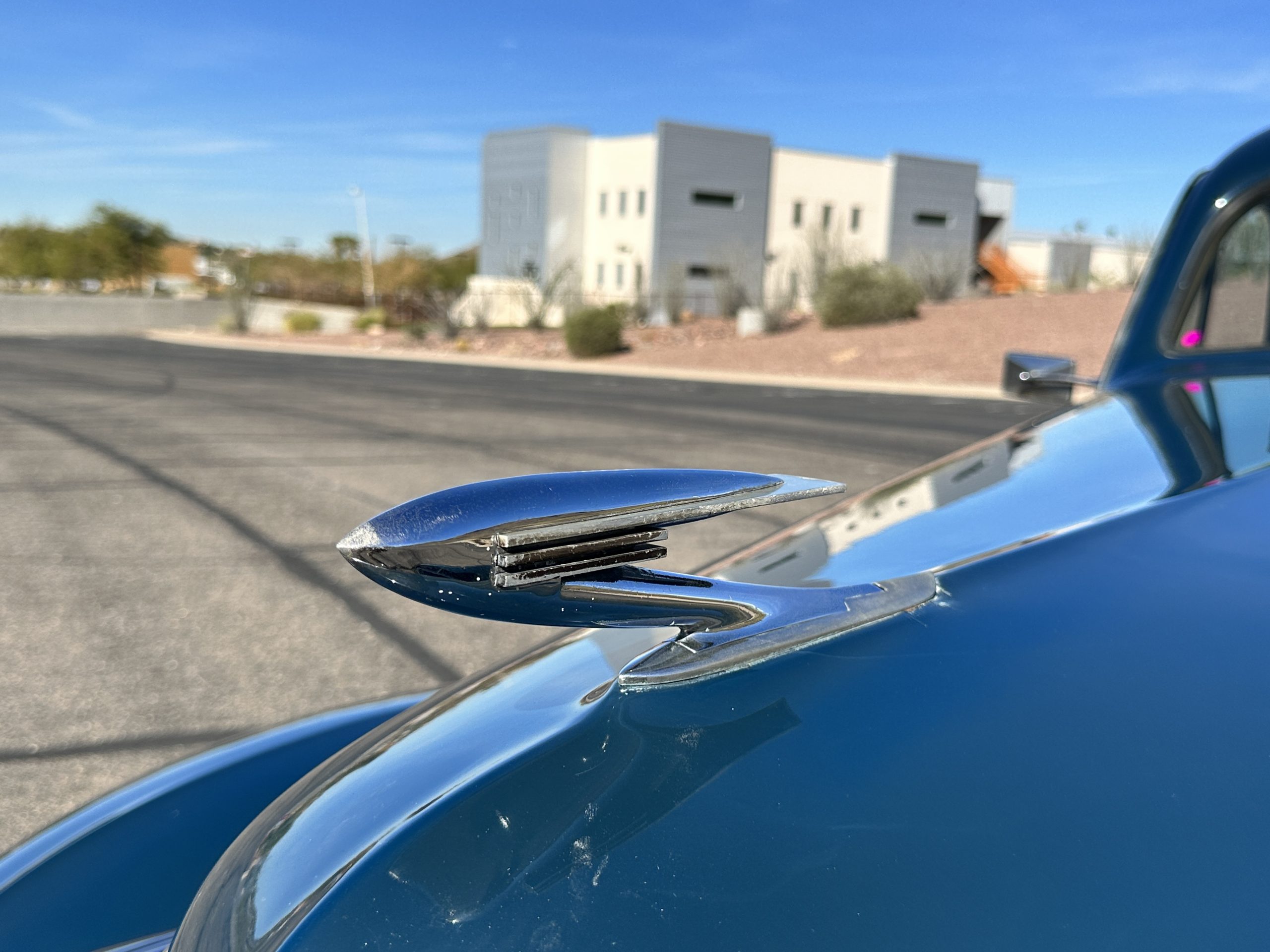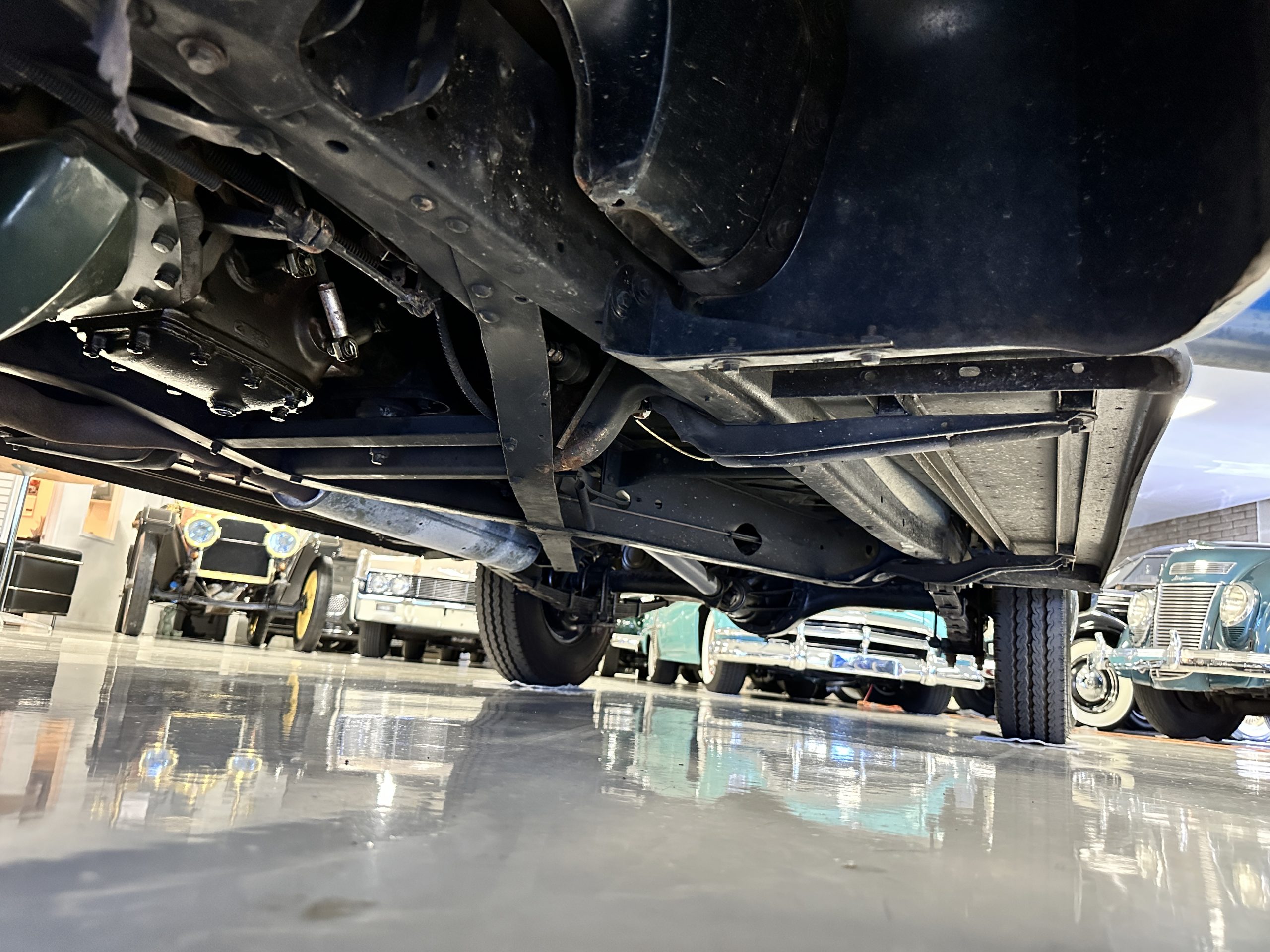 The livery is presented in Fairhaven Blue (Paint Code 11) and was repainted years ago in lacquer. There are areas of the paint where there is the normal lacquer cracking and a few small areas where the paint has peeled away. Most of the chrome is original and has light pitting. The bumpers and door handles have been re-chromed and look nice. We love the long front end devoid of side mounted tires. This makes the front end appear much longer and gives it a very sexy profile. The split windshield also gives it a fast look. Overall, the exterior is in tour quality condition enabling it to be shown at local car shows.