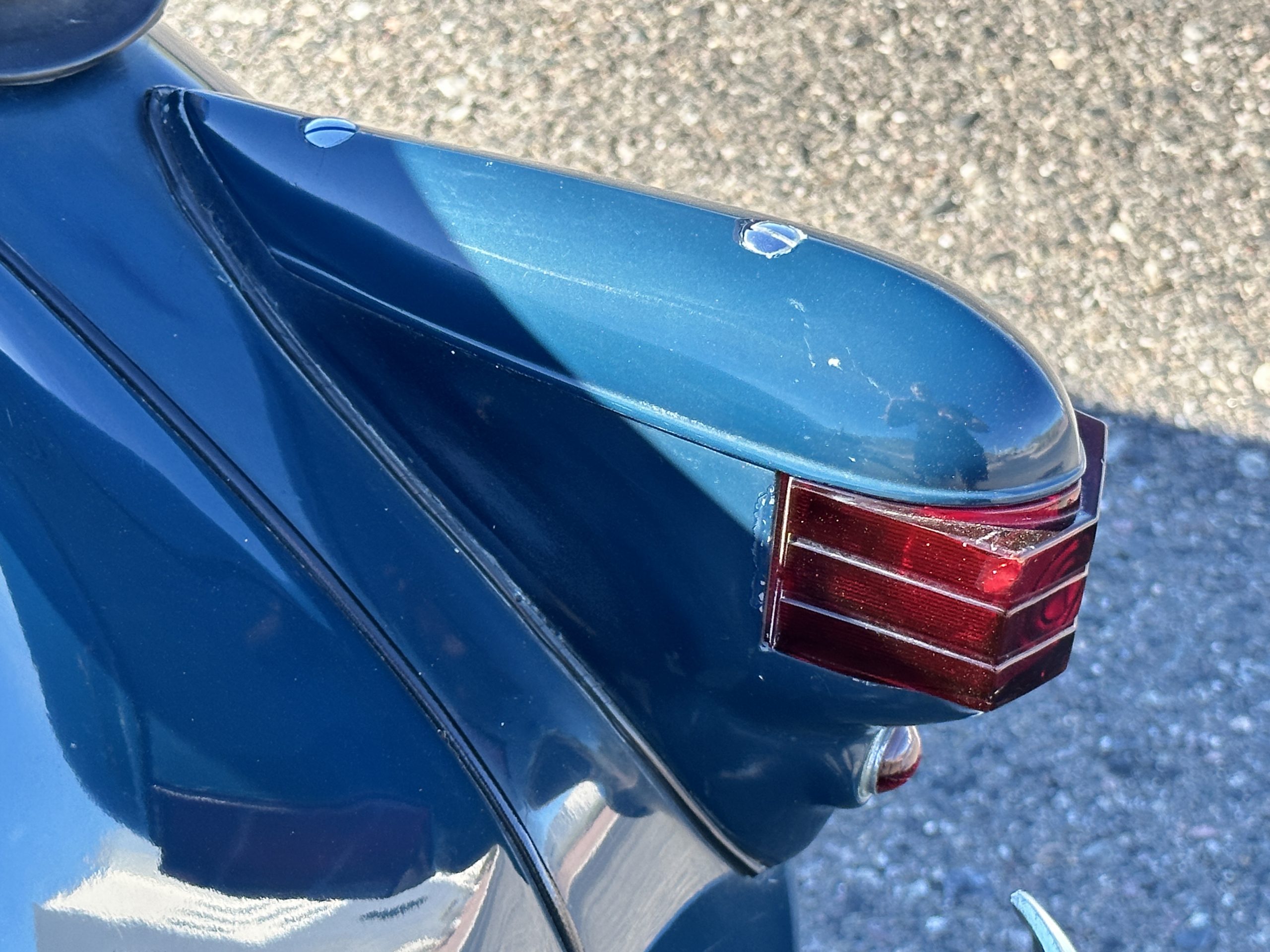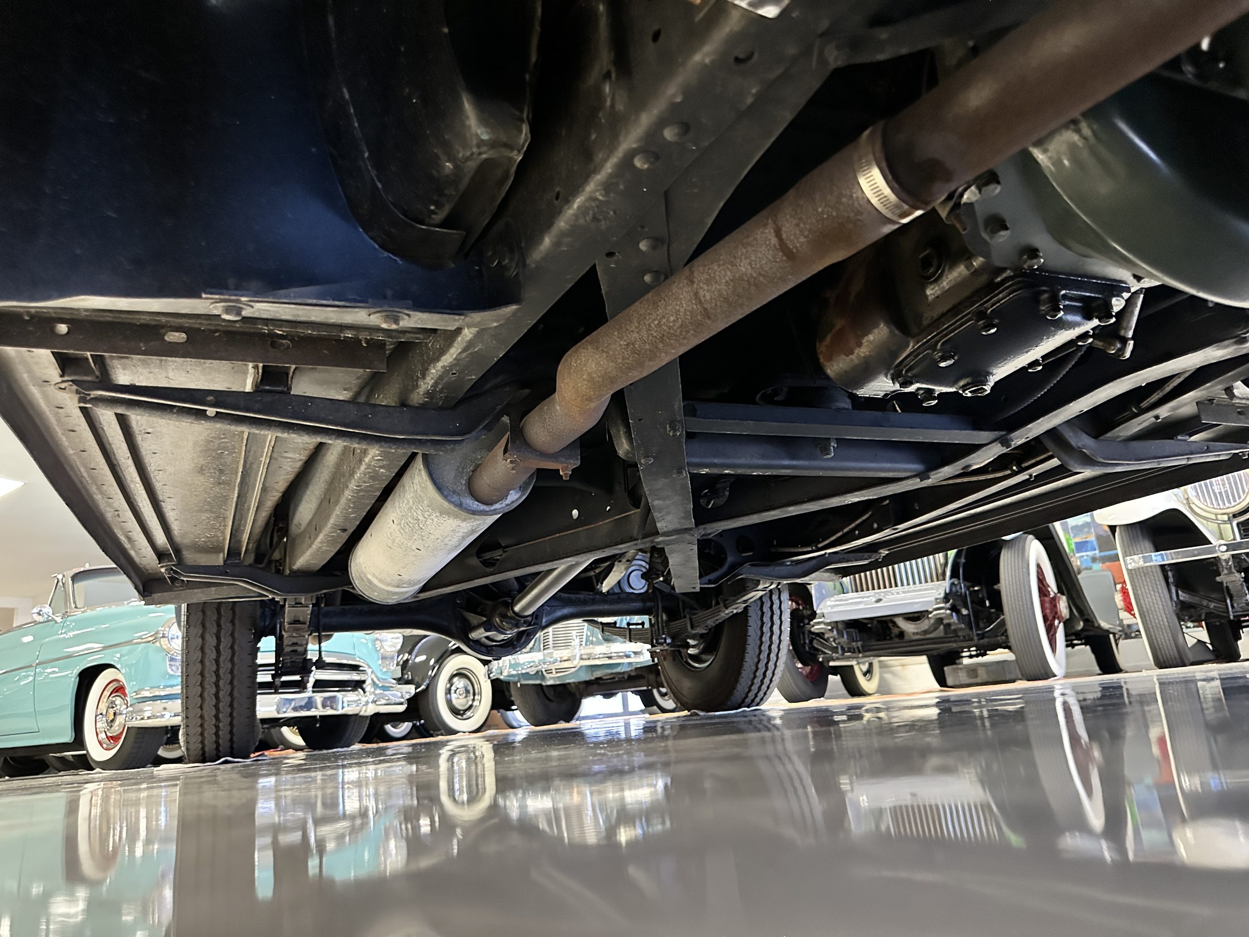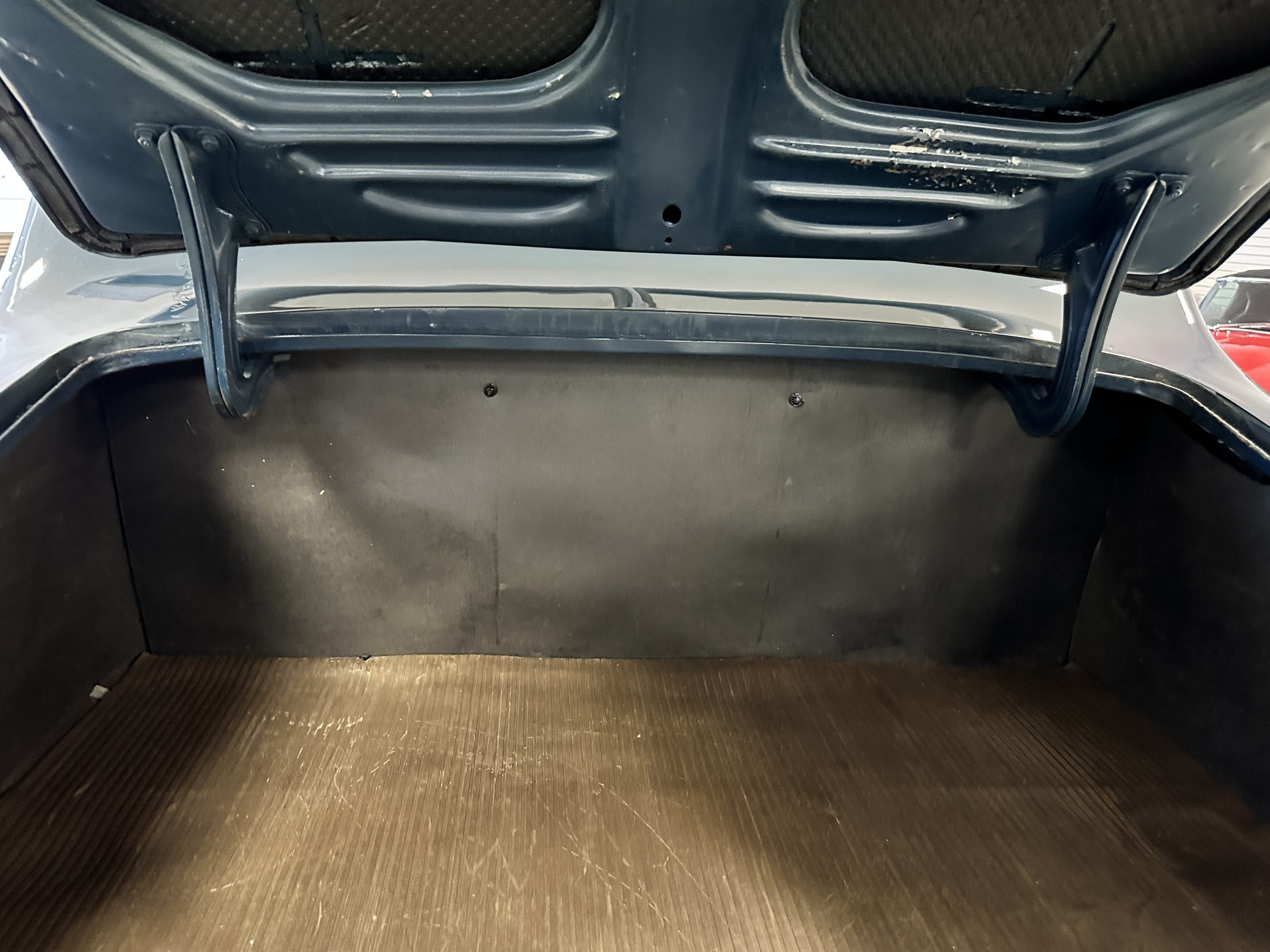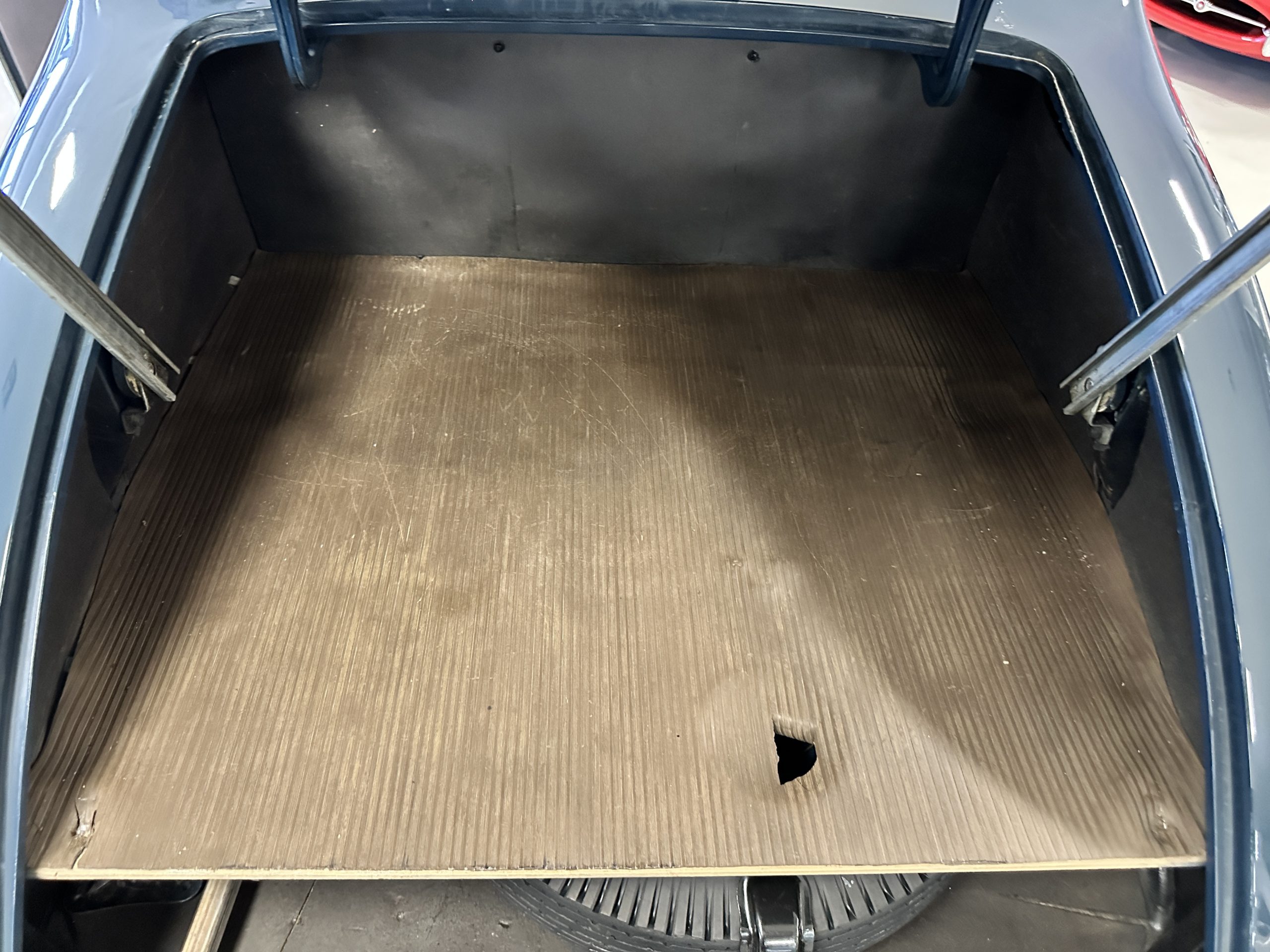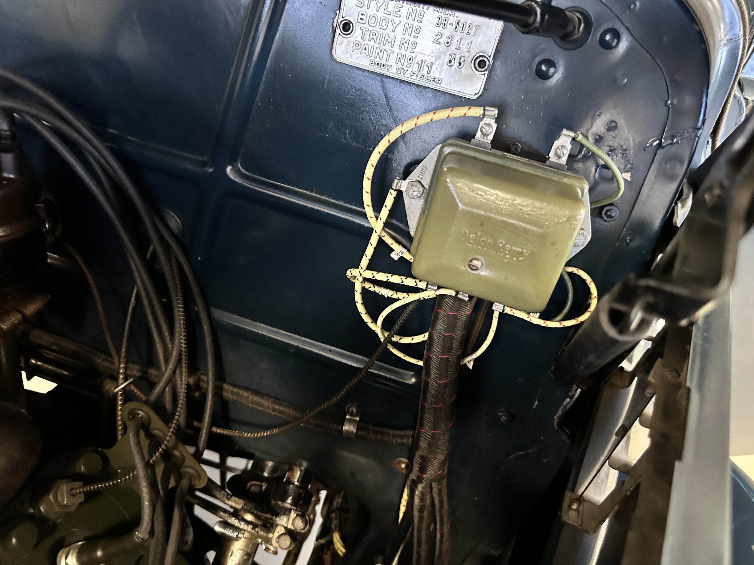 The livery is presented in Fairhaven Blue (Paint Code 11) and was repainted years ago in lacquer. There are areas of the paint where there is the normal lacquer cracking and a few small areas where the paint has peeled away. Most of the chrome is original and has light pitting. The bumpers and door handles have been re-chromed and look nice. We love the long front end devoid of side mounted tires. This makes the front end appear much longer and gives it a very sexy profile. The split windshield also gives it a fast look. Overall, the exterior is in tour quality condition enabling it to be shown at local car shows.