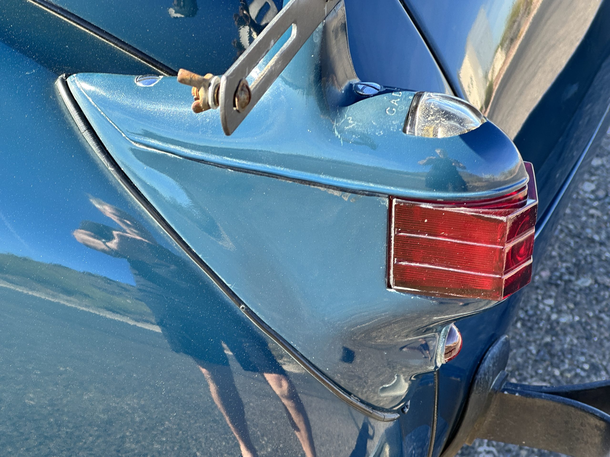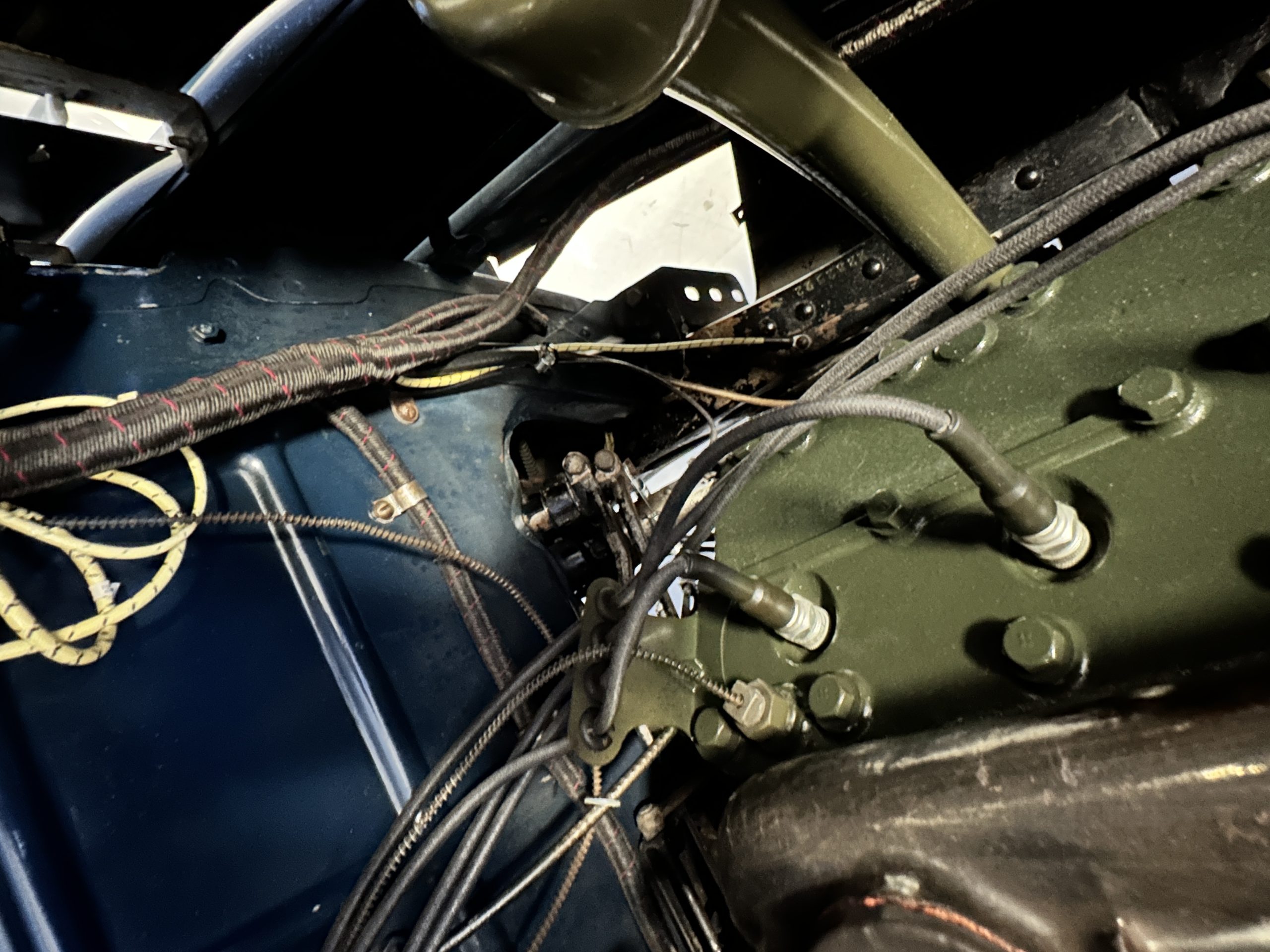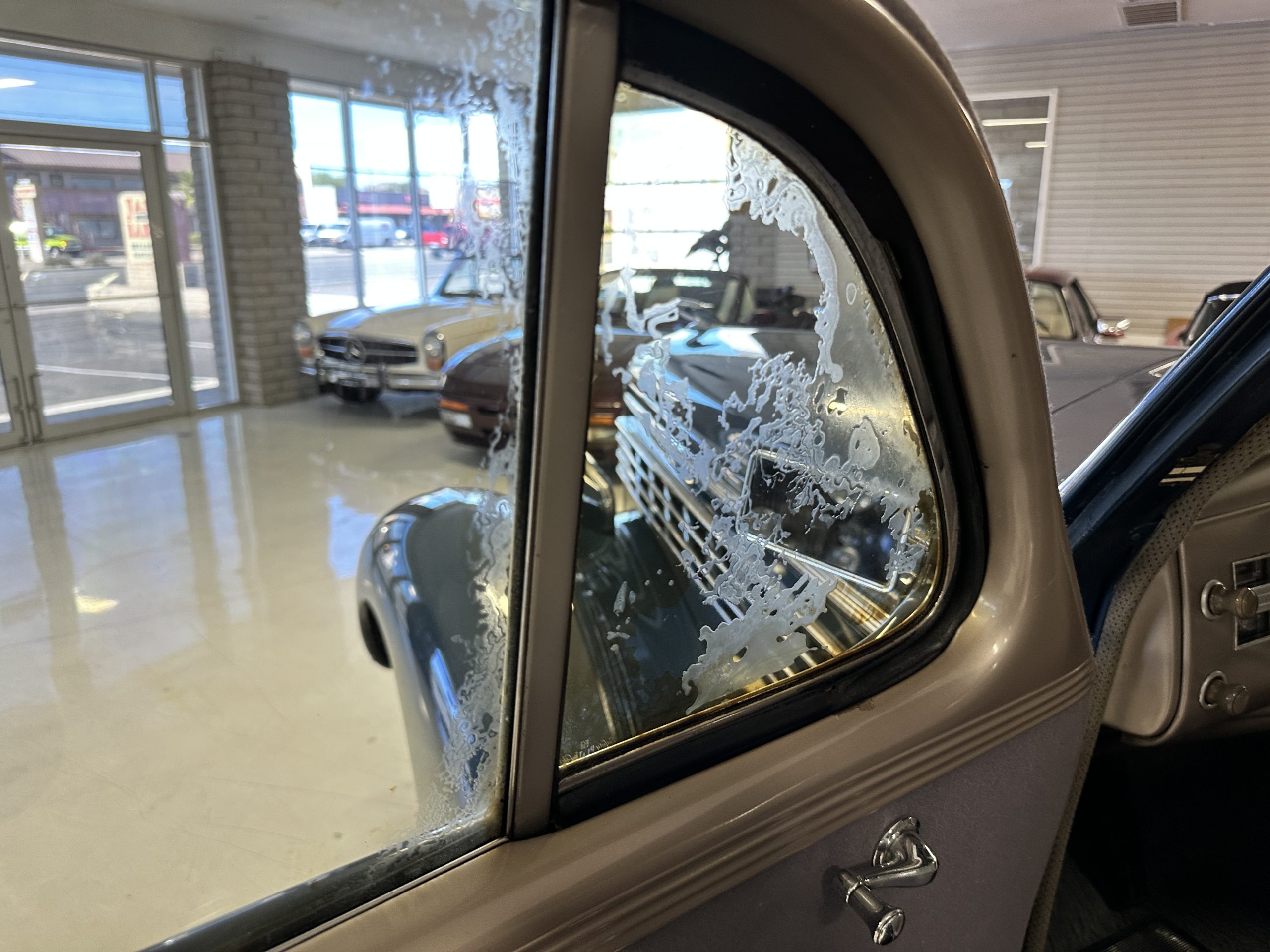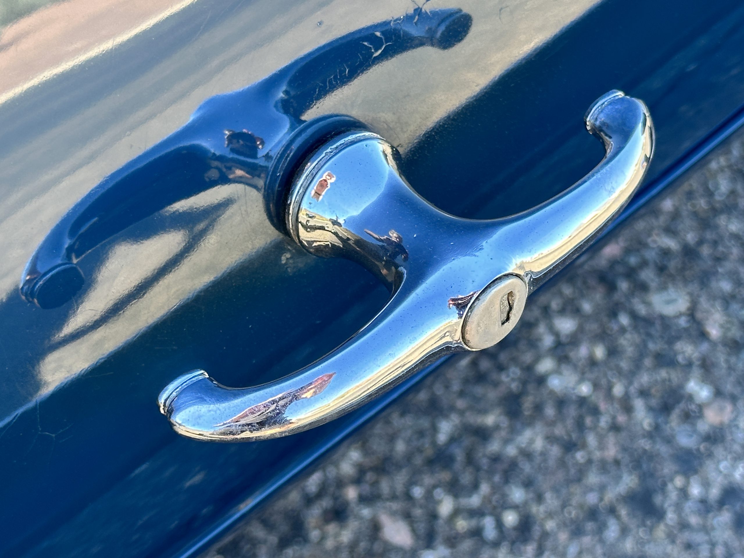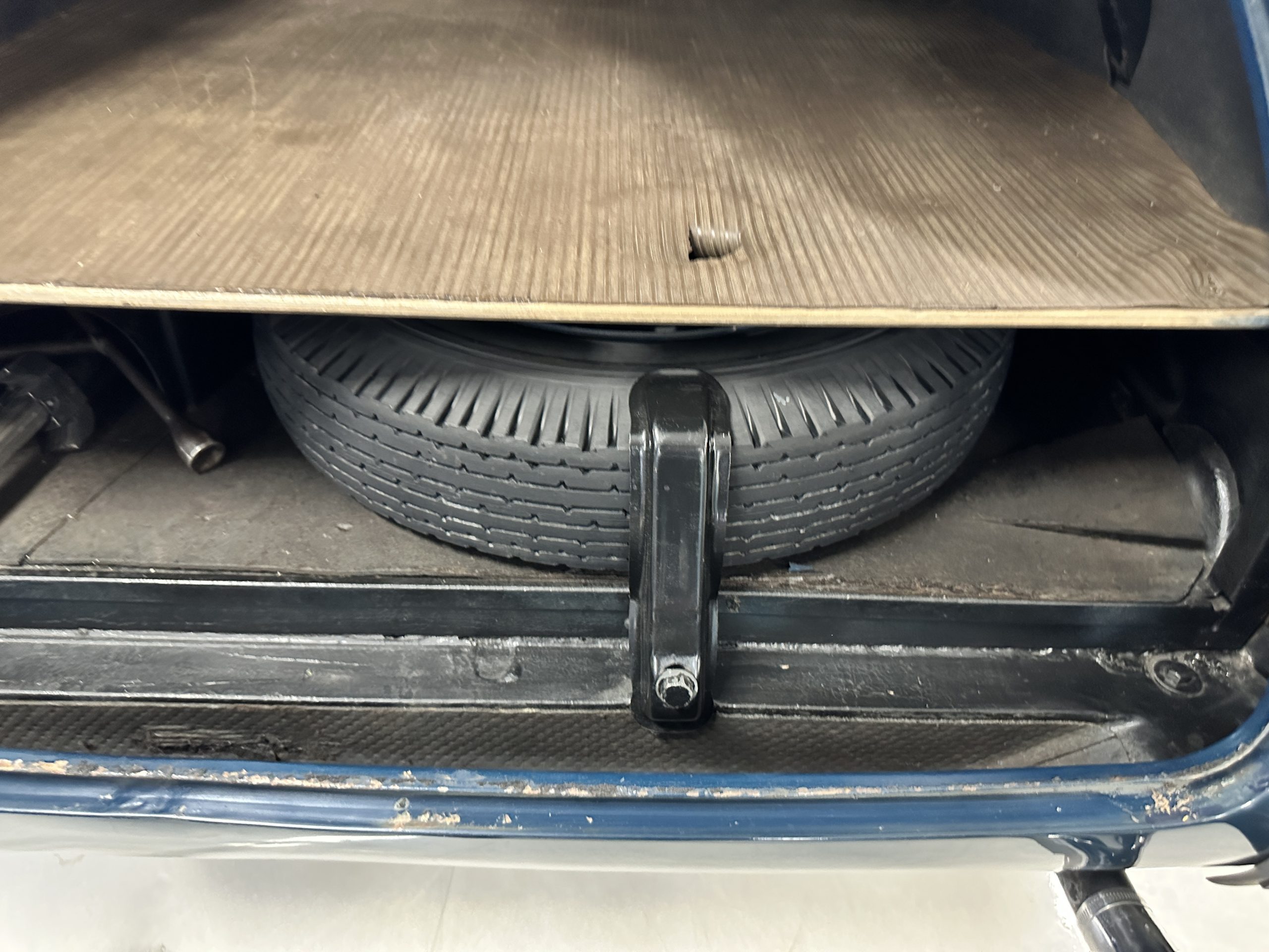 The livery is presented in Fairhaven Blue (Paint Code 11) and was repainted years ago in lacquer. There are areas of the paint where there is the normal lacquer cracking and a few small areas where the paint has peeled away. Most of the chrome is original and has light pitting. The bumpers and door handles have been re-chromed and look nice. We love the long front end devoid of side mounted tires. This makes the front end appear much longer and gives it a very sexy profile. The split windshield also gives it a fast look. Overall, the exterior is in tour quality condition enabling it to be shown at local car shows.