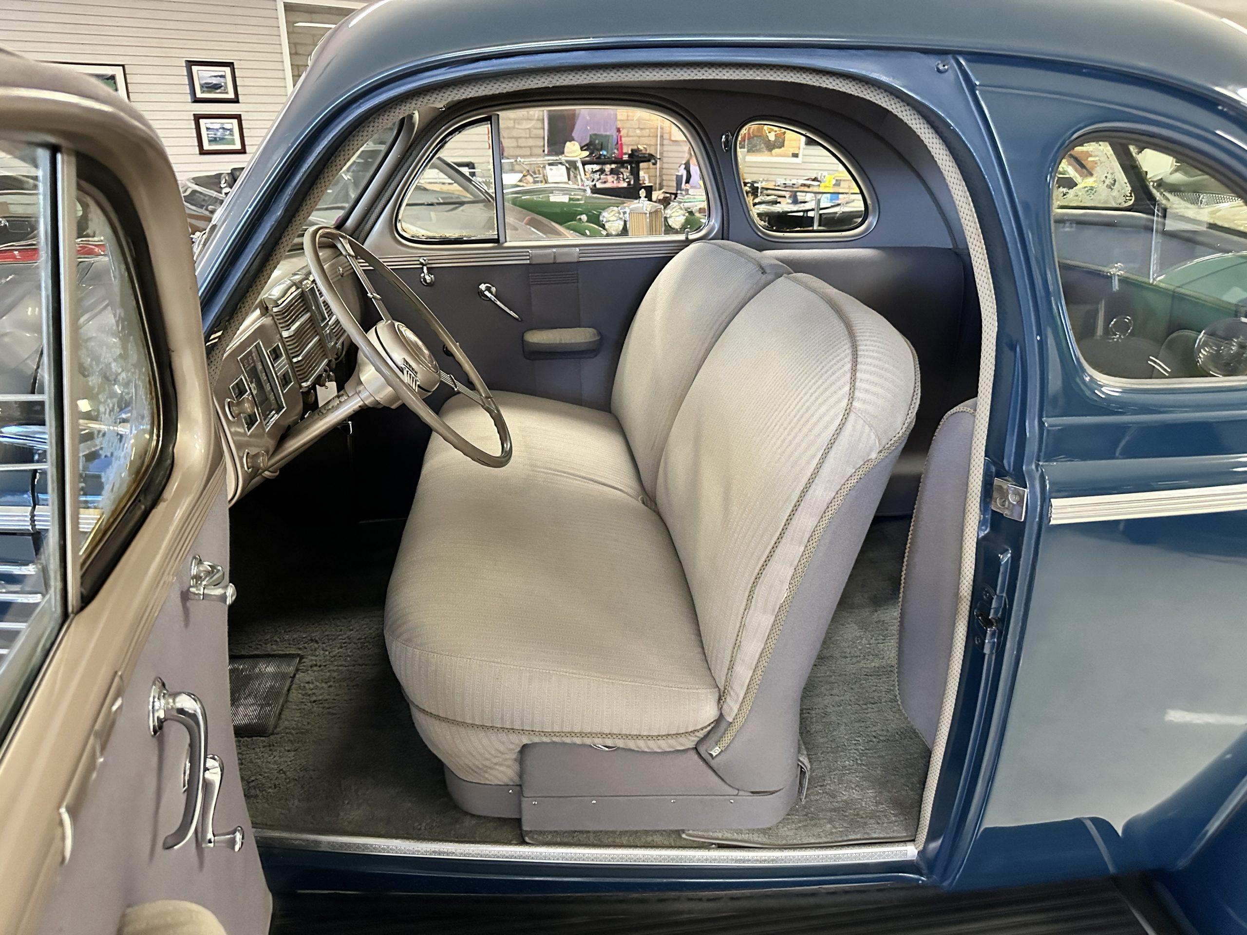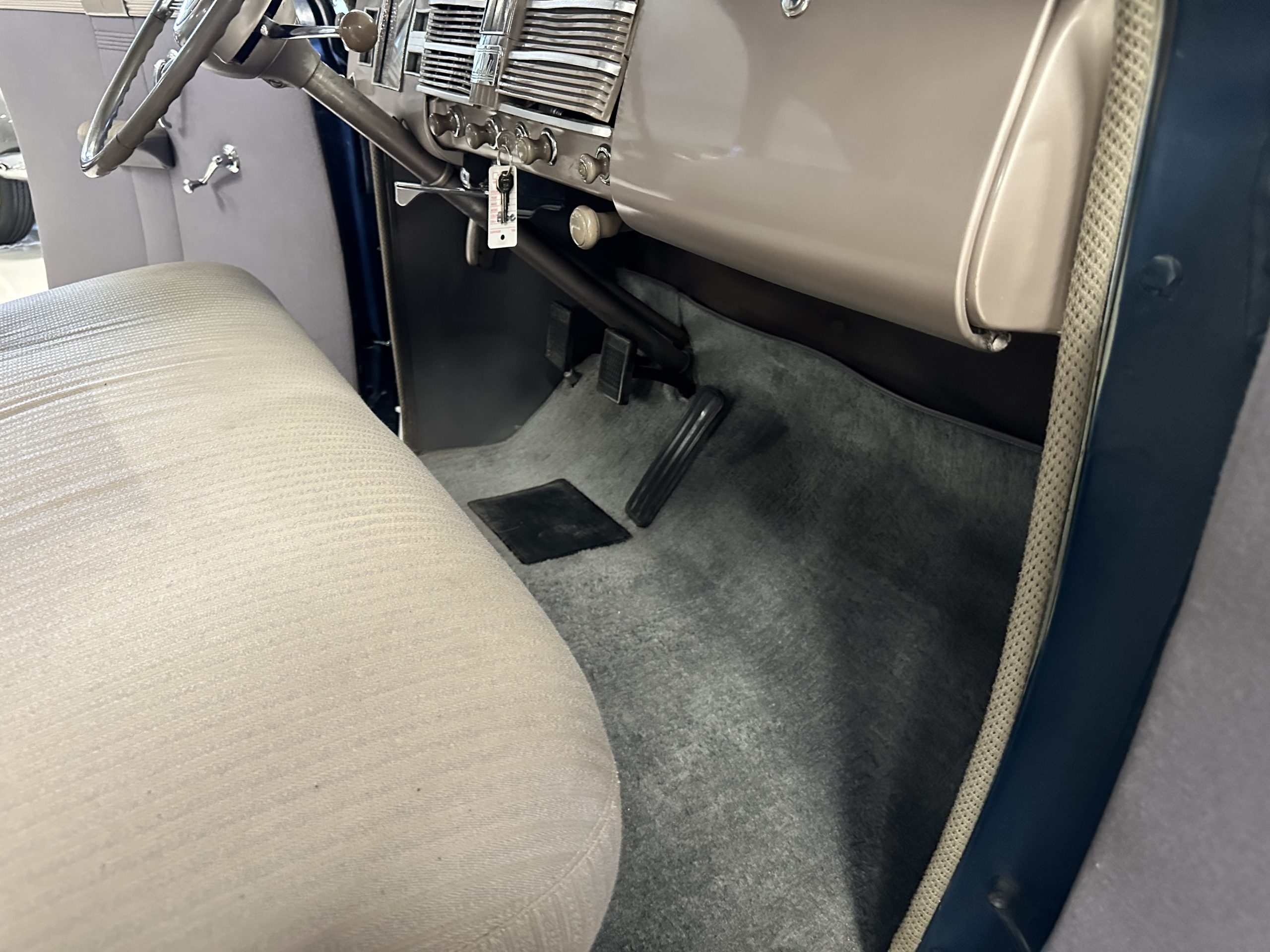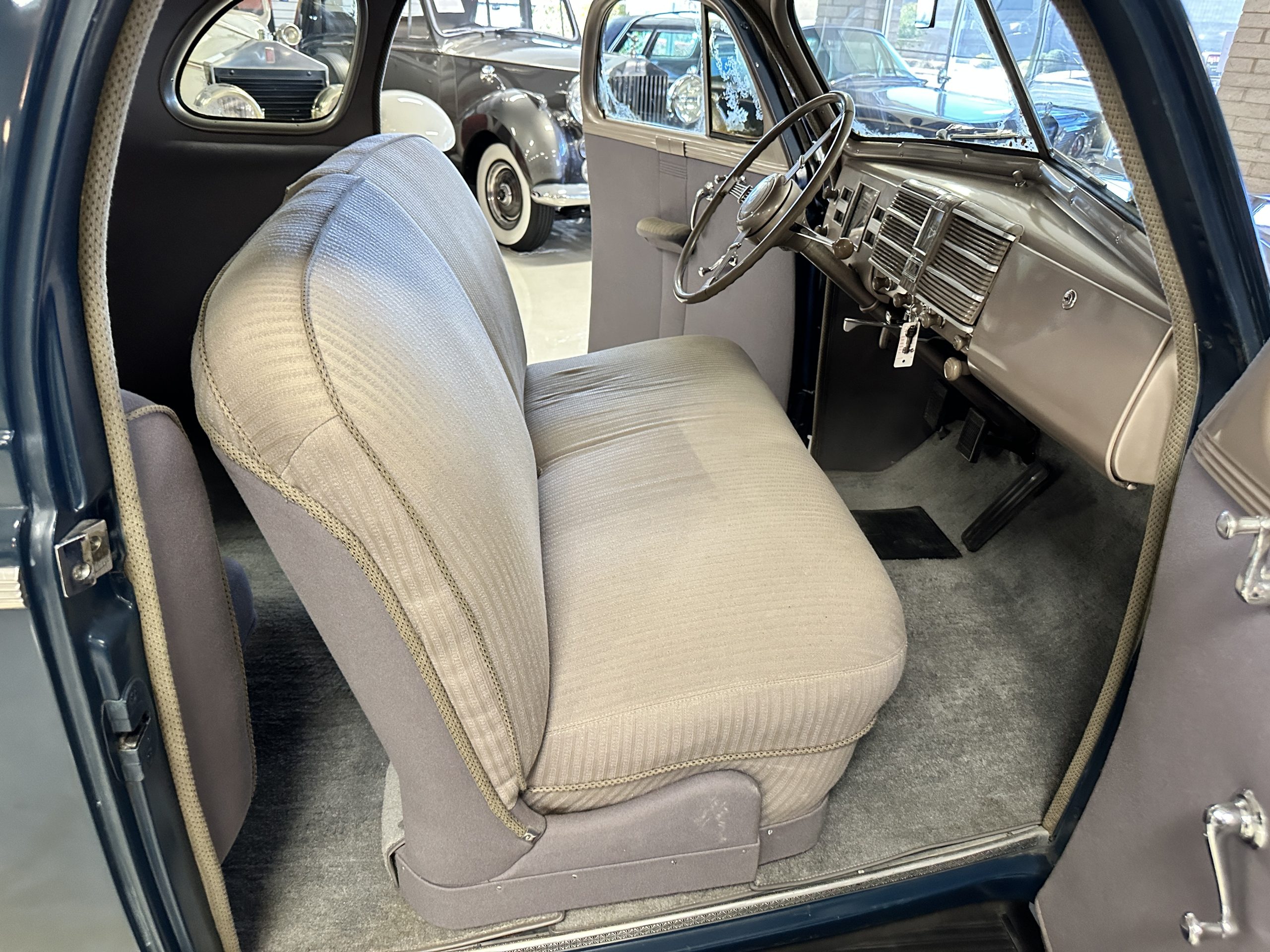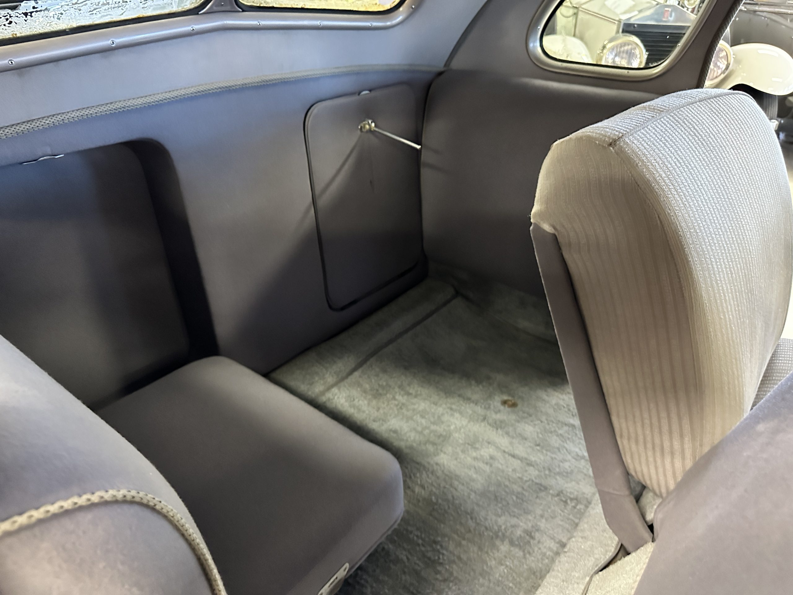 The interior is a correct gray Ribbed Cloth (Trim Code 33) and is very correct in its appearance and workmanship. The door panels are gray wool broadcloth. Behind the front seats are two jump seats, which would normally be referred to as an Opera Coupe. The carpet is a gray nylon that is a terrific color match to the upholstery. There is a well installed turn signal lever under the dash that is very well placed for ease of use. Overall, the interior presents well and has been redone over the years to appear correct.