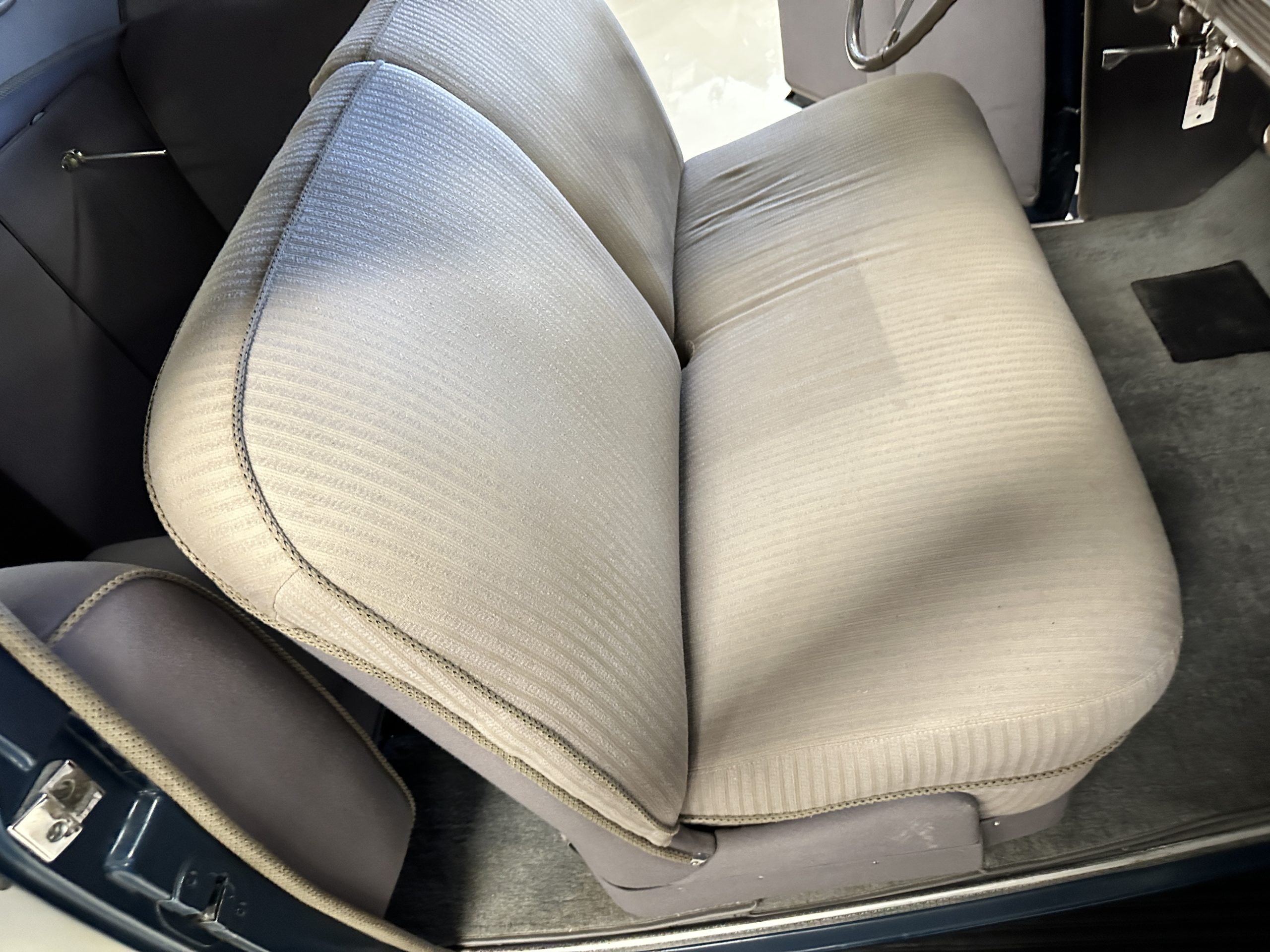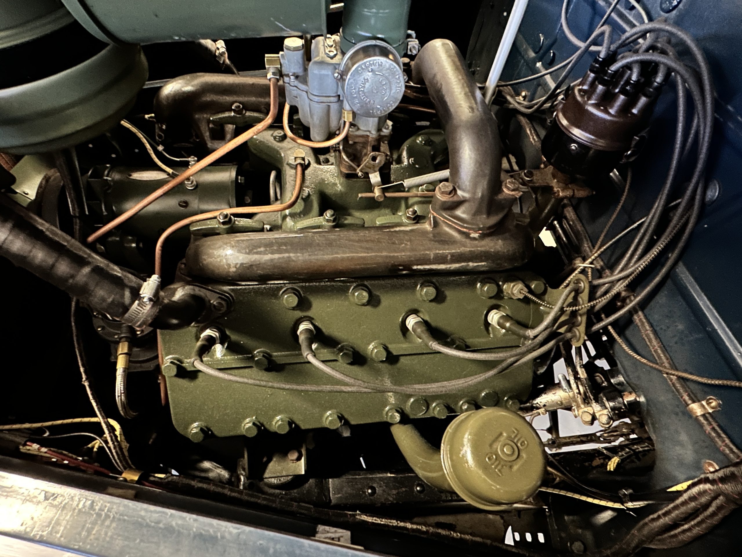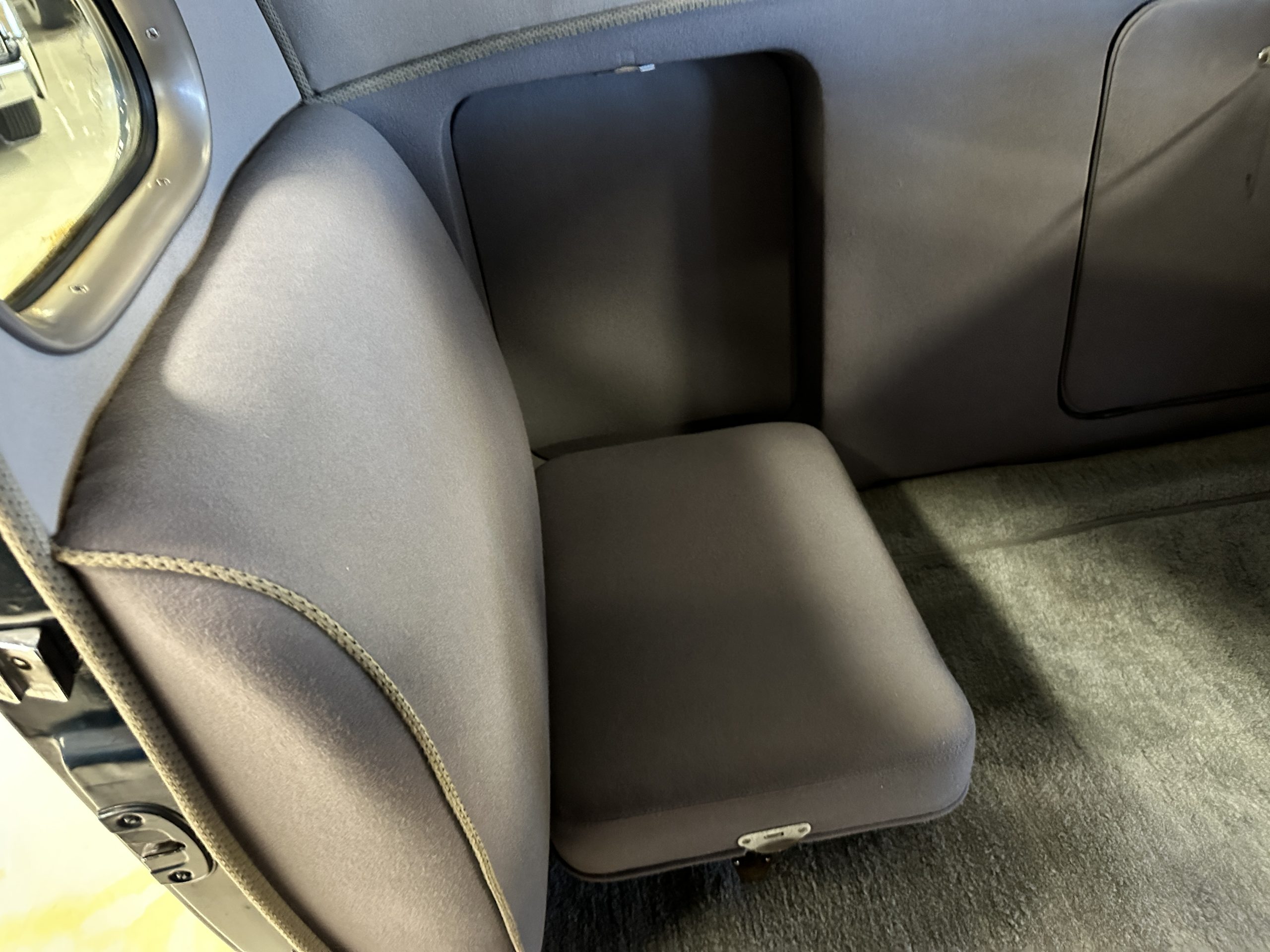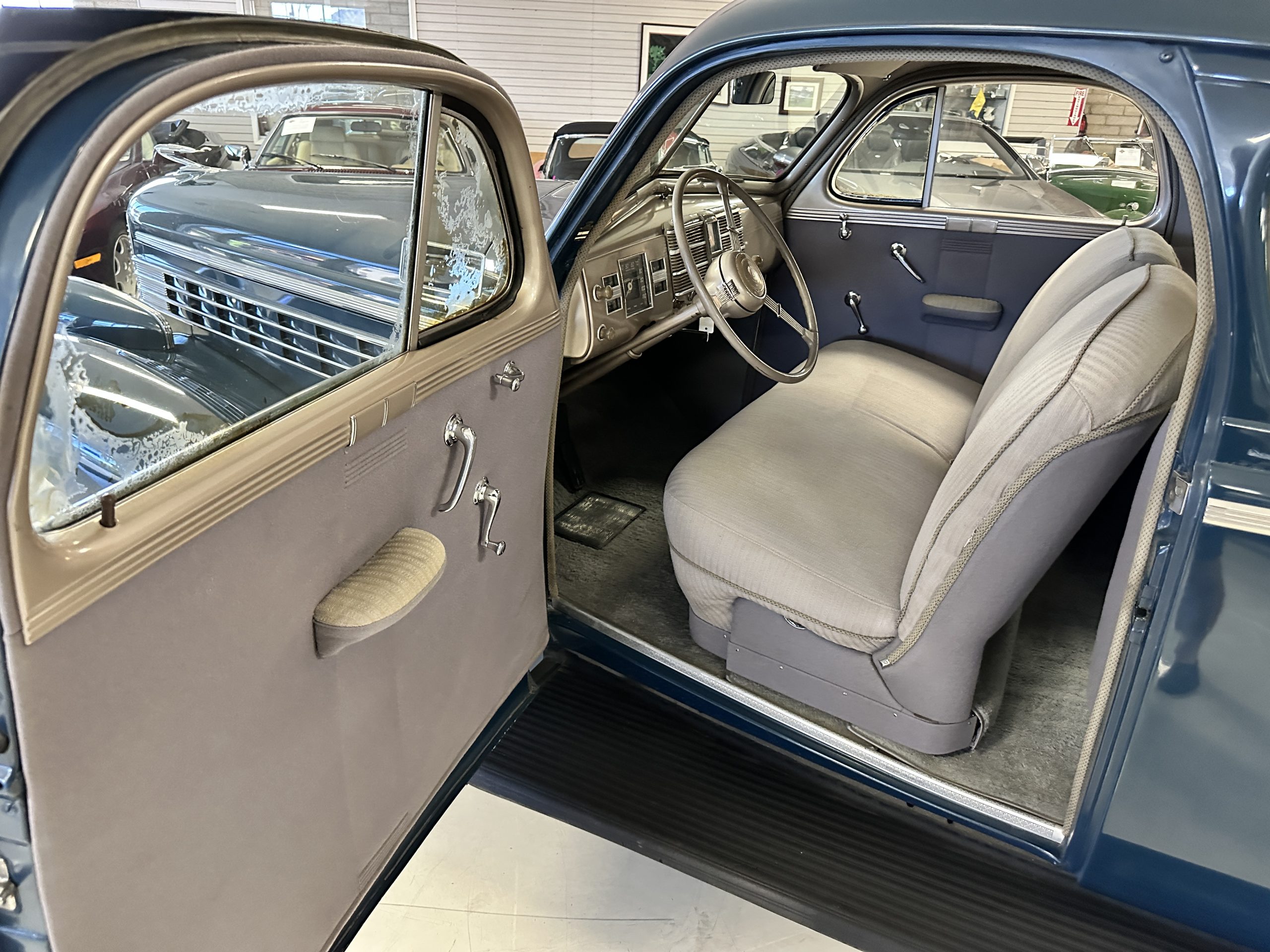 The interior is a correct gray Ribbed Cloth (Trim Code 33) and is very correct in its appearance and workmanship. The door panels are gray wool broadcloth. Behind the front seats are two jump seats, which would normally be referred to as an Opera Coupe. The carpet is a gray nylon that is a terrific color match to the upholstery. There is a well installed turn signal lever under the dash that is very well placed for ease of use. Overall, the interior presents well and has been redone over the years to appear correct.
