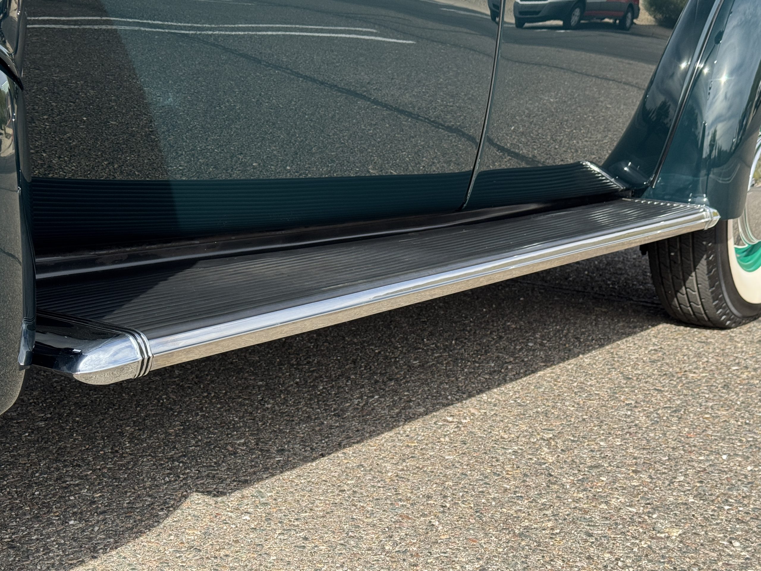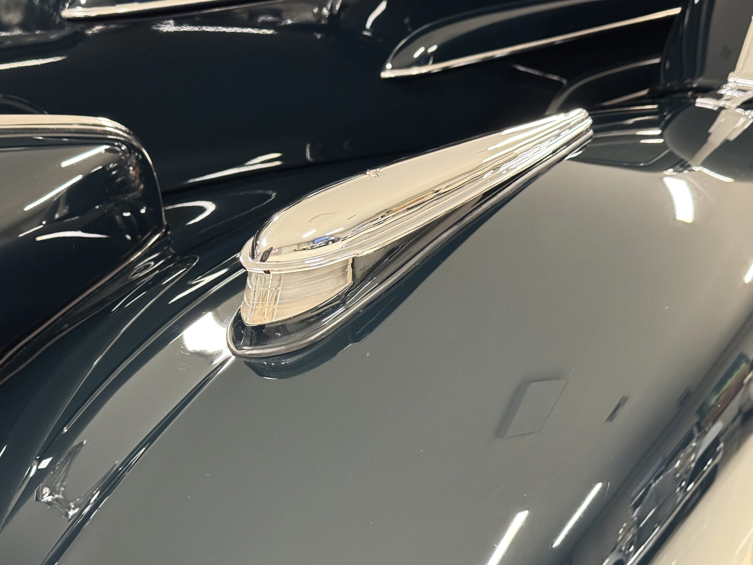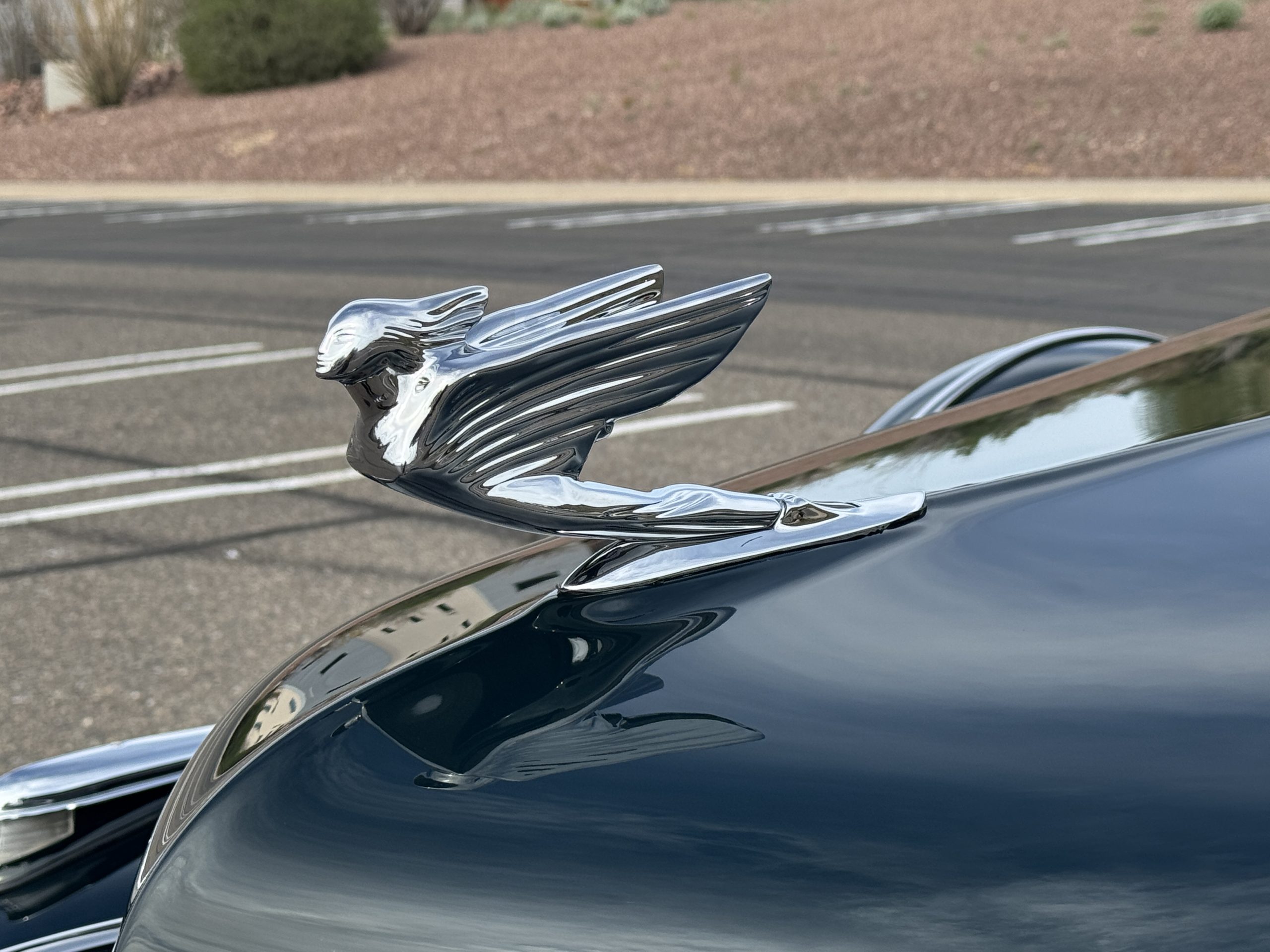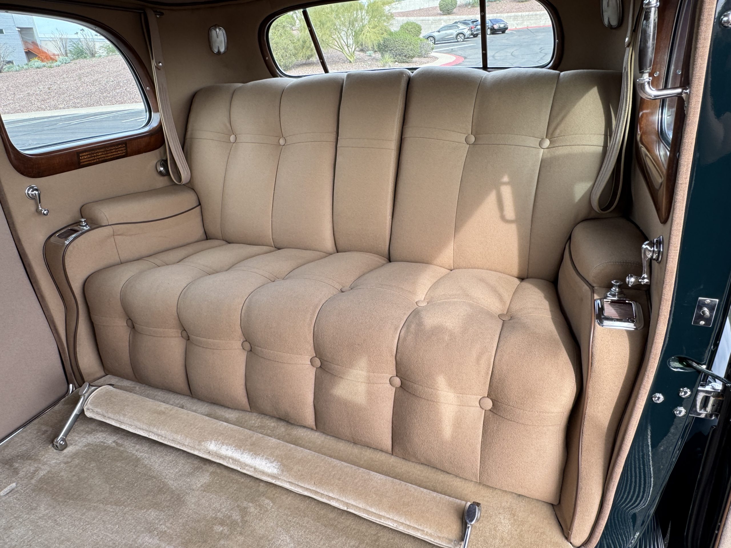 The Imperial Sedan is finished in its original Cavern Green, presenting with exceptional gloss, depth, and surface quality that highlight the Fleetwood body’s dramatic scale and Art Deco proportions. The fully rechromed grille, brightwork, and trim are in excellent condition, anchored by the iconic “Flying Goddess” hood ornament that also serves as the hood latch release. The headlights are fitted into the body and appear slightly asymmetrical. Twin side-mounted covered spare tires reinforce the formal profile, while bright green painted wheels fitted with V-16 chrome hubcaps and wide whitewall tires complete the period-correct presentation.