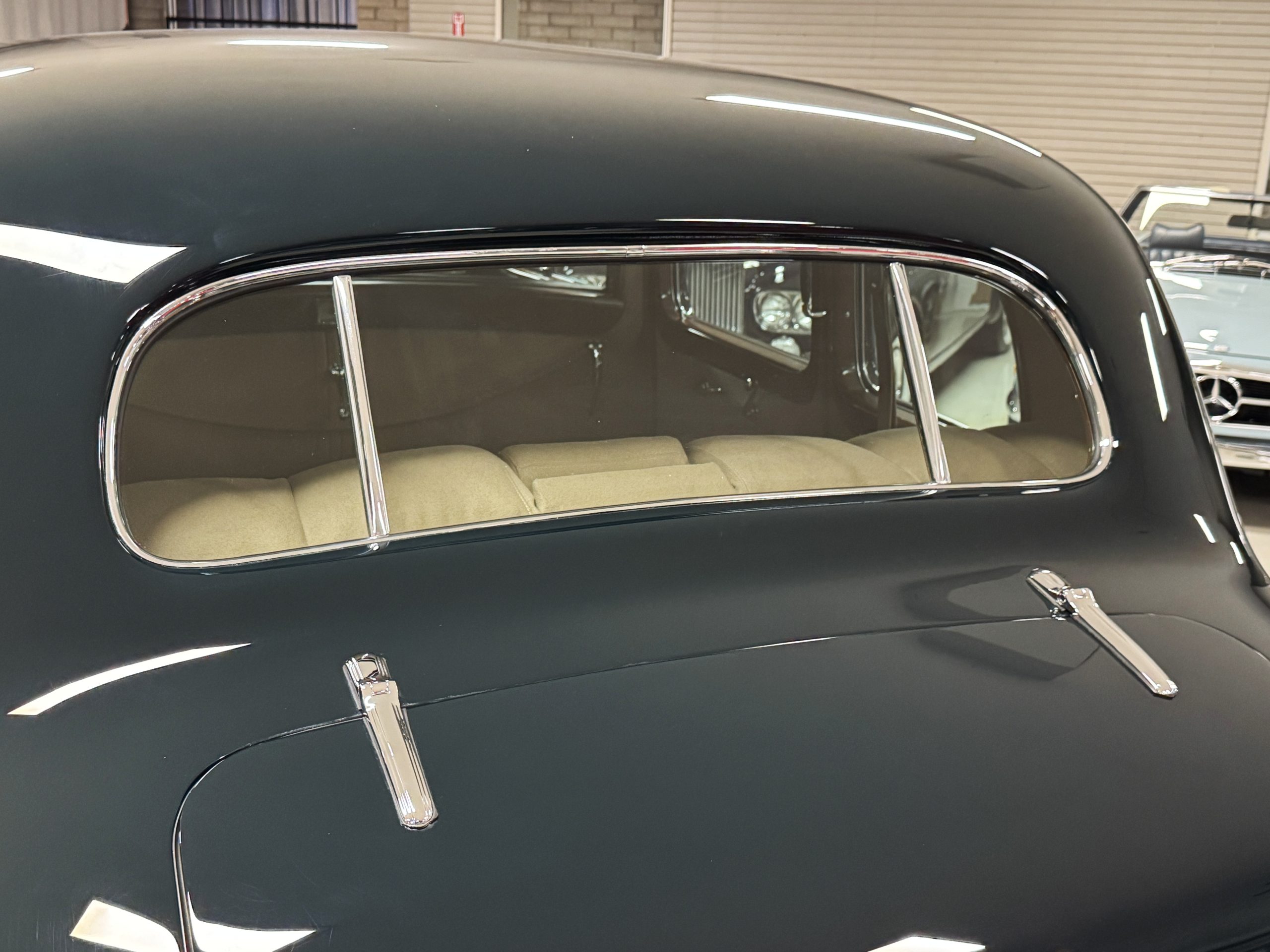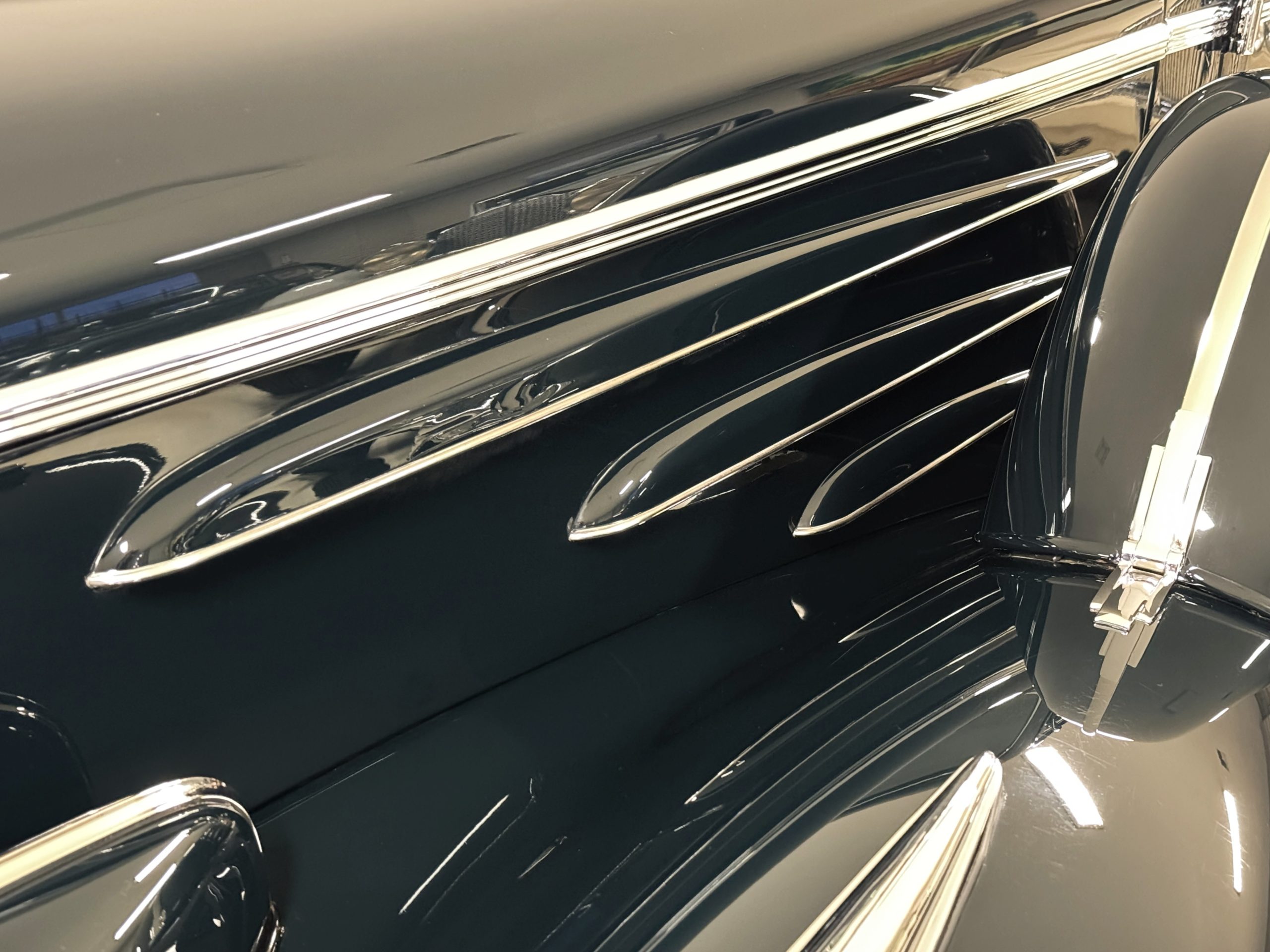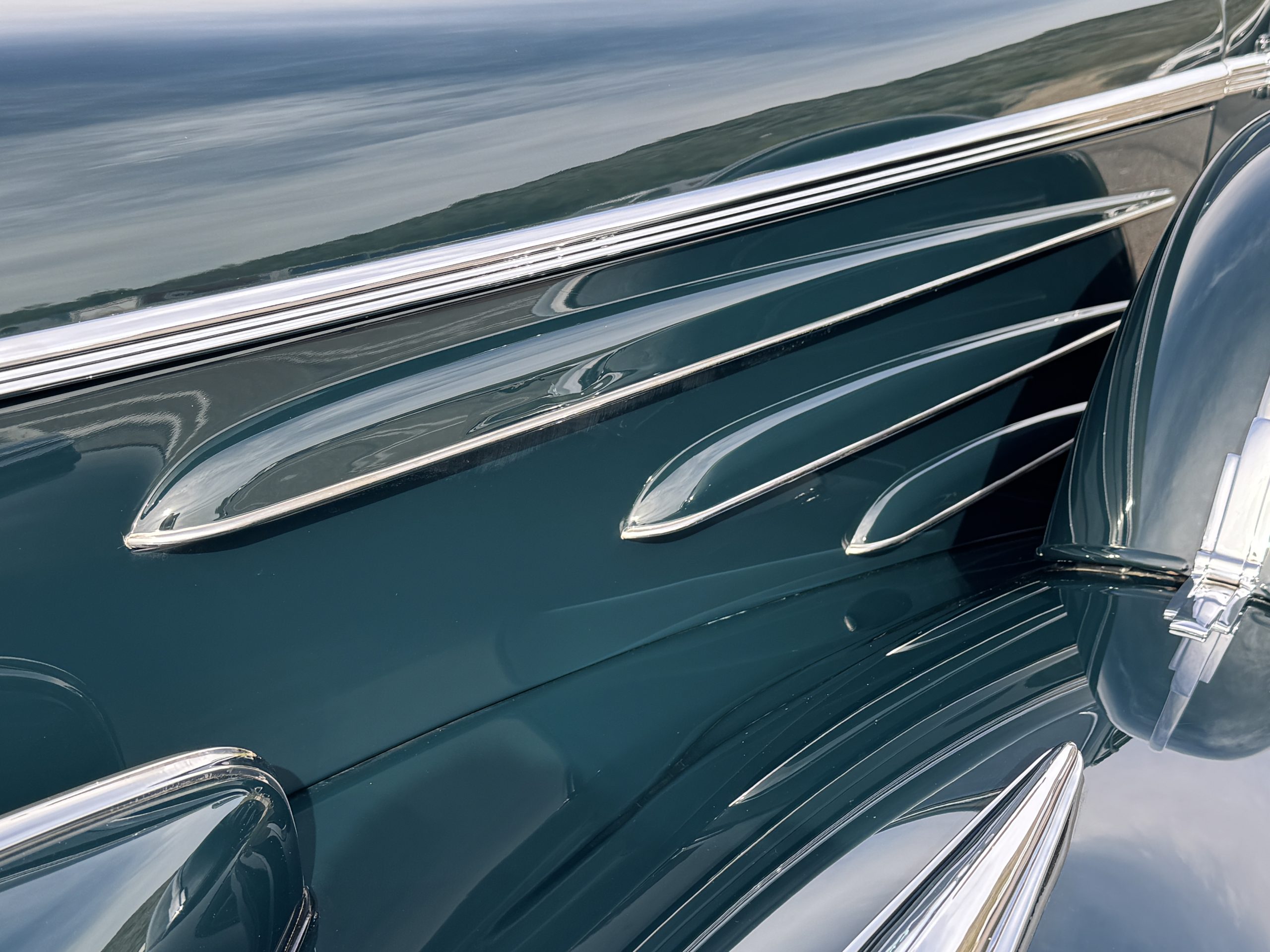 The Imperial Sedan is finished in its original Cavern Green, presenting with exceptional gloss, depth, and surface quality that highlight the Fleetwood body’s dramatic scale and Art Deco proportions. The fully rechromed grille, brightwork, and trim are in excellent condition, anchored by the iconic “Flying Goddess” hood ornament that also serves as the hood latch release. The headlights are fitted into the body and appear slightly asymmetrical. Twin side-mounted covered spare tires reinforce the formal profile, while bright green painted wheels fitted with V-16 chrome hubcaps and wide whitewall tires complete the period-correct presentation.