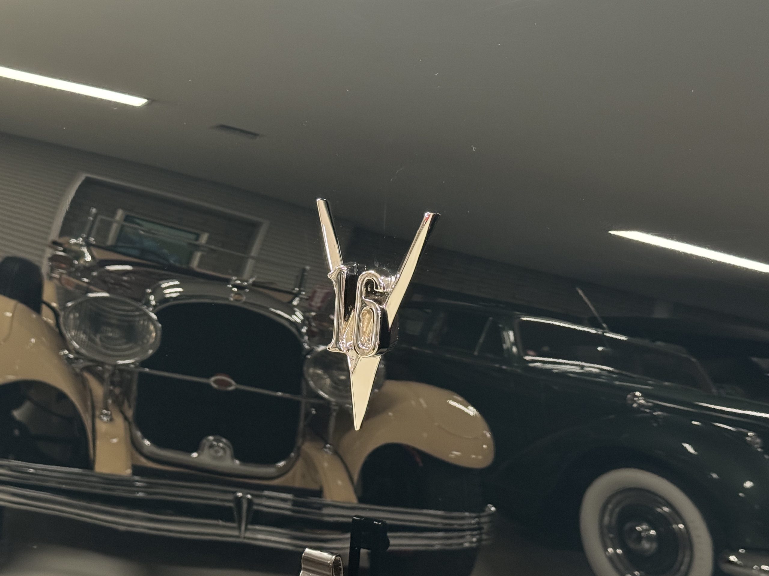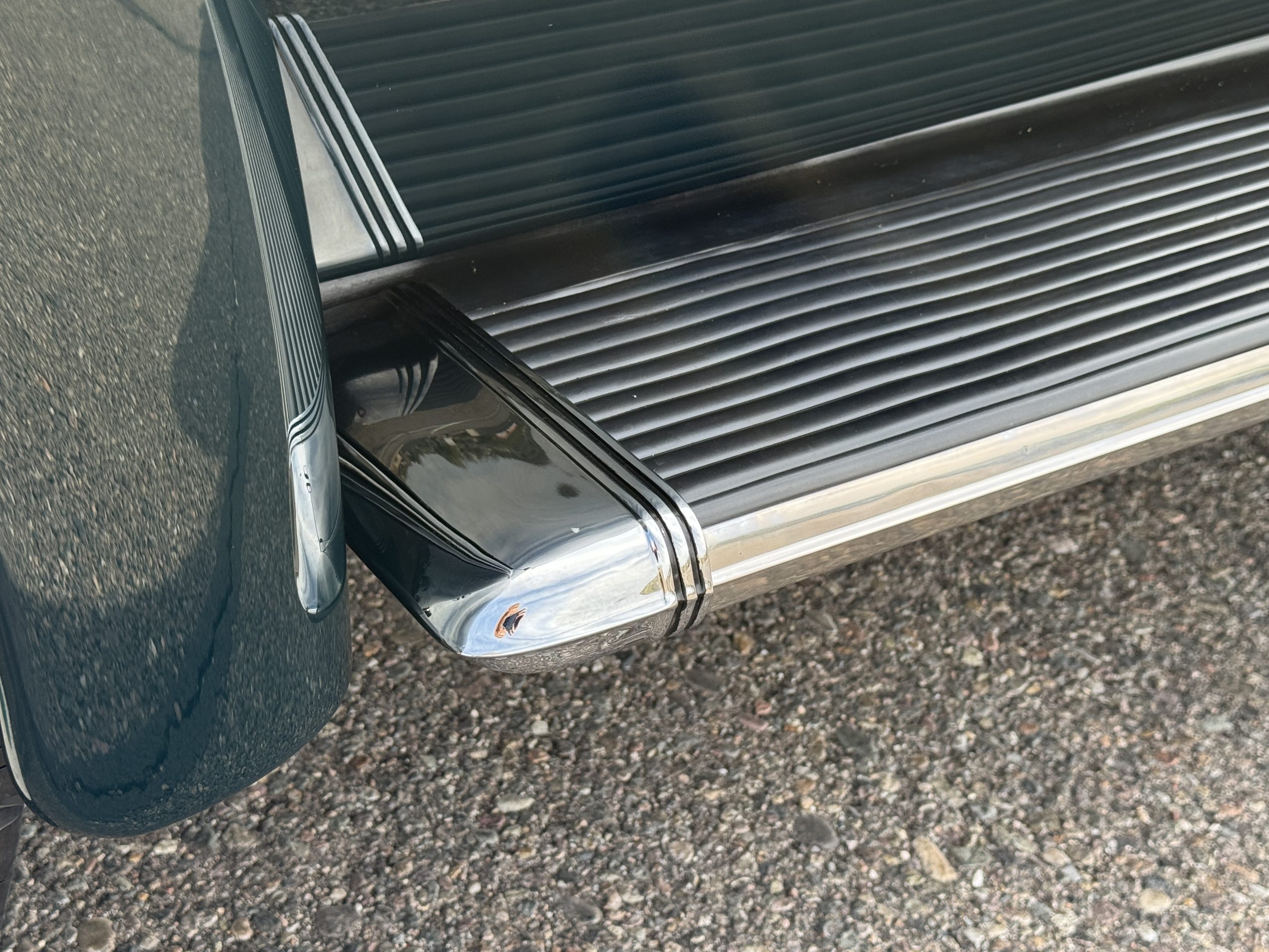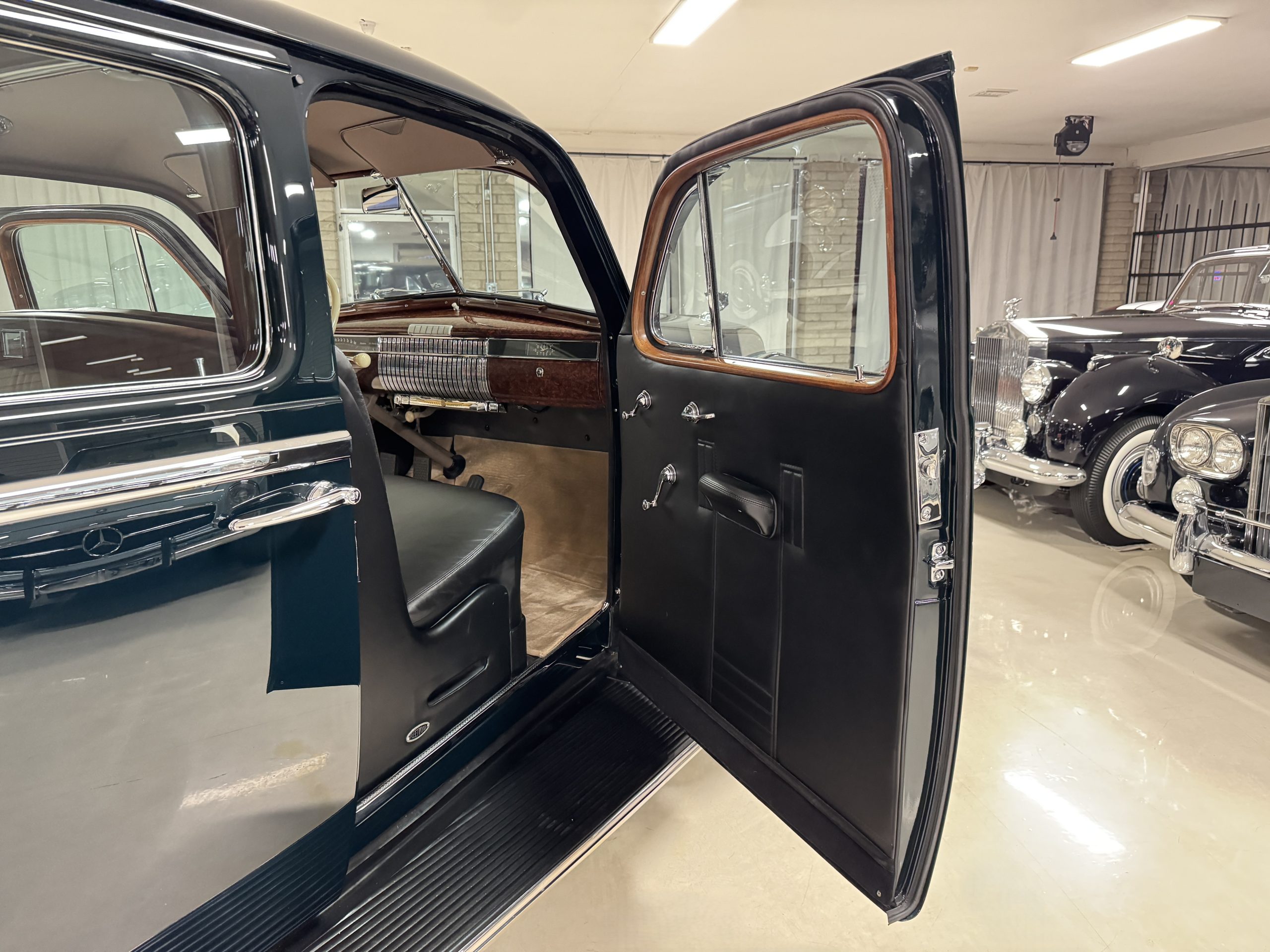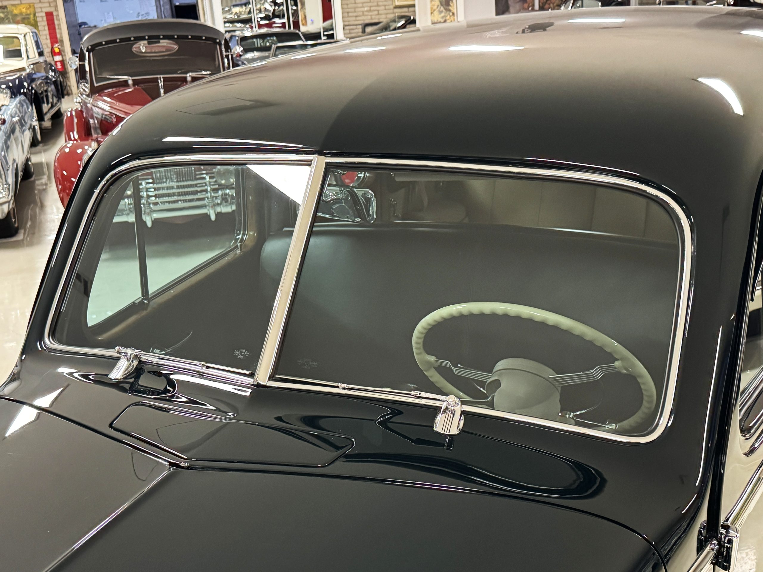 The Imperial Sedan is finished in its original Cavern Green, presenting with exceptional gloss, depth, and surface quality that highlight the Fleetwood body’s dramatic scale and Art Deco proportions. The fully rechromed grille, brightwork, and trim are in excellent condition, anchored by the iconic “Flying Goddess” hood ornament that also serves as the hood latch release. The headlights are fitted into the body and appear slightly asymmetrical. Twin side-mounted covered spare tires reinforce the formal profile, while bright green painted wheels fitted with V-16 chrome hubcaps and wide whitewall tires complete the period-correct presentation.