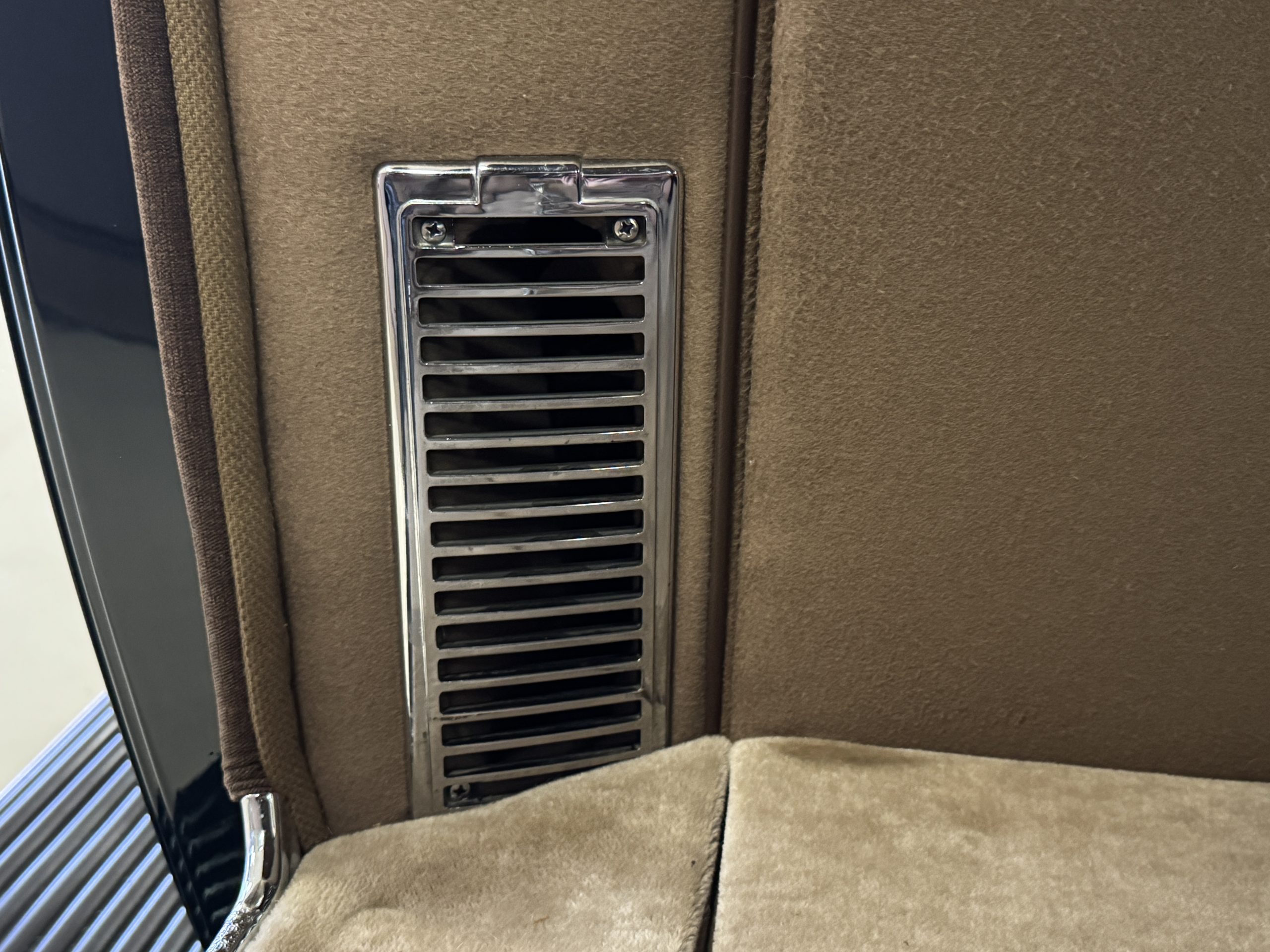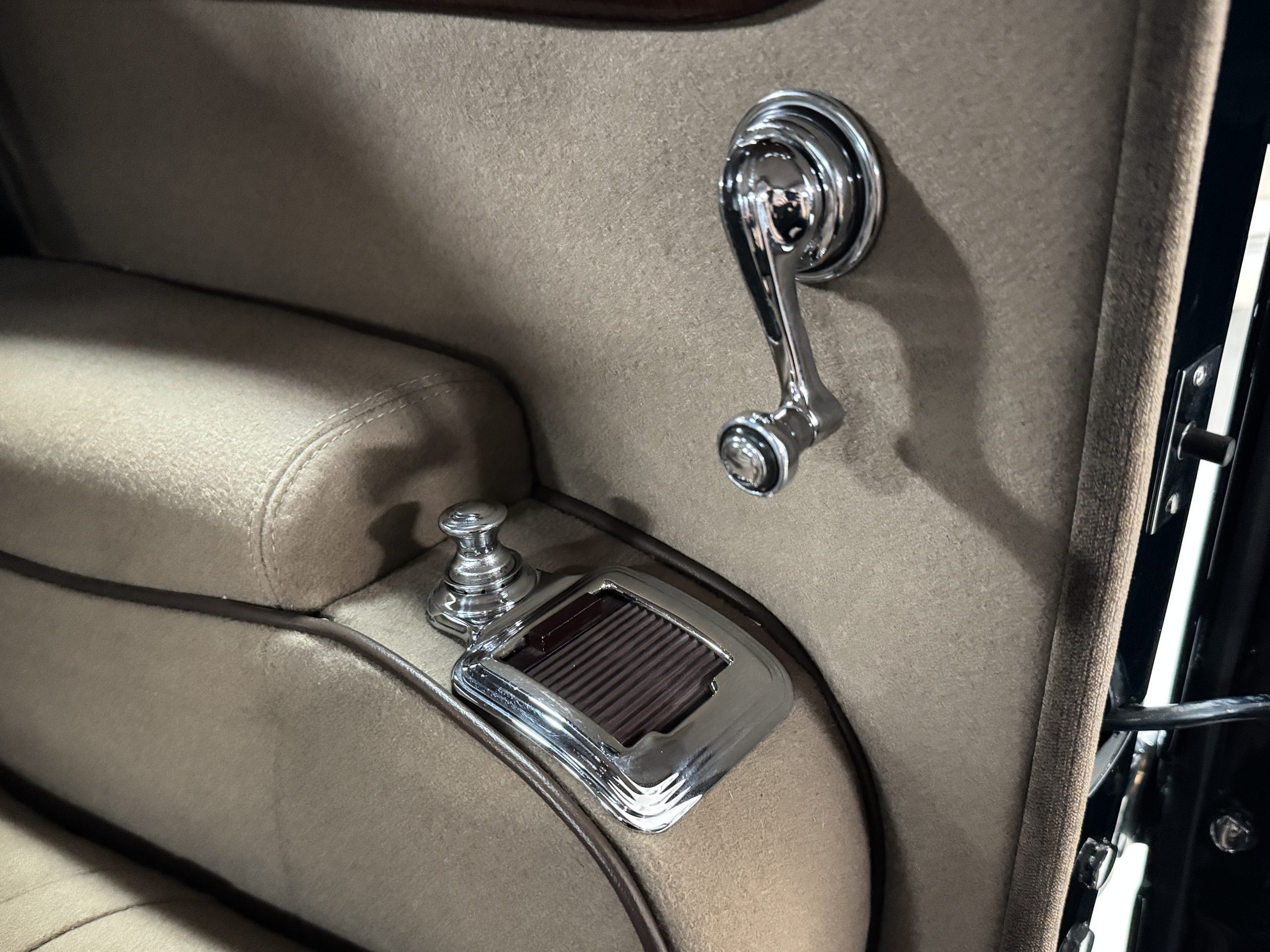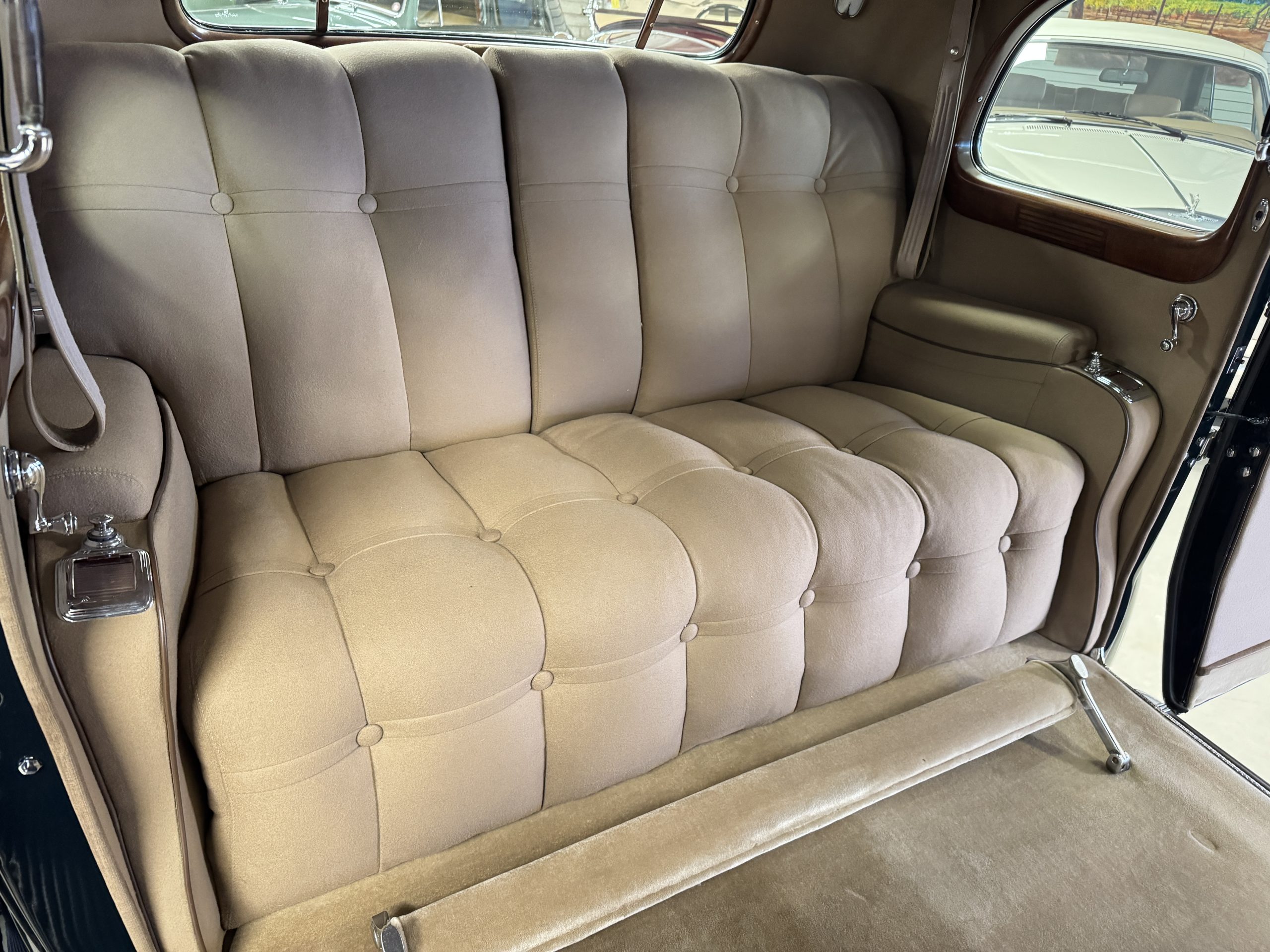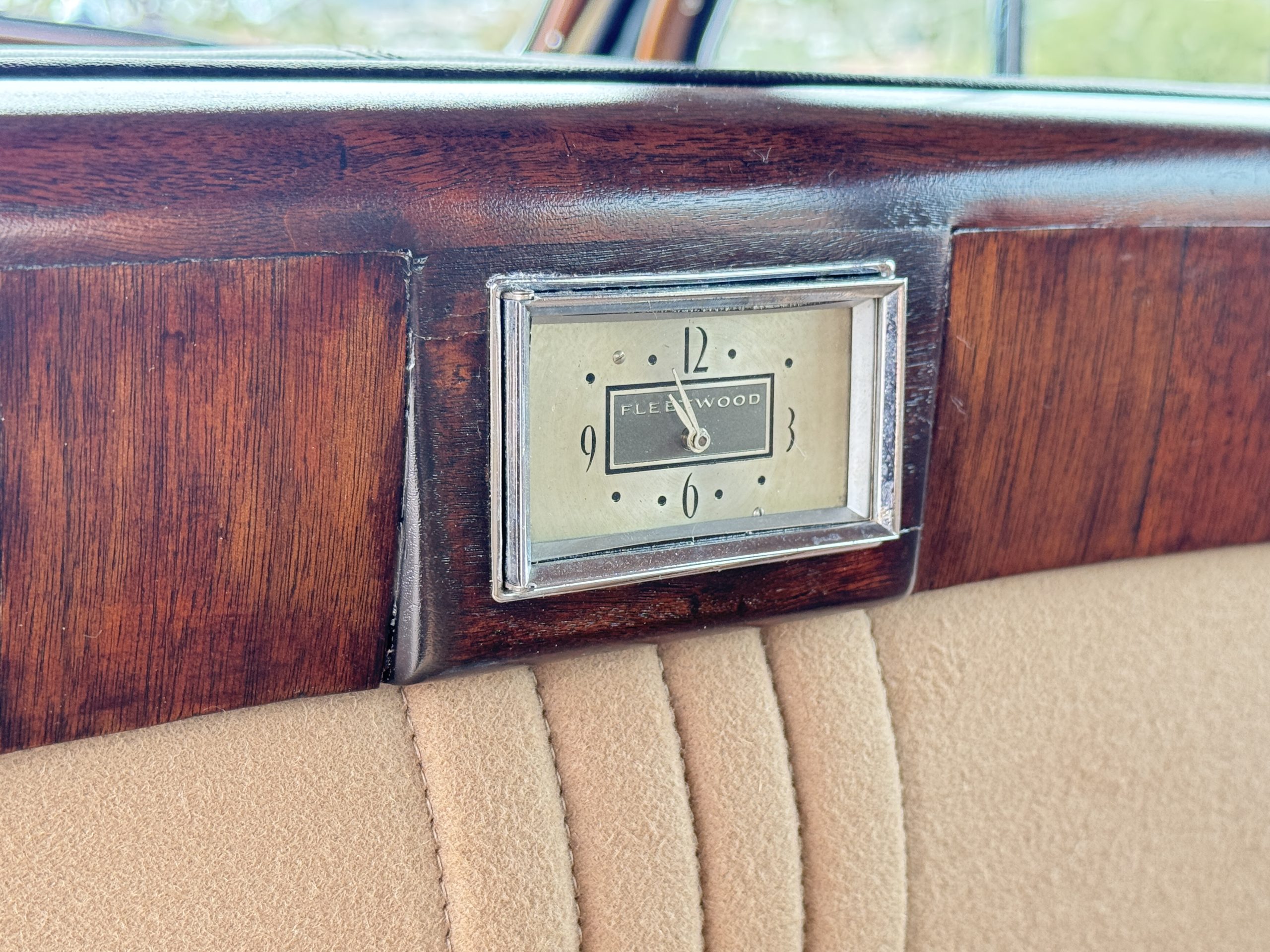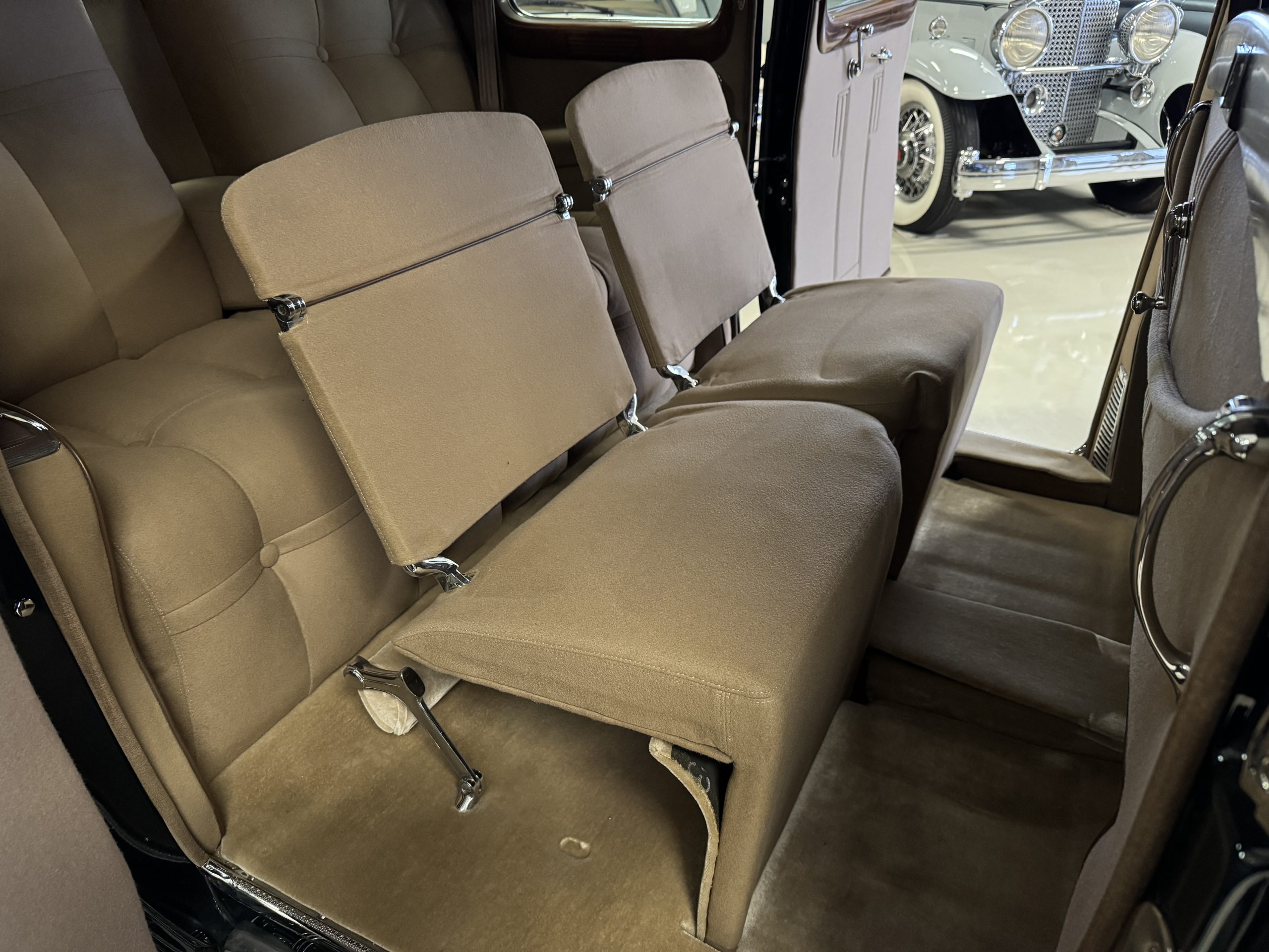 The interior reflects Cadillac’s pinnacle of chauffeur-driven luxury, with a black leather front compartment trimmed with tan carpeting that presents in very good to excellent condition. The rear passenger compartment is upholstered in tan broadcloth in excellent condition and configured with two captain-style chairs, dual folding jump seats, and plush carpeting with folding footrests, creating a serene and formal traveling environment. Burled walnut window surrounds, period-correct Art Deco lighting, and a functioning roll-up division security plate glass provide both elegance and acoustic isolation. Instrumentation, including the sweeping 100-mph speedometer, gauges, and dash clock, remains functional, while the original Motorphone intercom system is present though not currently operational.