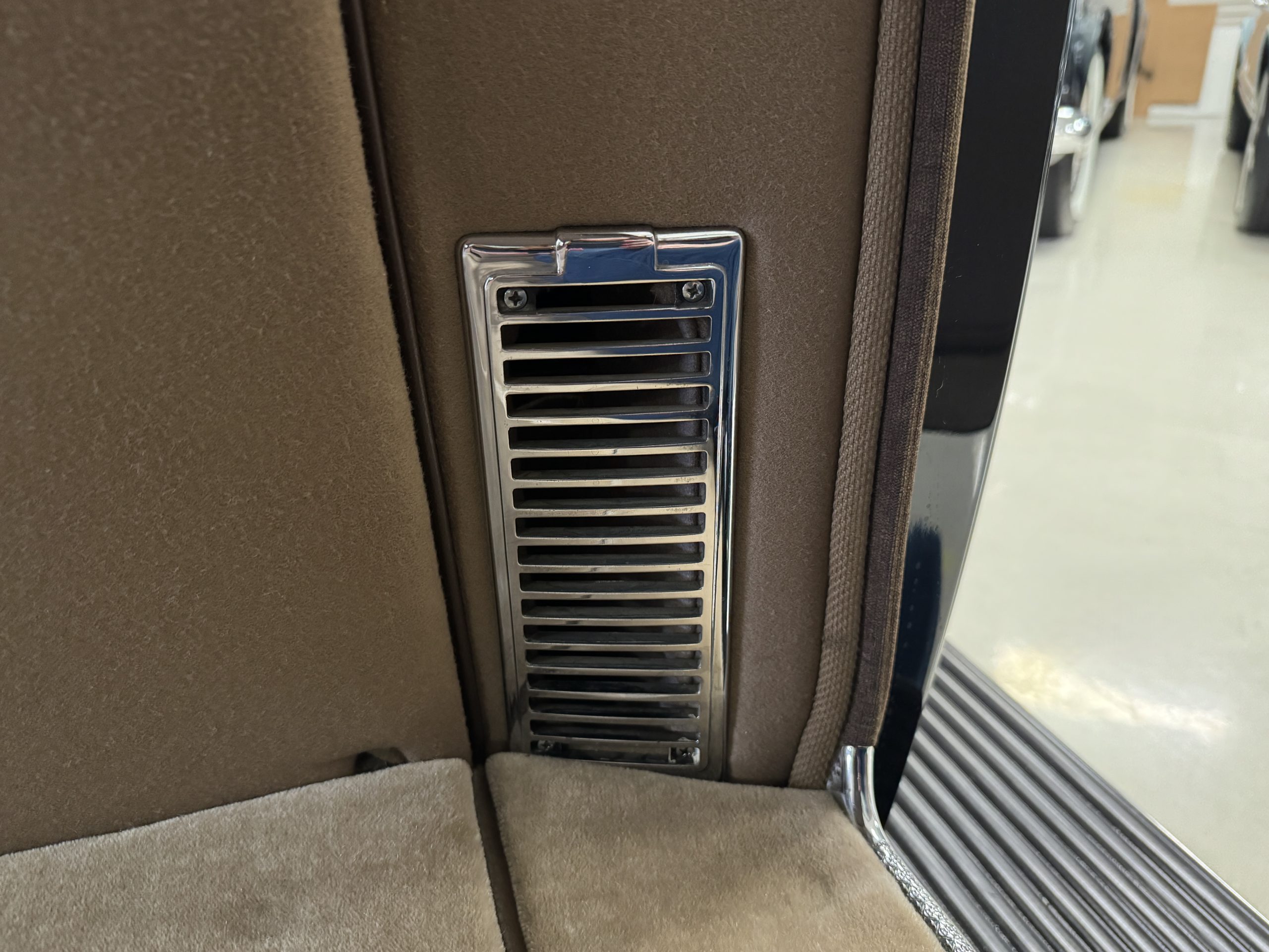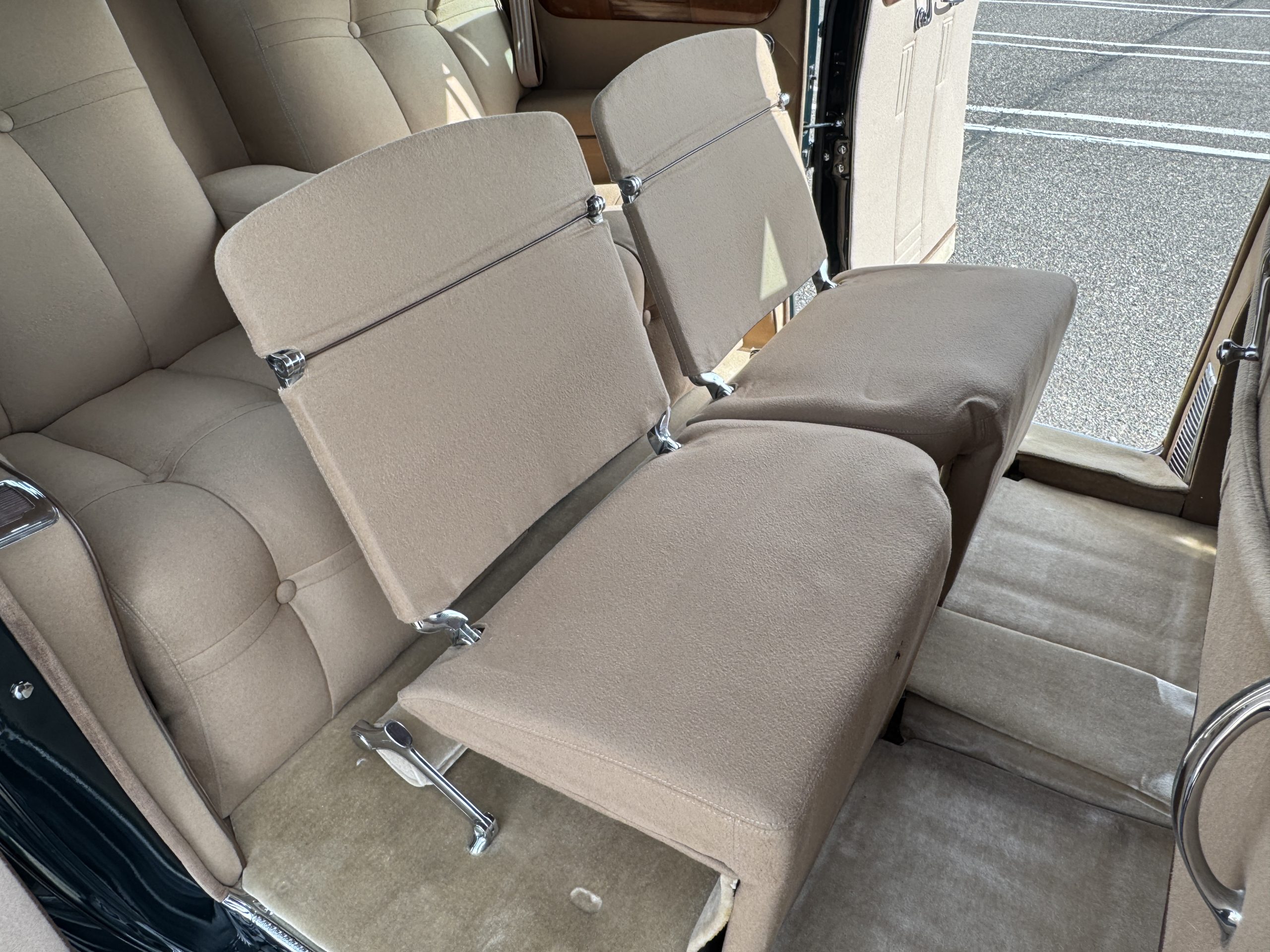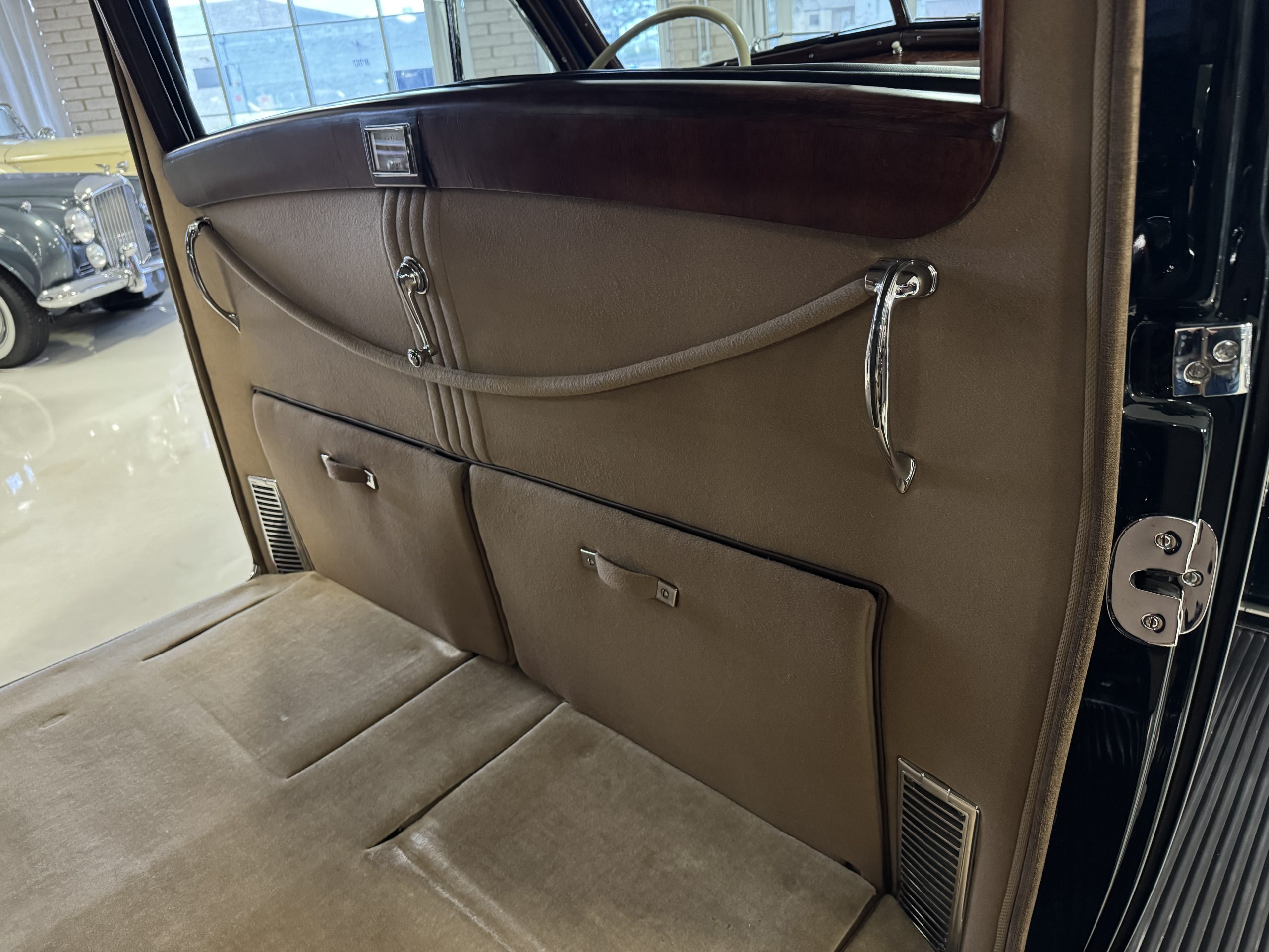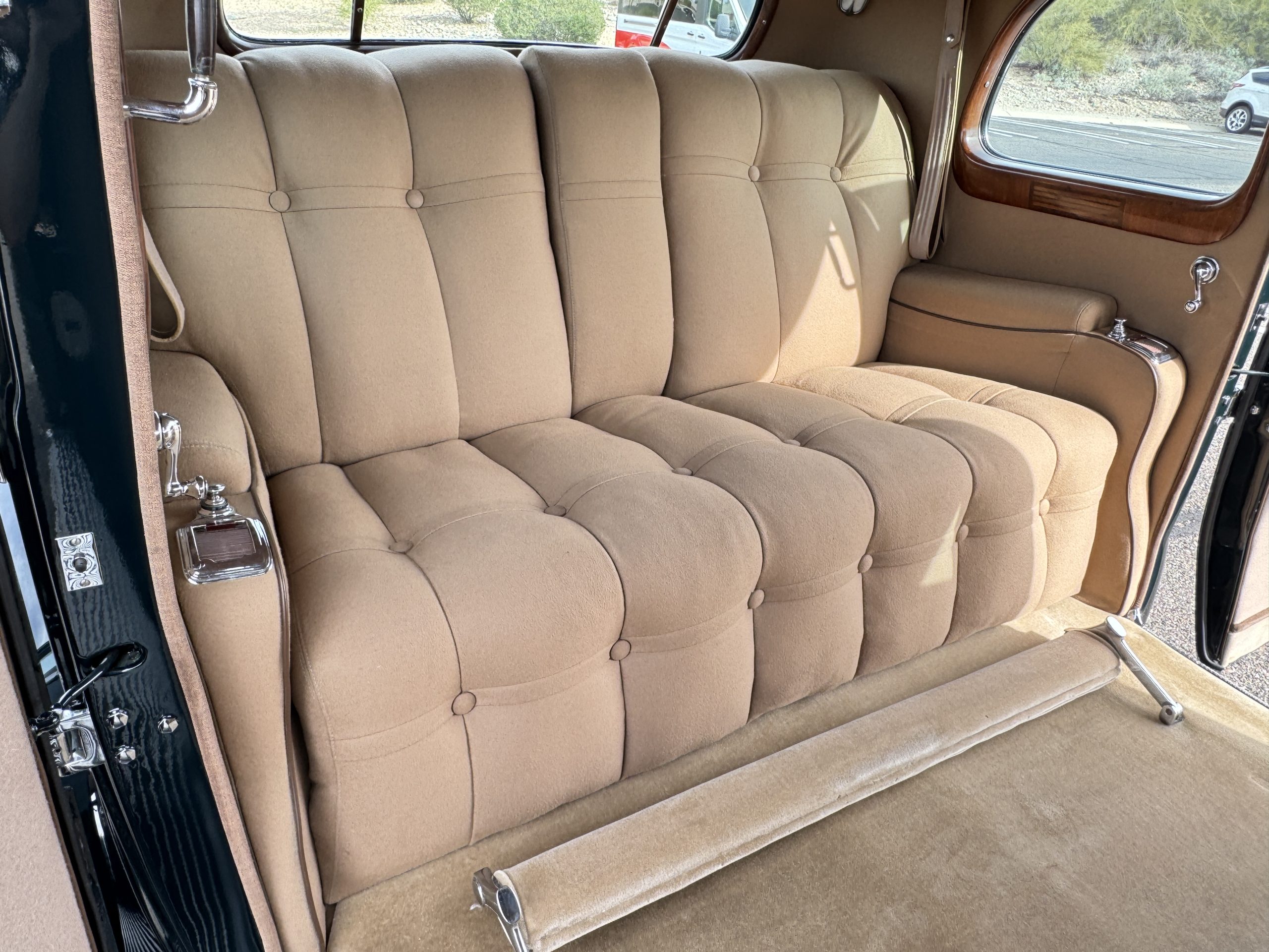 The interior reflects Cadillac’s pinnacle of chauffeur-driven luxury, with a black leather front compartment trimmed with tan carpeting that presents in very good to excellent condition. The rear passenger compartment is upholstered in tan broadcloth in excellent condition and configured with two captain-style chairs, dual folding jump seats, and plush carpeting with folding footrests, creating a serene and formal traveling environment. Burled walnut window surrounds, period-correct Art Deco lighting, and a functioning roll-up division security plate glass provide both elegance and acoustic isolation. Instrumentation, including the sweeping 100-mph speedometer, gauges, and dash clock, remains functional, while the original Motorphone intercom system is present though not currently operational.
