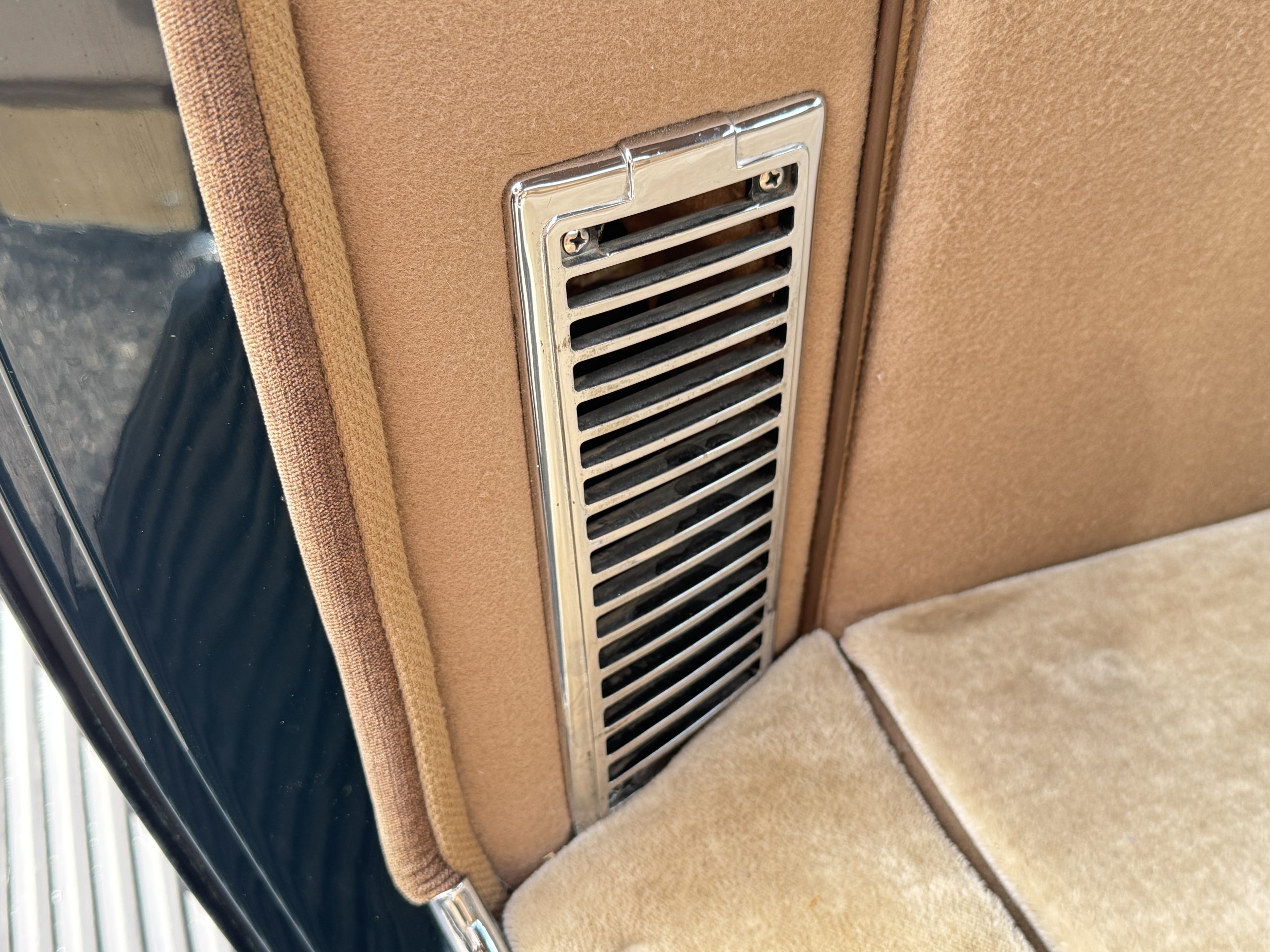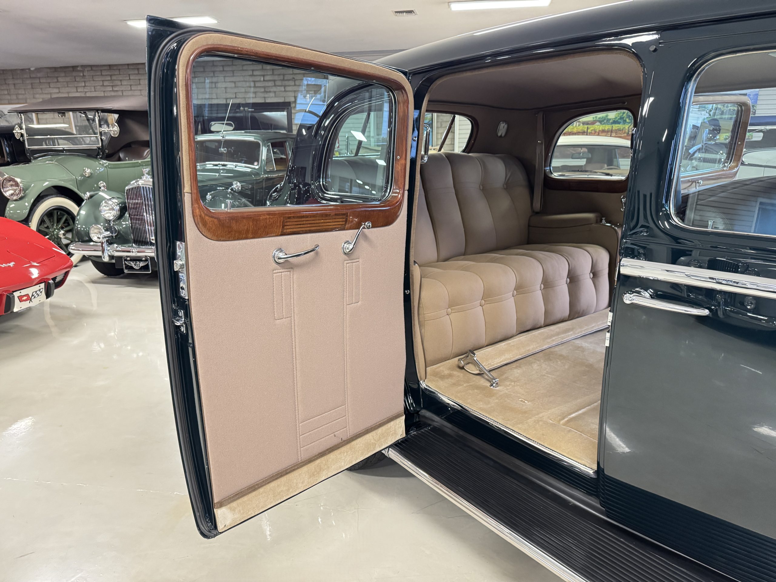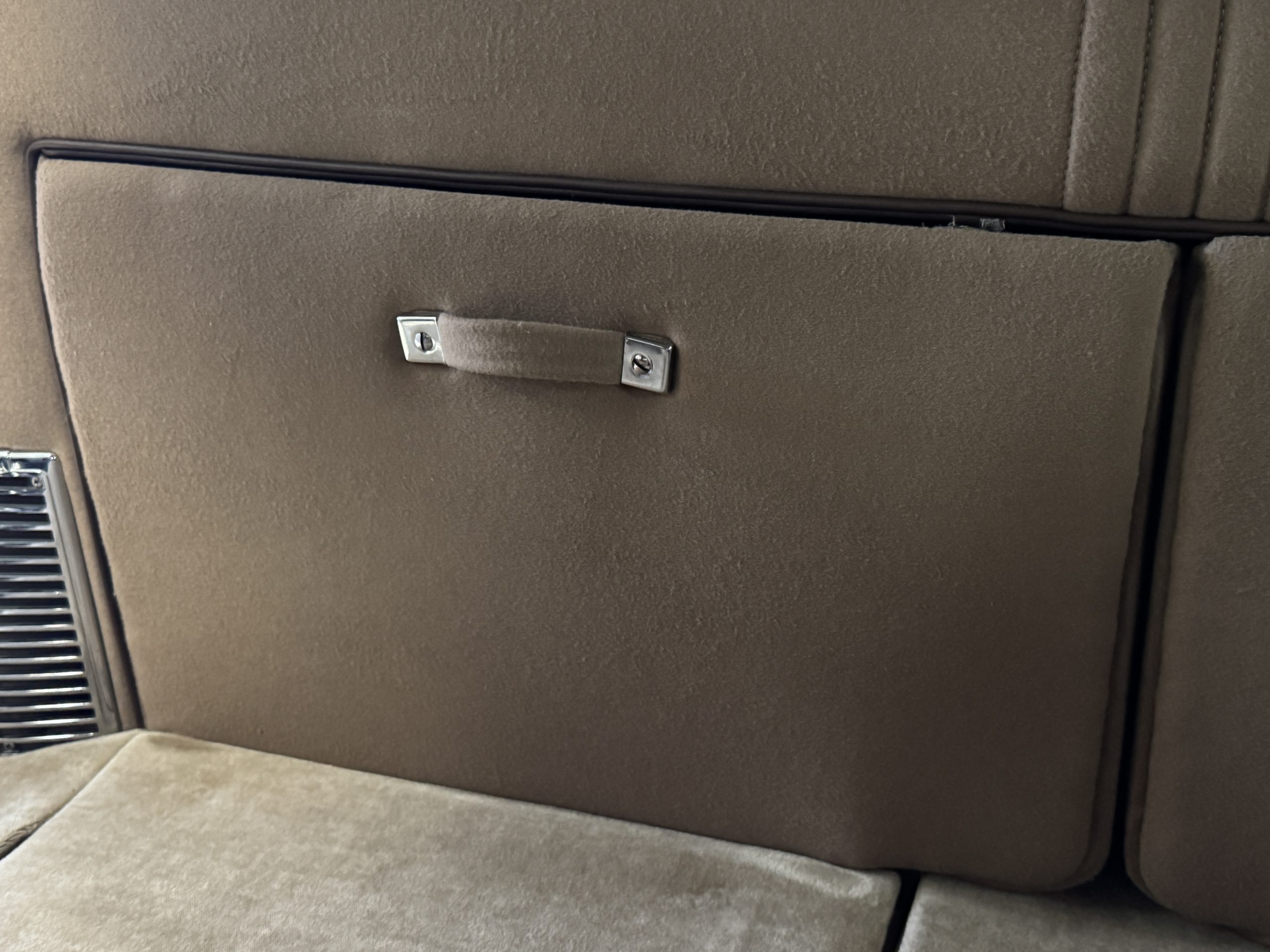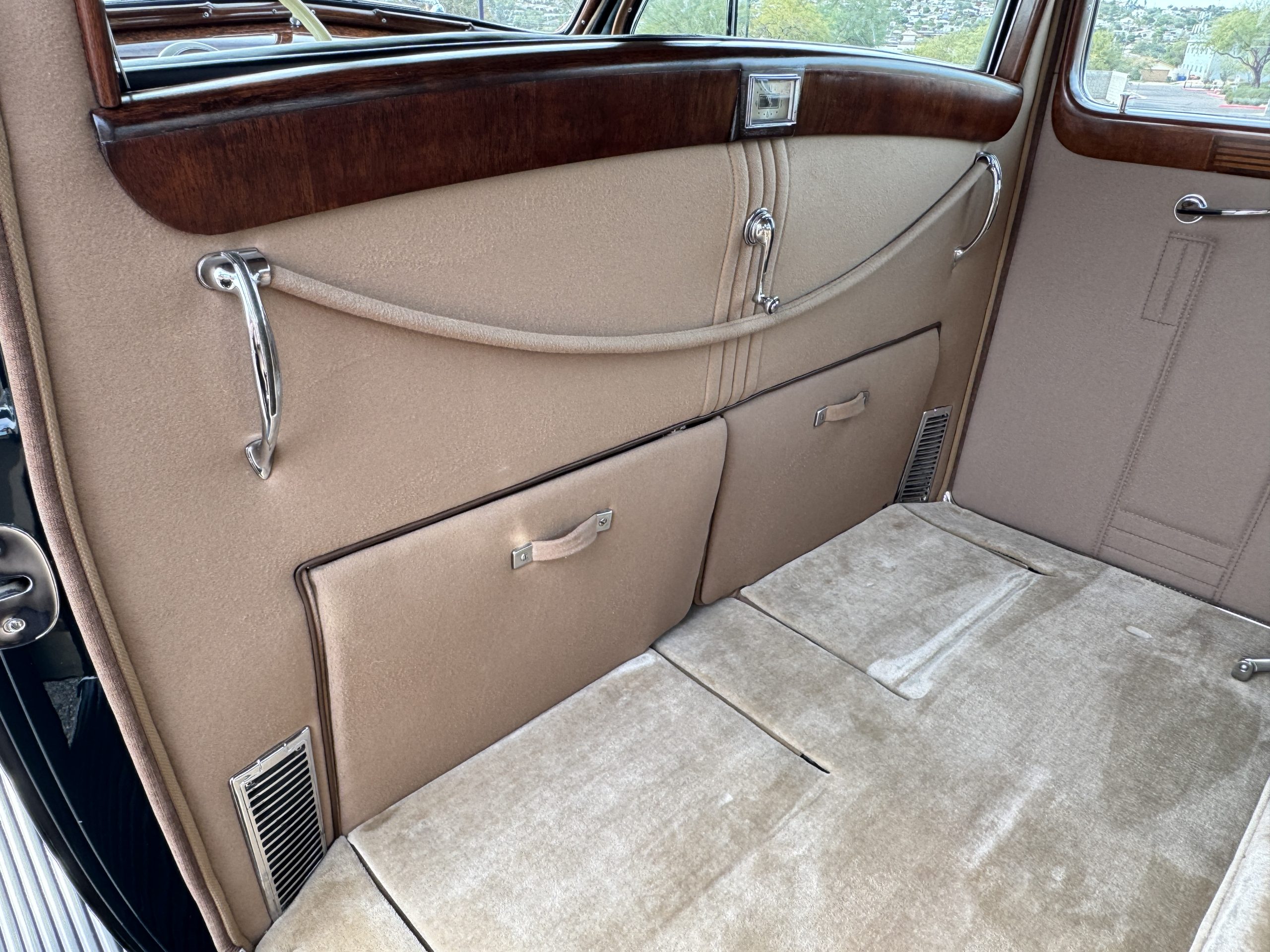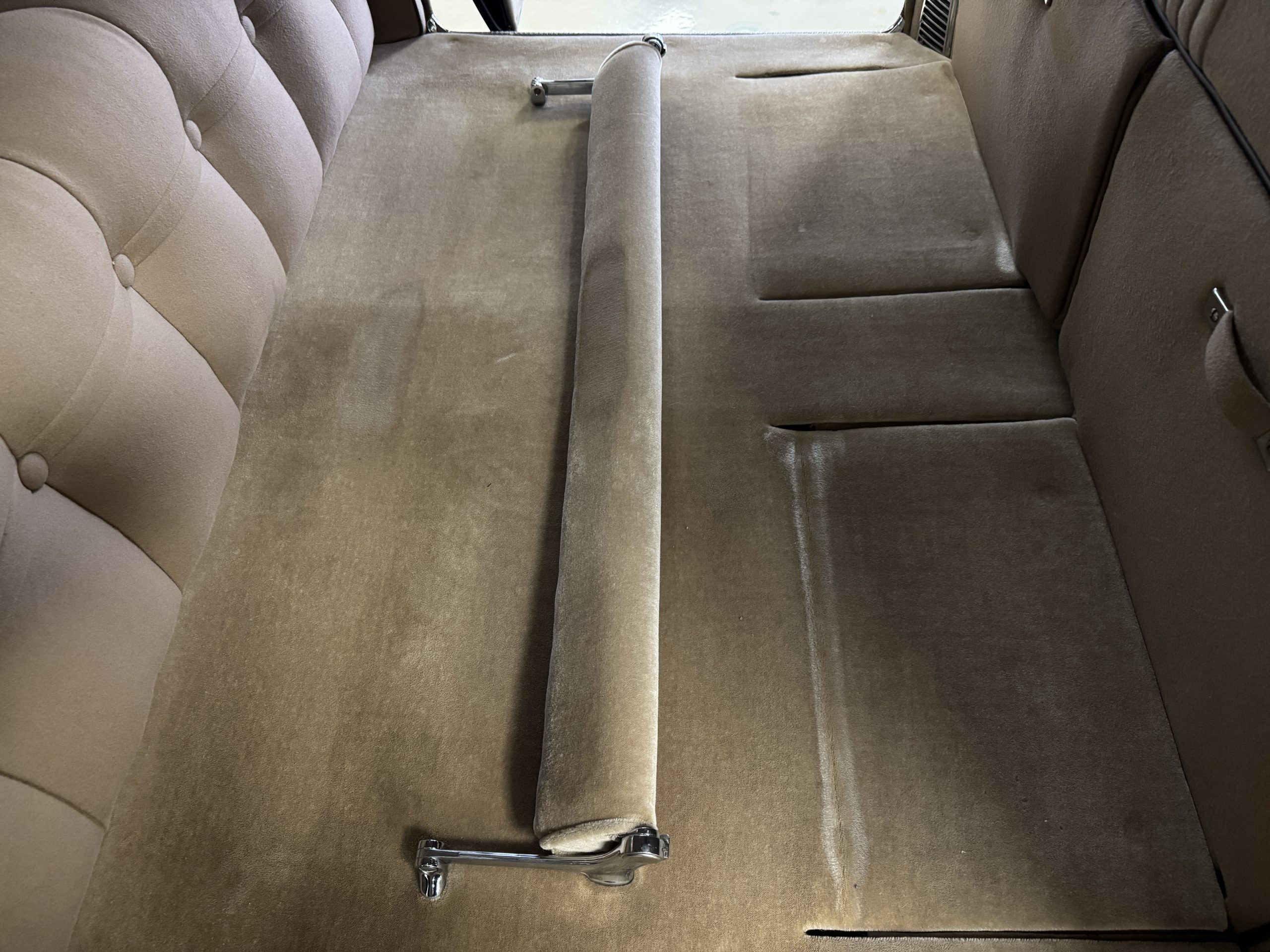 The interior reflects Cadillac’s pinnacle of chauffeur-driven luxury, with a black leather front compartment trimmed with tan carpeting that presents in very good to excellent condition. The rear passenger compartment is upholstered in tan broadcloth in excellent condition and configured with two captain-style chairs, dual folding jump seats, and plush carpeting with folding footrests, creating a serene and formal traveling environment. Burled walnut window surrounds, period-correct Art Deco lighting, and a functioning roll-up division security plate glass provide both elegance and acoustic isolation. Instrumentation, including the sweeping 100-mph speedometer, gauges, and dash clock, remains functional, while the original Motorphone intercom system is present though not currently operational.