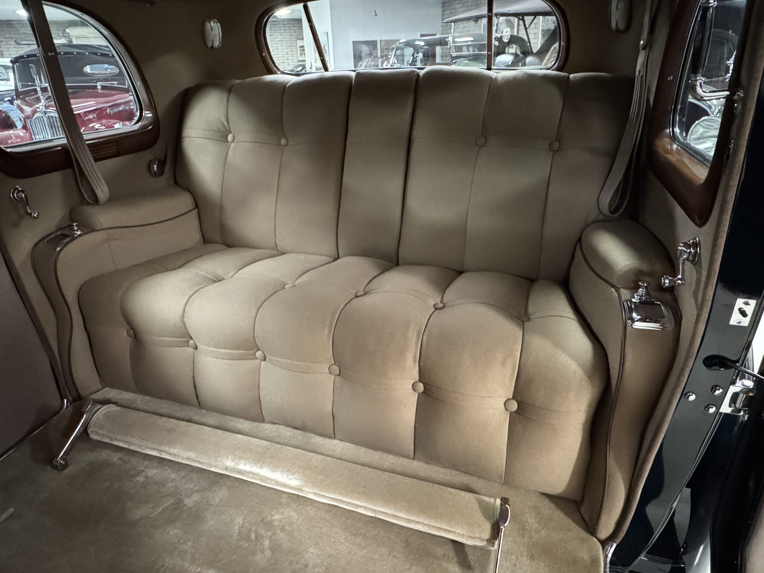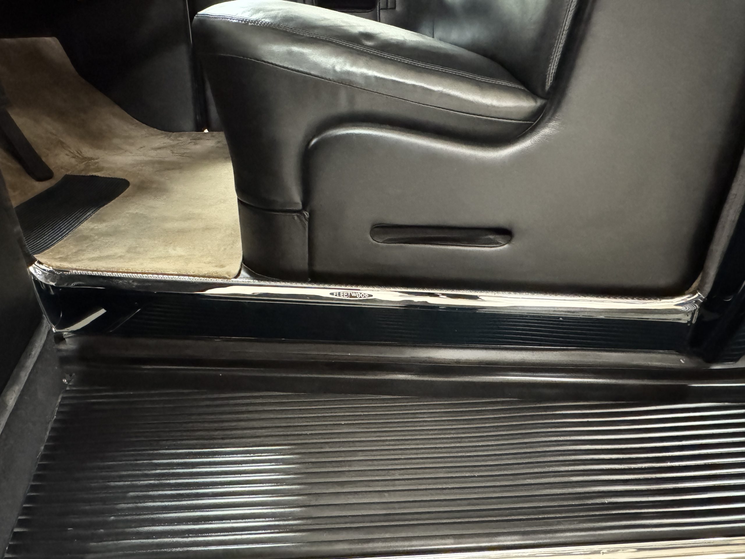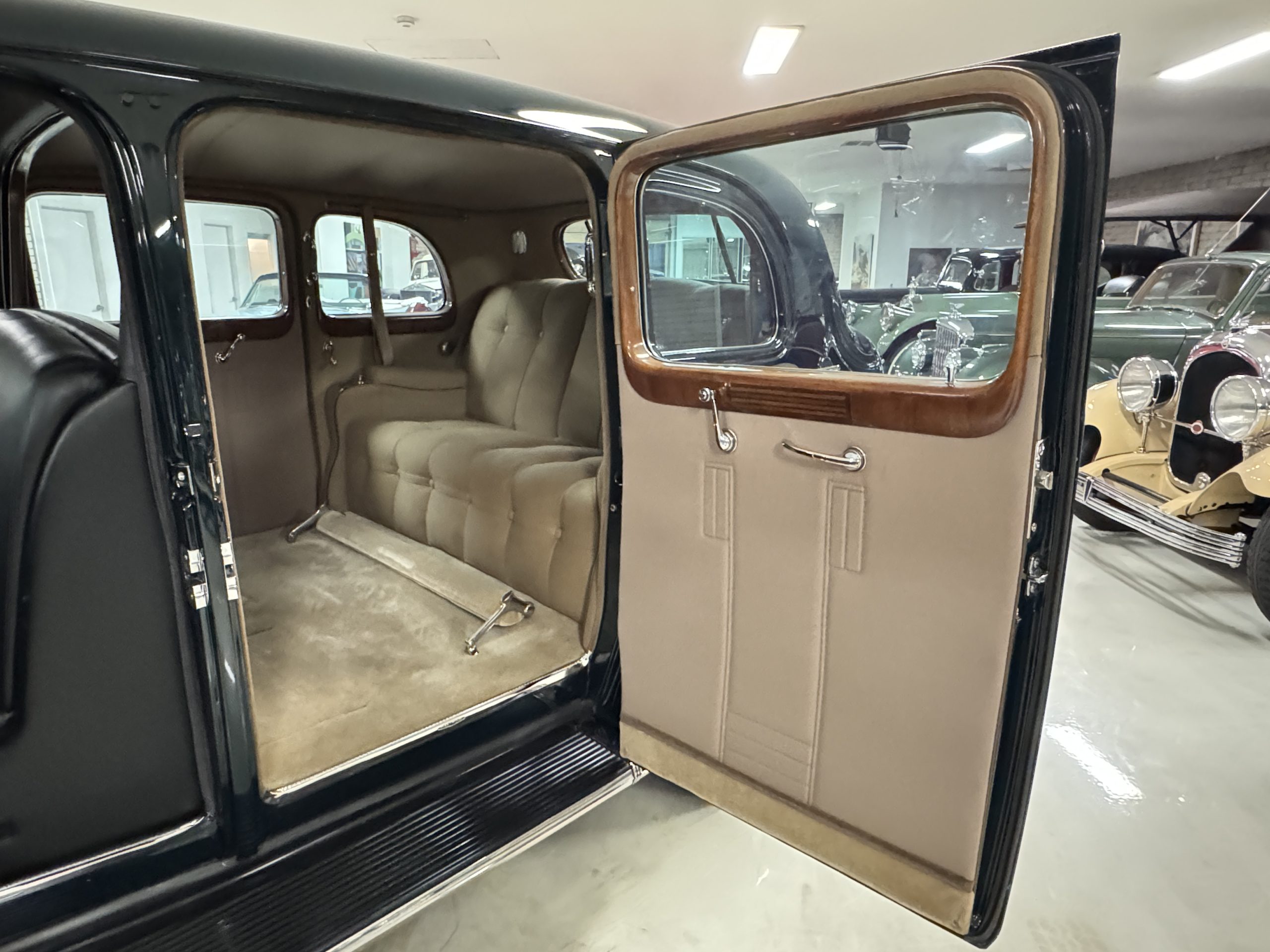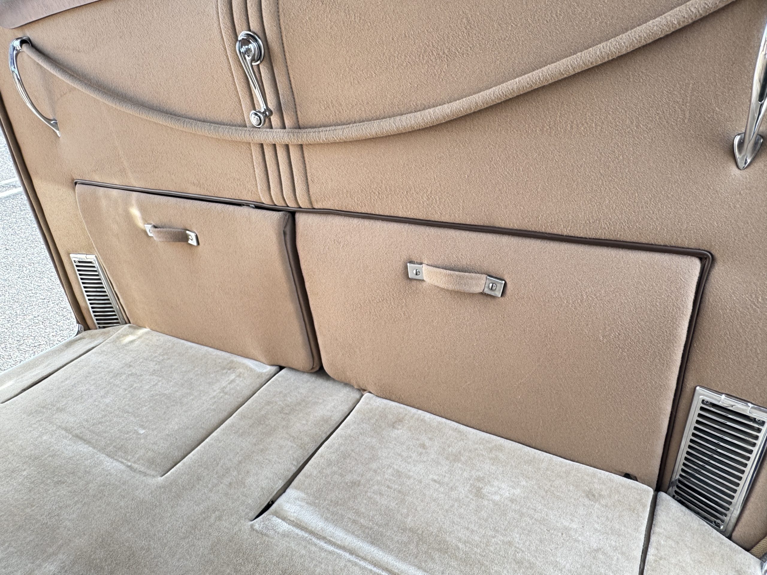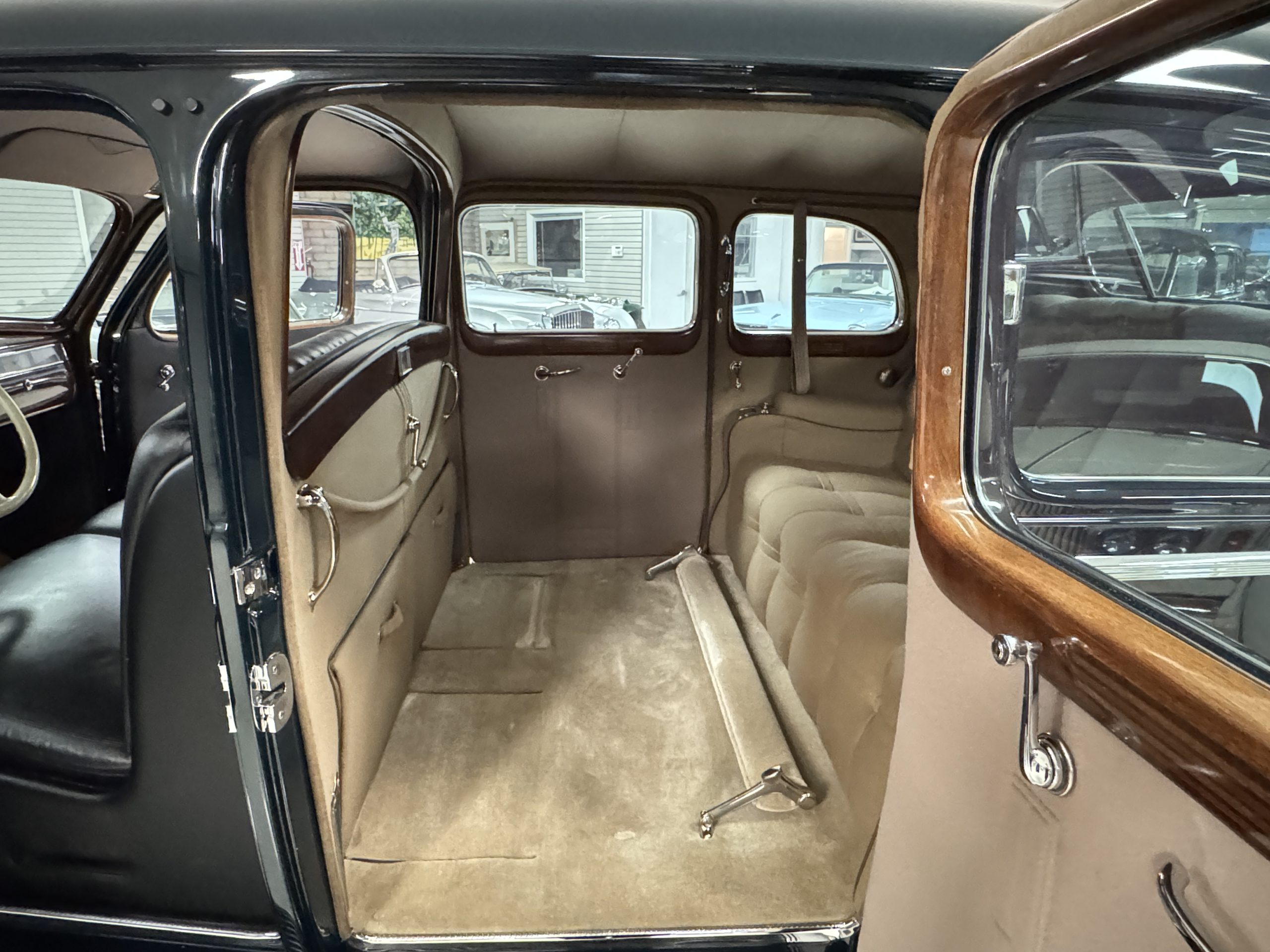 The interior reflects Cadillac’s pinnacle of chauffeur-driven luxury, with a black leather front compartment trimmed with tan carpeting that presents in very good to excellent condition. The rear passenger compartment is upholstered in tan broadcloth in excellent condition and configured with two captain-style chairs, dual folding jump seats, and plush carpeting with folding footrests, creating a serene and formal traveling environment. Burled walnut window surrounds, period-correct Art Deco lighting, and a functioning roll-up division security plate glass provide both elegance and acoustic isolation. Instrumentation, including the sweeping 100-mph speedometer, gauges, and dash clock, remains functional, while the original Motorphone intercom system is present though not currently operational.