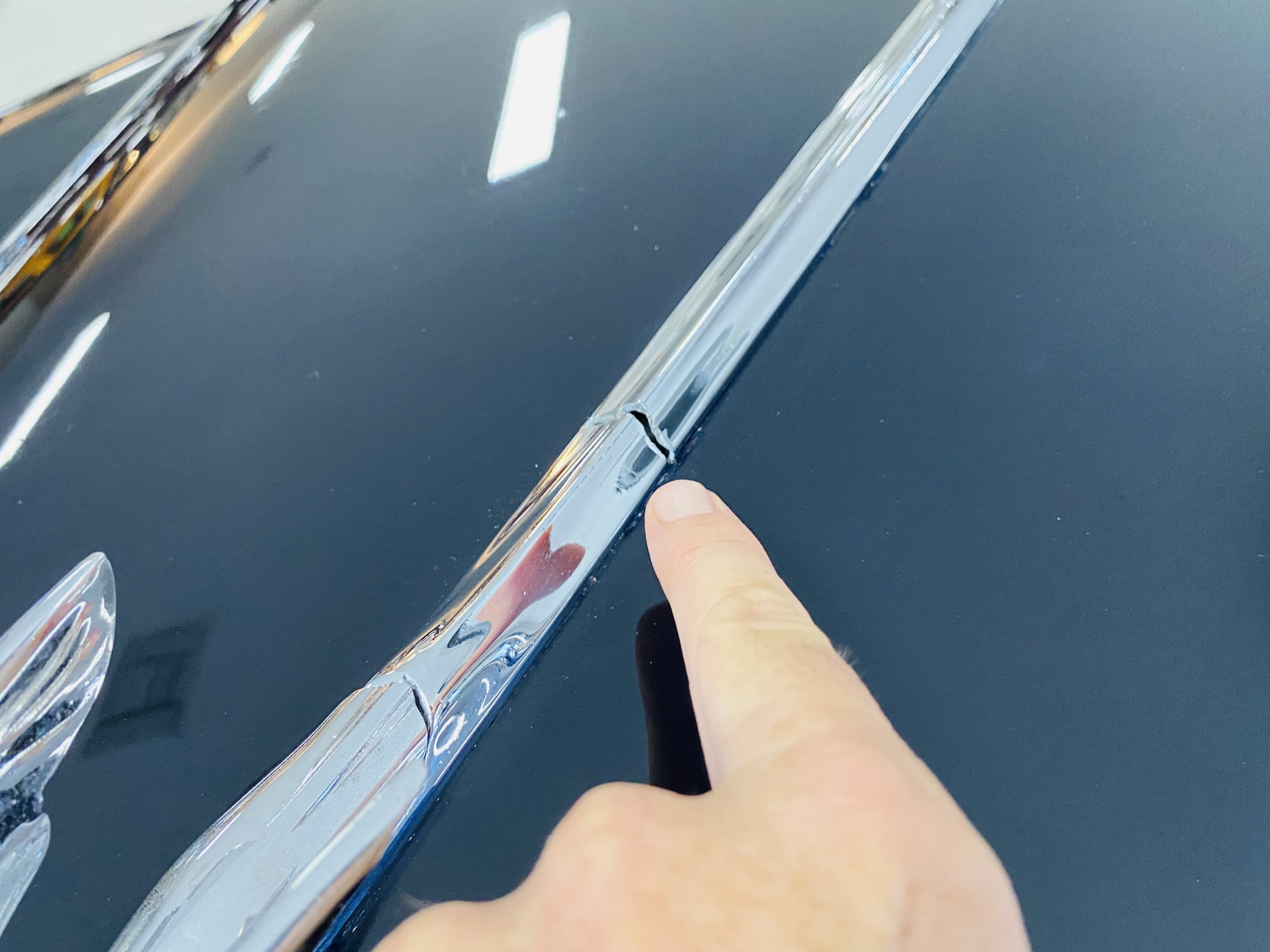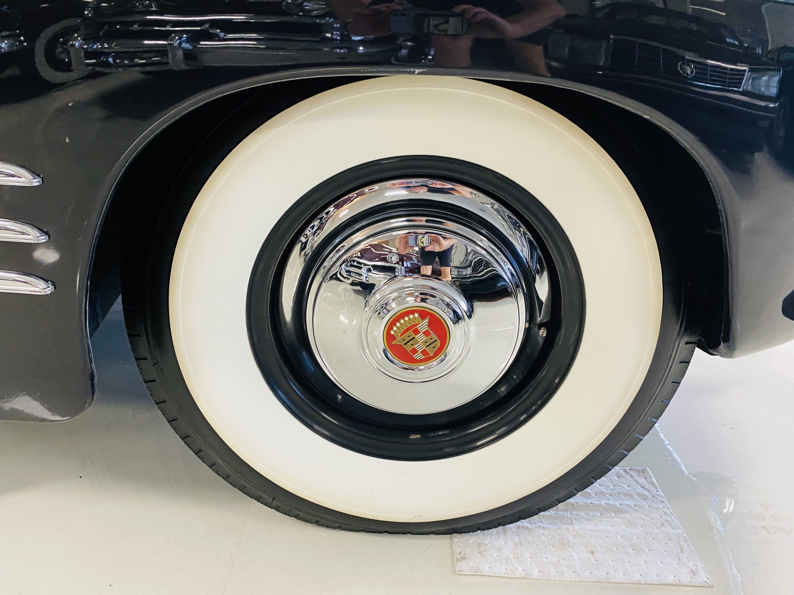 The Antoinette Blue (Paint Code 52) livery looks very elegant and just right on this 136-inch wheel base Cadillac. There are numerous small touched up areas on the paint that are noticeable only on close inspection. Overall, it looks like a beautifully preserved car that has never been restored, but instead maintained and improved over time as-needed to always be presentable, and a reliable tour car. Most of the chrome has been re-finished and looks nice. The chrome spear running down the center of the hood is cracked, but does not impact any functionality of the hood opening. Some of the glass has been replaced while others are original. The wide white wall radial tires look like bias ply but provide the safety and handling of a steel belted radial.