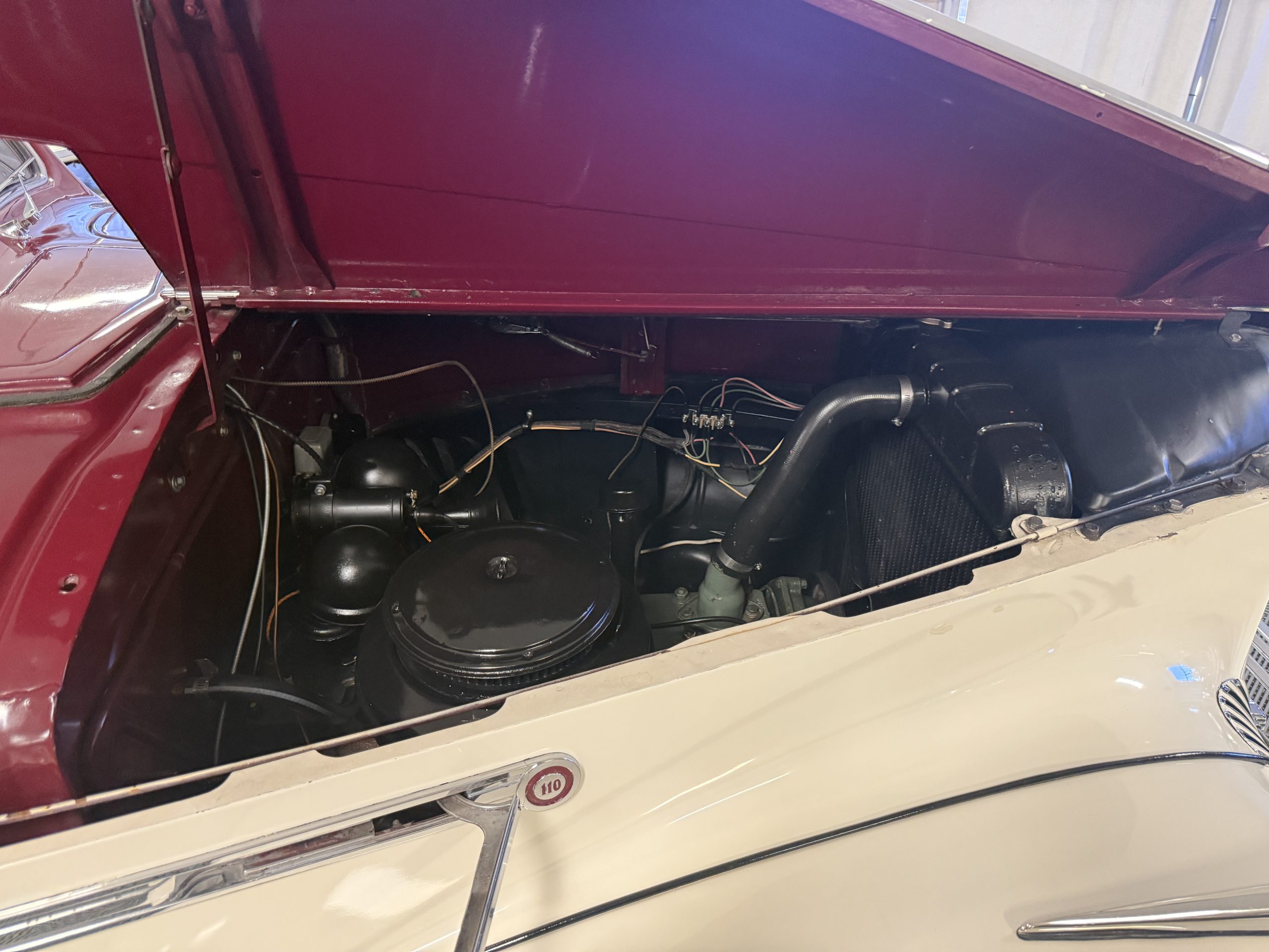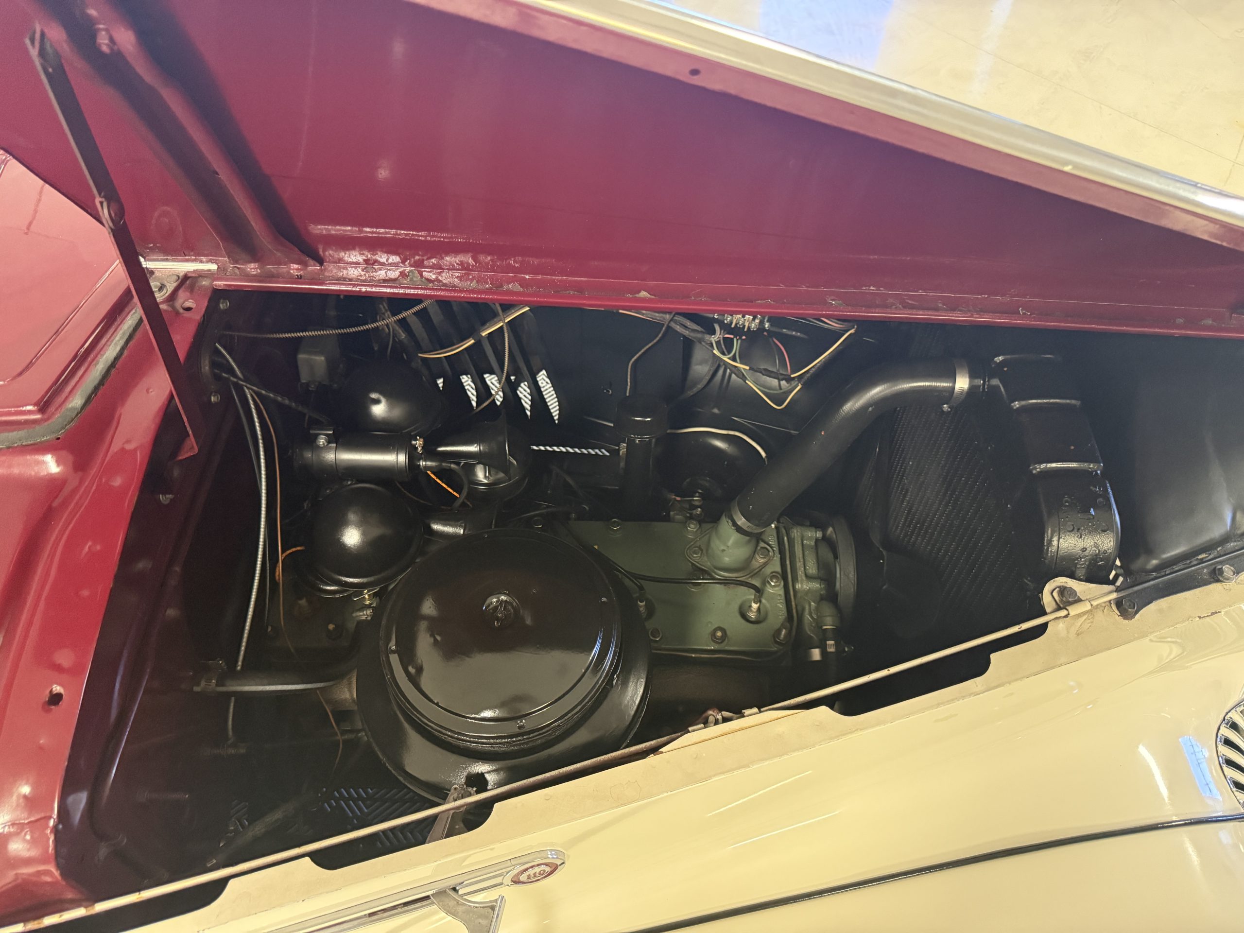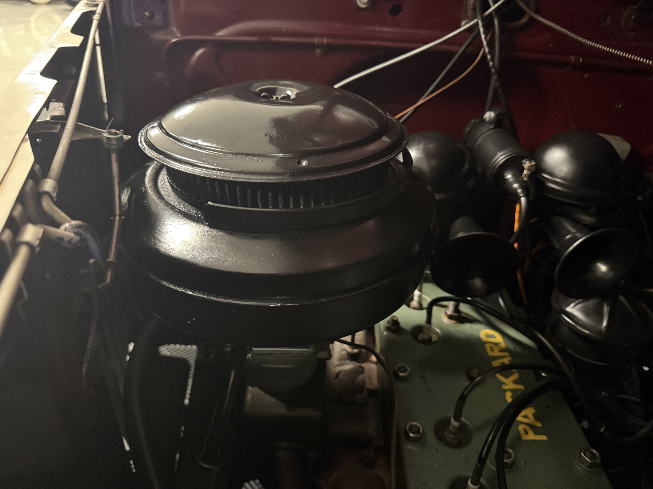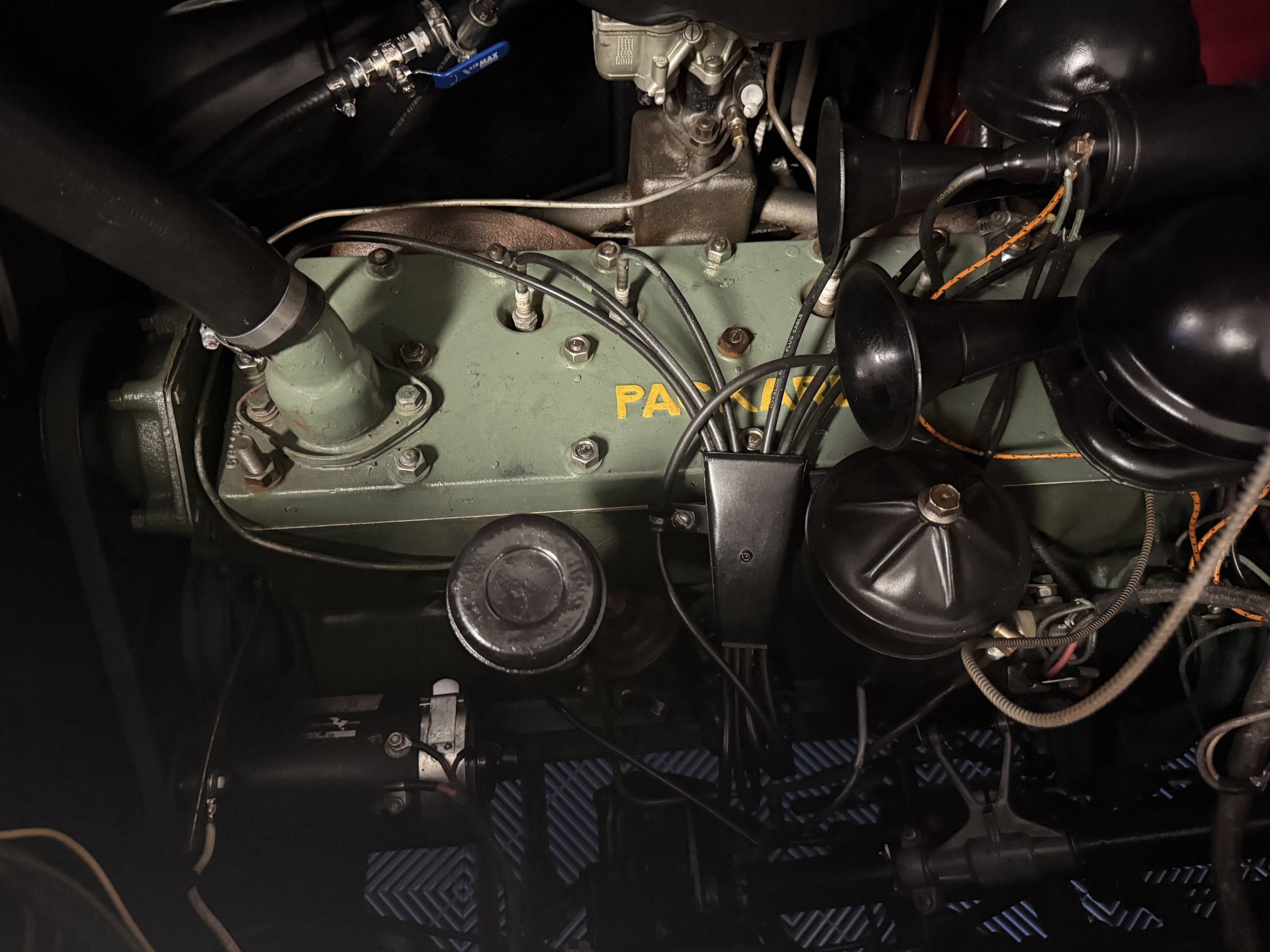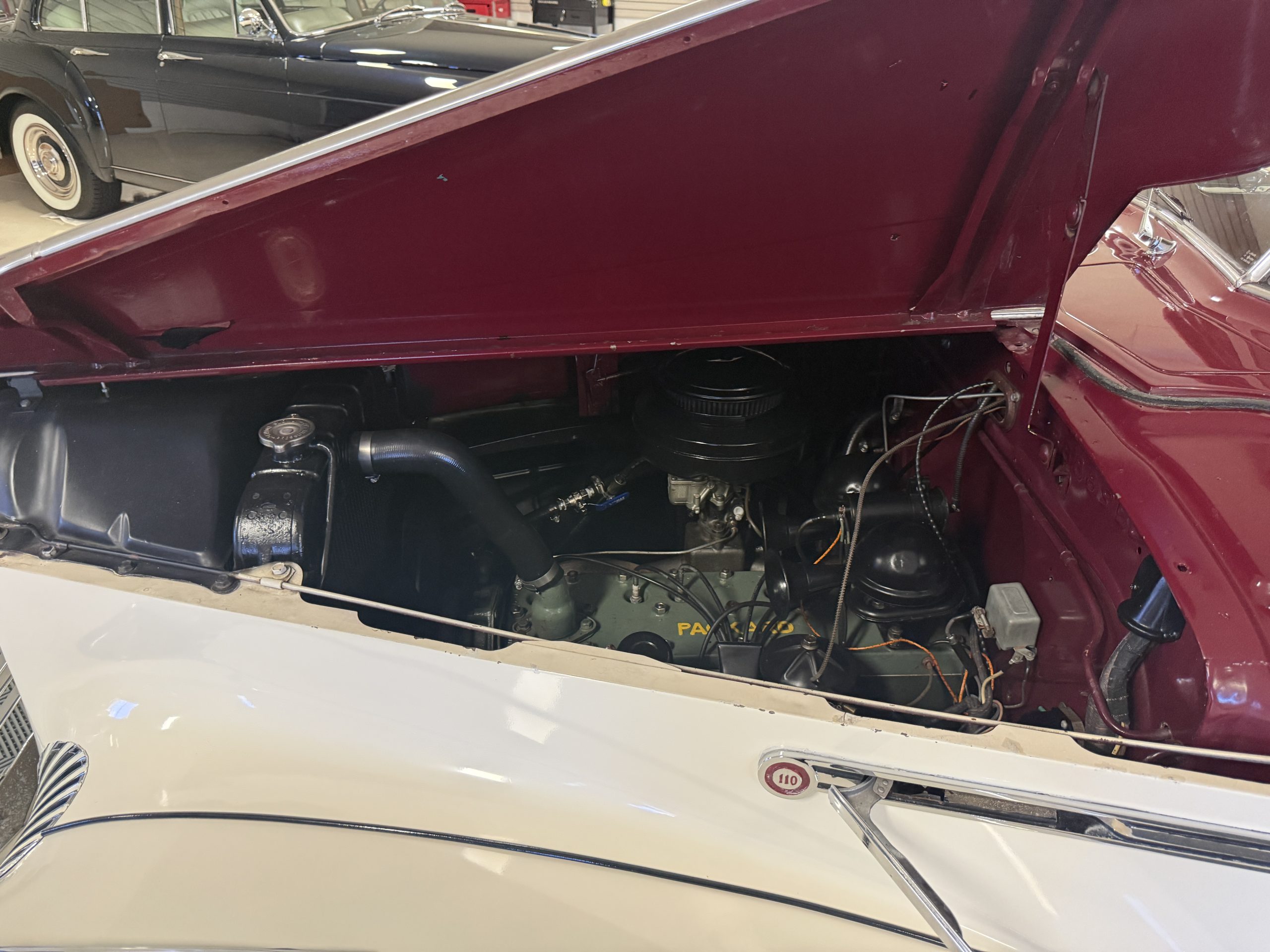 The Packard retains its original 245ci inline-six engine with a downdraft carburetor and paired to a three-speed column-shift manual transmission with overdrive. The 6V battery is mounted under the driver’s seat (dated 6/22), and a battery cutoff is next to the driver’s seat. The Packard has drum brakes. From 2019 to present, the Packard has received extensive work across multiple systems totaling over $44,000 in documented parts and service. The drivetrain and overdrive system saw significant attention, including replacement and servicing of the overdrive solenoid, relay, lockout switch, transmission components, U-joints, and driveshaft work. The brake system was addressed with new brake shoes, springs, and wheel cylinders, along with additional brake-related service. The electrical system was substantially updated with a new wiring harness, rebuilt radio, ignition switch, and various electrical components. The fuel system includes work on the fuel pump, gas tank, sending unit, and fuel gauge repairs. The cooling and general mechanical systems include routine servicing. Interior and accessory-related work includes repairs to switches, interior handles, and dash components. Lastly, cosmetic and trim work included grille installation, chrome work, and minor paint-related items.. The Packard presents as a mechanically complete example with documented recent investment and functional systems.