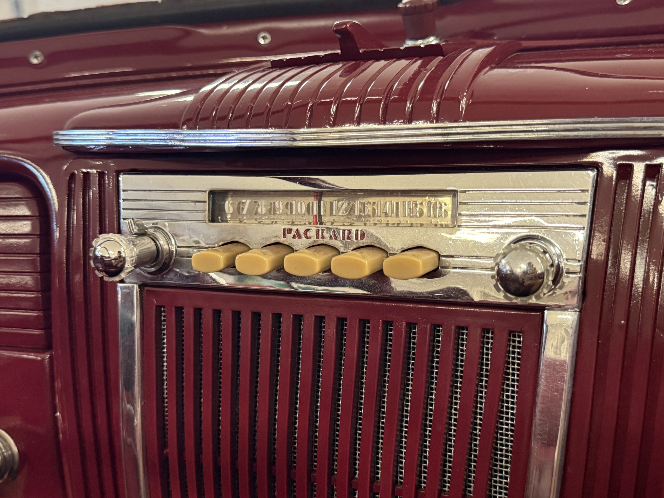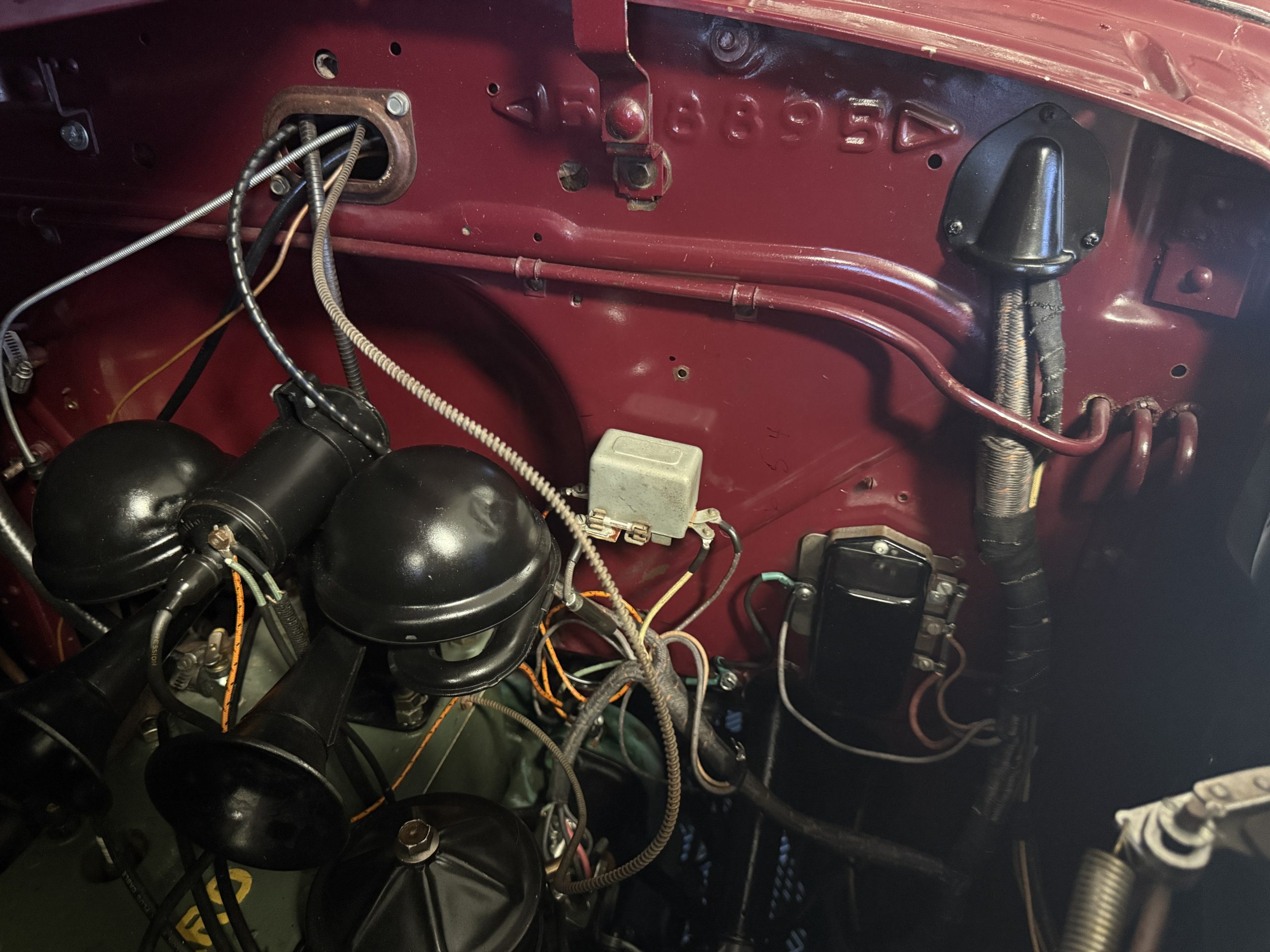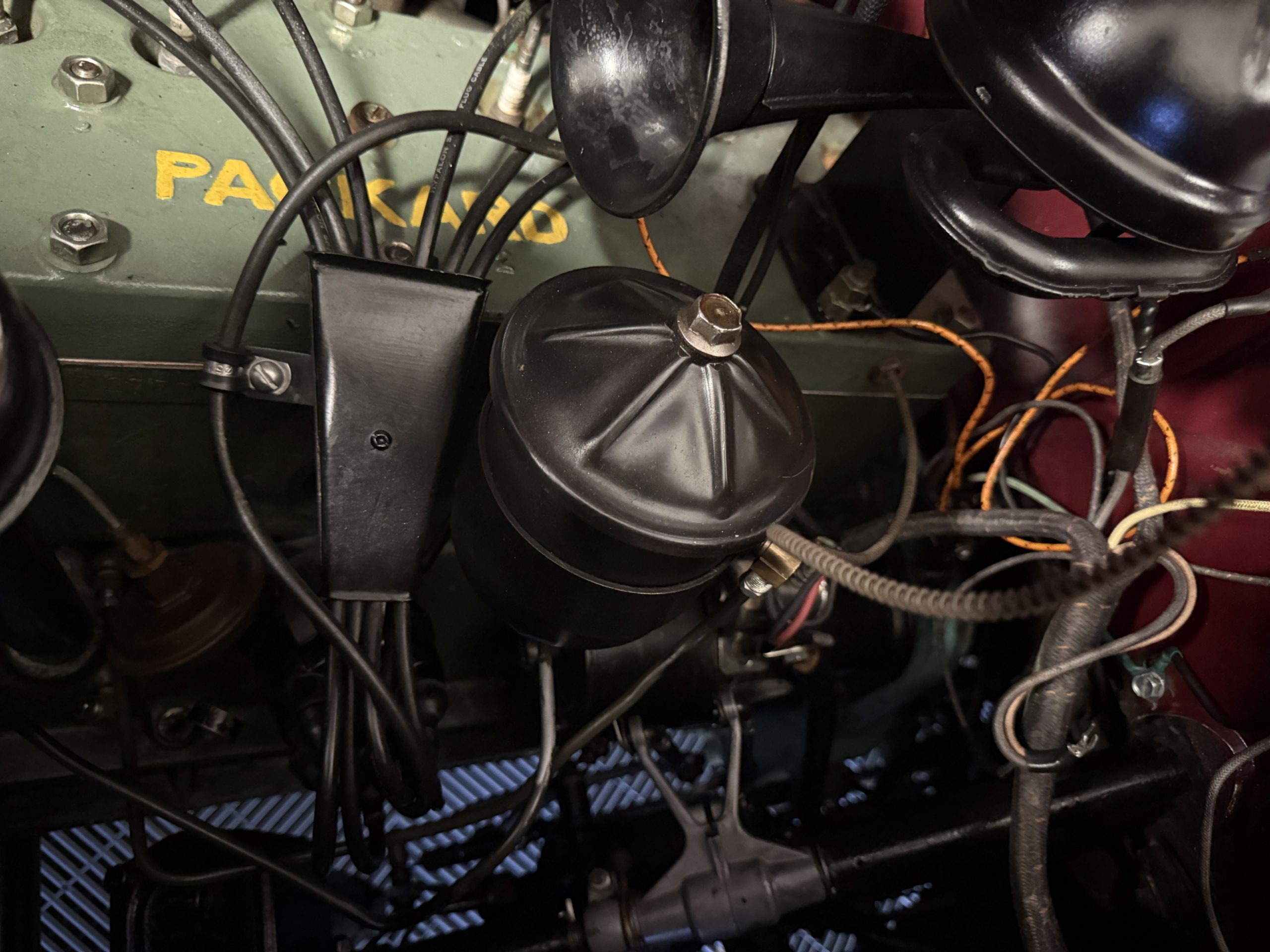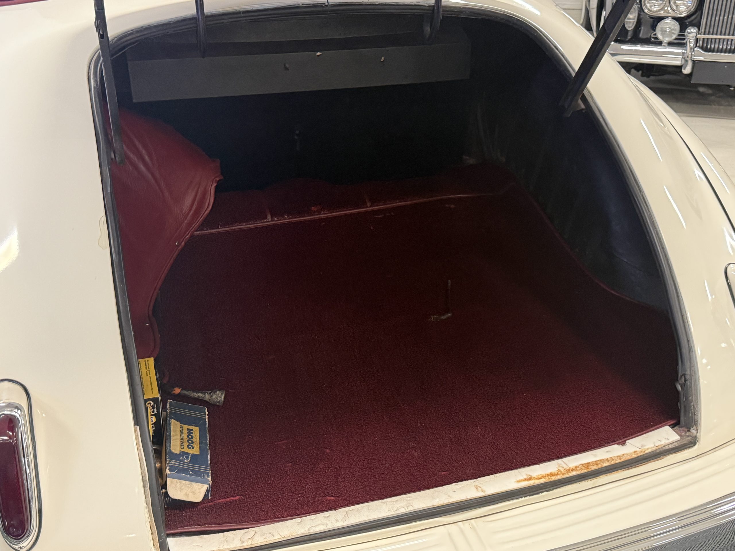 The Packard retains its original 245ci inline-six engine with a downdraft carburetor and paired to a three-speed column-shift manual transmission with overdrive. The 6V battery is mounted under the driver’s seat (dated 6/22), and a battery cutoff is next to the driver’s seat. The Packard has drum brakes. From 2019 to present, the Packard has received extensive work across multiple systems totaling over $44,000 in documented parts and service. The drivetrain and overdrive system saw significant attention, including replacement and servicing of the overdrive solenoid, relay, lockout switch, transmission components, U-joints, and driveshaft work. The brake system was addressed with new brake shoes, springs, and wheel cylinders, along with additional brake-related service. The electrical system was substantially updated with a new wiring harness, rebuilt radio, ignition switch, and various electrical components. The fuel system includes work on the fuel pump, gas tank, sending unit, and fuel gauge repairs. The cooling and general mechanical systems include routine servicing. Interior and accessory-related work includes repairs to switches, interior handles, and dash components. Lastly, cosmetic and trim work included grille installation, chrome work, and minor paint-related items.. The Packard presents as a mechanically complete example with documented recent investment and functional systems.