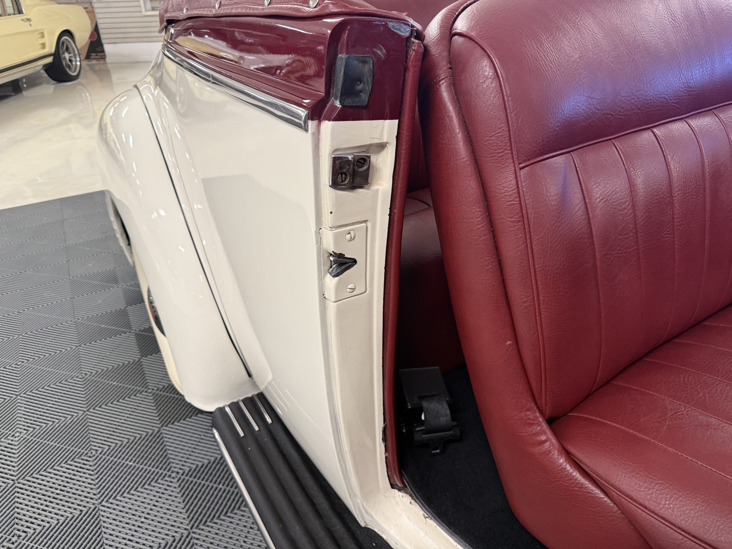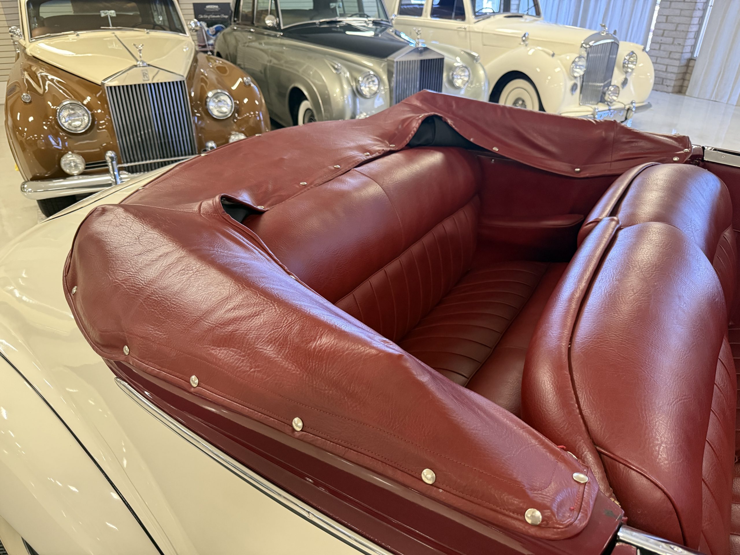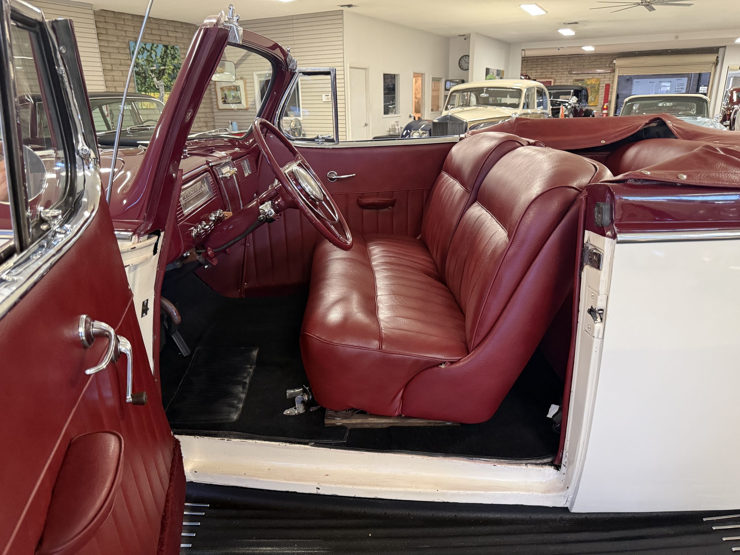 The exterior of this Packard is in overall good condition, finished in a two-tone maroon over white that shows visible chips and cracking consistent with age and use. The convertible top is finished in maroon with a matching boot cover. Brightwork is in overall good condition with some wear and pitting across trim elements. The headlights, sidelights, turn signals, taillights, and windshield wipers all function correctly. The Packard has wire wheels fitted with Coker Classic whitewall tires replaced in 2018. The 110 presents as a beautiful driver that has a desirable color combination that is ready to be enjoyed!
