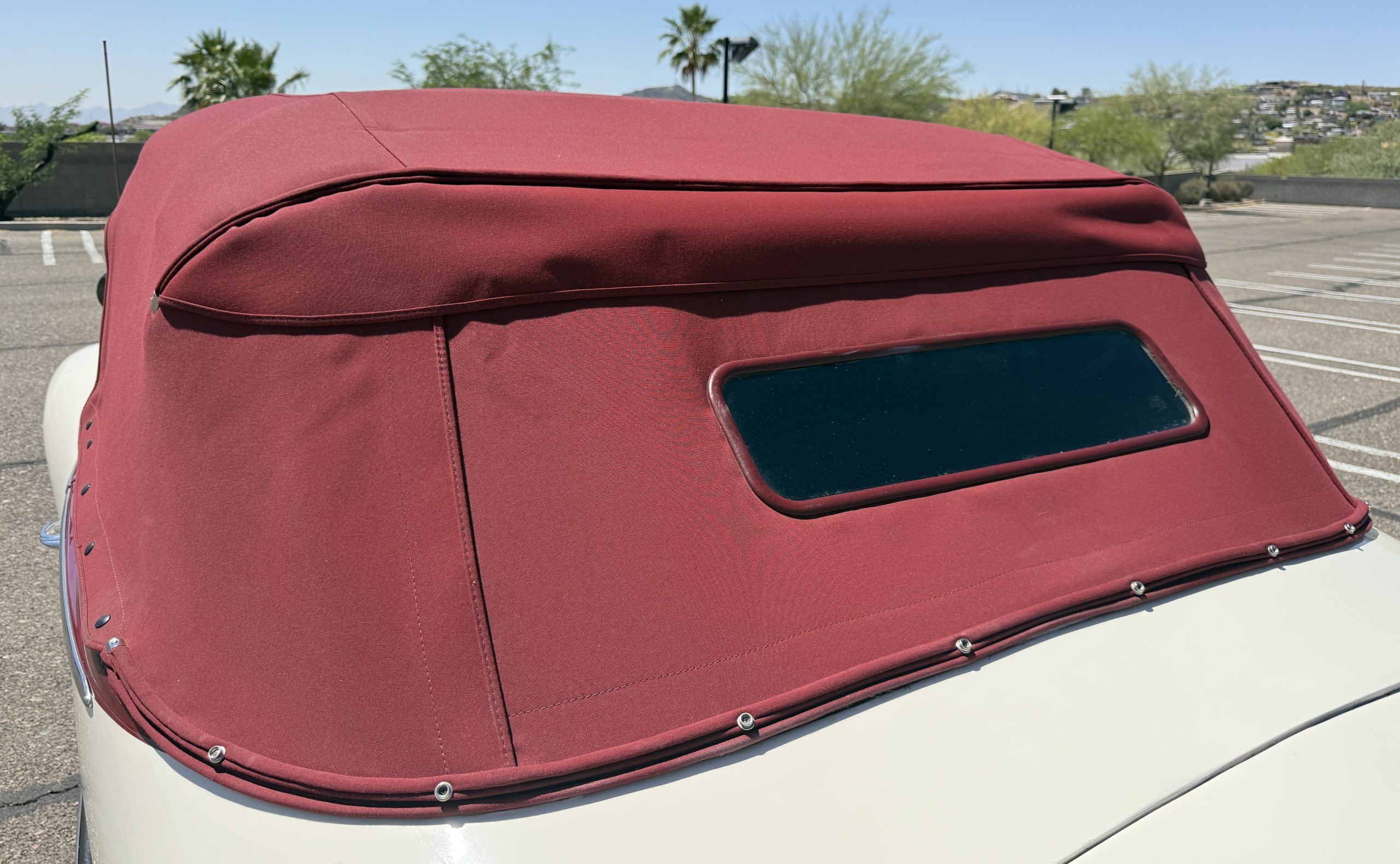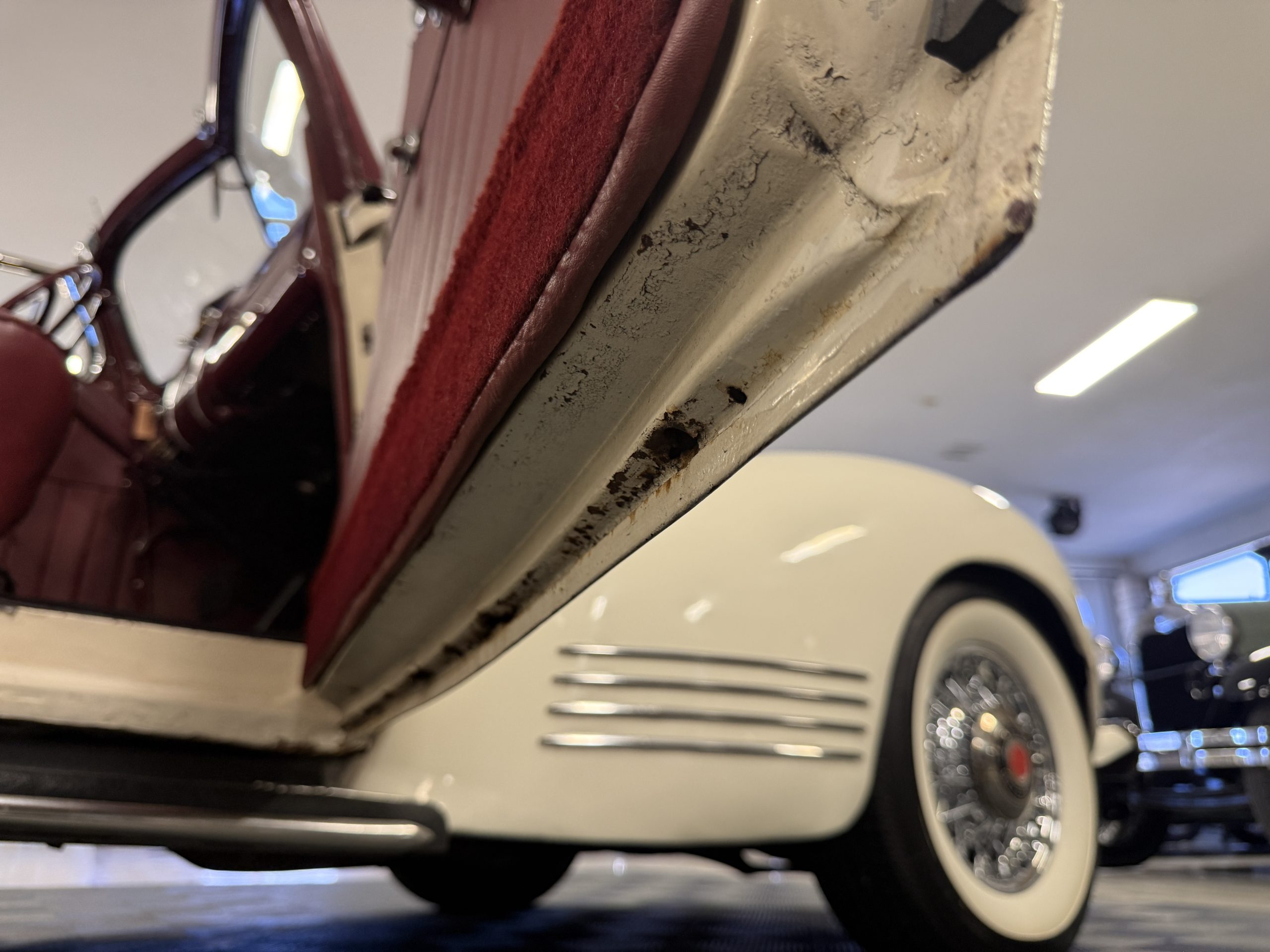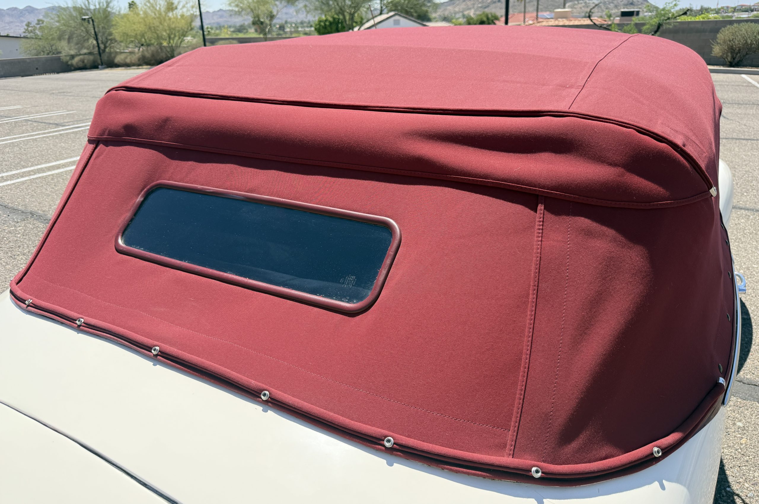 The exterior of this Packard is in overall good condition, finished in a two-tone maroon over white that shows visible chips and cracking consistent with age and use. The convertible top is finished in maroon with a matching boot cover. Brightwork is in overall good condition with some wear and pitting across trim elements. The headlights, sidelights, turn signals, taillights, and windshield wipers all function correctly. The Packard has wire wheels fitted with Coker Classic whitewall tires replaced in 2018. The 110 presents as a beautiful driver that has a desirable color combination that is ready to be enjoyed!