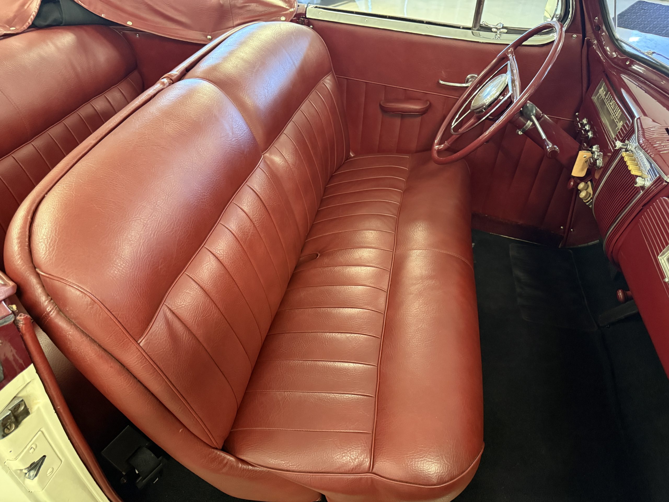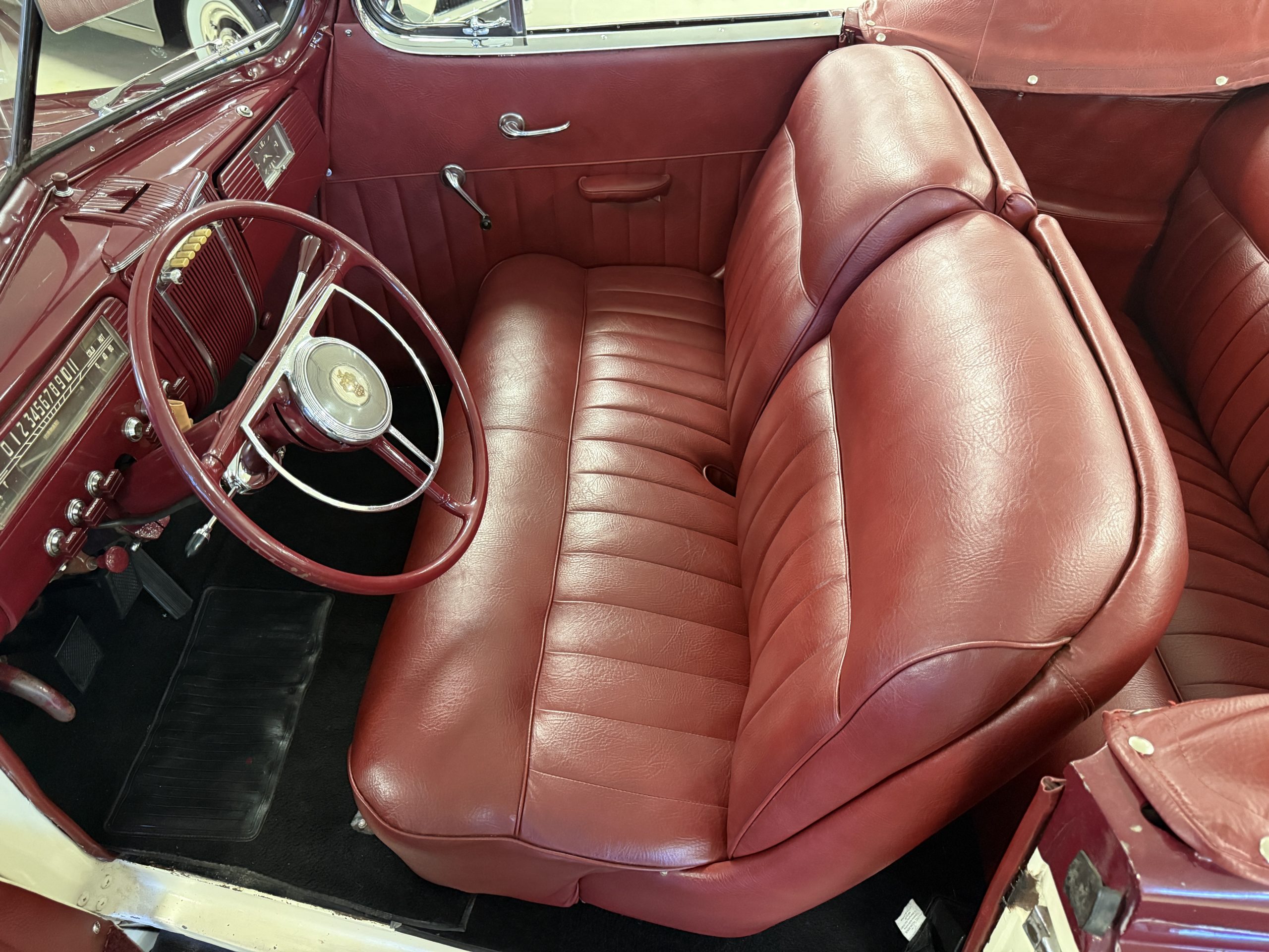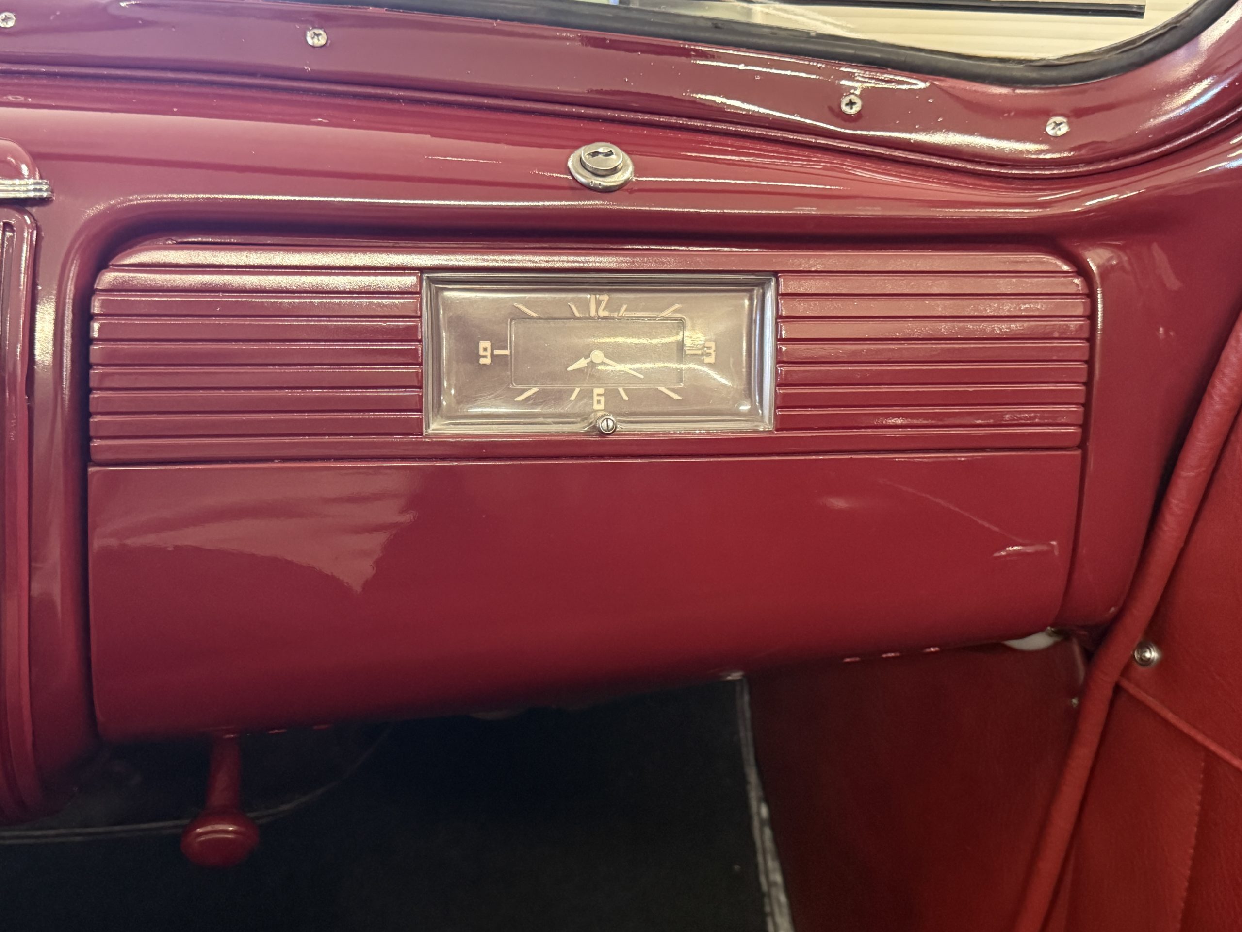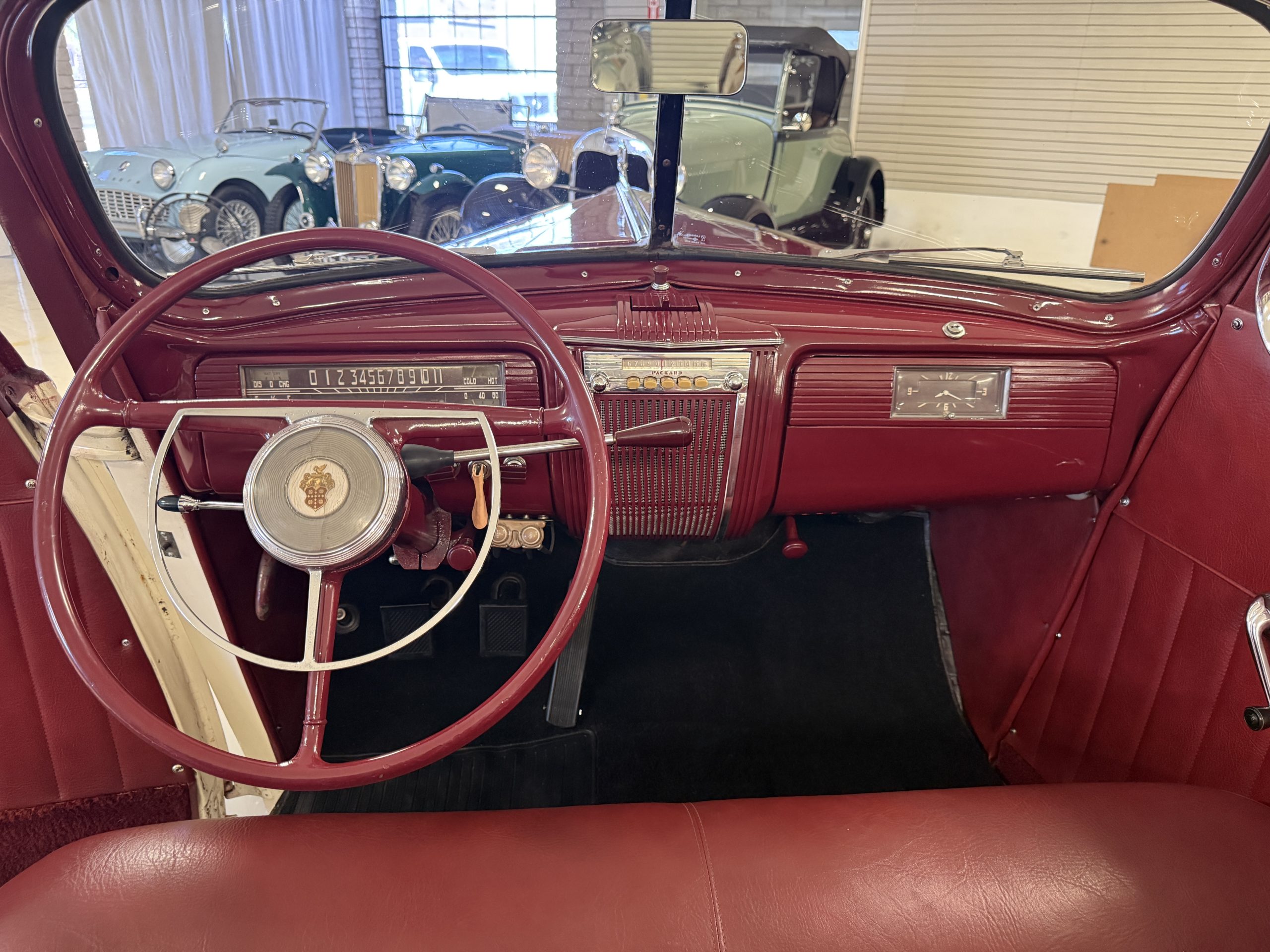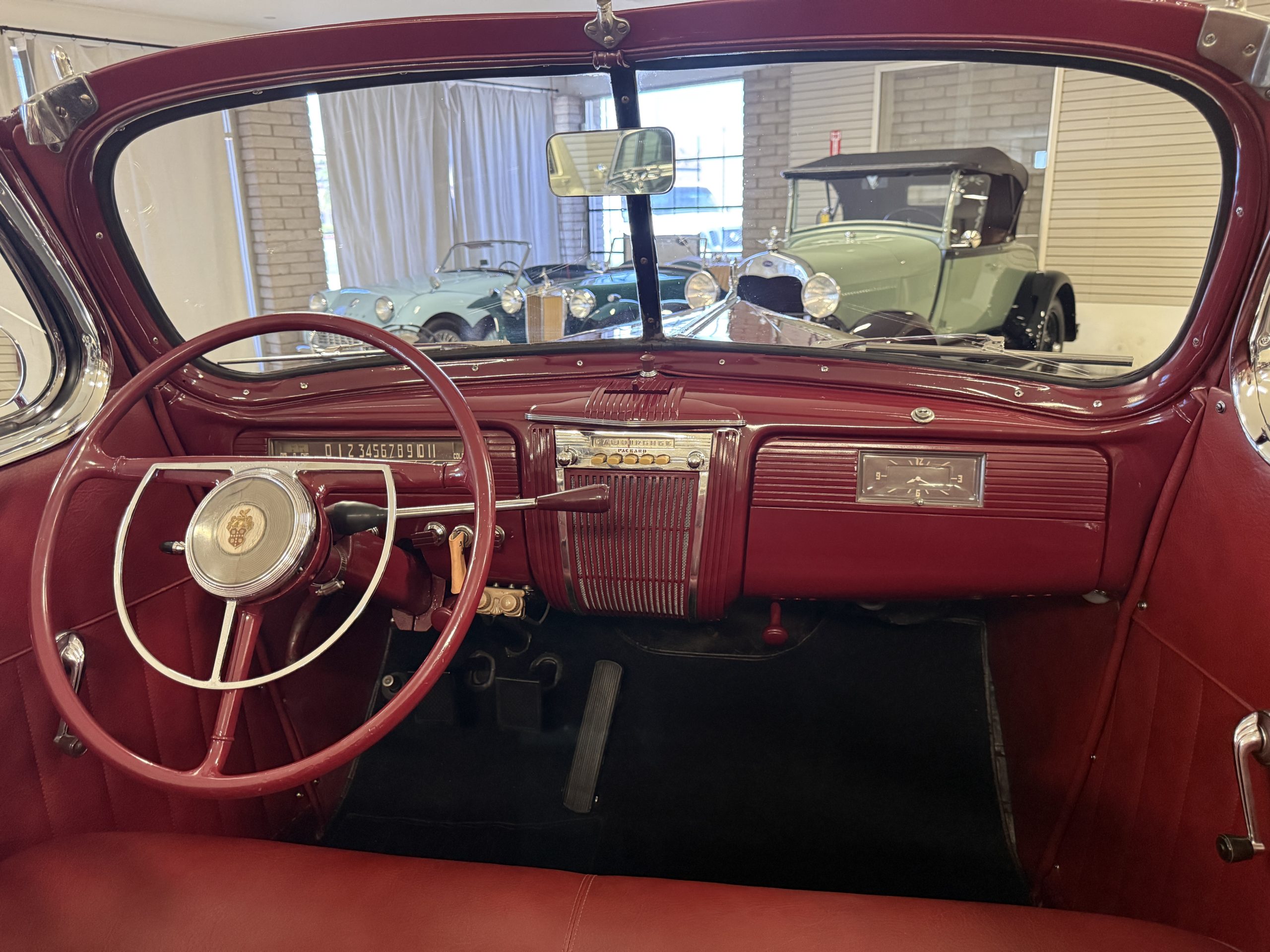 The interior of the Packard is in overall great condition trimmed in red vinyl upholstery with matching piping and black carpeting. The matching maroon painted dashboard is in great condition and the knobs throughout are in good condition with no cracking. The instruments and gauges are in good working order which include the heater, defrost, AM radio and clock. Overall, the interior is beautiful and in great working condition, ready for local shows and weekend drives!