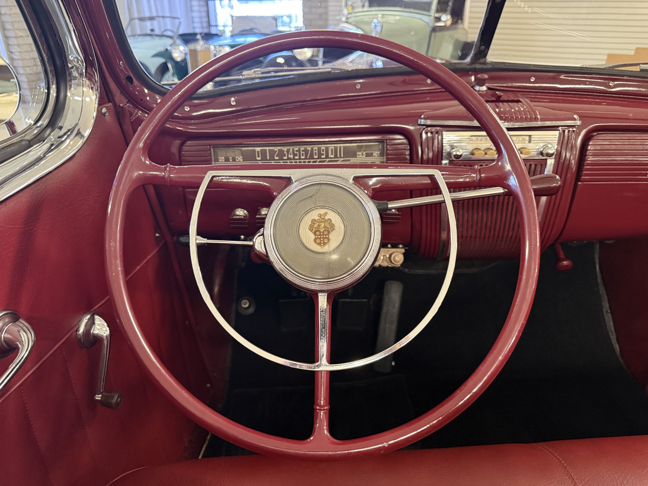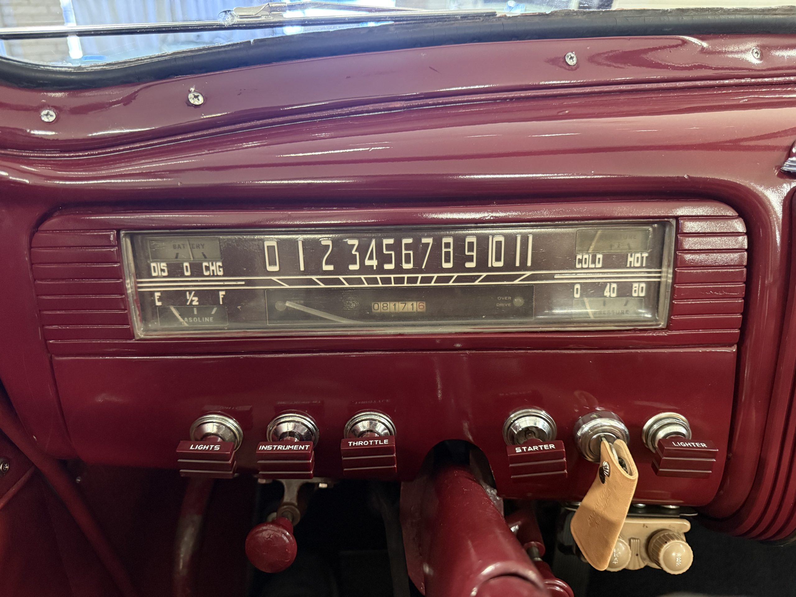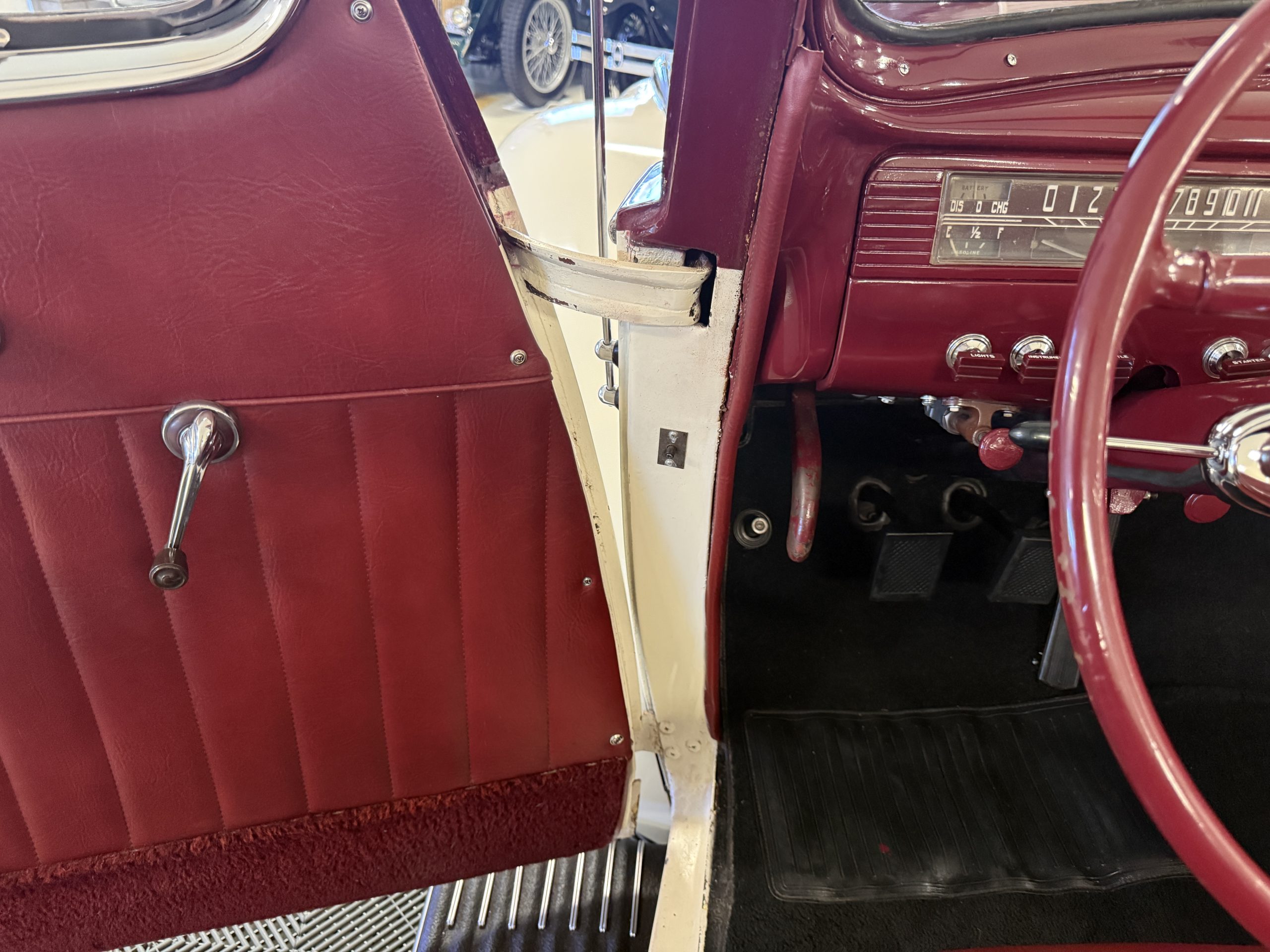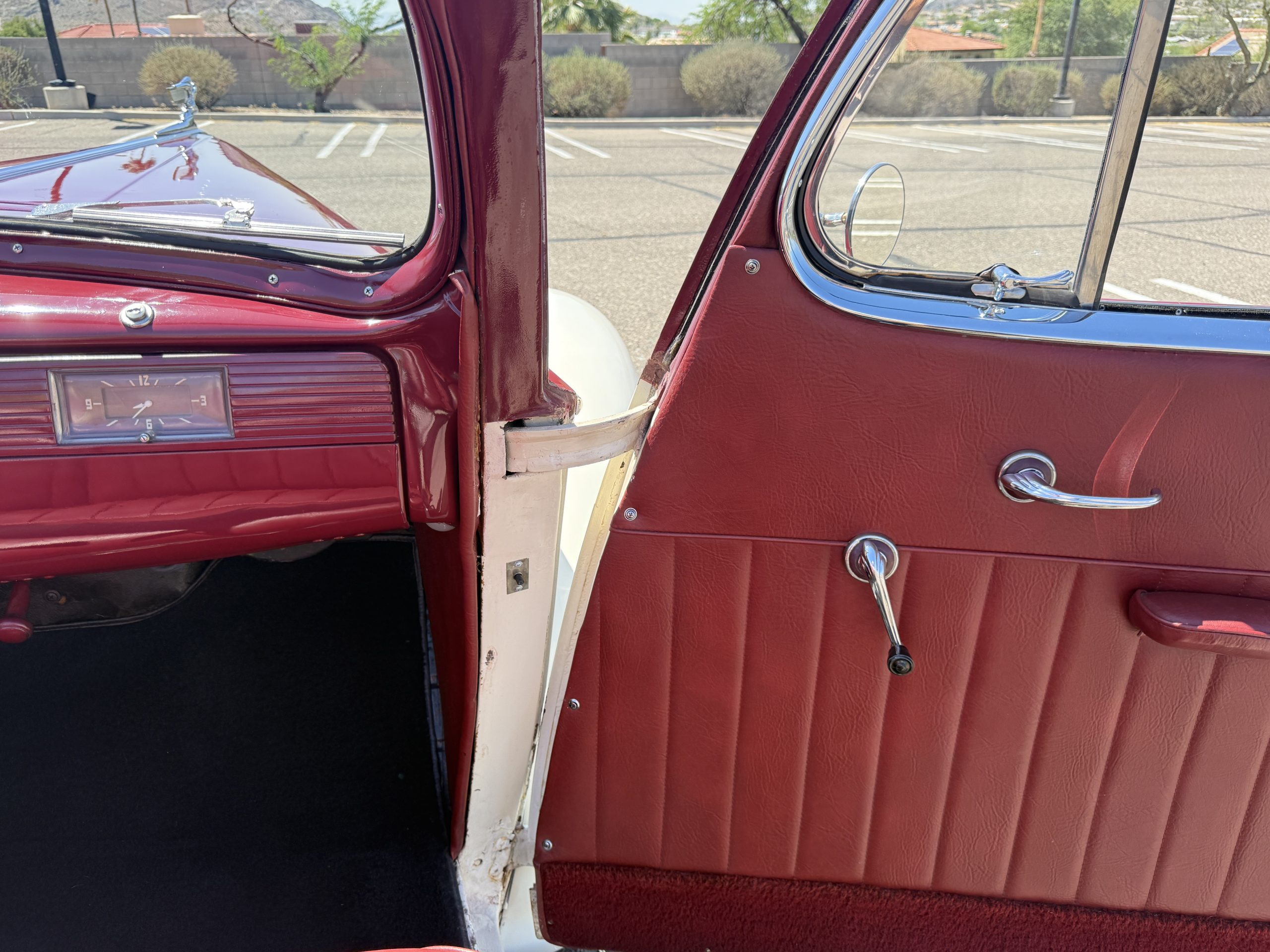 The interior of the Packard is in overall great condition trimmed in red vinyl upholstery with matching piping and black carpeting. The matching maroon painted dashboard is in great condition and the knobs throughout are in good condition with no cracking. The instruments and gauges are in good working order which include the heater, defrost, AM radio and clock. Overall, the interior is beautiful and in great working condition, ready for local shows and weekend drives!