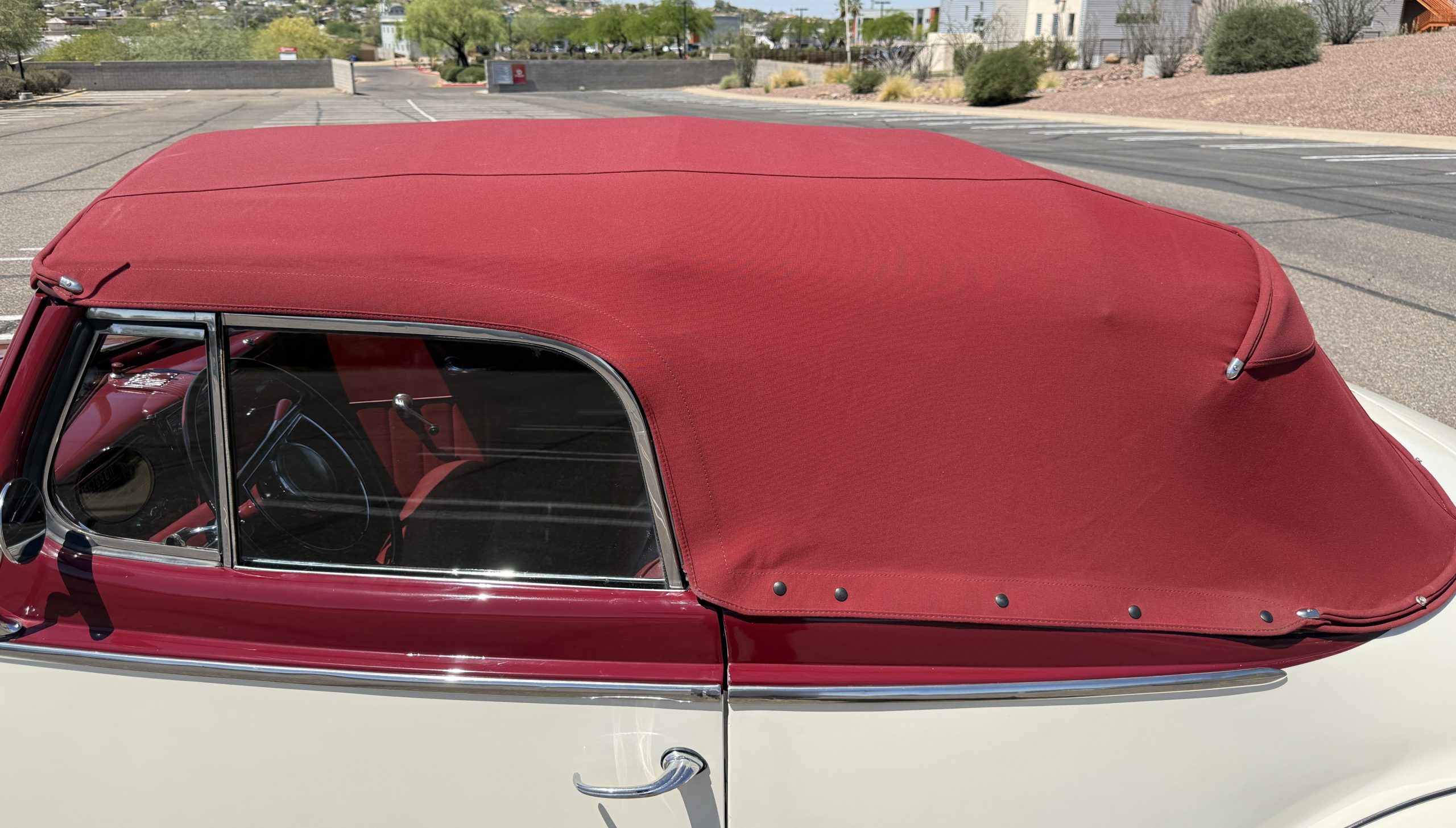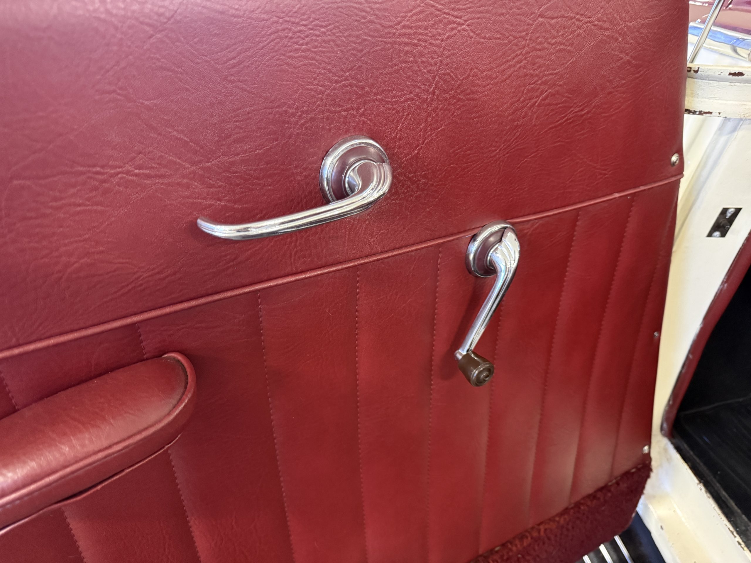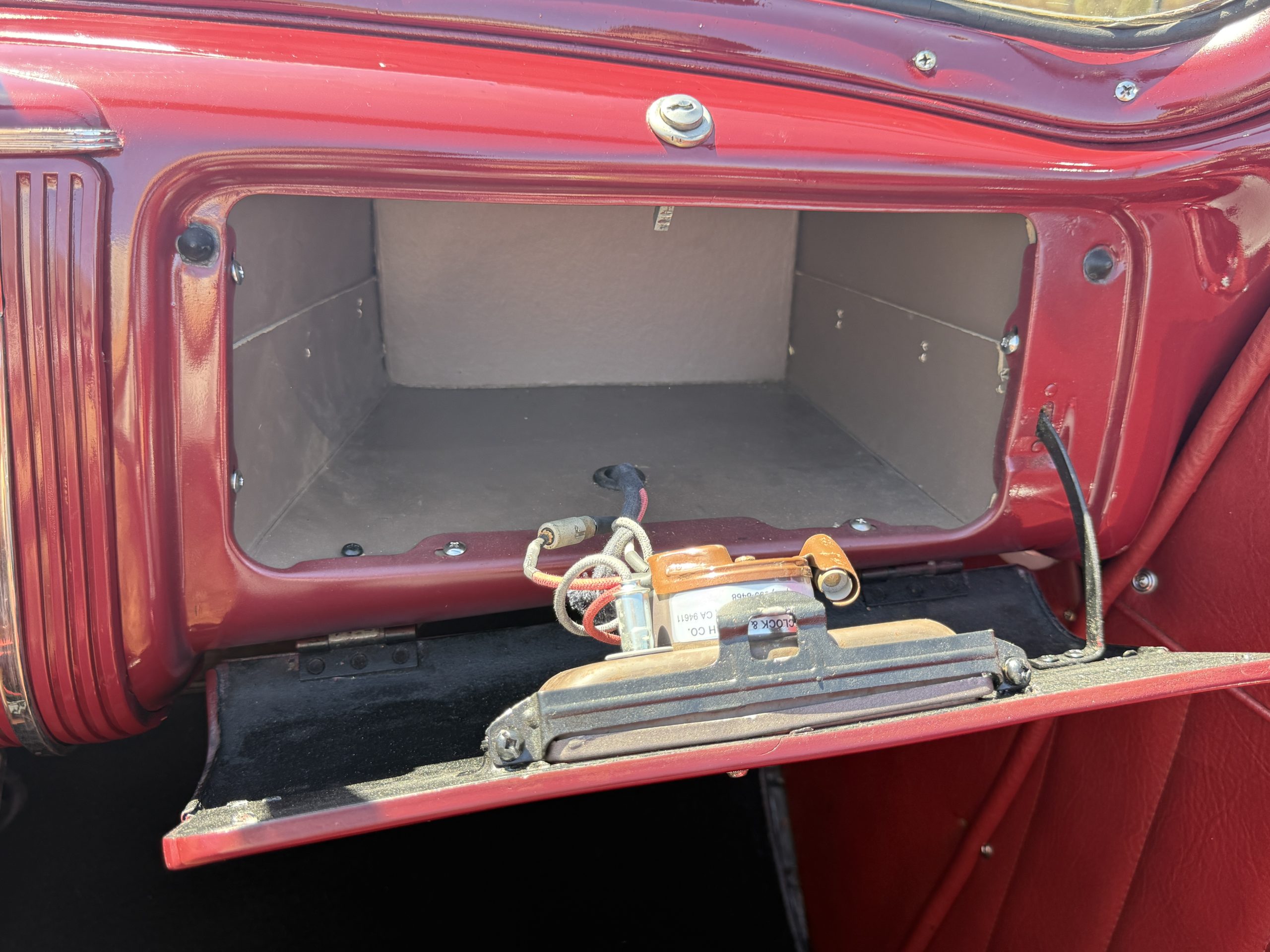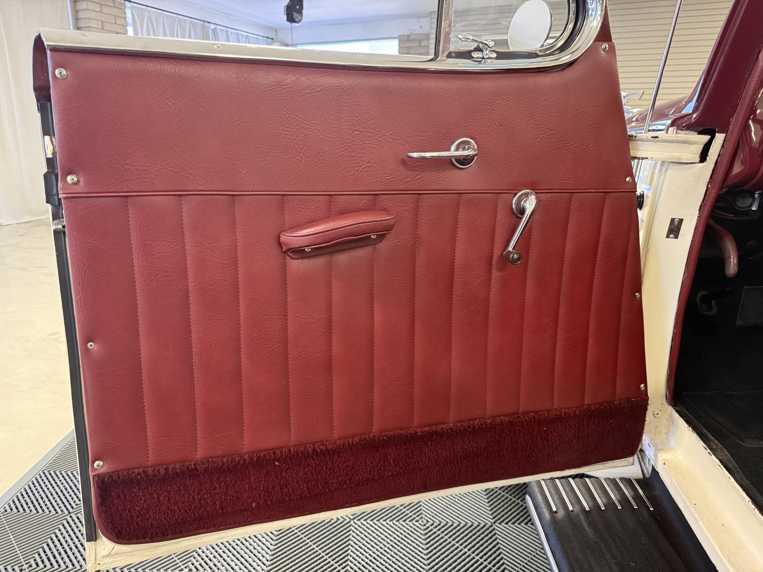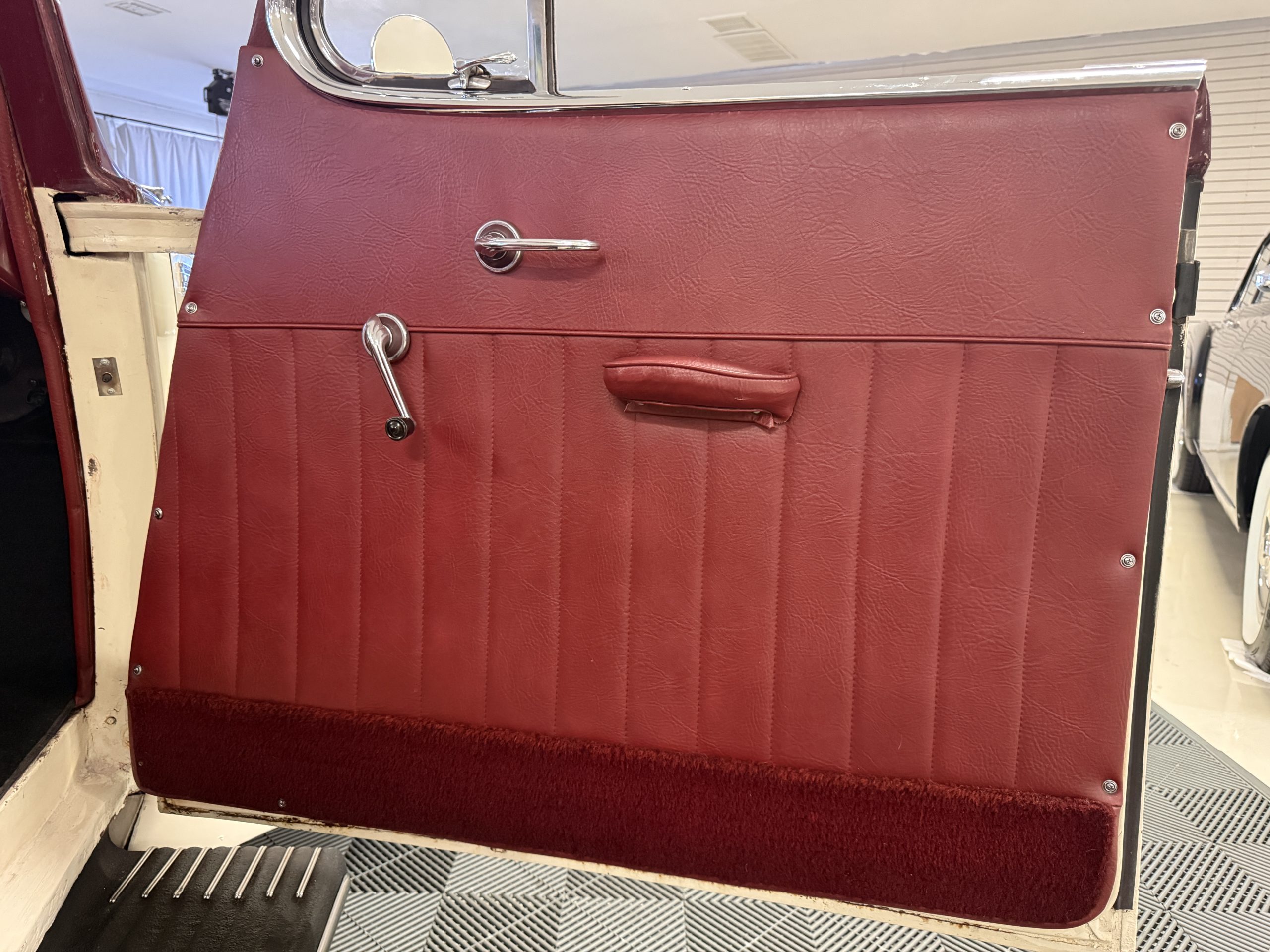 The interior of the Packard is in overall great condition trimmed in red vinyl upholstery with matching piping and black carpeting. The matching maroon painted dashboard is in great condition and the knobs throughout are in good condition with no cracking. The instruments and gauges are in good working order which include the heater, defrost, AM radio and clock. Overall, the interior is beautiful and in great working condition, ready for local shows and weekend drives!
