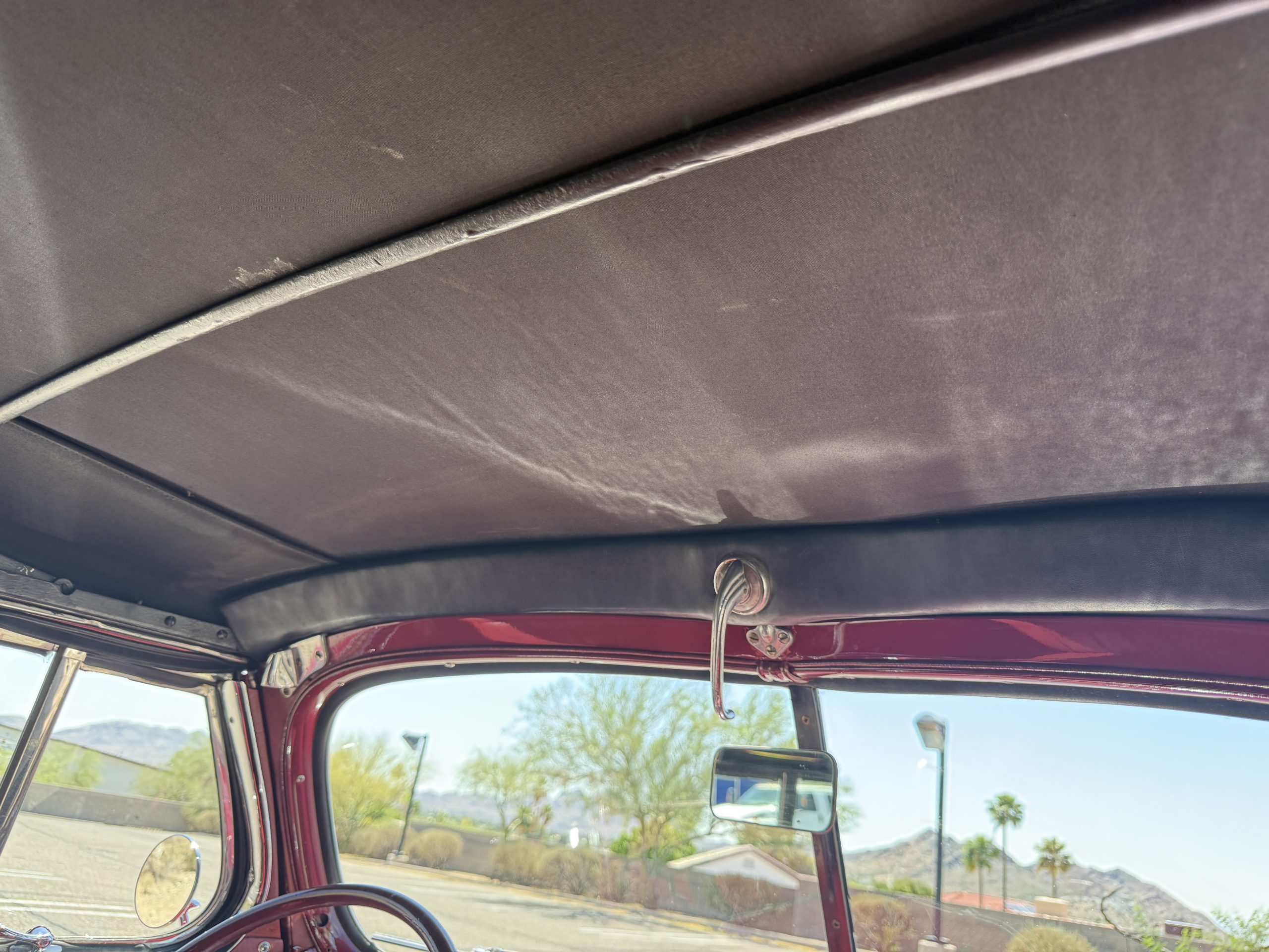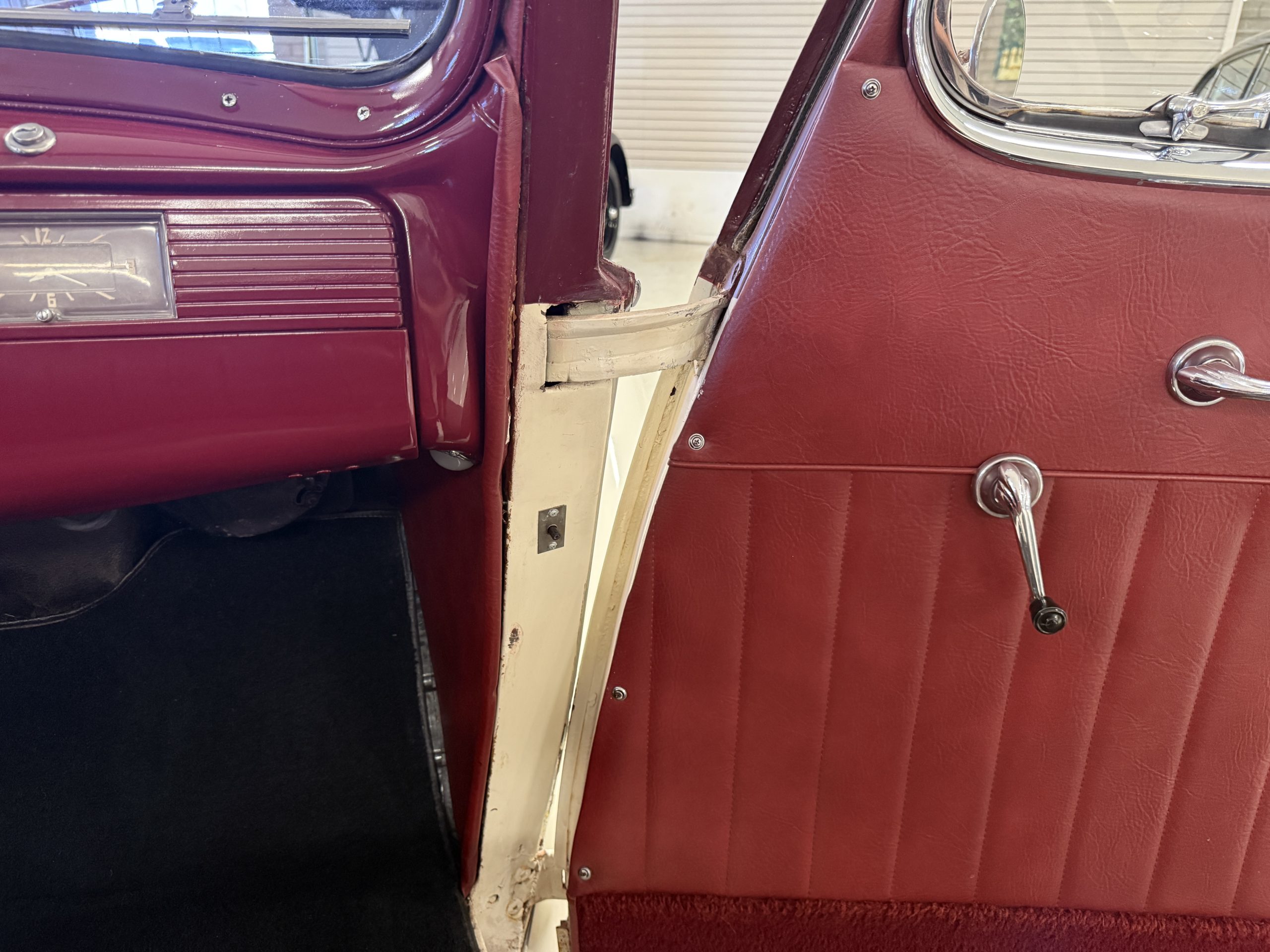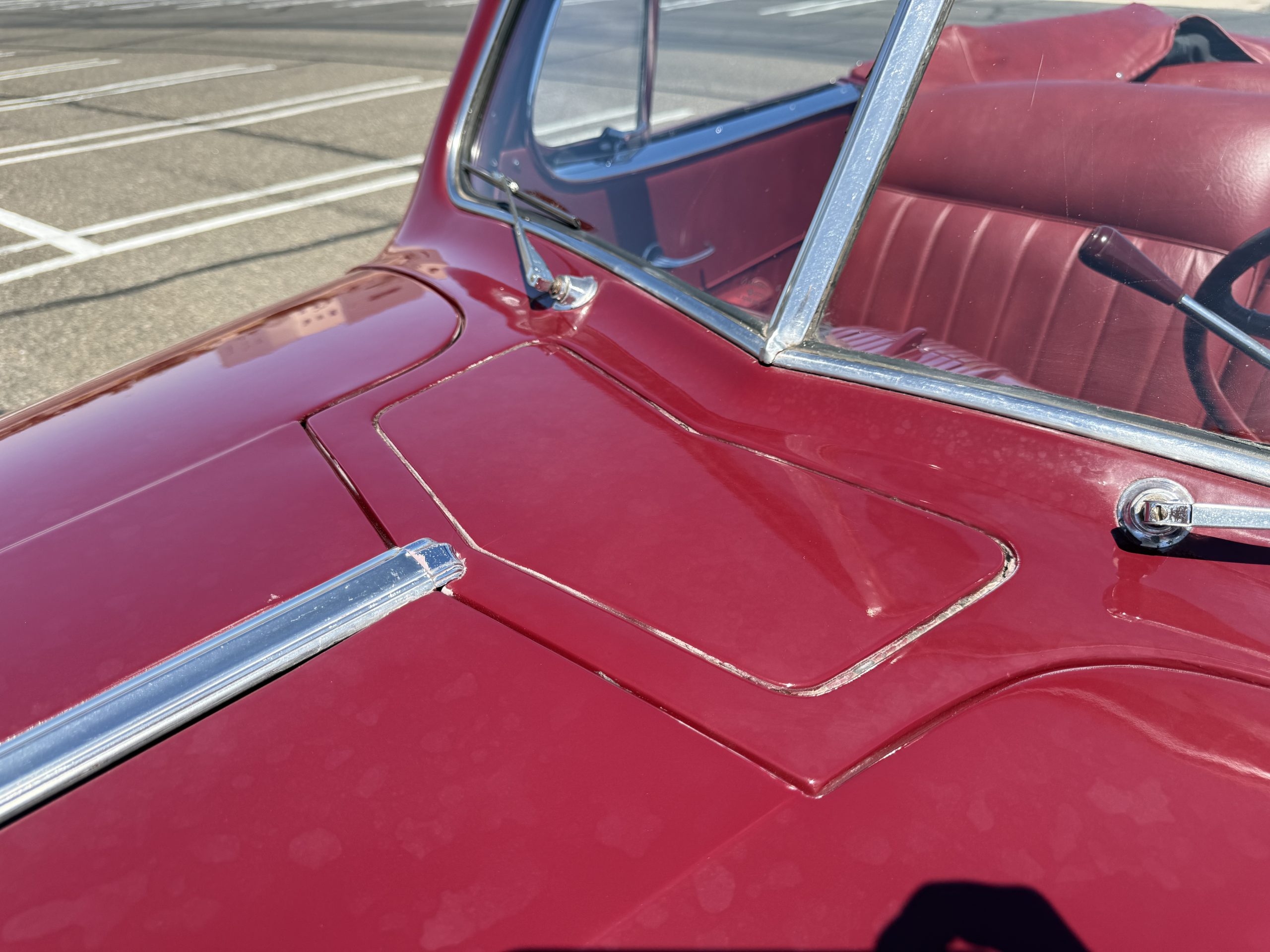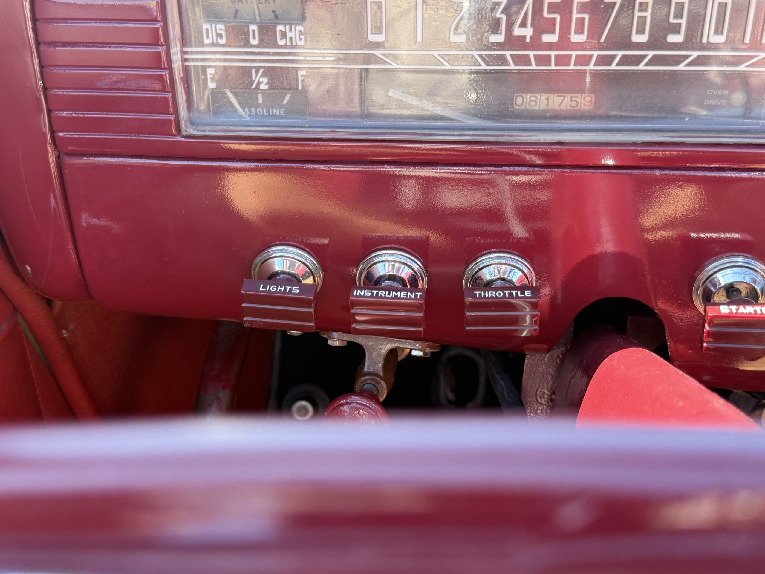 The interior of the Packard is in overall great condition trimmed in red vinyl upholstery with matching piping and black carpeting. The matching maroon painted dashboard is in great condition and the knobs throughout are in good condition with no cracking. The instruments and gauges are in good working order which include the heater, defrost, AM radio and clock. Overall, the interior is beautiful and in great working condition, ready for local shows and weekend drives!