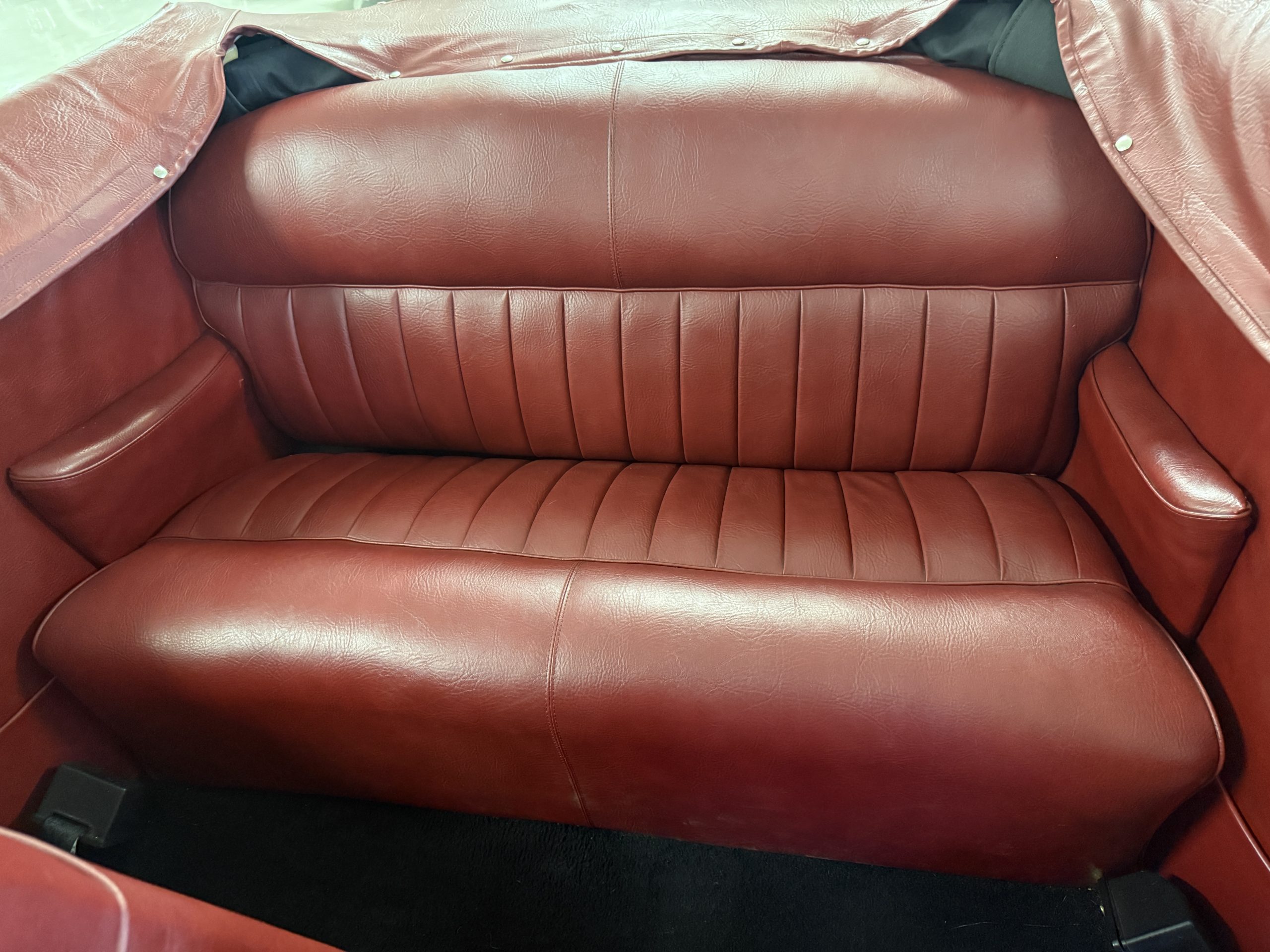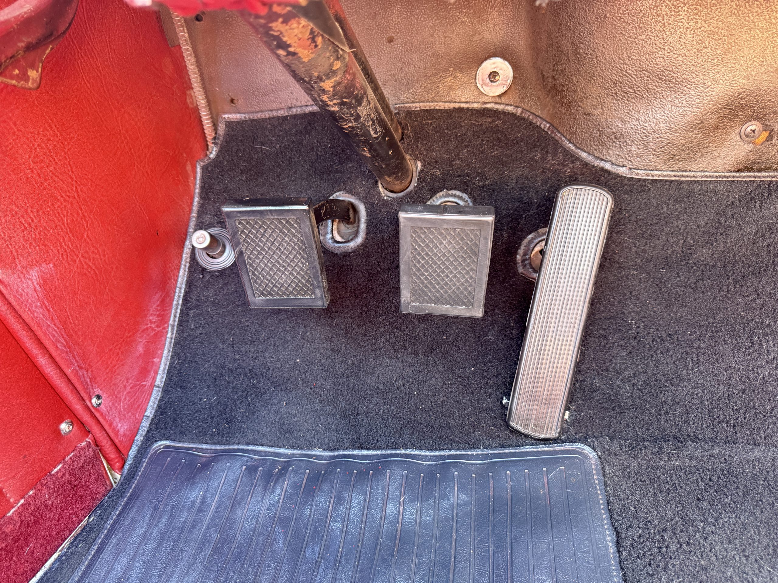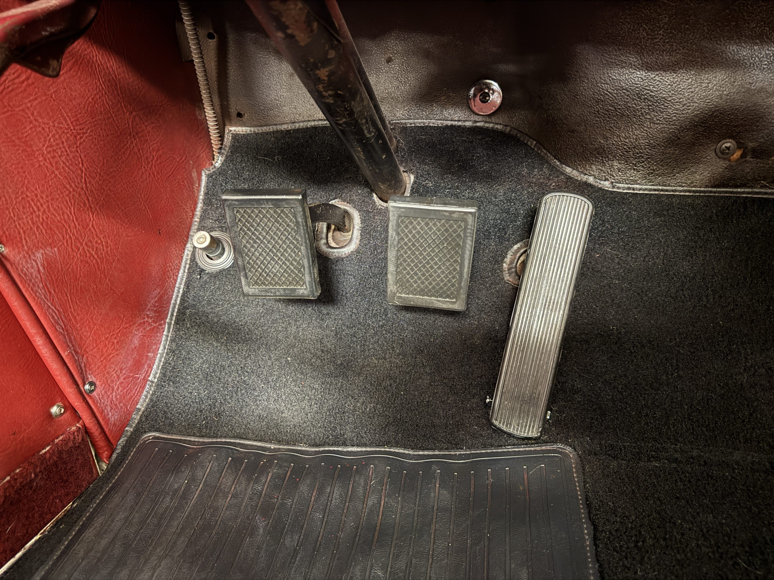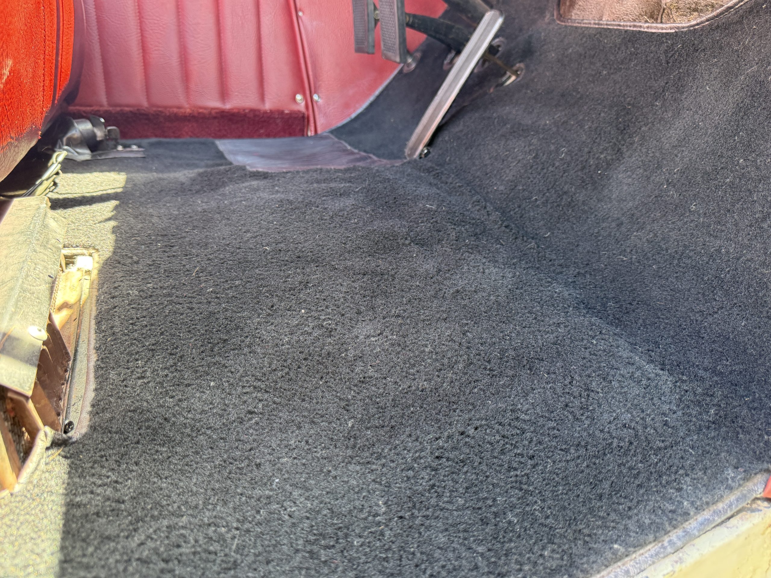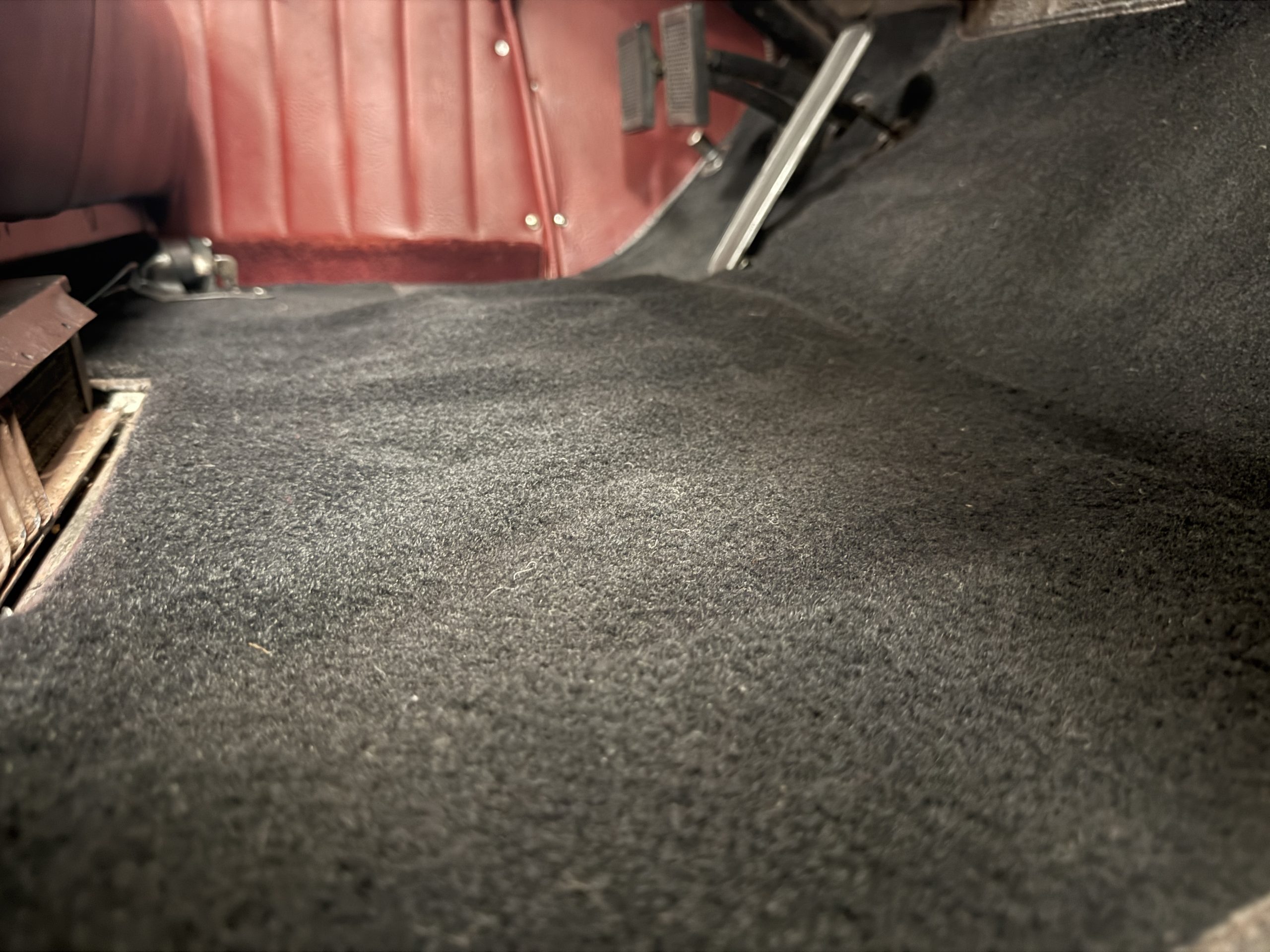The interior of the Packard is in overall great condition trimmed in red vinyl upholstery with matching piping and black carpeting. The matching maroon painted dashboard is in great condition and the knobs throughout are in good condition with no cracking. The instruments and gauges are in good working order which include the heater, defrost, AM radio and clock. Overall, the interior is beautiful and in great working condition, ready for local shows and weekend drives!