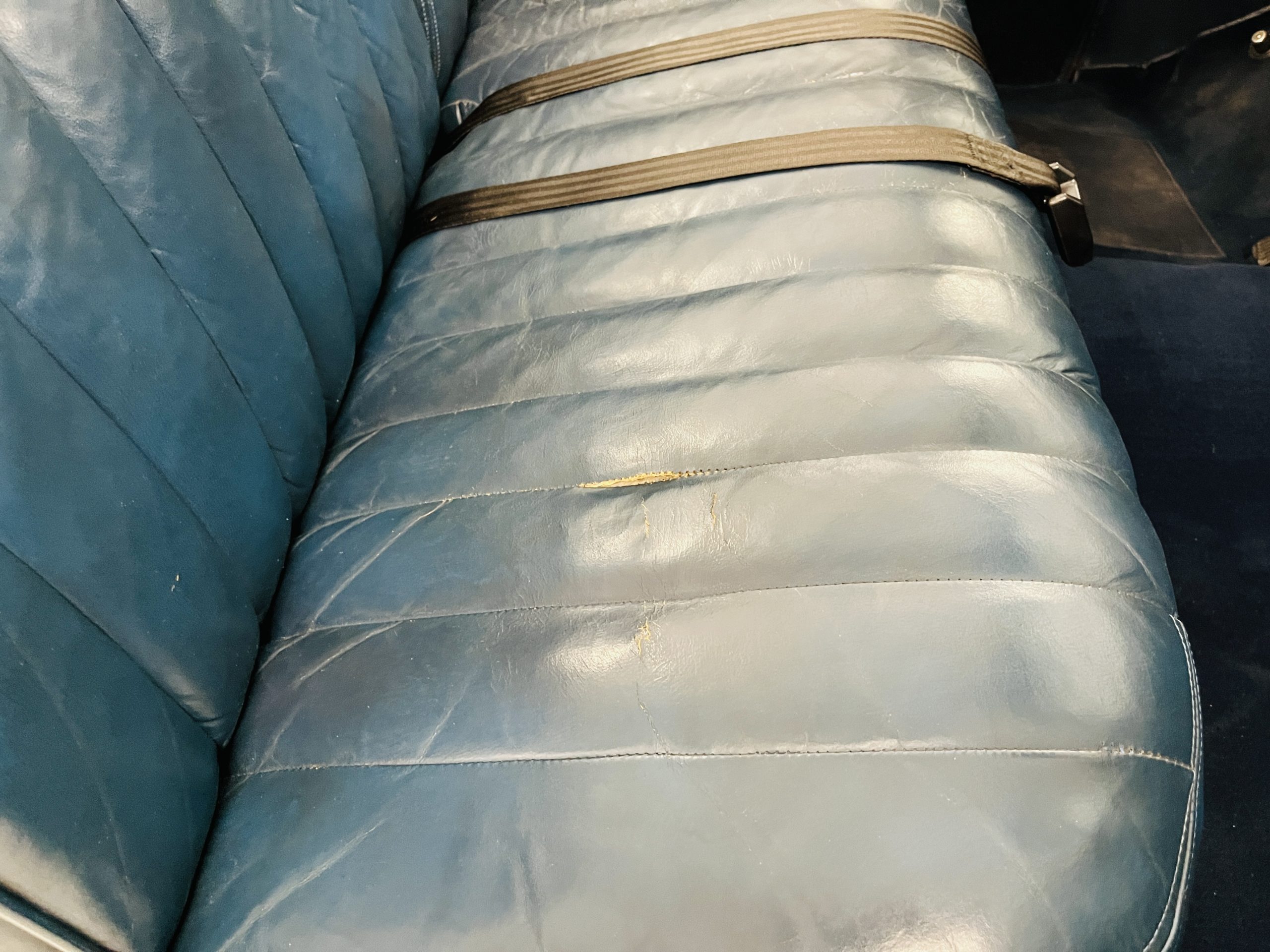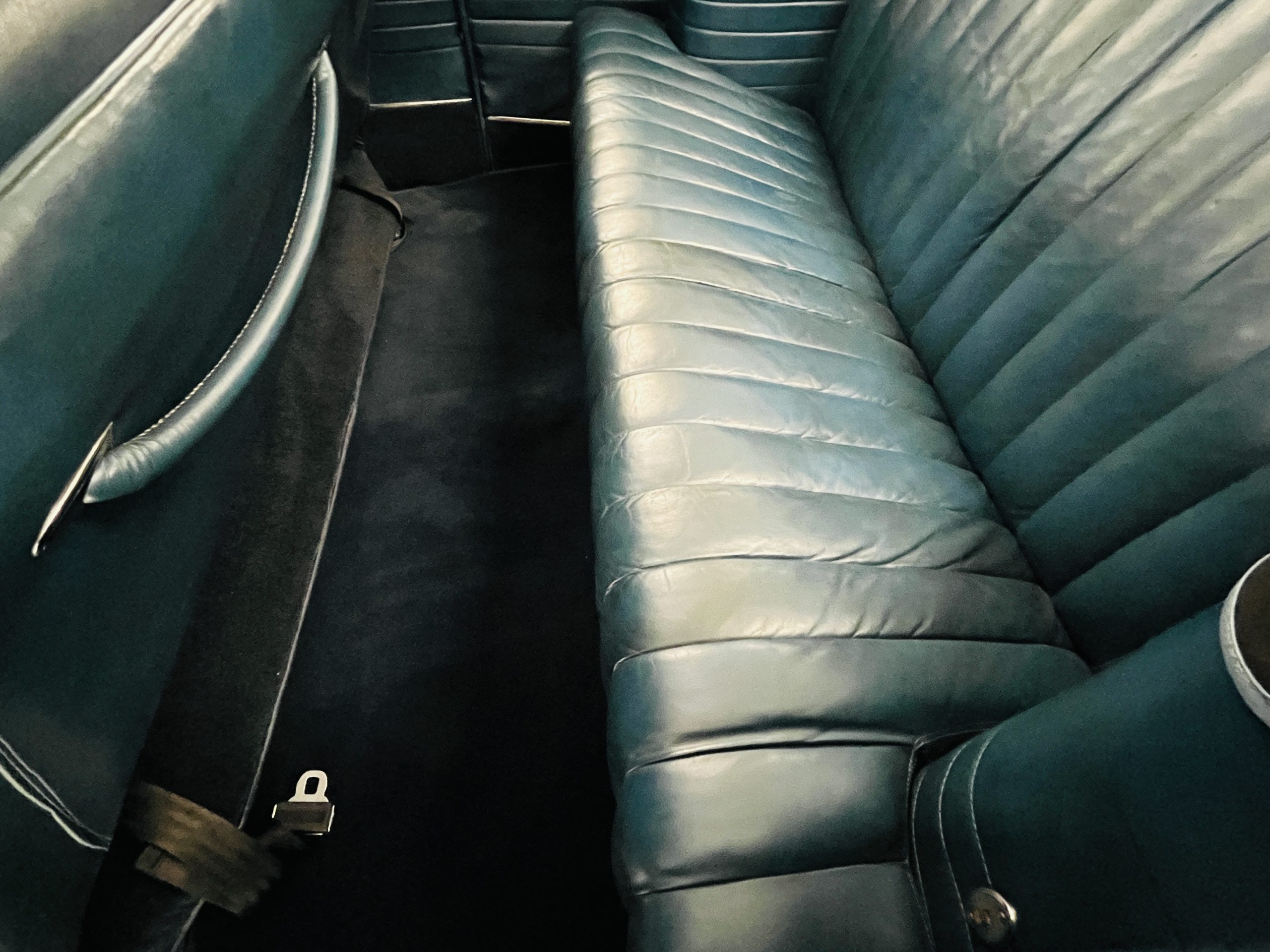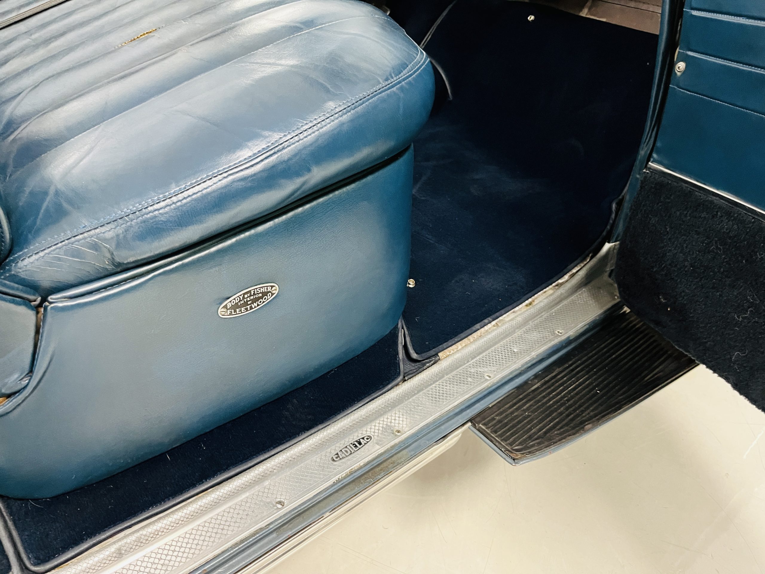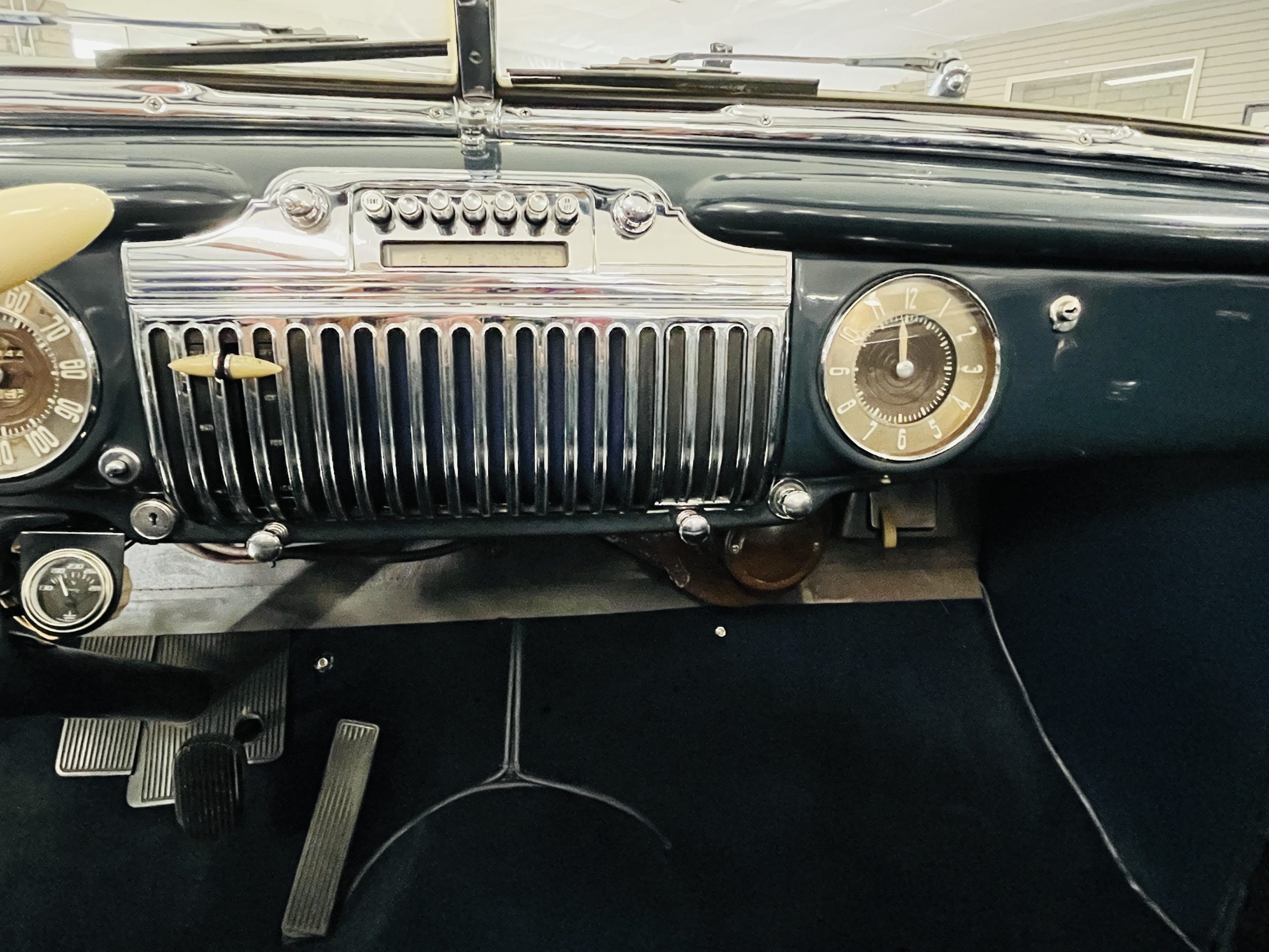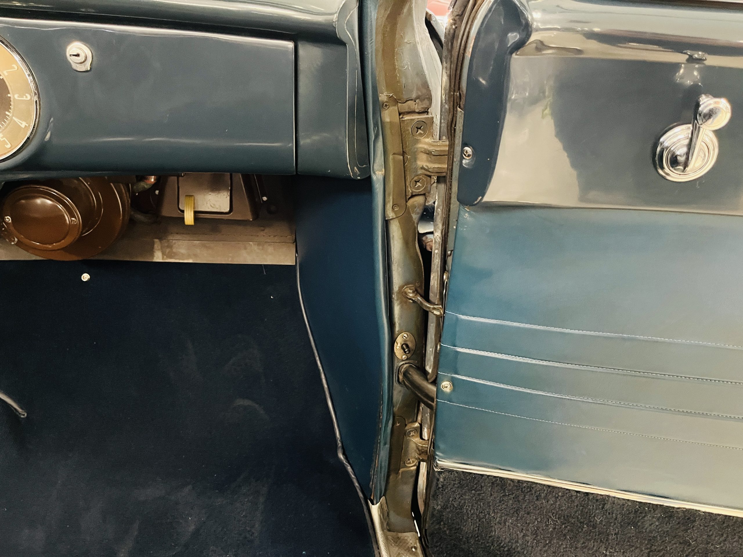 This Series 62 is dressed in its gorgeous original blue leather interior (Trim Code 55B) which is in overall excellent condition. The leather has the expected patina of 76 years but overall is soft and supple today. There are two areas where its seams are split. These can be repaired but are minor overall. The front powered seat makes for ease of adjusting and it’s very comfortable to ride in. This Series 62 comes well equipped with power antenna, power windows, and the power-operated front seat. The dash is beautiful with its chrome accents, push button radio, and clock. The blue carpet is in great shape and appears to have been recently replaced. The steering wheel, dash, and upholstery are all original and in beautiful condition. The gauges are all working.