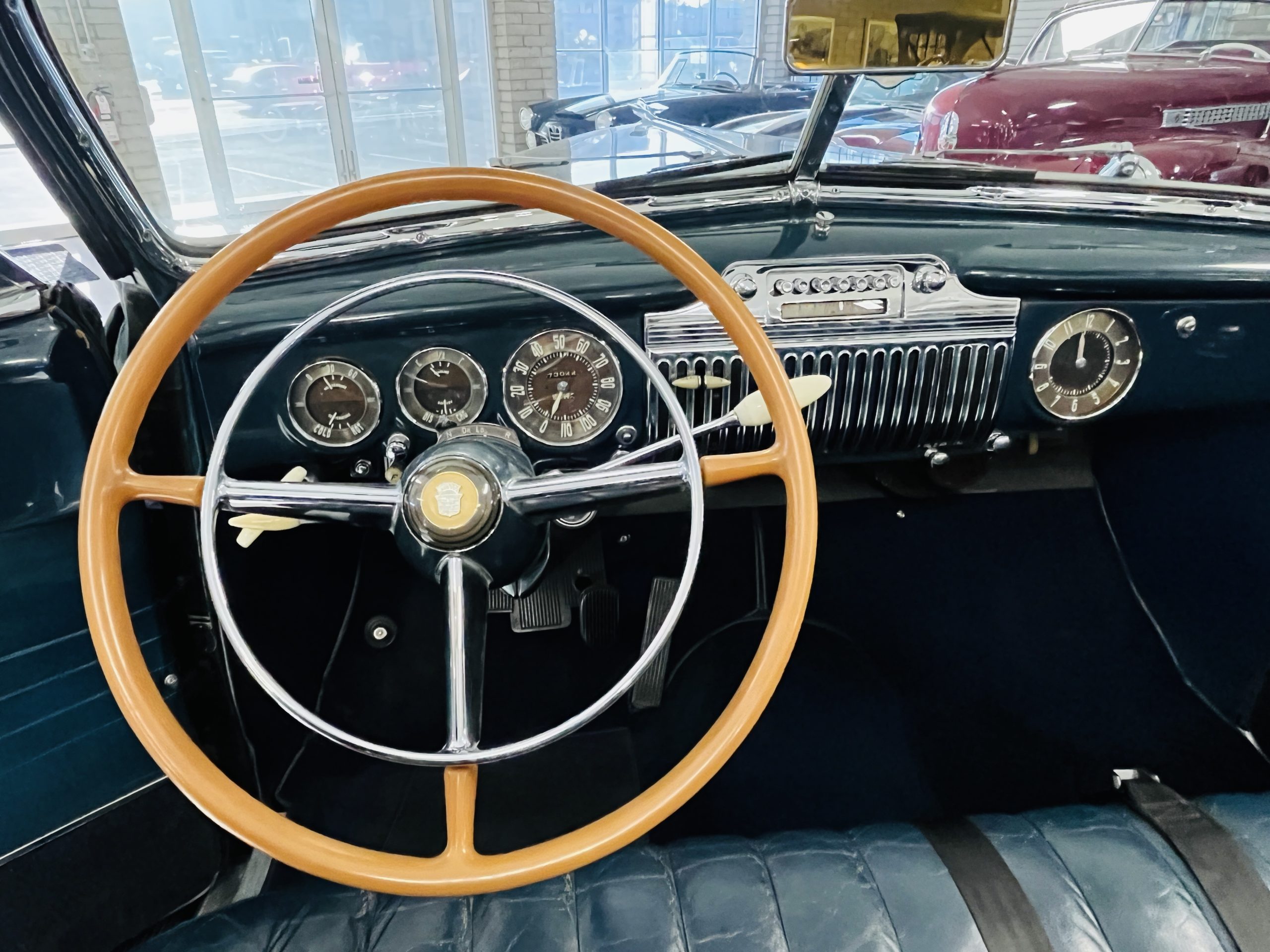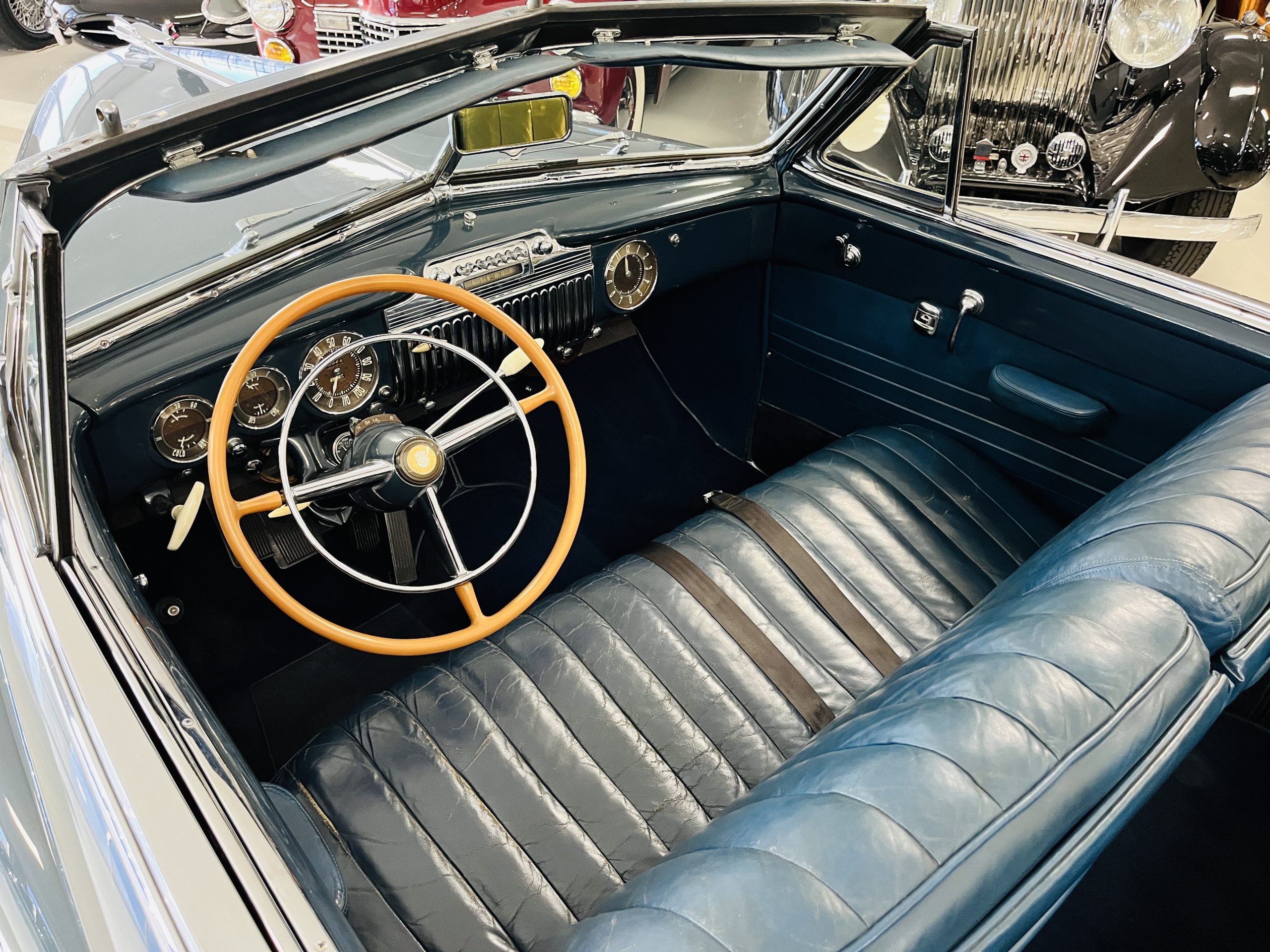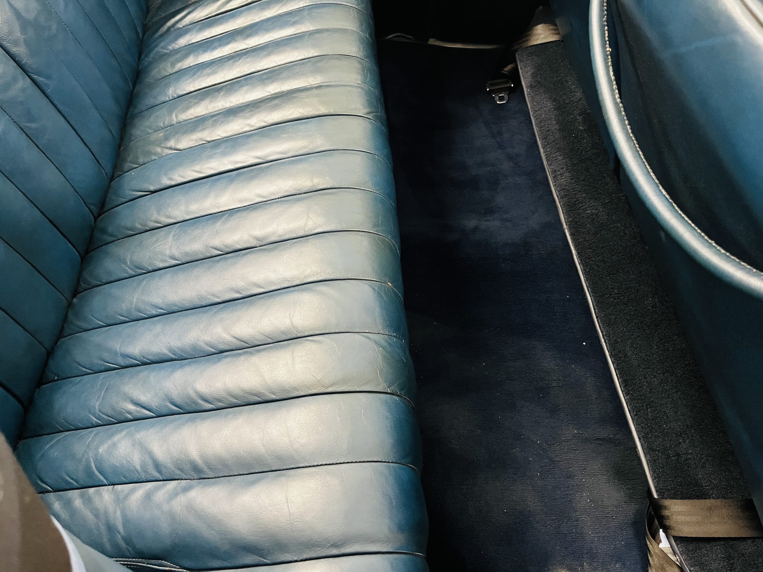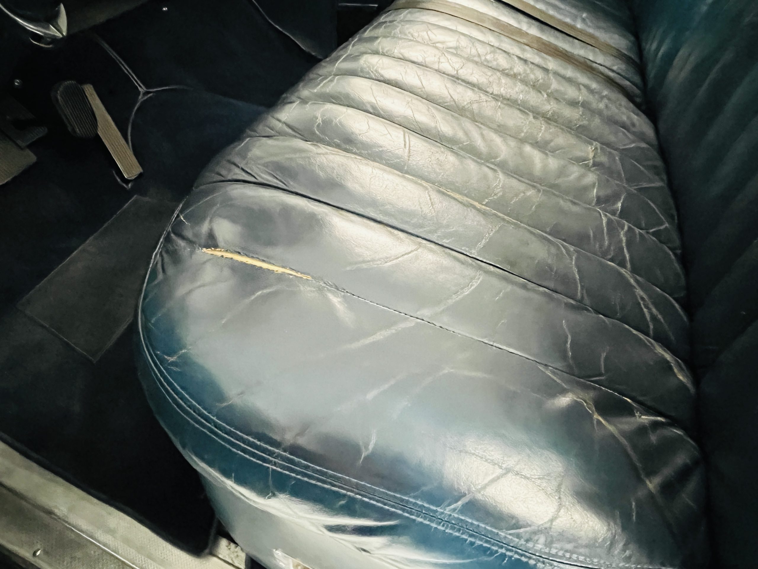 This Series 62 is dressed in its gorgeous original blue leather interior (Trim Code 55B) which is in overall excellent condition. The leather has the expected patina of 76 years but overall is soft and supple today. There are two areas where its seams are split. These can be repaired but are minor overall. The front powered seat makes for ease of adjusting and it’s very comfortable to ride in. This Series 62 comes well equipped with power antenna, power windows, and the power-operated front seat. The dash is beautiful with its chrome accents, push button radio, and clock. The blue carpet is in great shape and appears to have been recently replaced. The steering wheel, dash, and upholstery are all original and in beautiful condition. The gauges are all working.