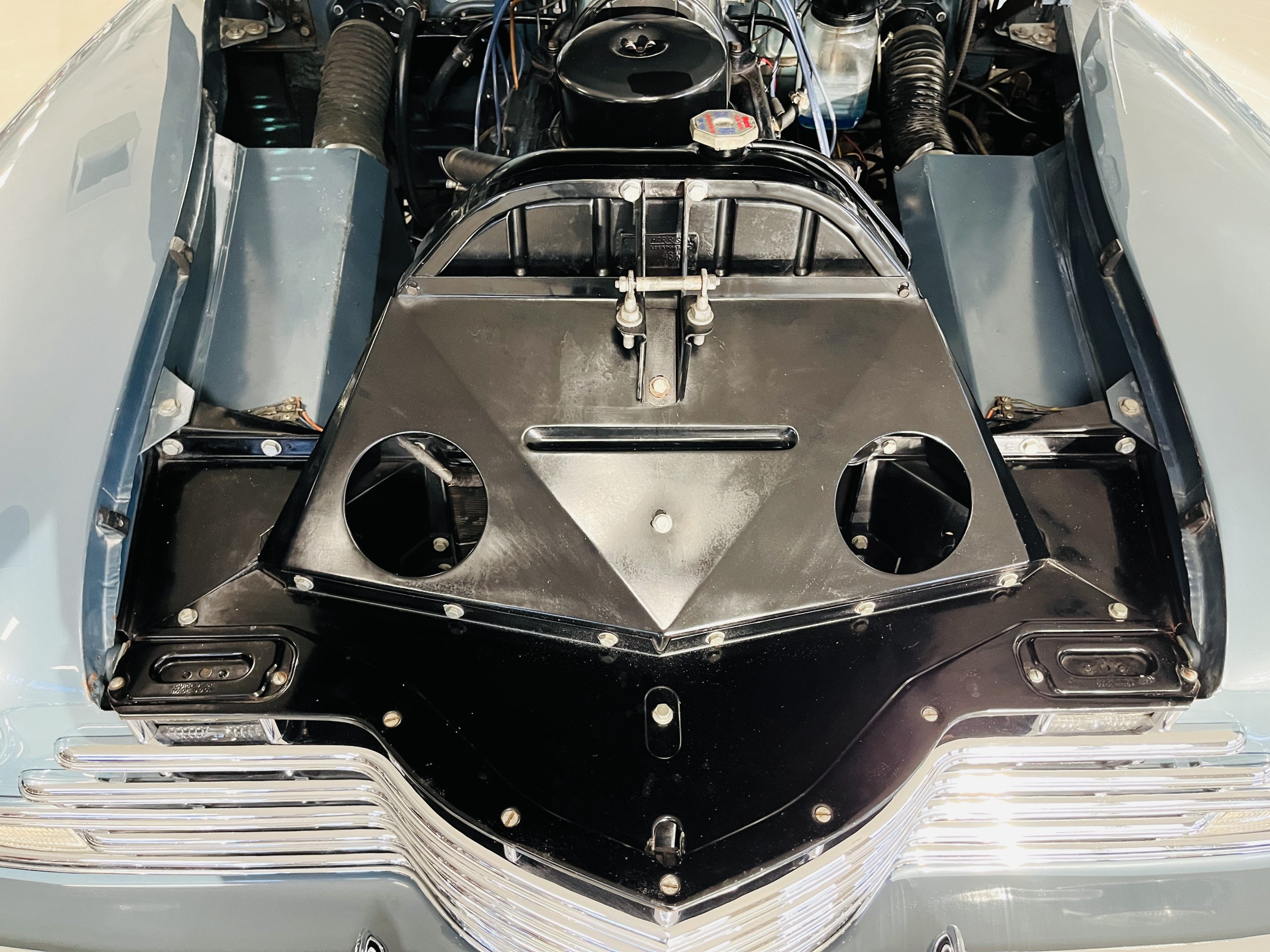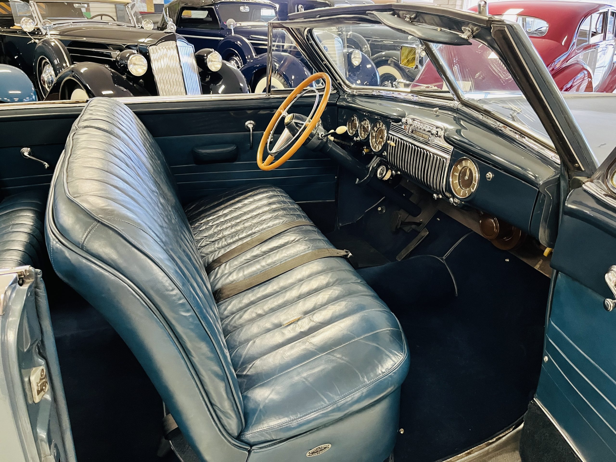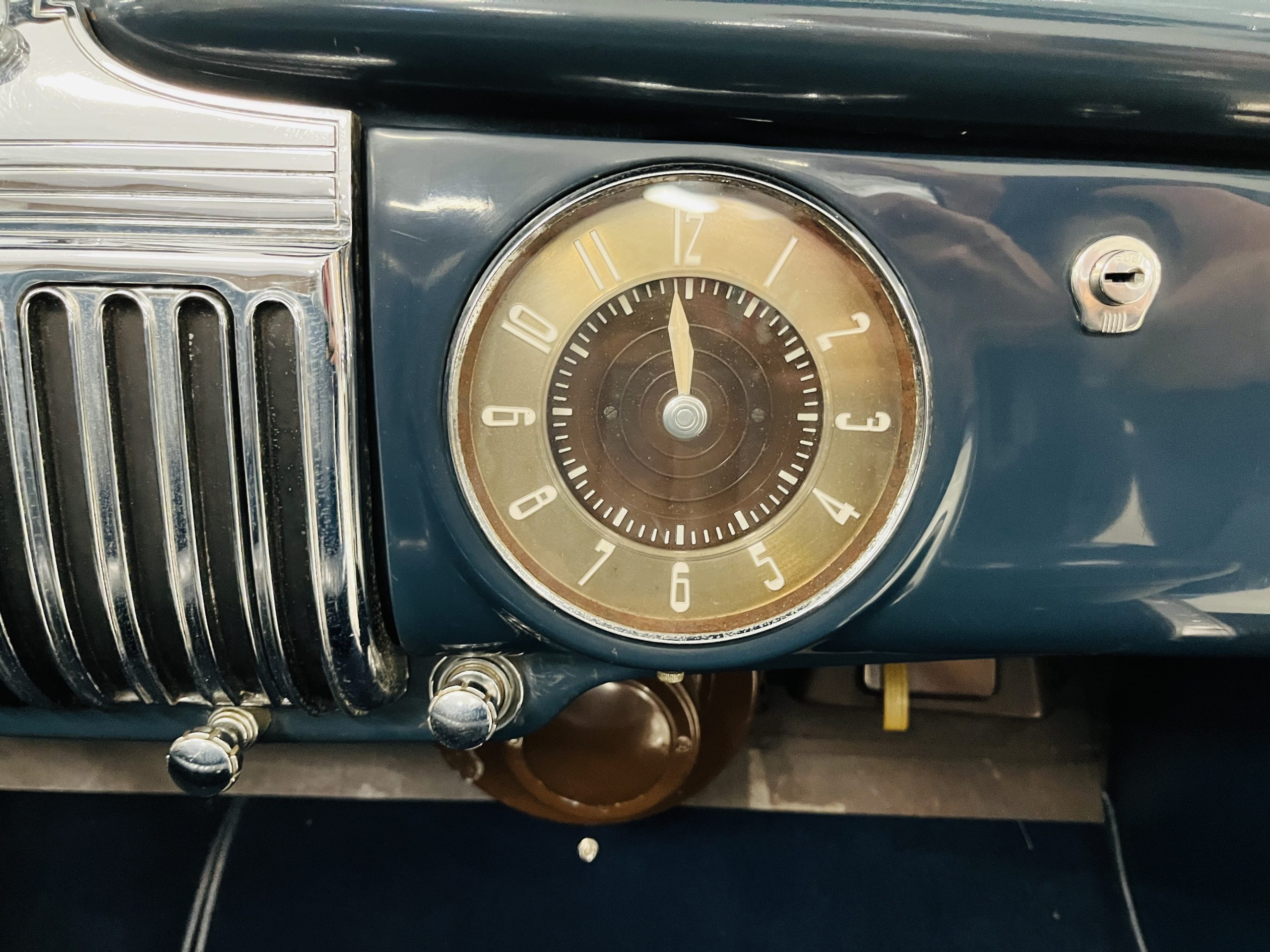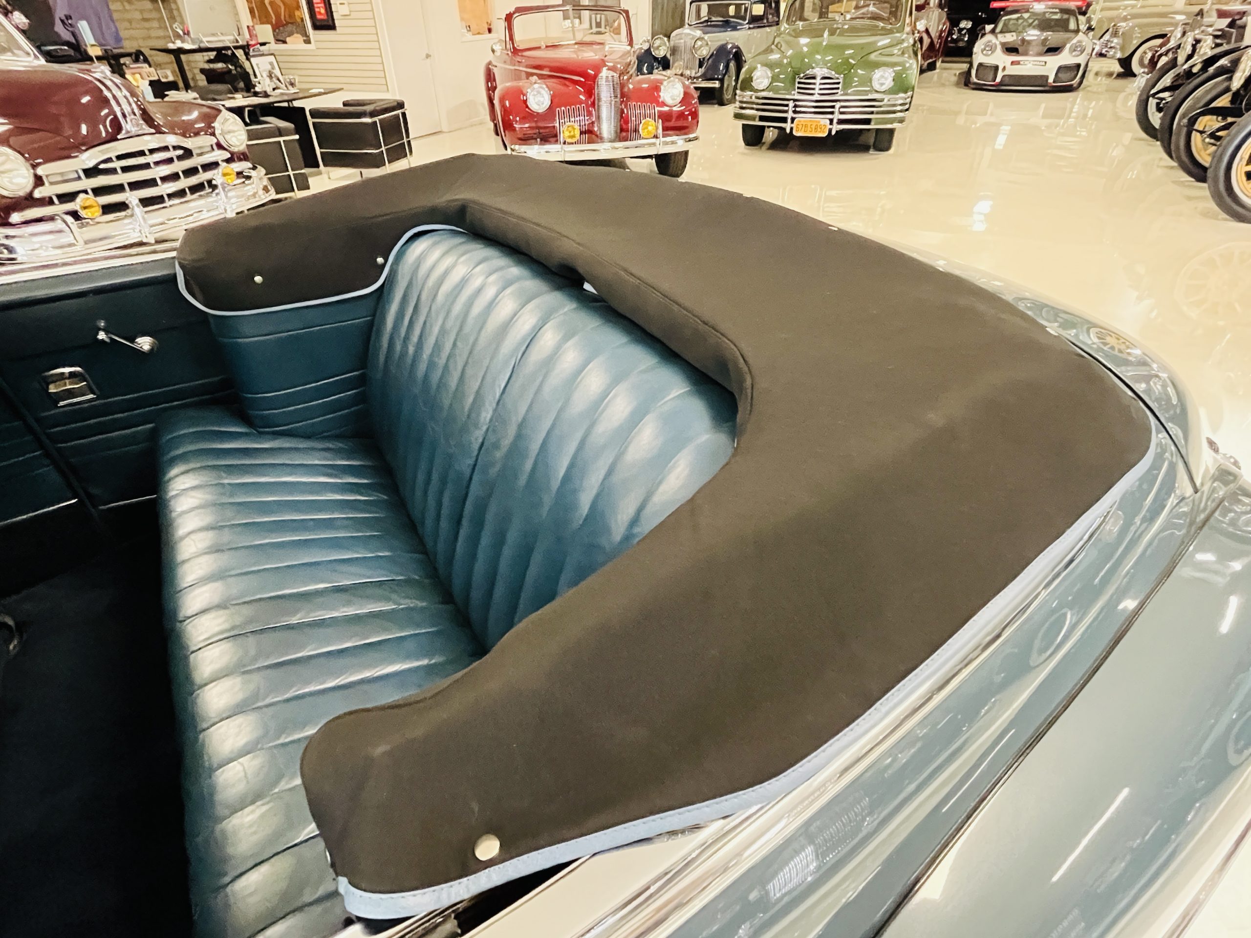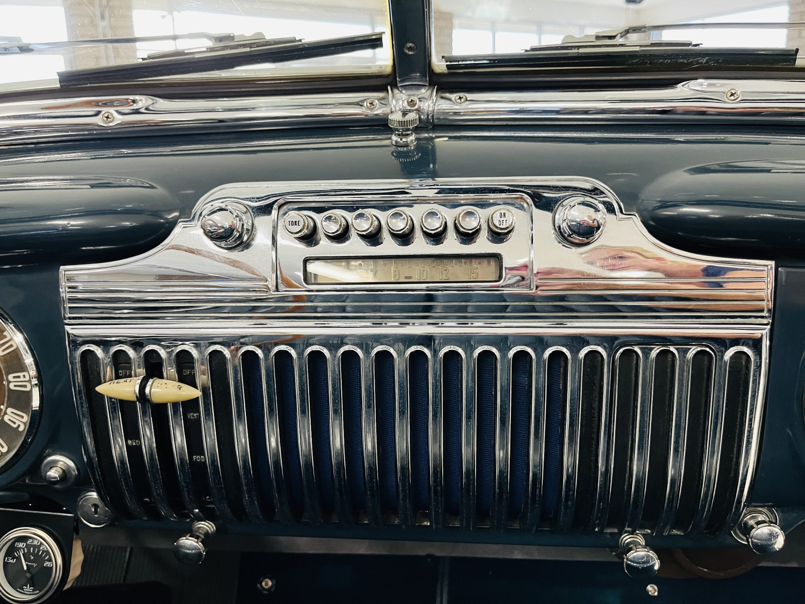 This Series 62 is dressed in its gorgeous original blue leather interior (Trim Code 55B) which is in overall excellent condition. The leather has the expected patina of 76 years but overall is soft and supple today. There are two areas where its seams are split. These can be repaired but are minor overall. The front powered seat makes for ease of adjusting and it’s very comfortable to ride in. This Series 62 comes well equipped with power antenna, power windows, and the power-operated front seat. The dash is beautiful with its chrome accents, push button radio, and clock. The blue carpet is in great shape and appears to have been recently replaced. The steering wheel, dash, and upholstery are all original and in beautiful condition. The gauges are all working.