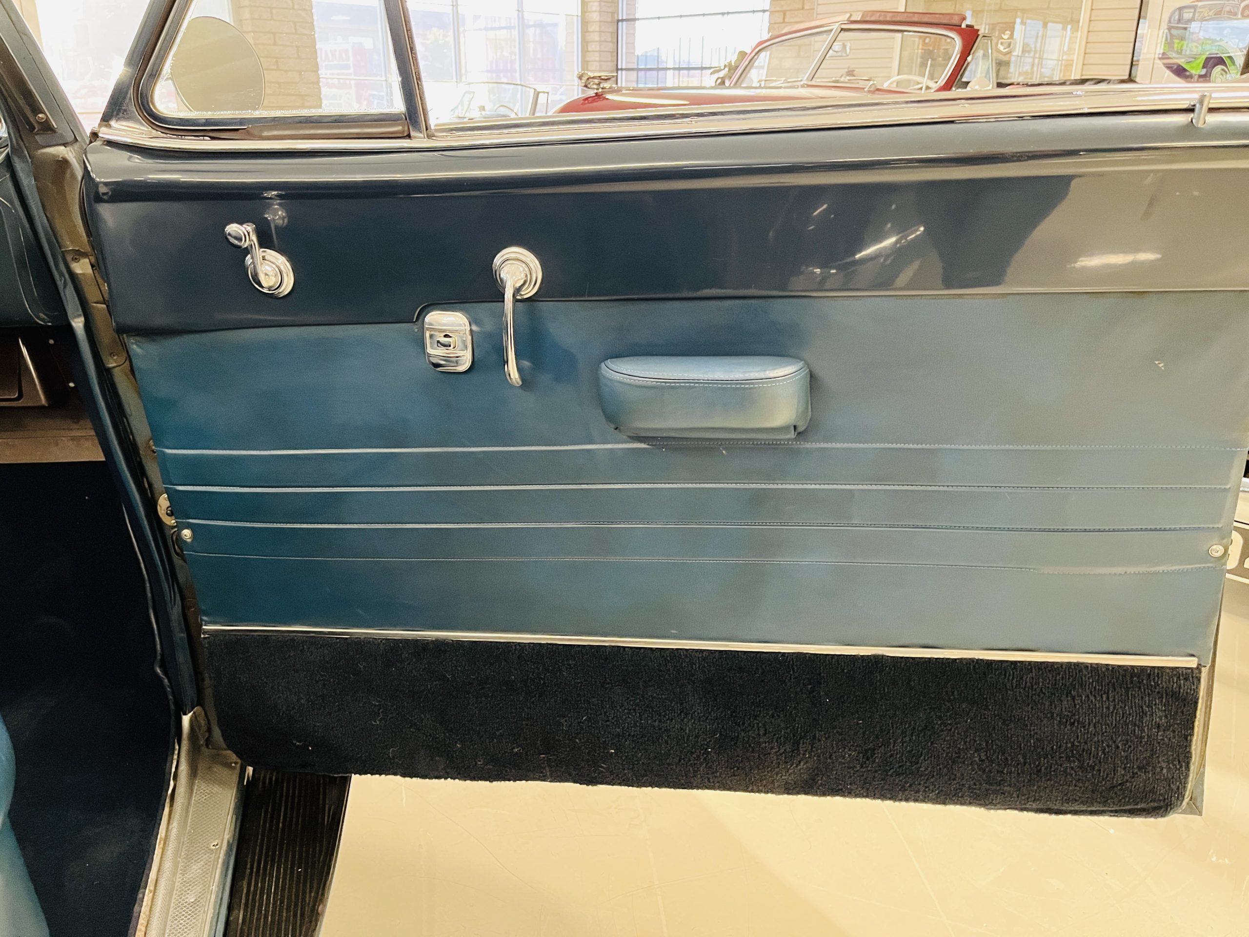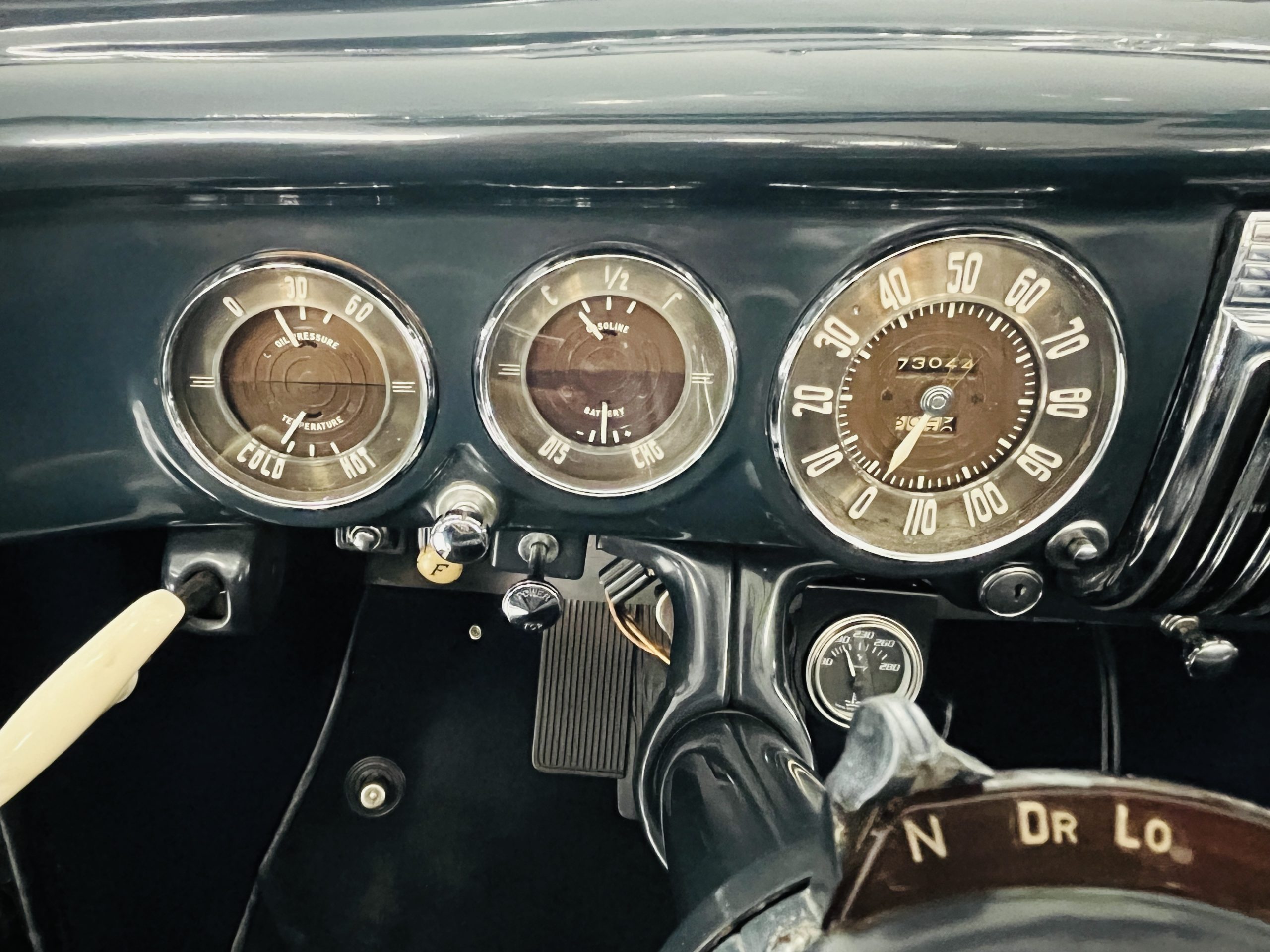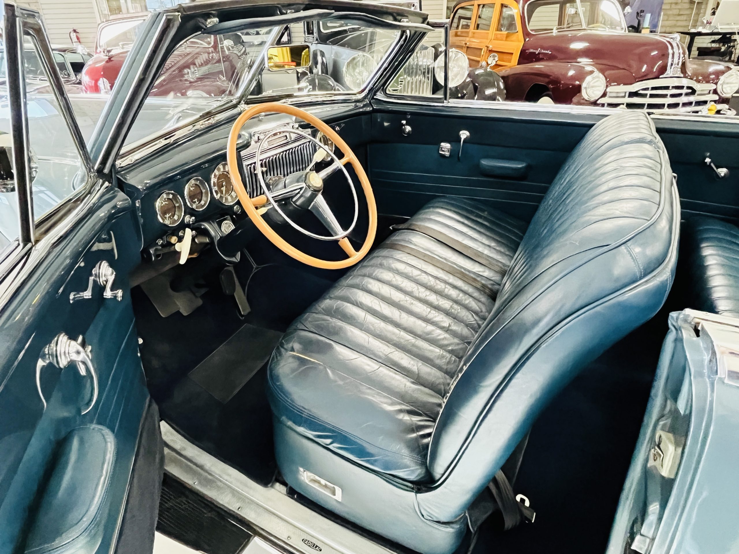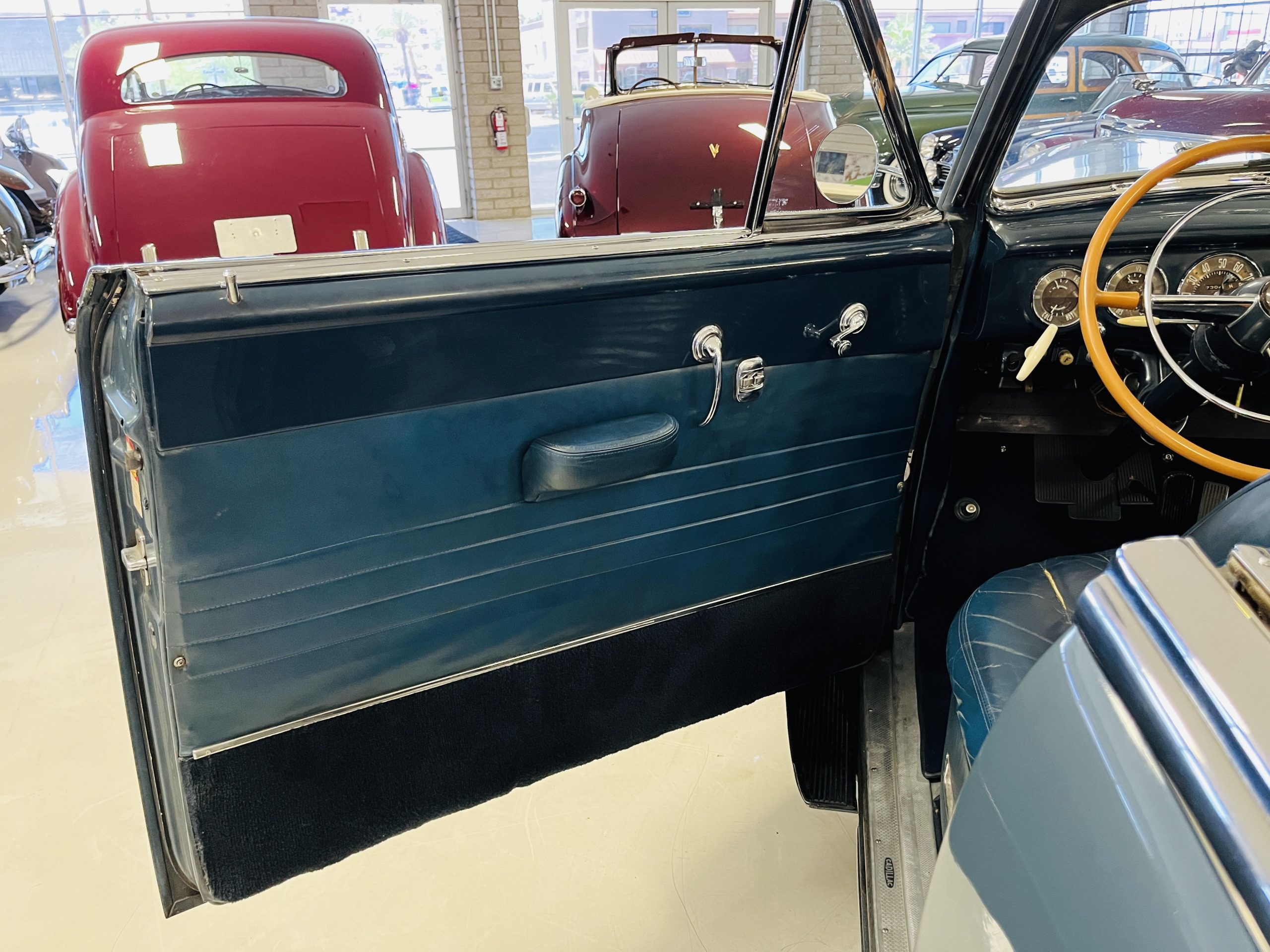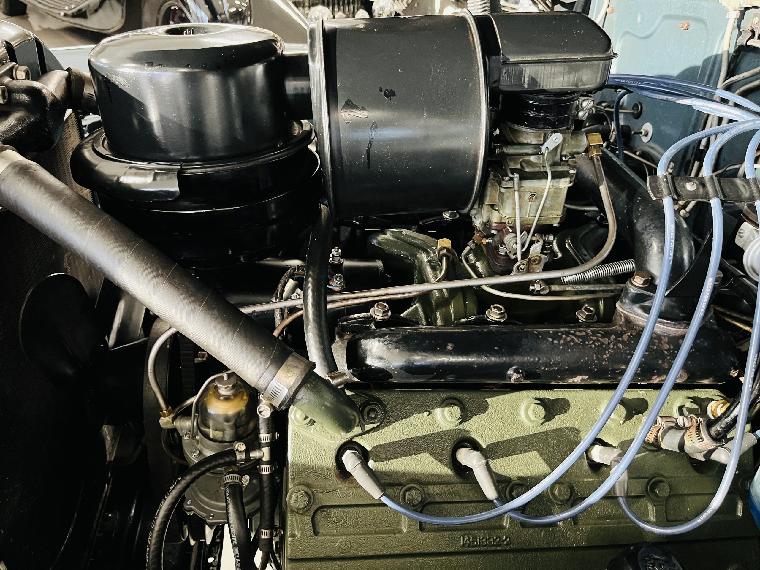 This Series 62 is dressed in its gorgeous original blue leather interior (Trim Code 55B) which is in overall excellent condition. The leather has the expected patina of 76 years but overall is soft and supple today. There are two areas where its seams are split. These can be repaired but are minor overall. The front powered seat makes for ease of adjusting and it’s very comfortable to ride in. This Series 62 comes well equipped with power antenna, power windows, and the power-operated front seat. The dash is beautiful with its chrome accents, push button radio, and clock. The blue carpet is in great shape and appears to have been recently replaced. The steering wheel, dash, and upholstery are all original and in beautiful condition. The gauges are all working.