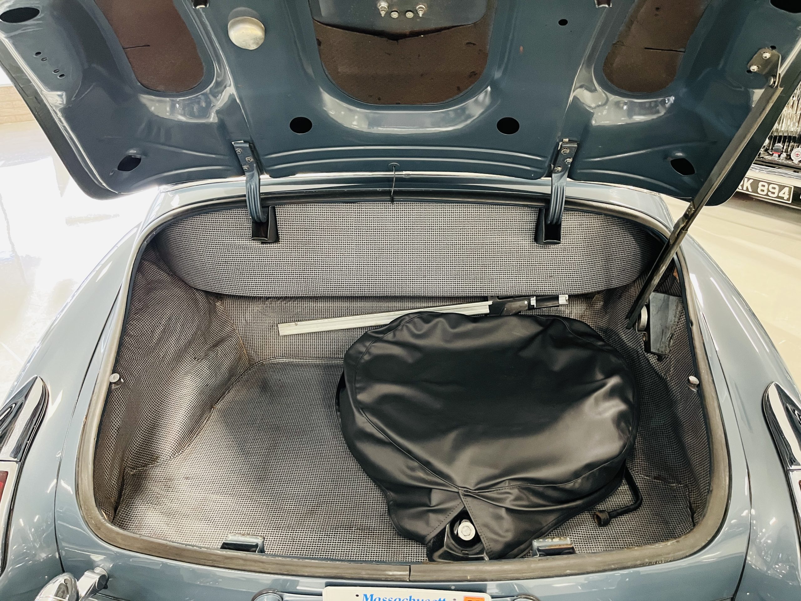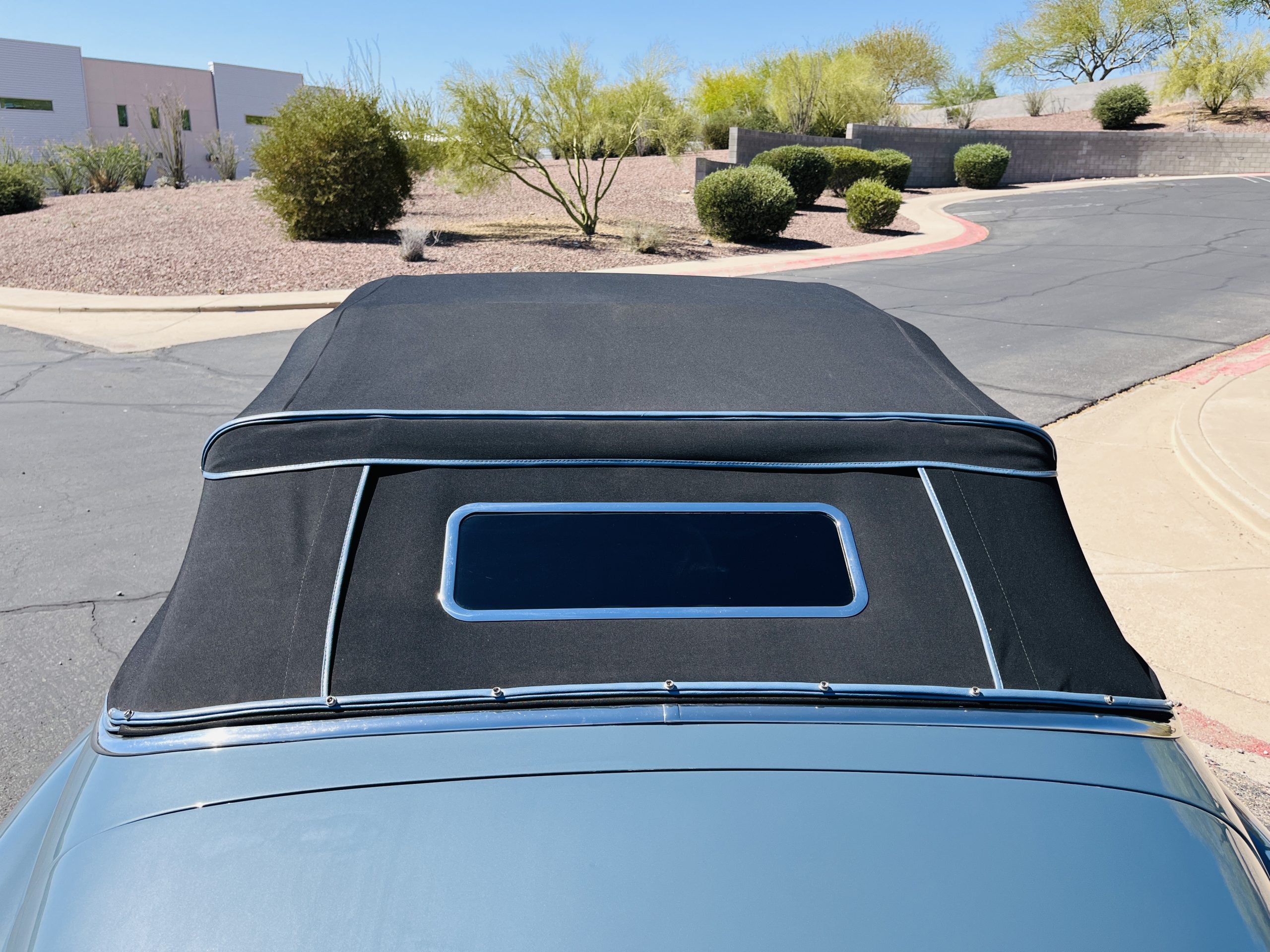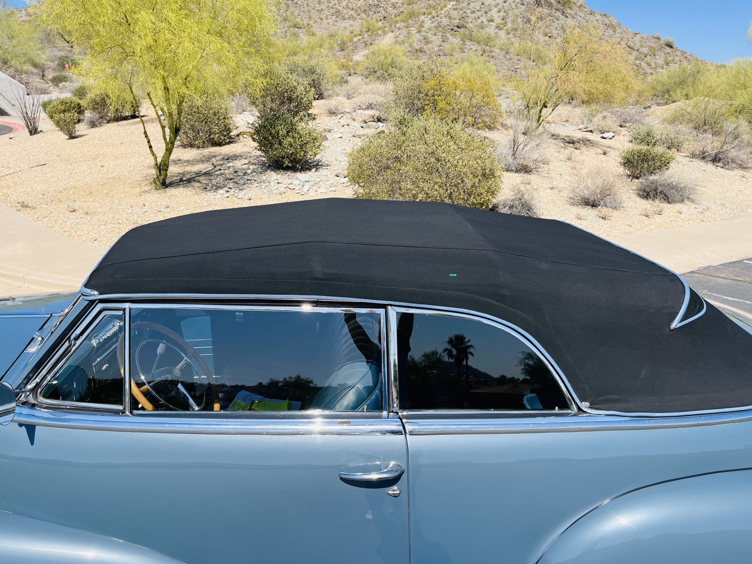 The livery is beautiful in its original Seine Blue (Paint Code 121MK) which was repainted in 2009. Today it has wonderful overall presence with nice shine and luster while having several areas of small touched up chips and some fading. Only upon close inspection can you see some minor imperfections. This is a very attractive color that appears contemporary today, accentuating its sleek and sexy lines. The black canvas convertible power top is newer and in excellent condition and we love its contrasting blue piping. The chrome is in very nice condition and shows very well. The wide white wall radials are complimented by the red wheels and the iconic Cadillac wheel covers. This Series 62 comes with optional dual side mirrors, dual fog lights, and backup lamp.