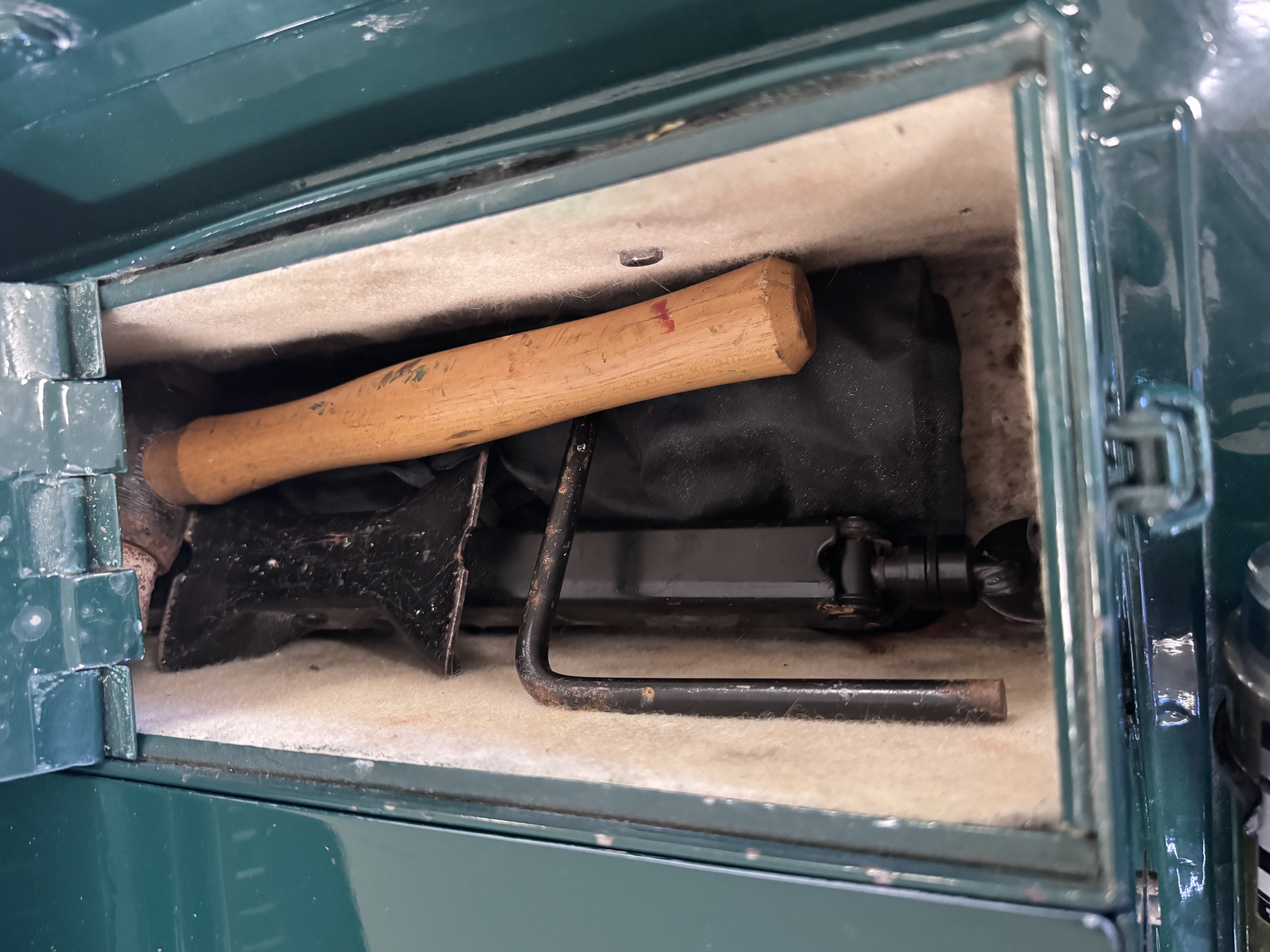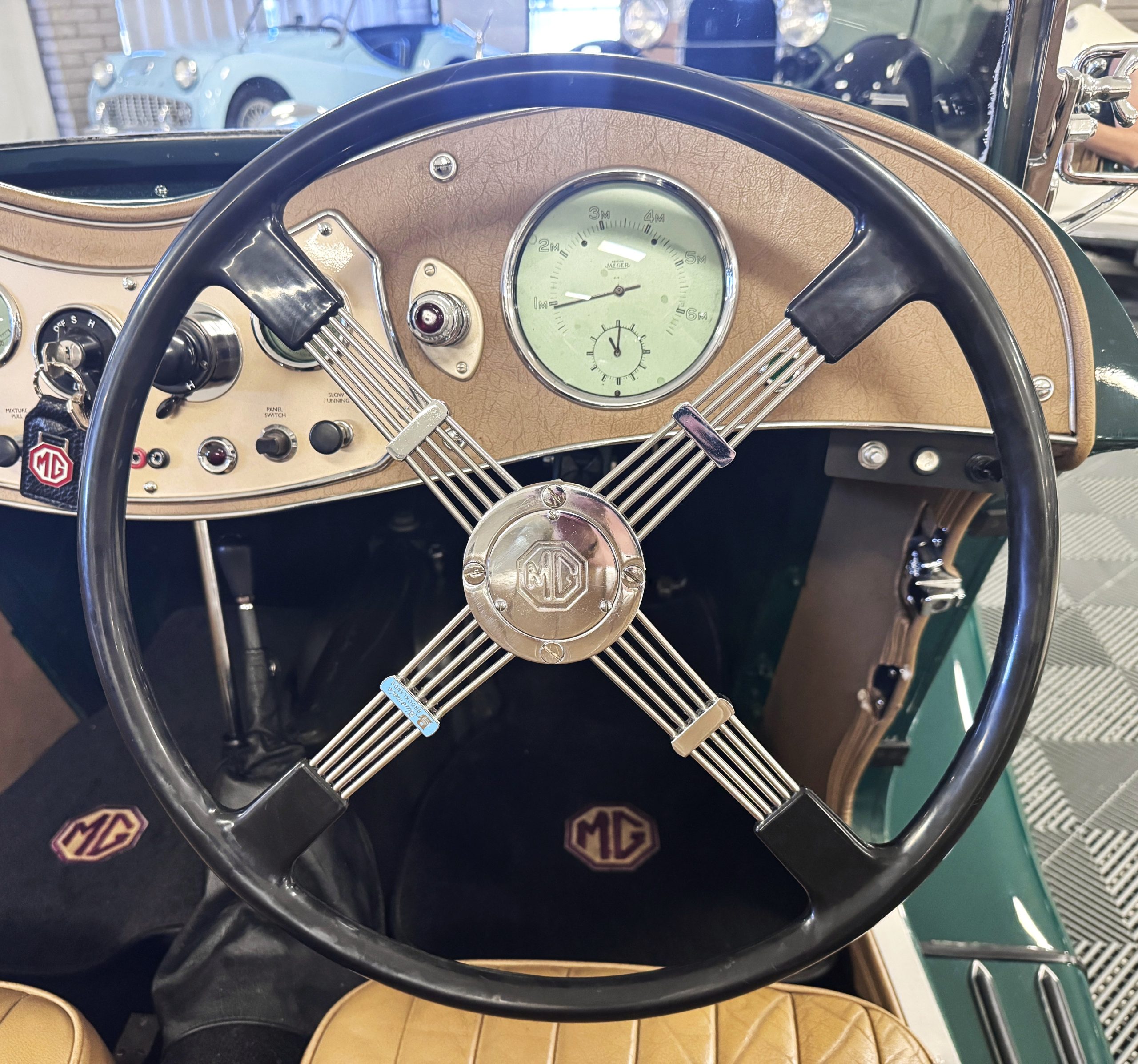 The MG interior is in overall excellent condition reflecting the compact and purposeful cockpit typical of the TC series. The interior is trimmed in tan leather that presents in excellent condition with minimal signs of normal use. Gray short-pile carpeting remains in very good condition and complements the traditional tan textured dashboard. The dashboard includes two map lights and has backlite instrument gauges. A four-spoke banjo-style steering wheel frames the original Jaeger instrumentation, maintaining the period-correct driving environment that enthusiasts appreciate. Tan leather door panels with storage pockets provide modest practicality within the intimate two-seat configuration.