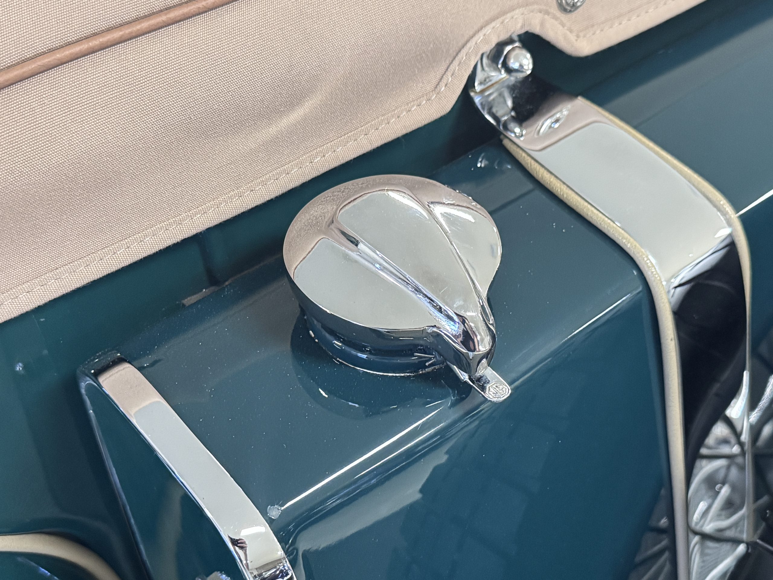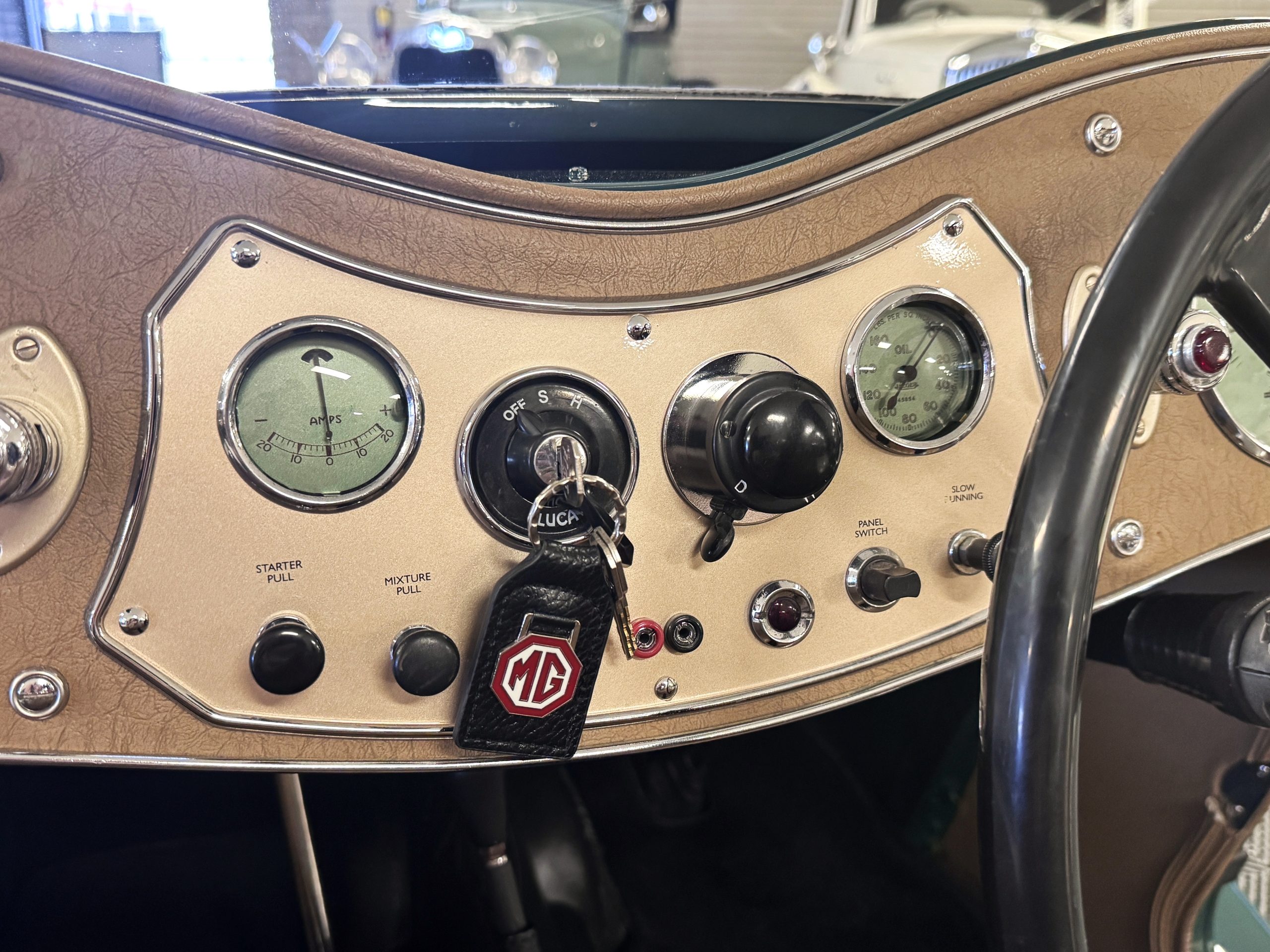 The MG is finished in Rally Green that is in excellent condition, complemented by sweeping fenders and the TC’s distinctive upright grille. Chrome trim including the grille surround and lighting bezels is in excellent condition, and the MG is fitted with the rare aftermarket Midge radiator mascot produced by HJ Randall. The MG has a flat folding windscreen, horn, headlights, parking lamps, fog light, windshield wipers and dual rear-view mirrors that are all in good working condition. The rubber trim and seals through the exterior are in great condition. A tan convertible top and tonneau cover installed in 2021 are in excellent condition, and optional side curtains are included. The MG rides on 19-inch wire wheels that were installed in 2019 and used less than 2,000 miles, with a rear-mounted spare with MG three-eared knock-off hub. Badge bars carry Royal Automobile Club, Great Britain, and Swiss insignia, and the original British license plate GVE 656 remains affixed to the front. The MG presents in excellent condition and will be appreciated by enthusiasts!