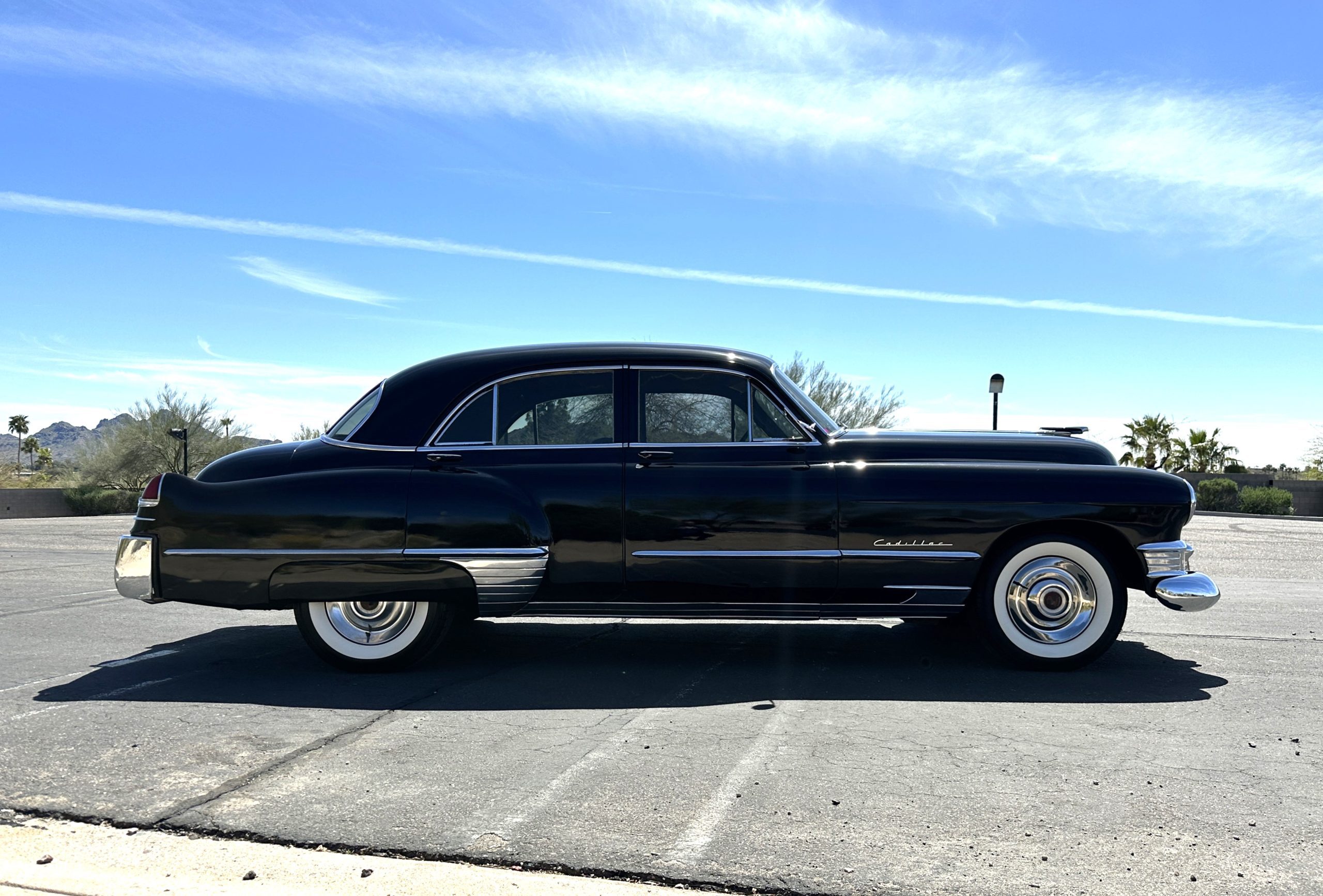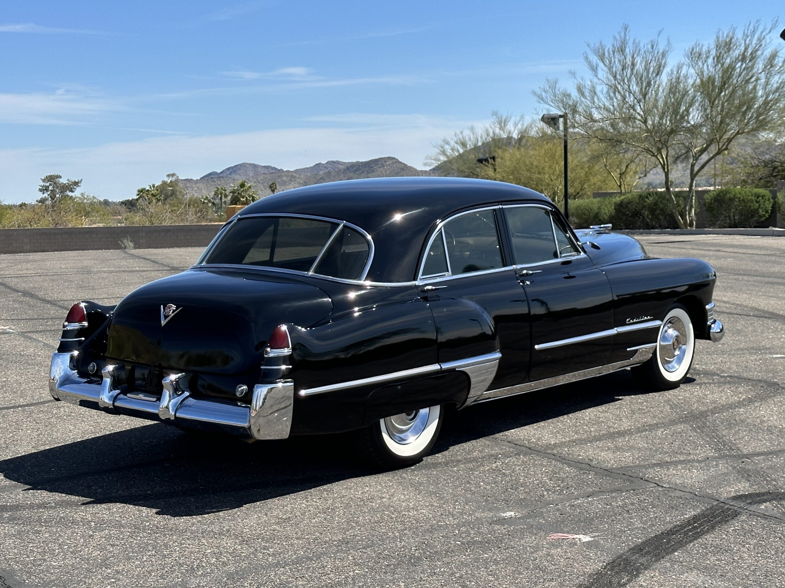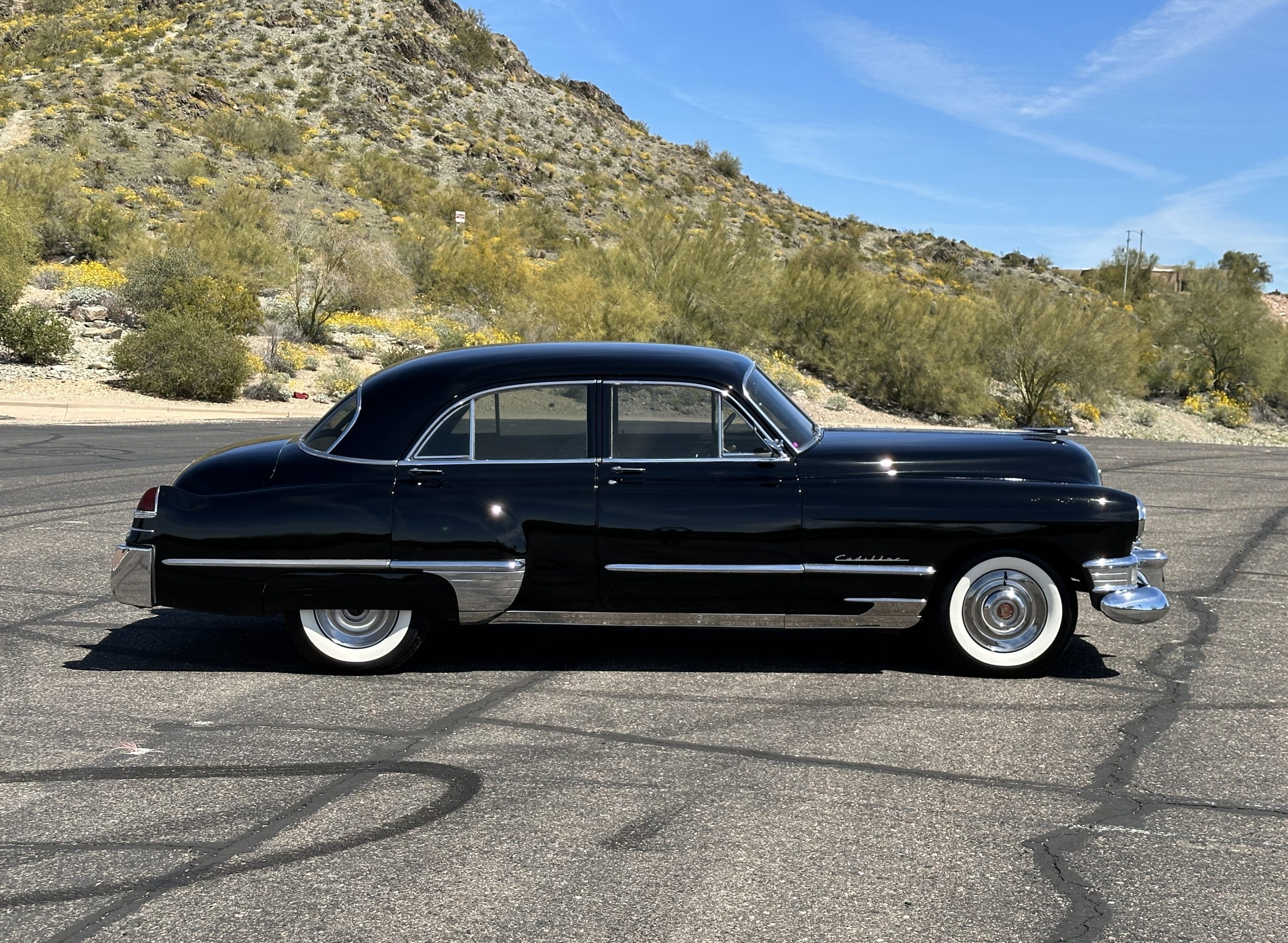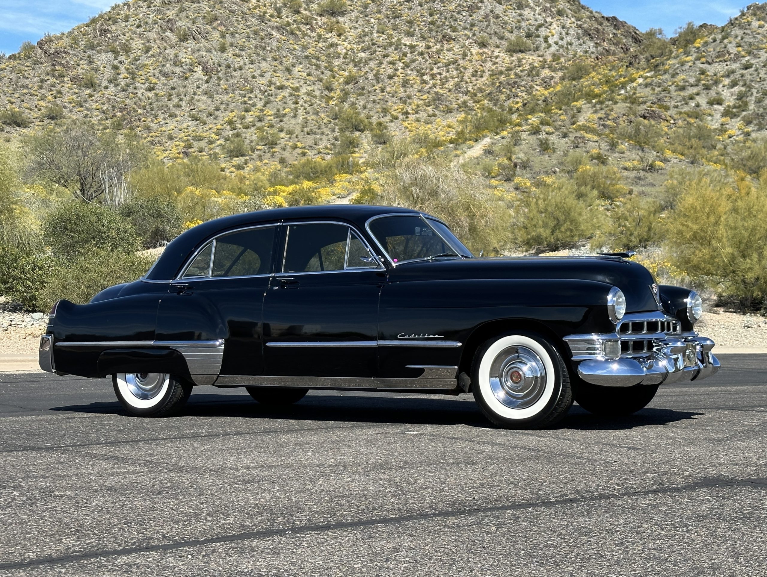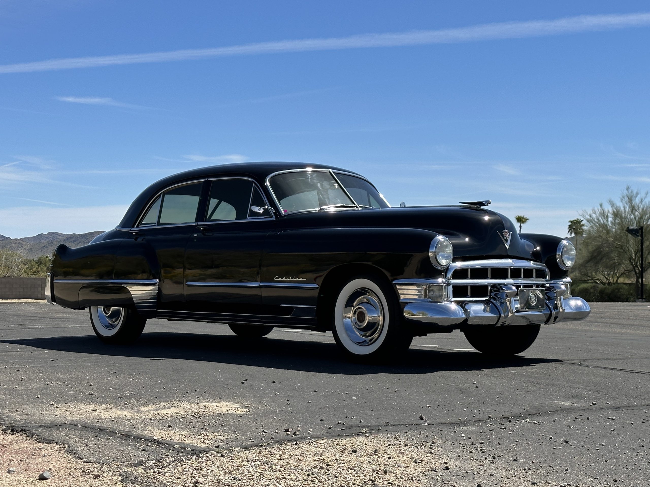 This well cared for 1949 Cadillac Series 61 Sedan is owned by a long-time Cadillac collector and is a wonderful example for car shows and touring. She has benefitted from an older restoration and runs and drives beautifully with a recent servicing and brakes. She’s not a trailer queen but rather a very nice weekend driver that is a joy to drive. We love the beautiful chrome and stainless trim on this Cadillac.
