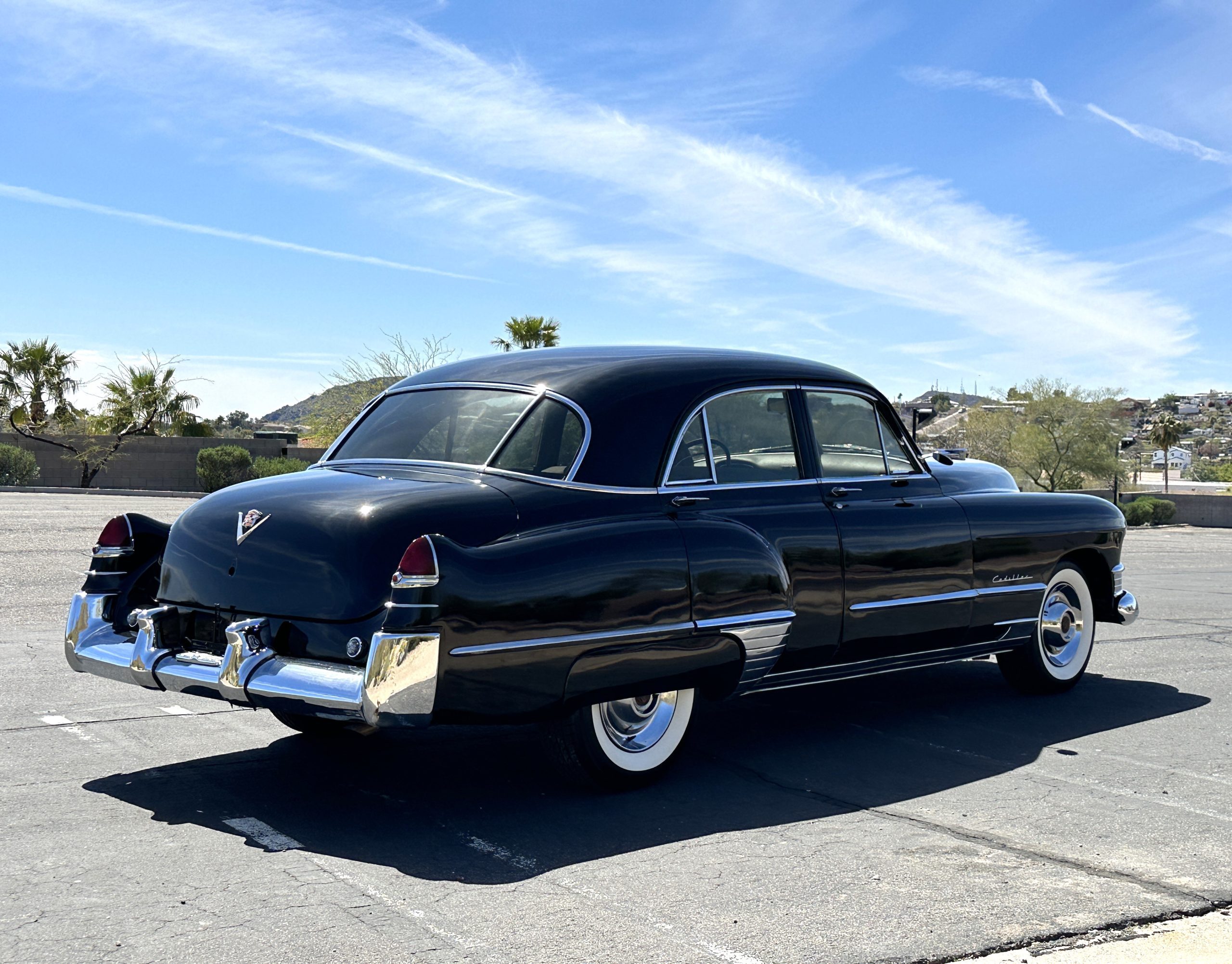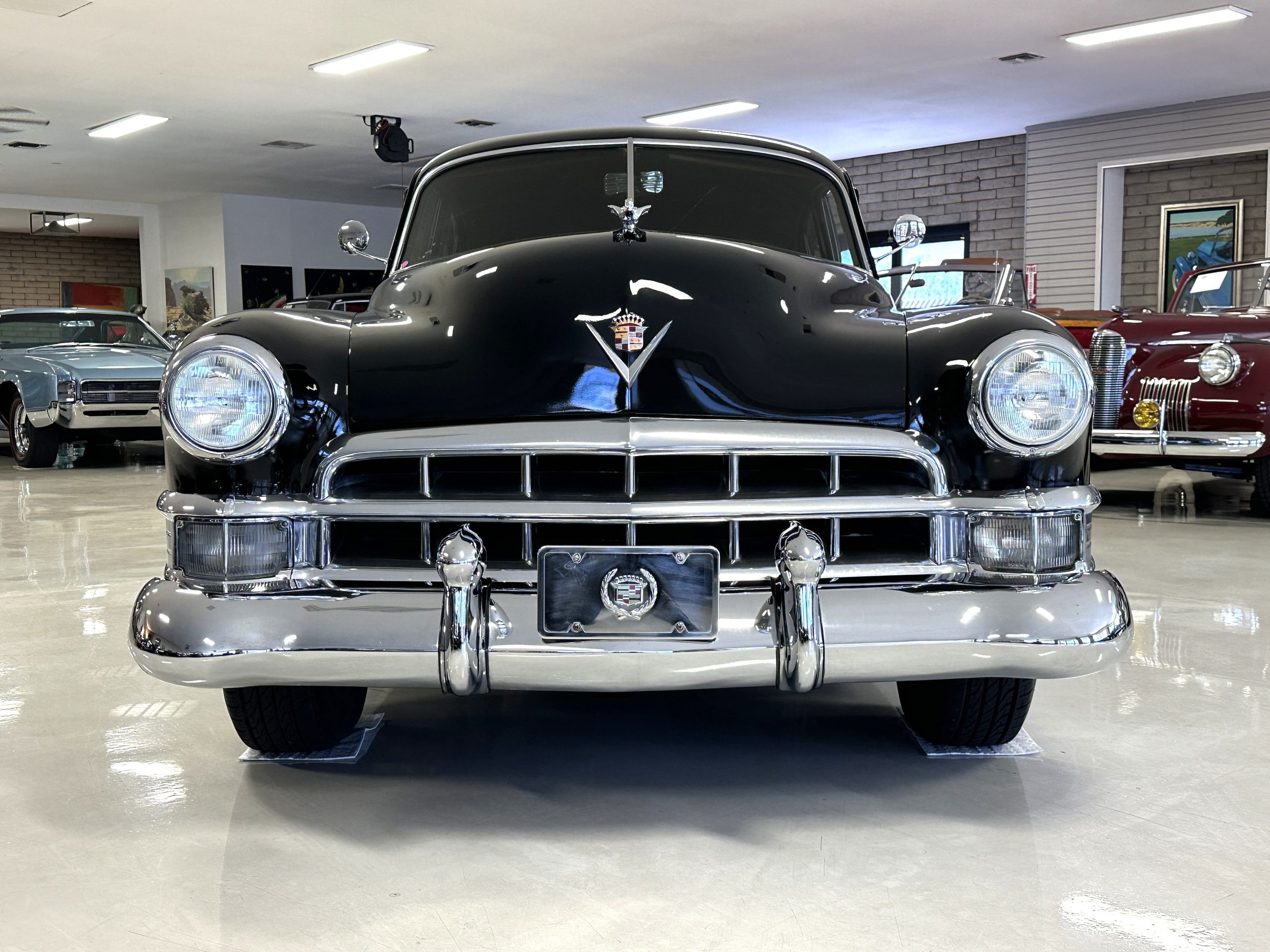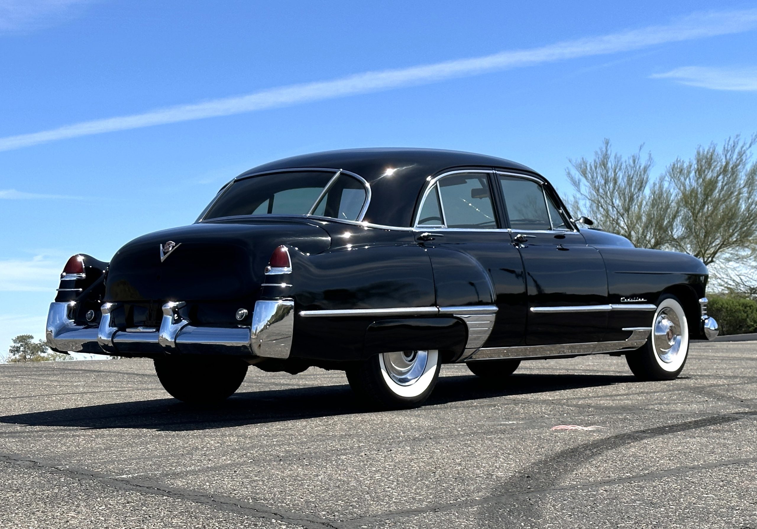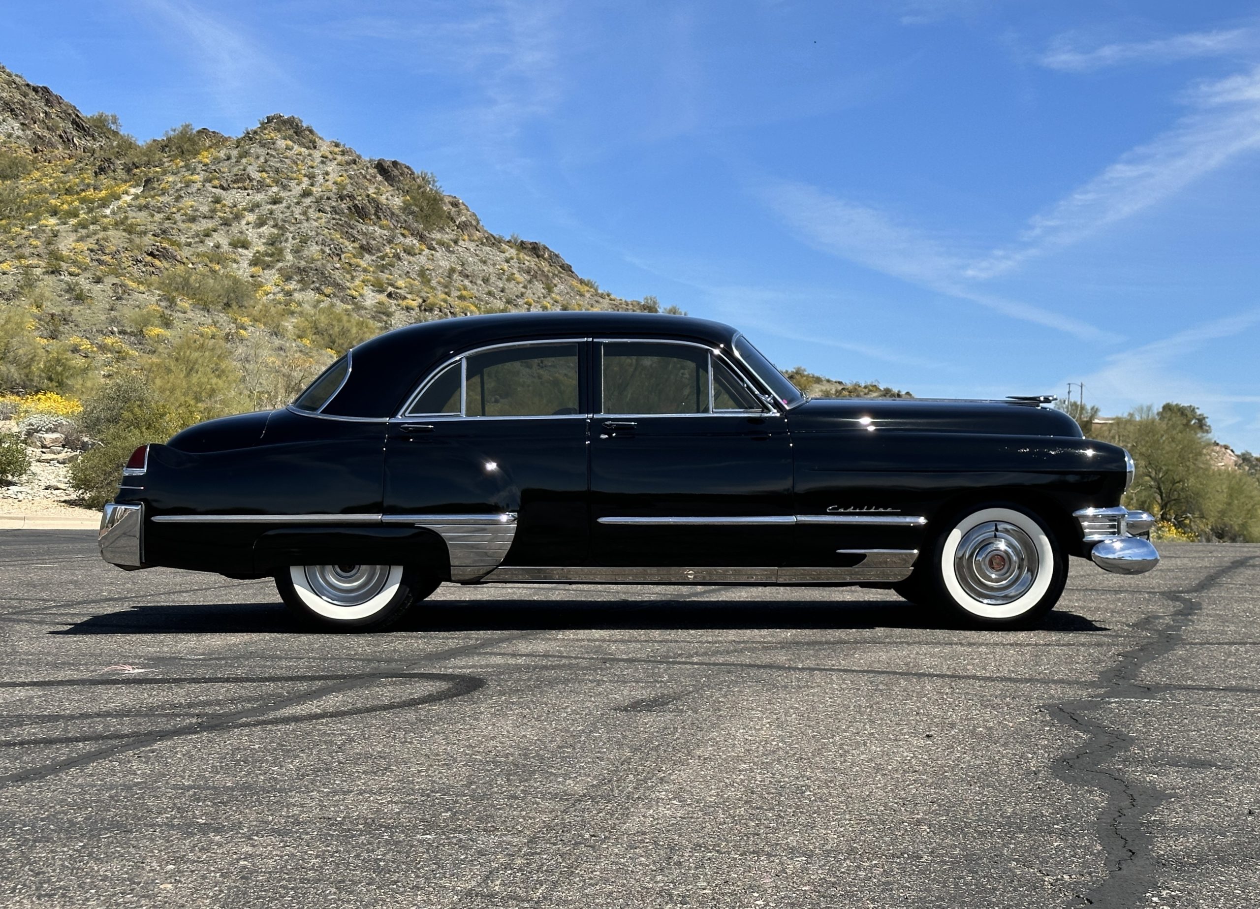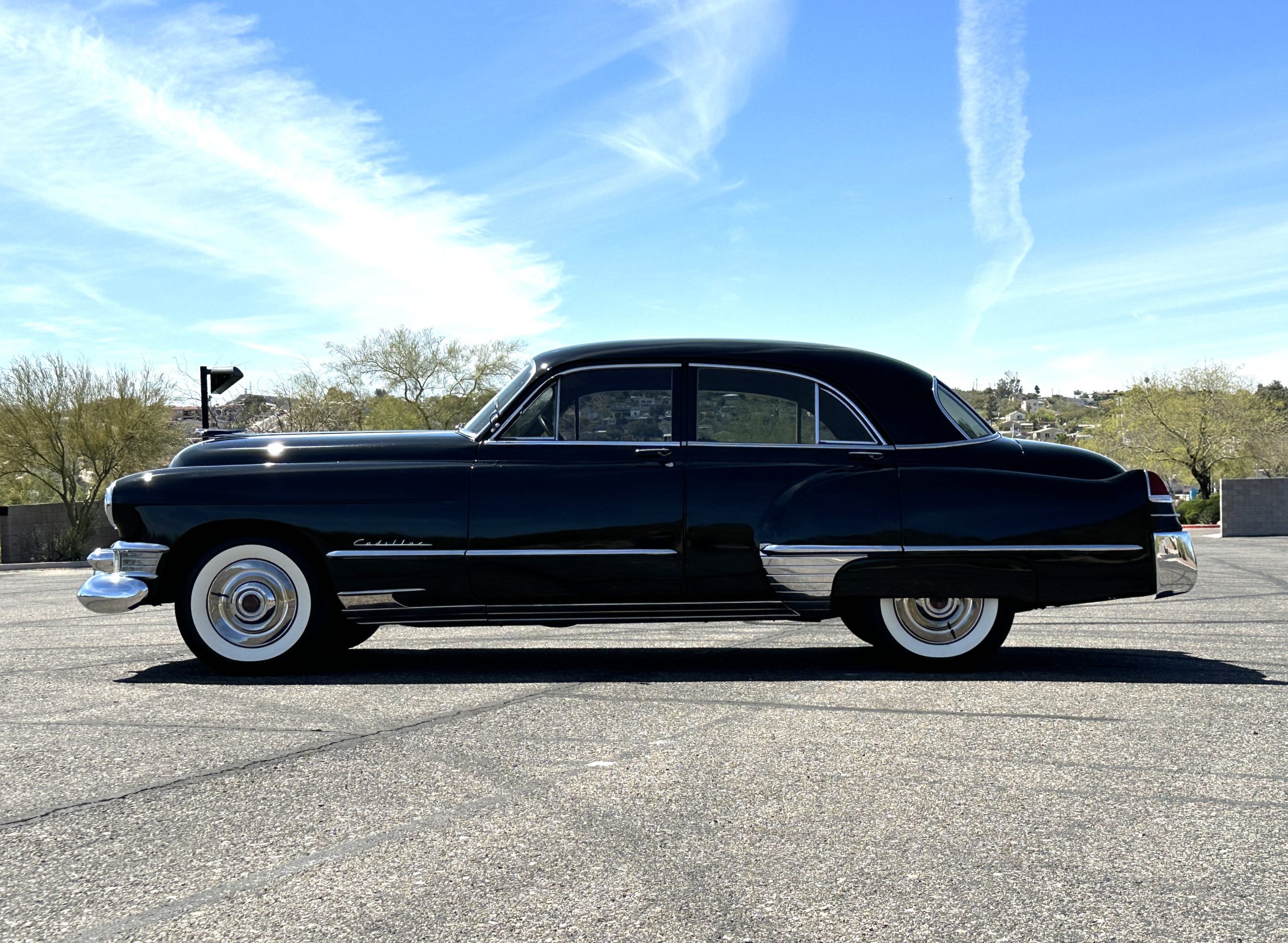 This well cared for 1949 Cadillac Series 61 Sedan is owned by a long-time Cadillac collector and is a wonderful example for car shows and touring. She has benefitted from an older restoration and runs and drives beautifully with a recent servicing and brakes. She’s not a trailer queen but rather a very nice weekend driver that is a joy to drive. We love the beautiful chrome and stainless trim on this Cadillac.