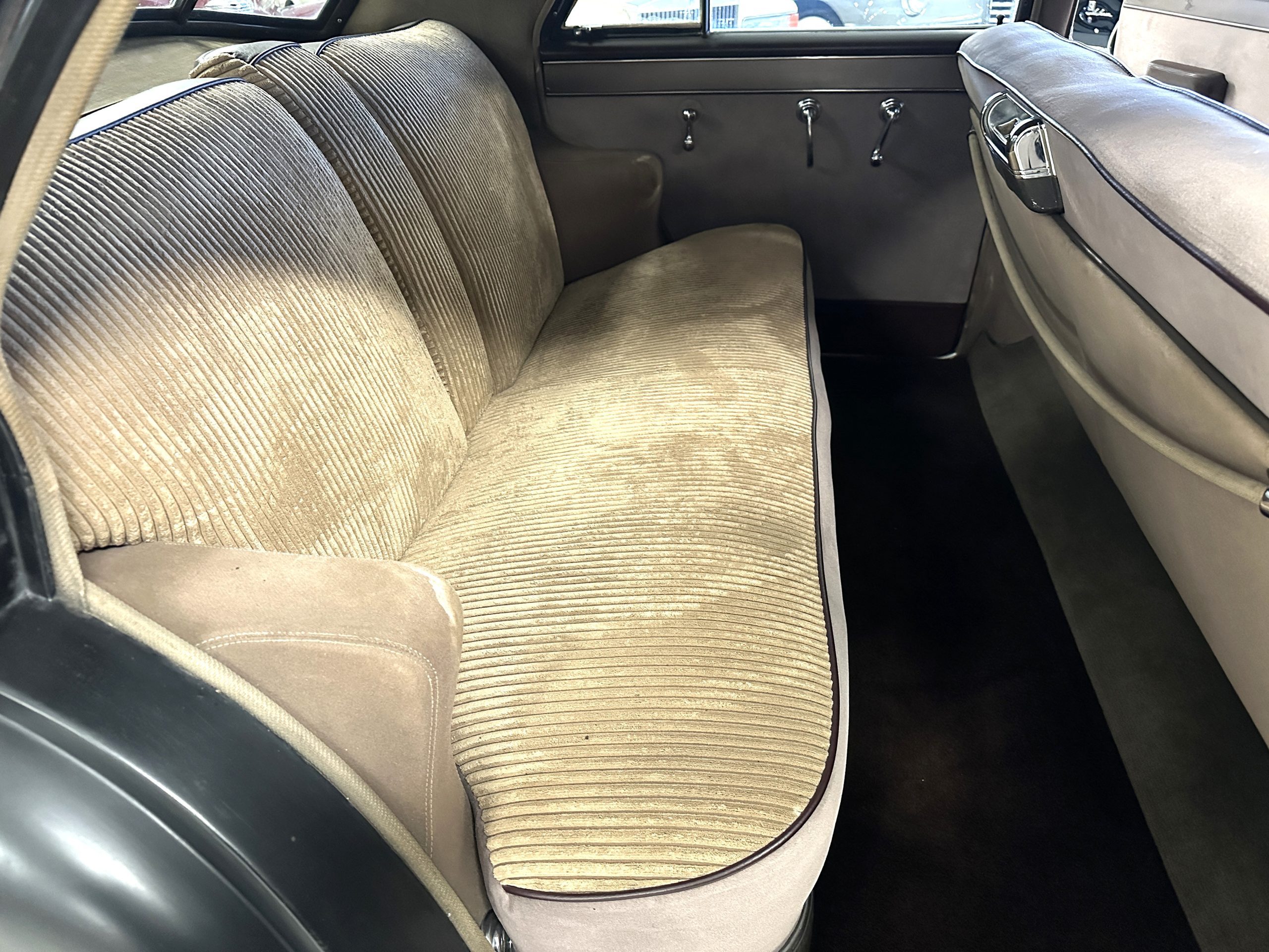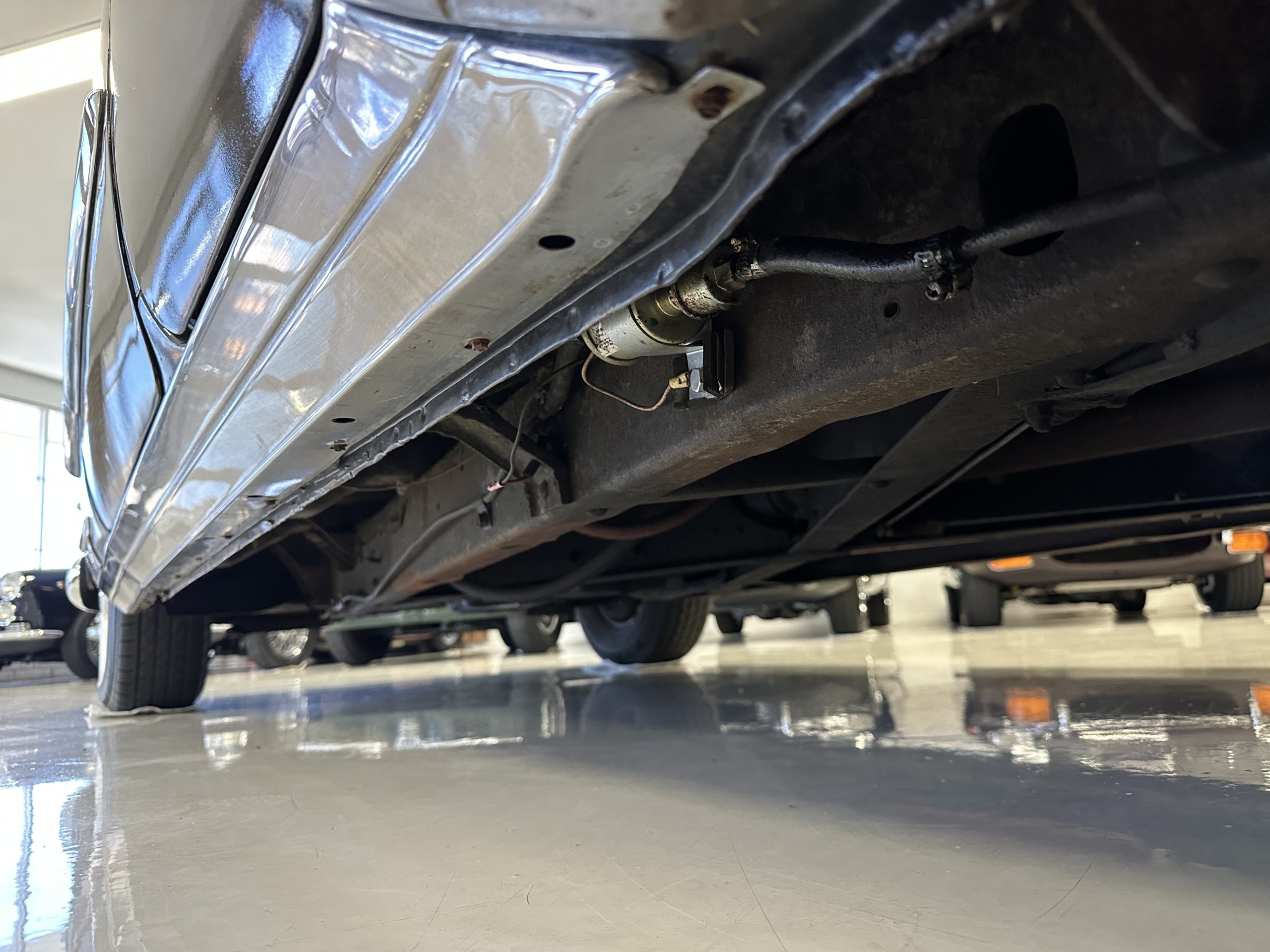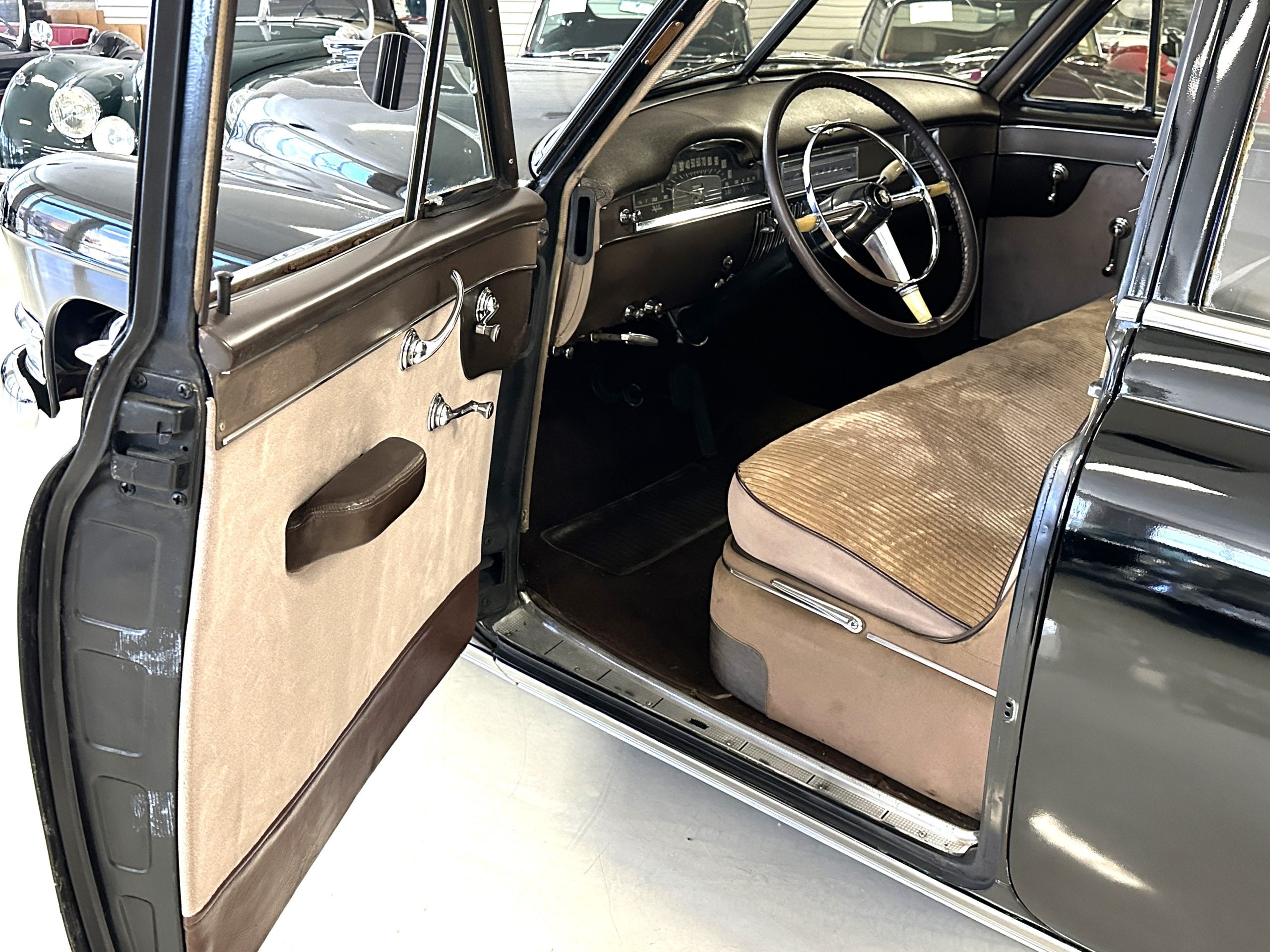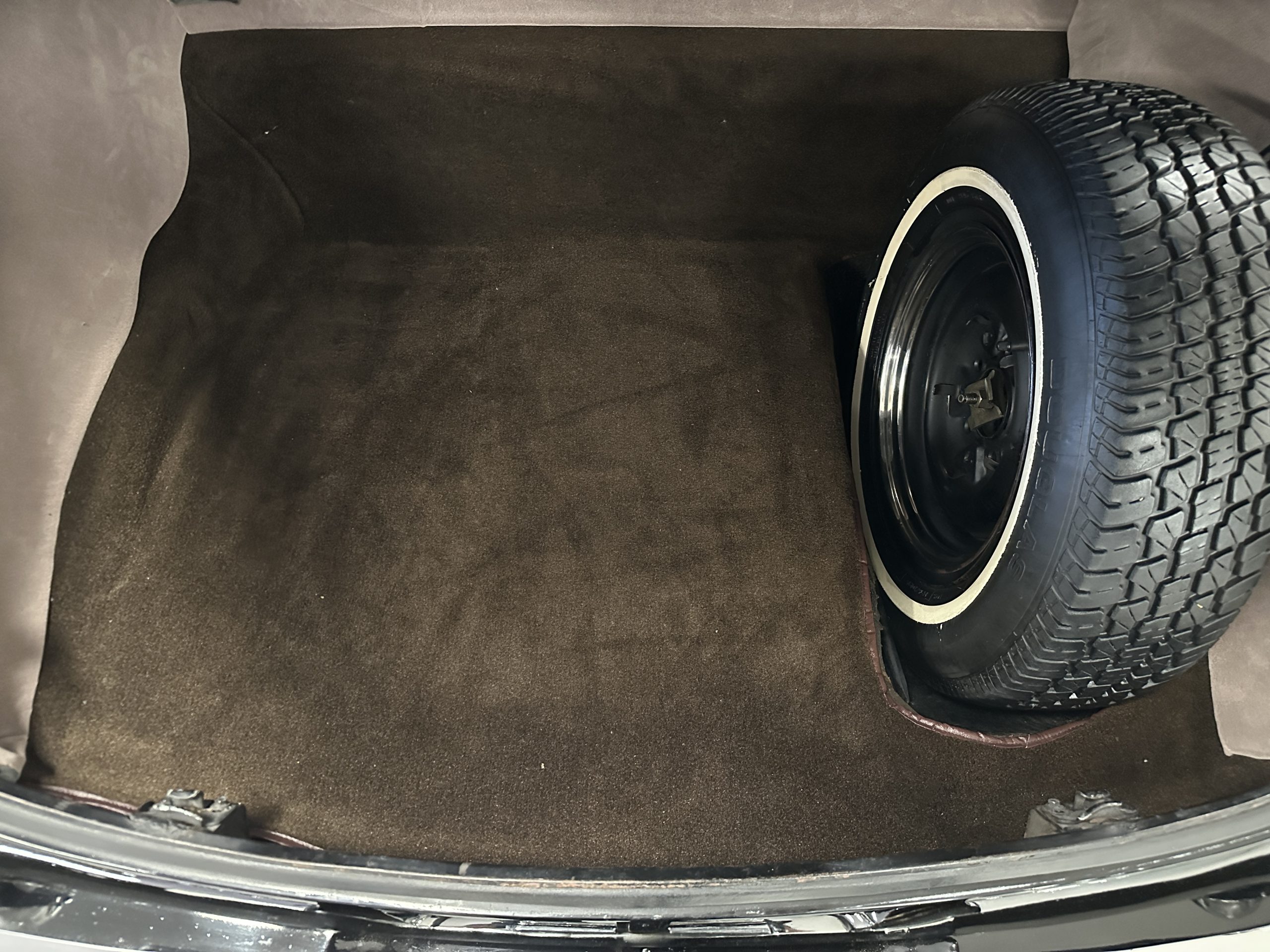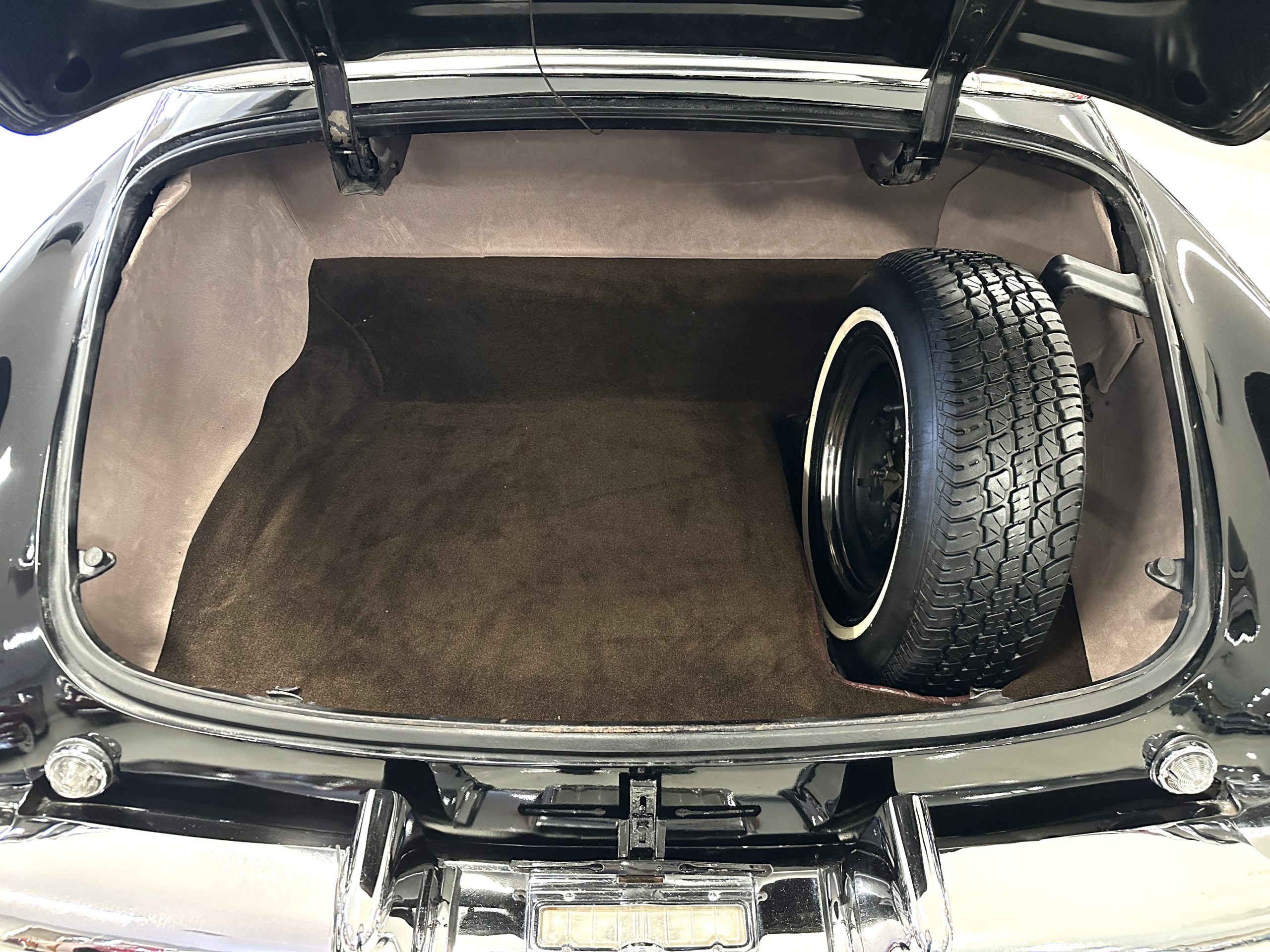 The livery is a rich Black (Paint Code 1) that is in touring condition having a very nice shine and luster. There are several paint imperfections, but she shows well overall. The body is very straight and appears to be rust free. The bumpers have been re-chromed and are in overall nice condition. The undercarriage is clean and rust-free but does show expected patina for her age and use. The trunk area is very clean and nicely detailed. Her hubcaps and wheels all show well. She has recently been fitted with Cooper white wall tires which really enhance the ride quality and they look sharp. The windows have all been tinted and the driver’s side windshield glass has a crack (but it is flat glass). The trunk latch has been replaced.
