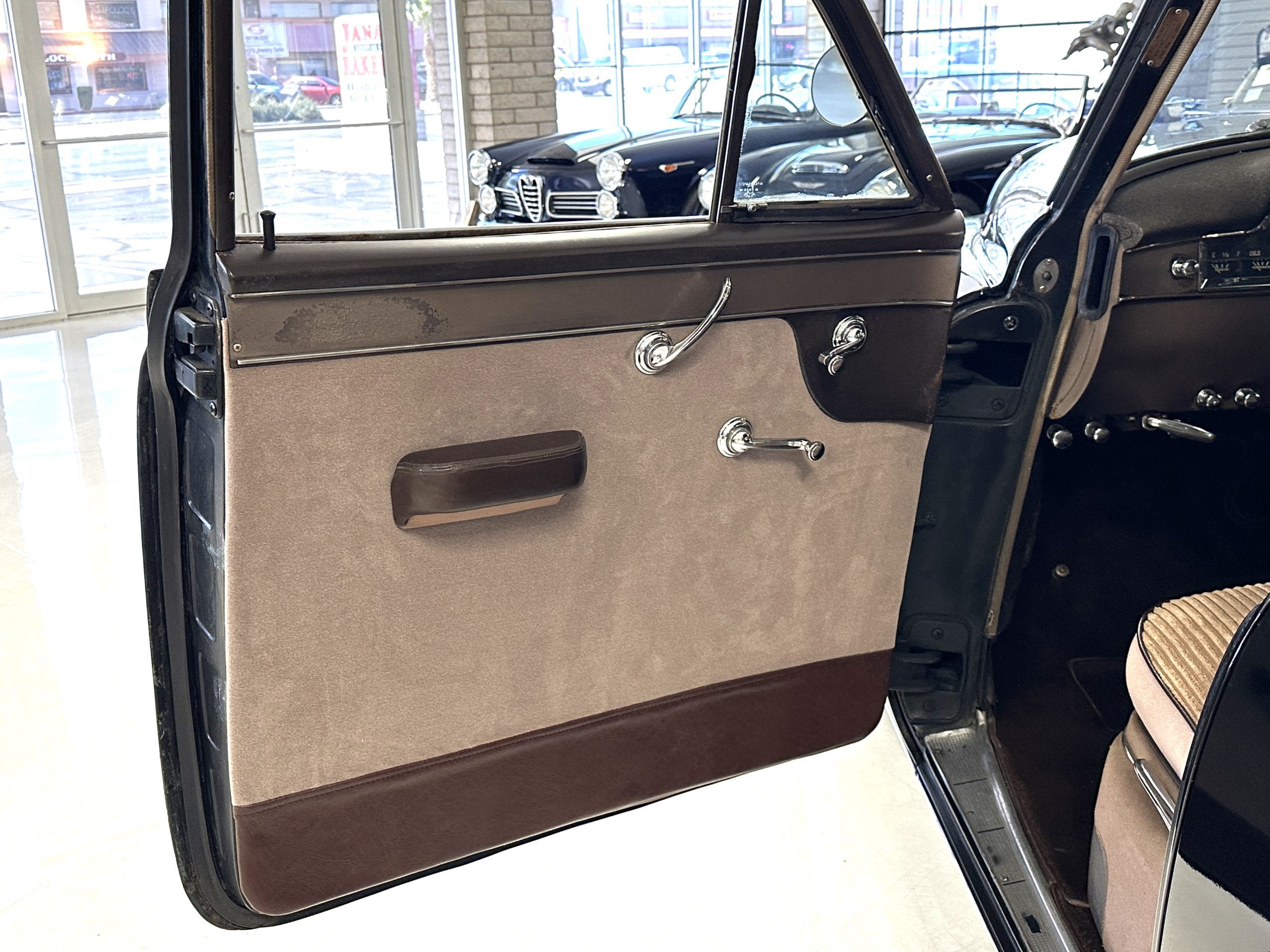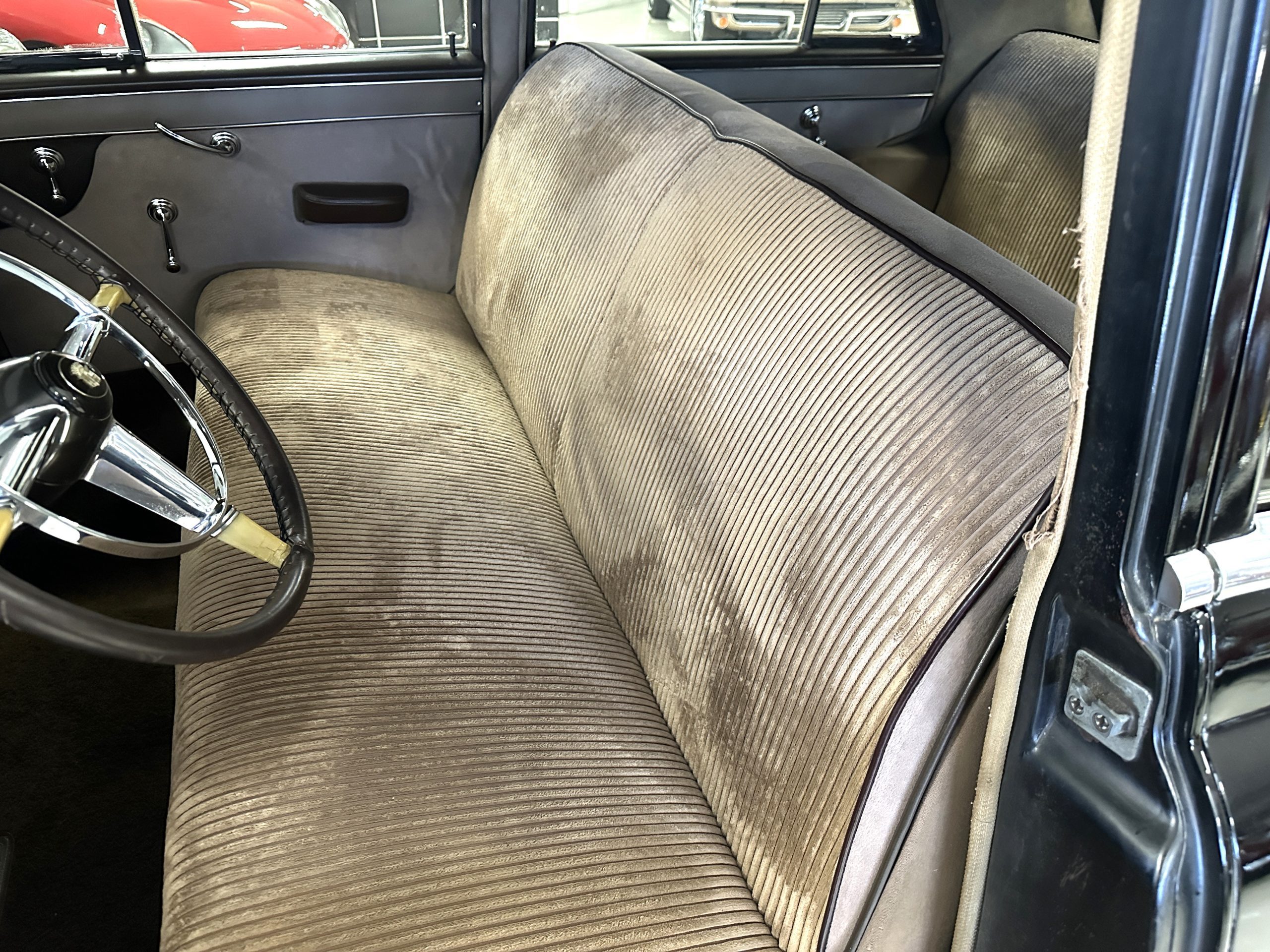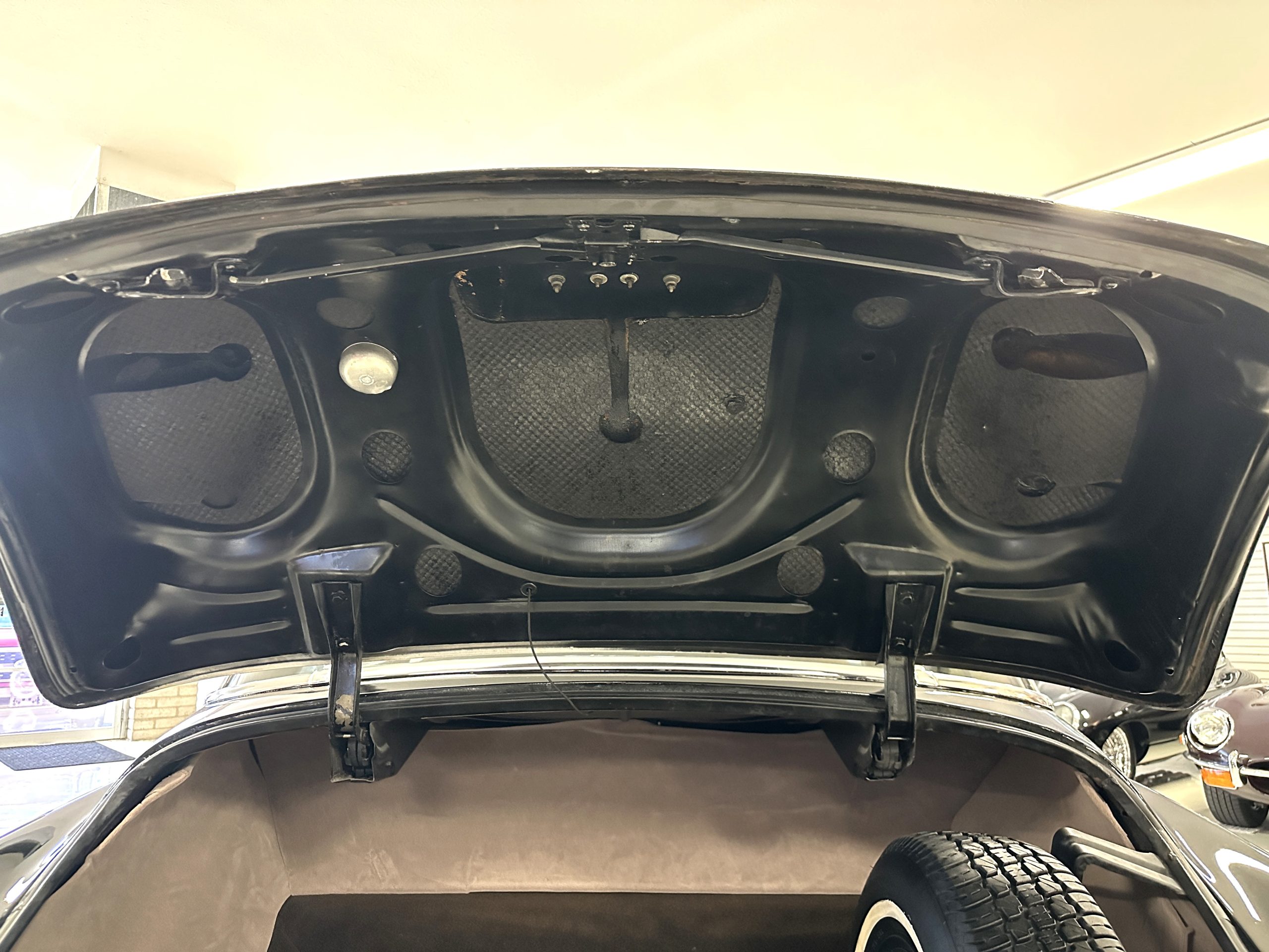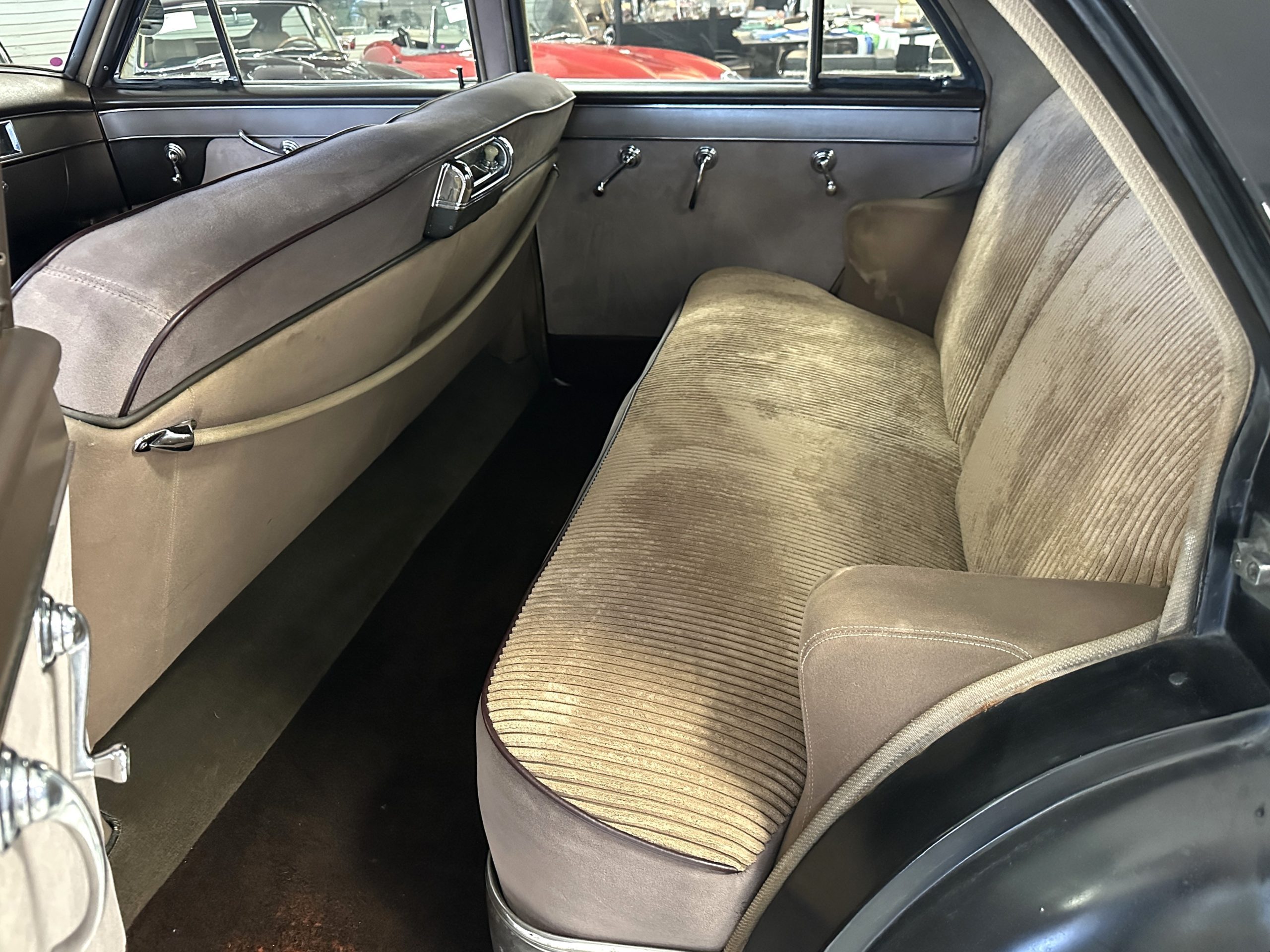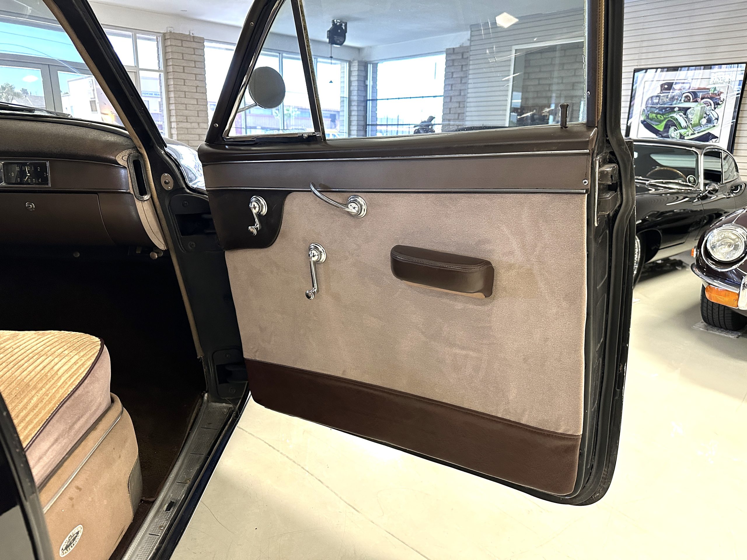 The livery is a rich Black (Paint Code 1) that is in touring condition having a very nice shine and luster. There are several paint imperfections, but she shows well overall. The body is very straight and appears to be rust free. The bumpers have been re-chromed and are in overall nice condition. The undercarriage is clean and rust-free but does show expected patina for her age and use. The trunk area is very clean and nicely detailed. Her hubcaps and wheels all show well. She has recently been fitted with Cooper white wall tires which really enhance the ride quality and they look sharp. The windows have all been tinted and the driver’s side windshield glass has a crack (but it is flat glass). The trunk latch has been replaced.