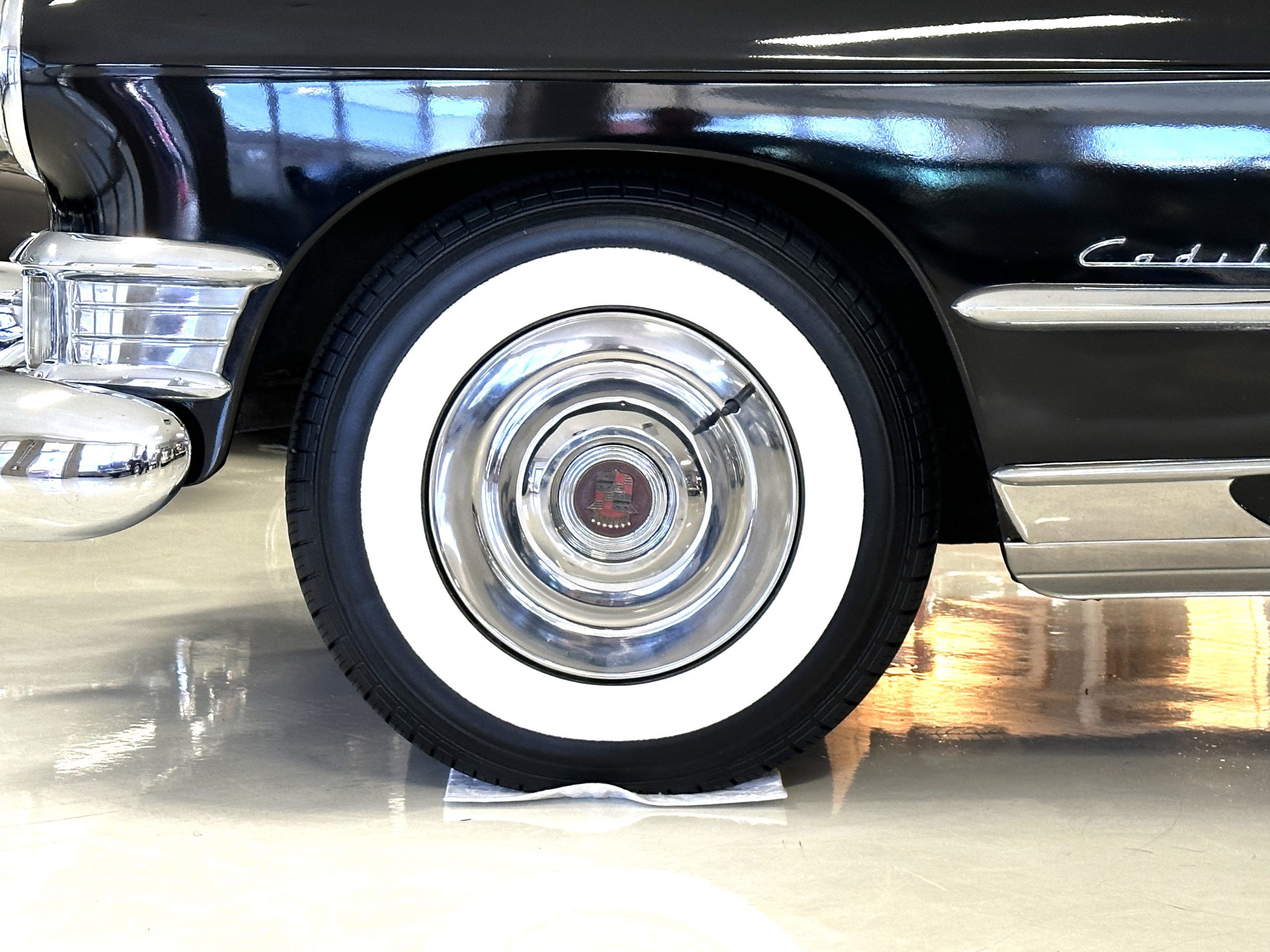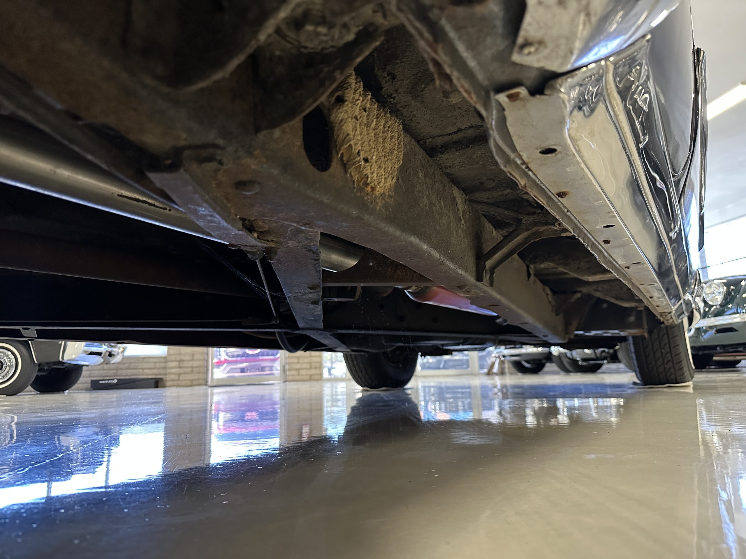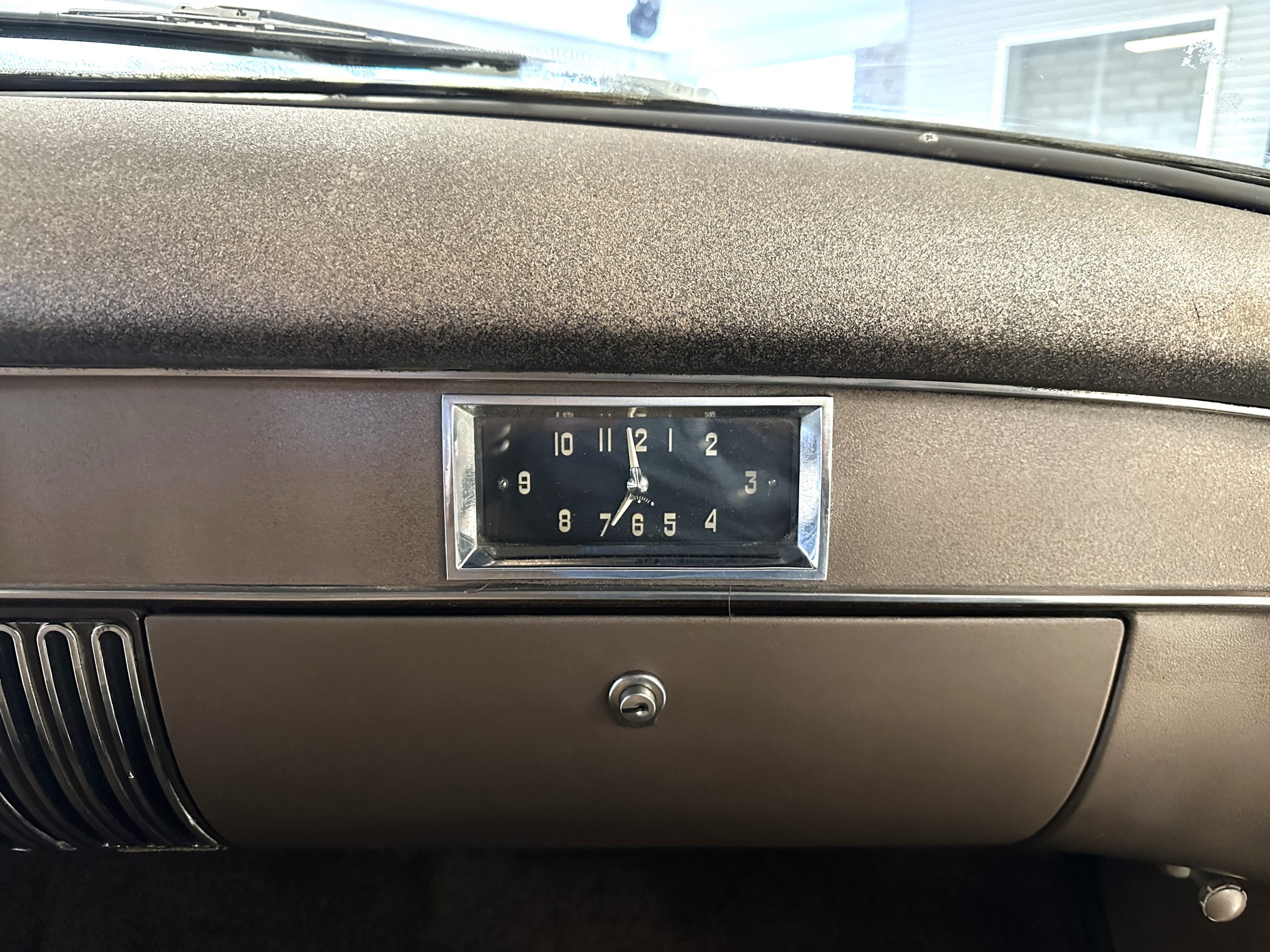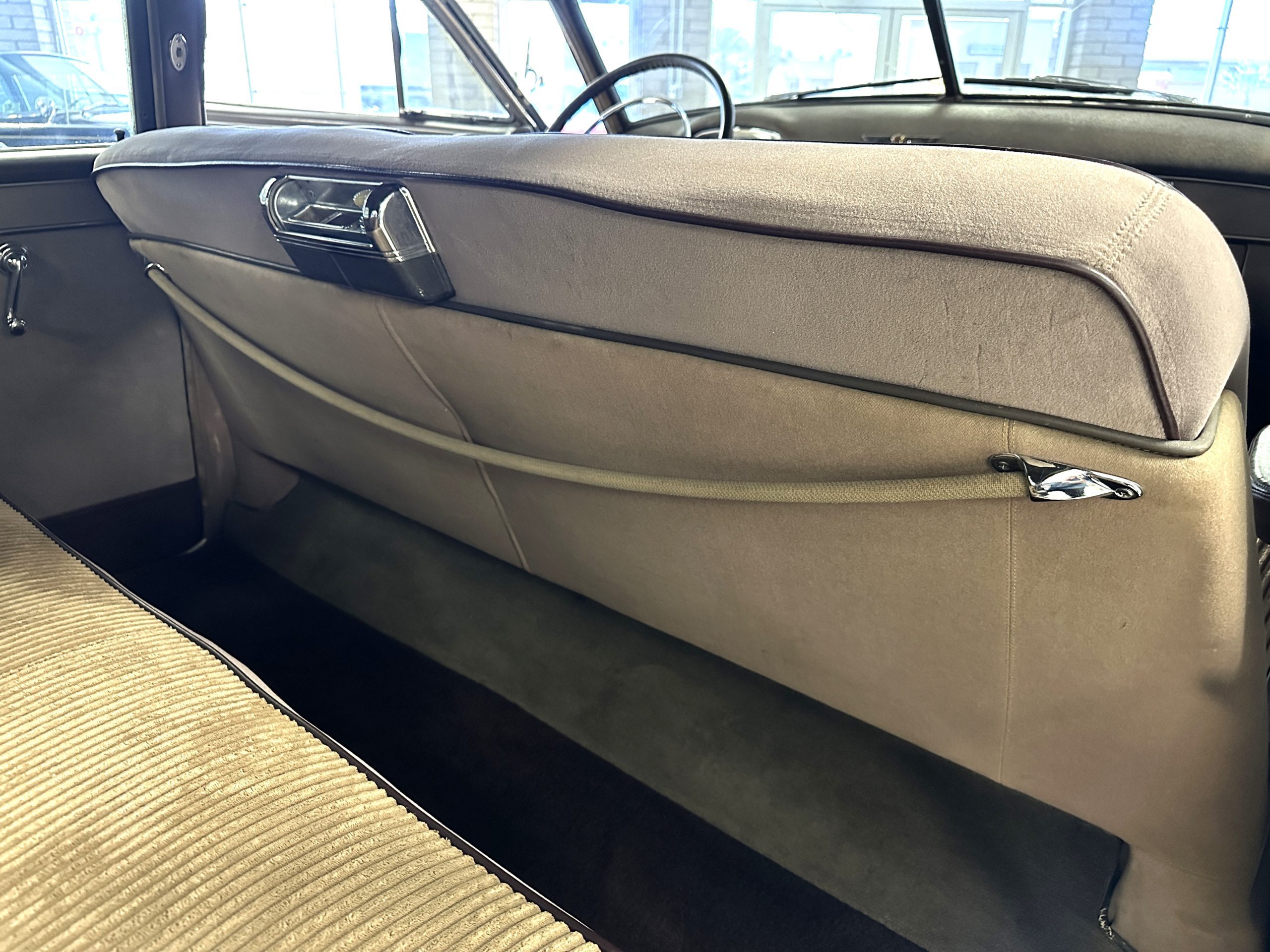 The livery is a rich Black (Paint Code 1) that is in touring condition having a very nice shine and luster. There are several paint imperfections, but she shows well overall. The body is very straight and appears to be rust free. The bumpers have been re-chromed and are in overall nice condition. The undercarriage is clean and rust-free but does show expected patina for her age and use. The trunk area is very clean and nicely detailed. Her hubcaps and wheels all show well. She has recently been fitted with Cooper white wall tires which really enhance the ride quality and they look sharp. The windows have all been tinted and the driver’s side windshield glass has a crack (but it is flat glass). The trunk latch has been replaced.