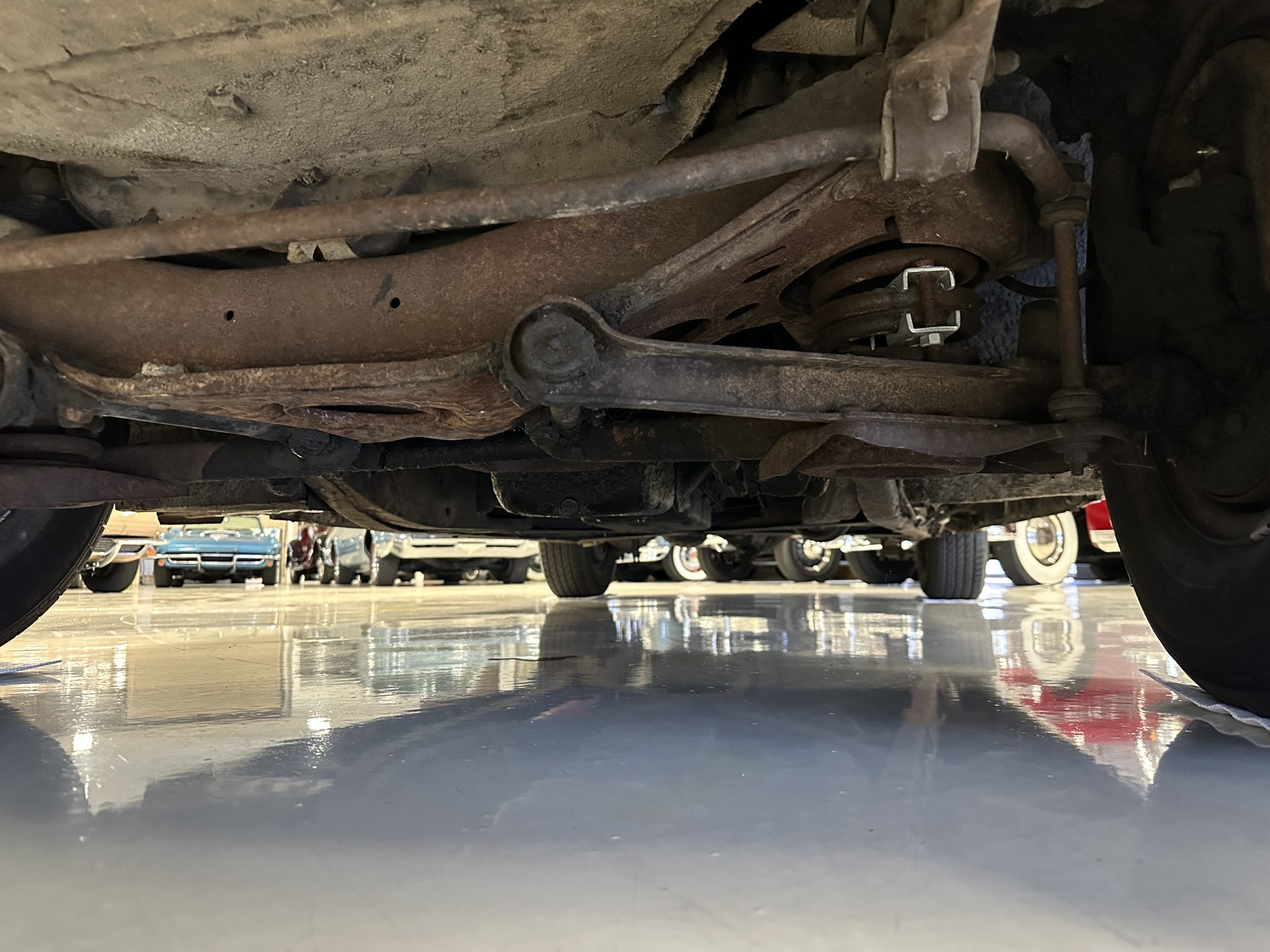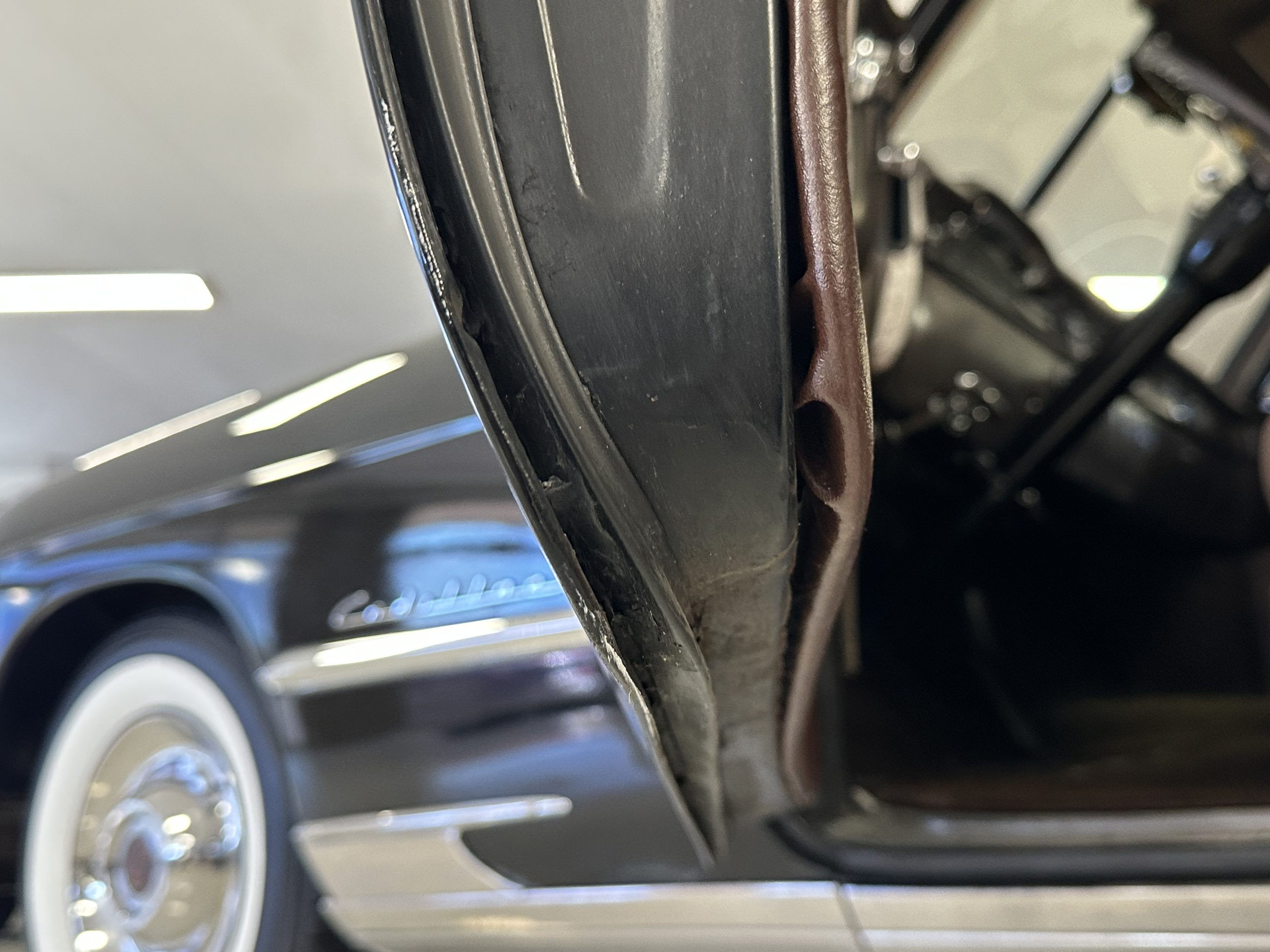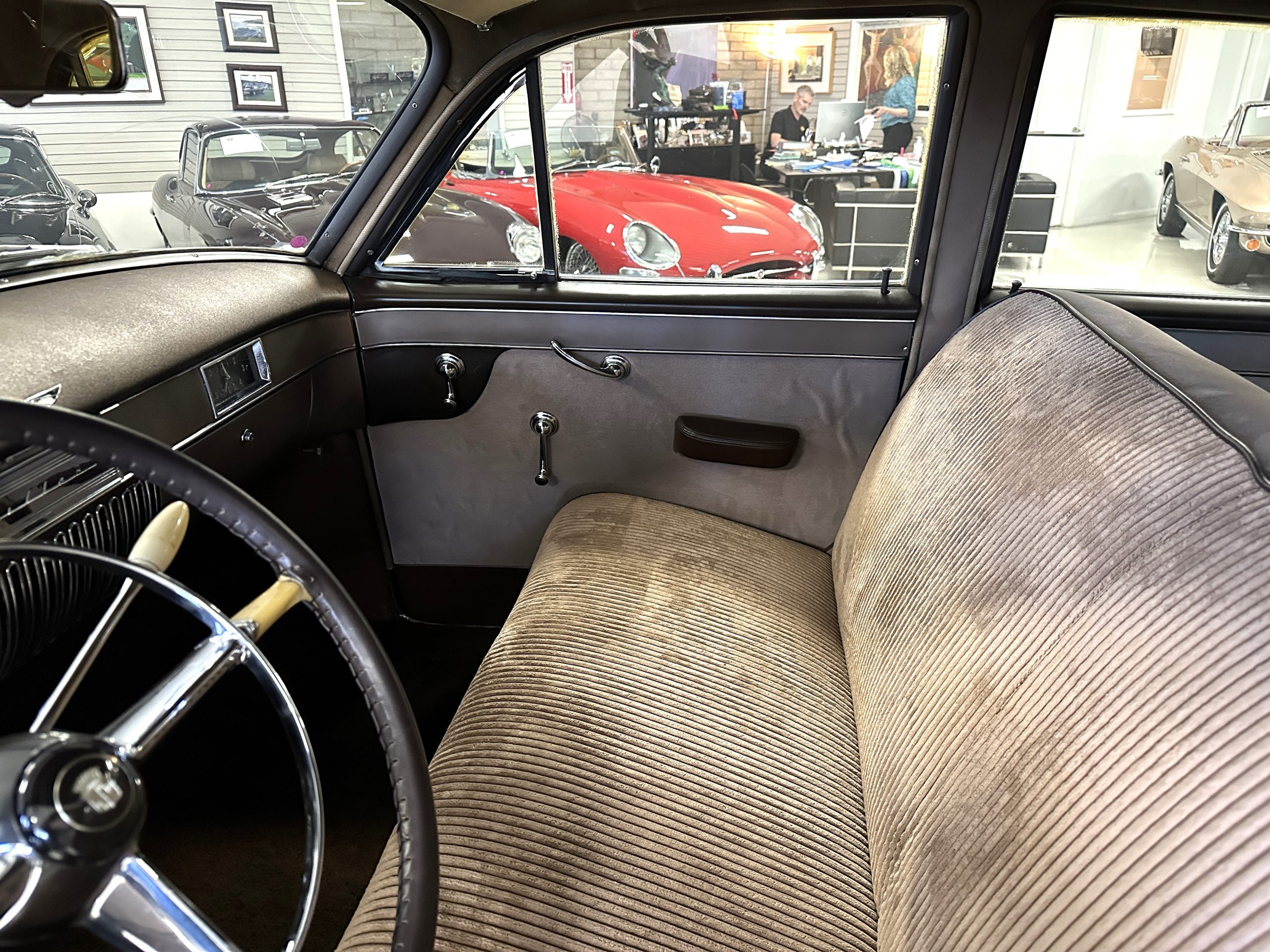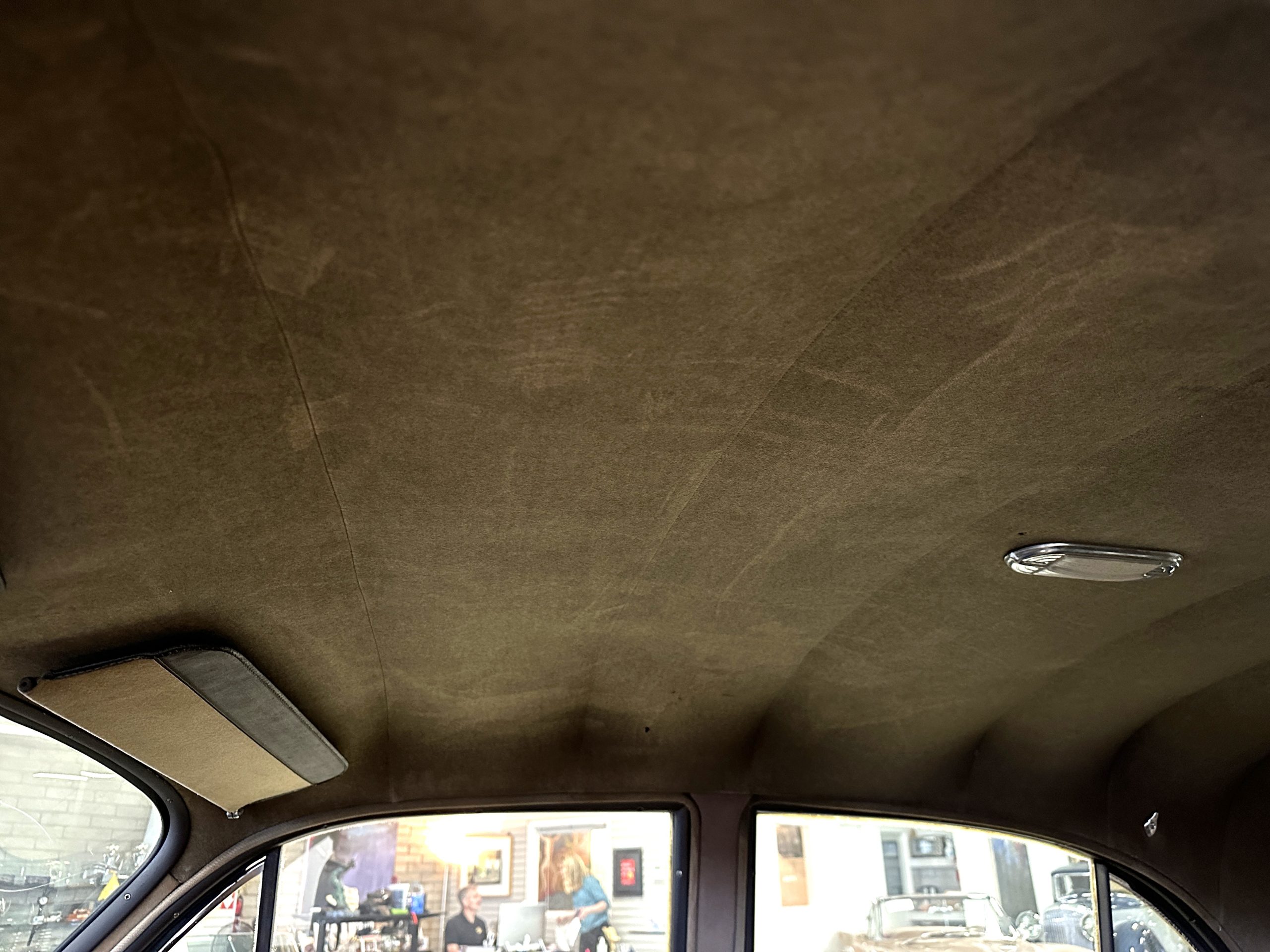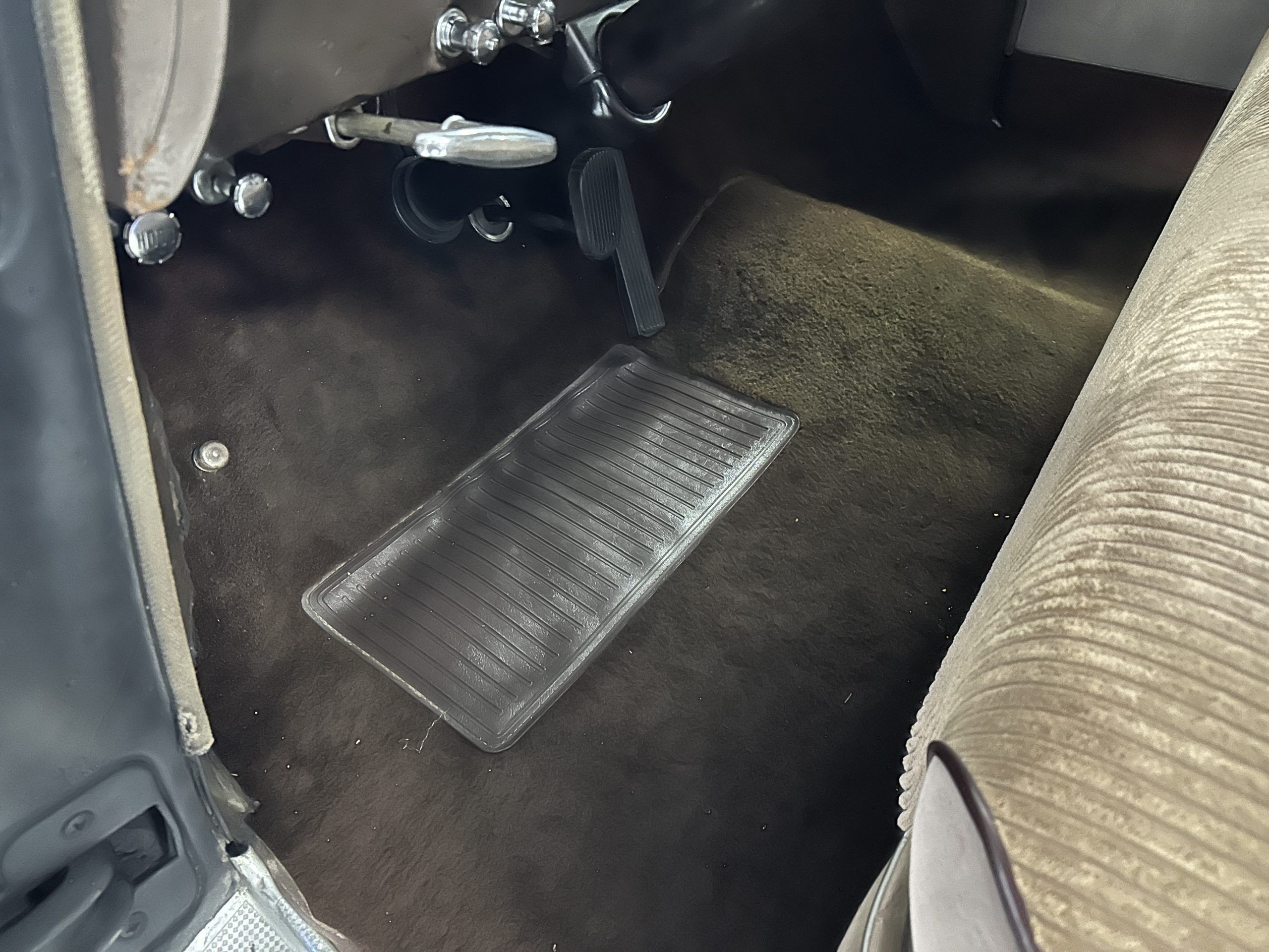 The livery is a rich Black (Paint Code 1) that is in touring condition having a very nice shine and luster. There are several paint imperfections, but she shows well overall. The body is very straight and appears to be rust free. The bumpers have been re-chromed and are in overall nice condition. The undercarriage is clean and rust-free but does show expected patina for her age and use. The trunk area is very clean and nicely detailed. Her hubcaps and wheels all show well. She has recently been fitted with Cooper white wall tires which really enhance the ride quality and they look sharp. The windows have all been tinted and the driver’s side windshield glass has a crack (but it is flat glass). The trunk latch has been replaced.