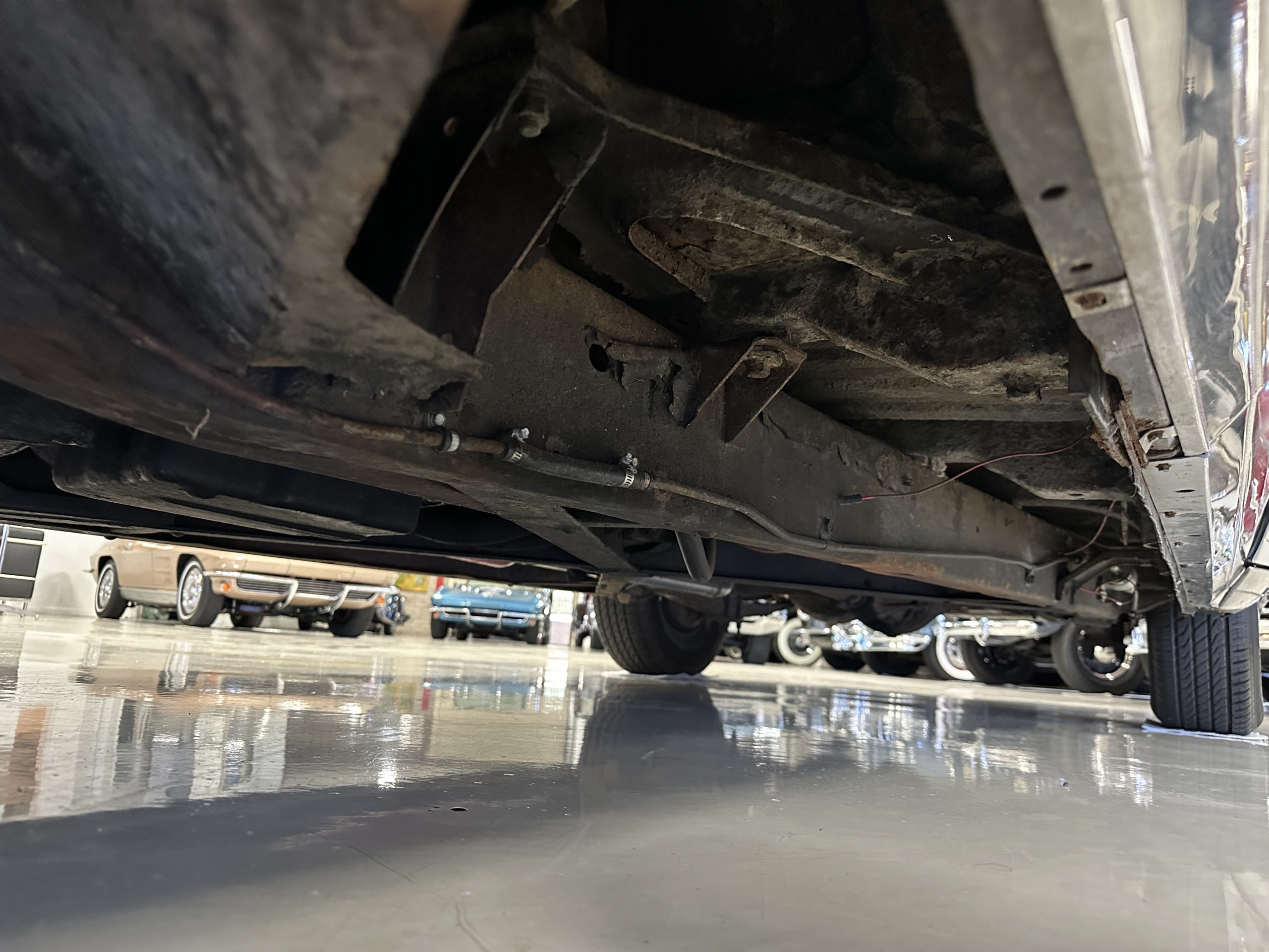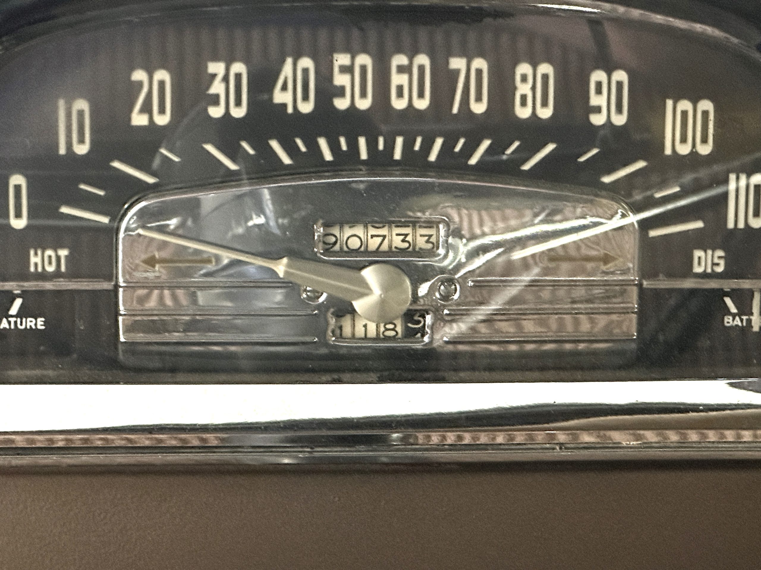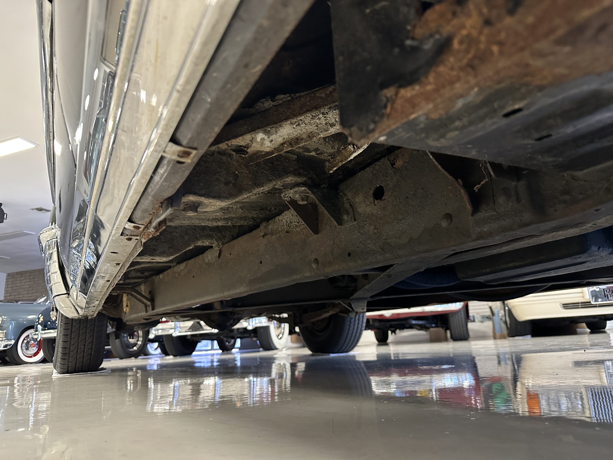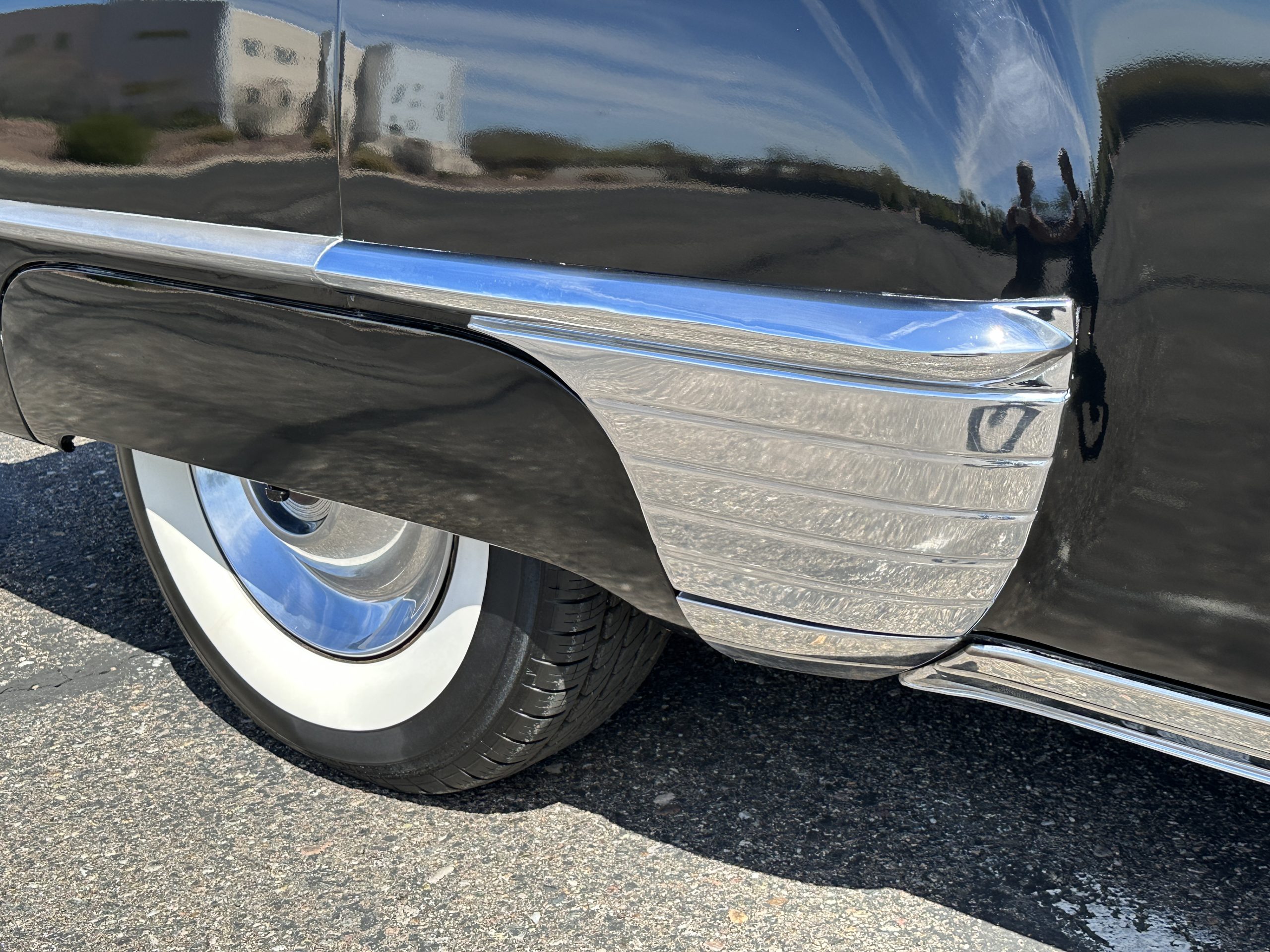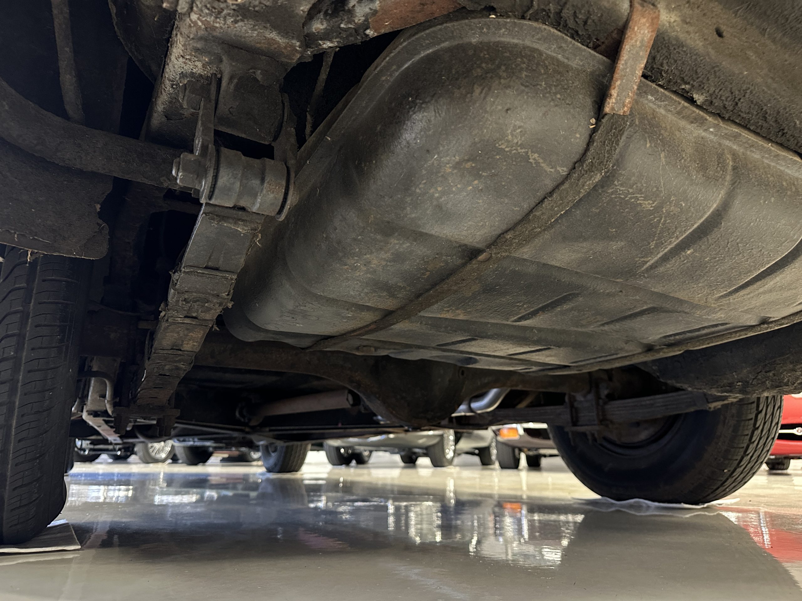 The livery is a rich Black (Paint Code 1) that is in touring condition having a very nice shine and luster. There are several paint imperfections, but she shows well overall. The body is very straight and appears to be rust free. The bumpers have been re-chromed and are in overall nice condition. The undercarriage is clean and rust-free but does show expected patina for her age and use. The trunk area is very clean and nicely detailed. Her hubcaps and wheels all show well. She has recently been fitted with Cooper white wall tires which really enhance the ride quality and they look sharp. The windows have all been tinted and the driver’s side windshield glass has a crack (but it is flat glass). The trunk latch has been replaced.