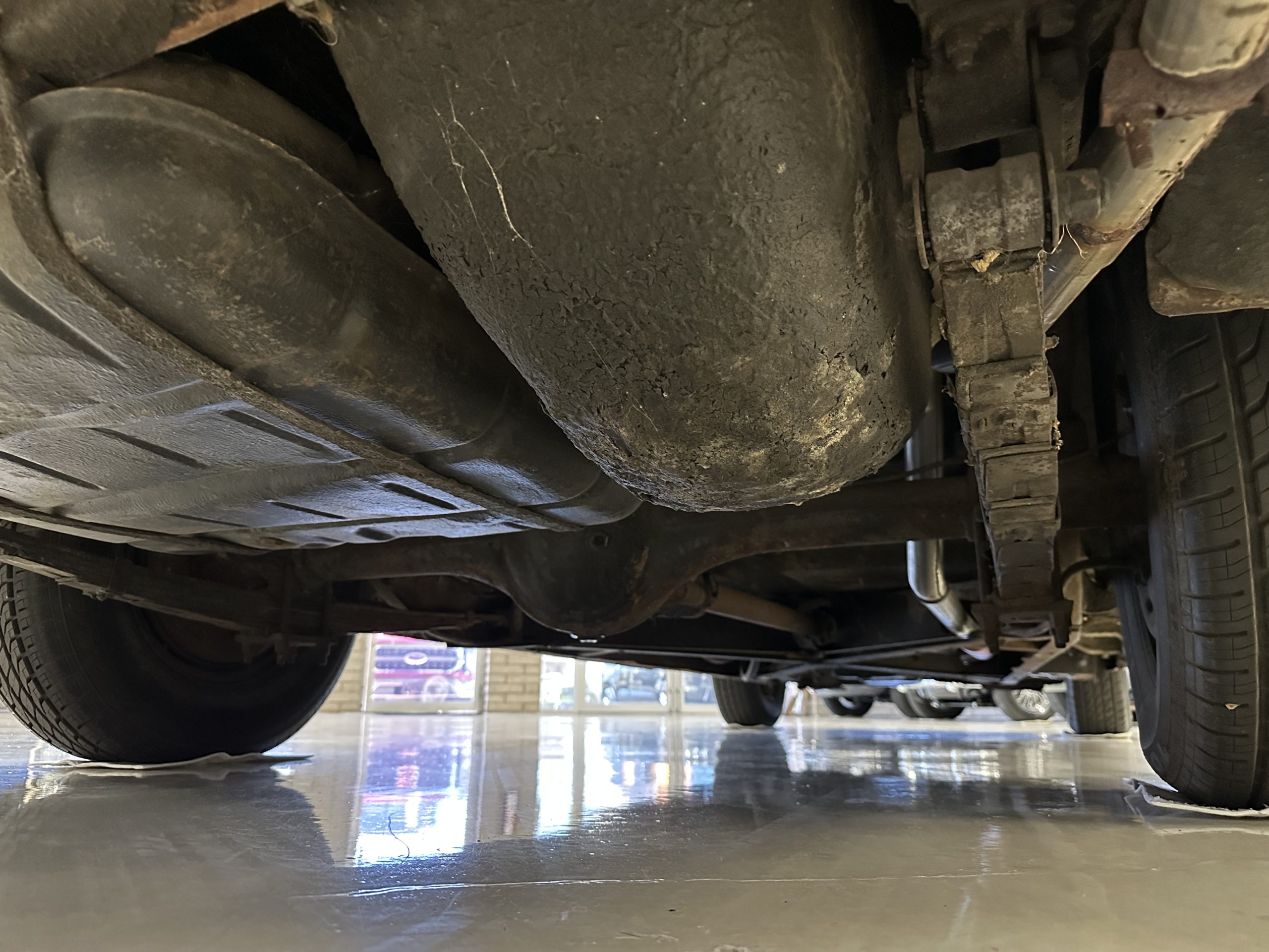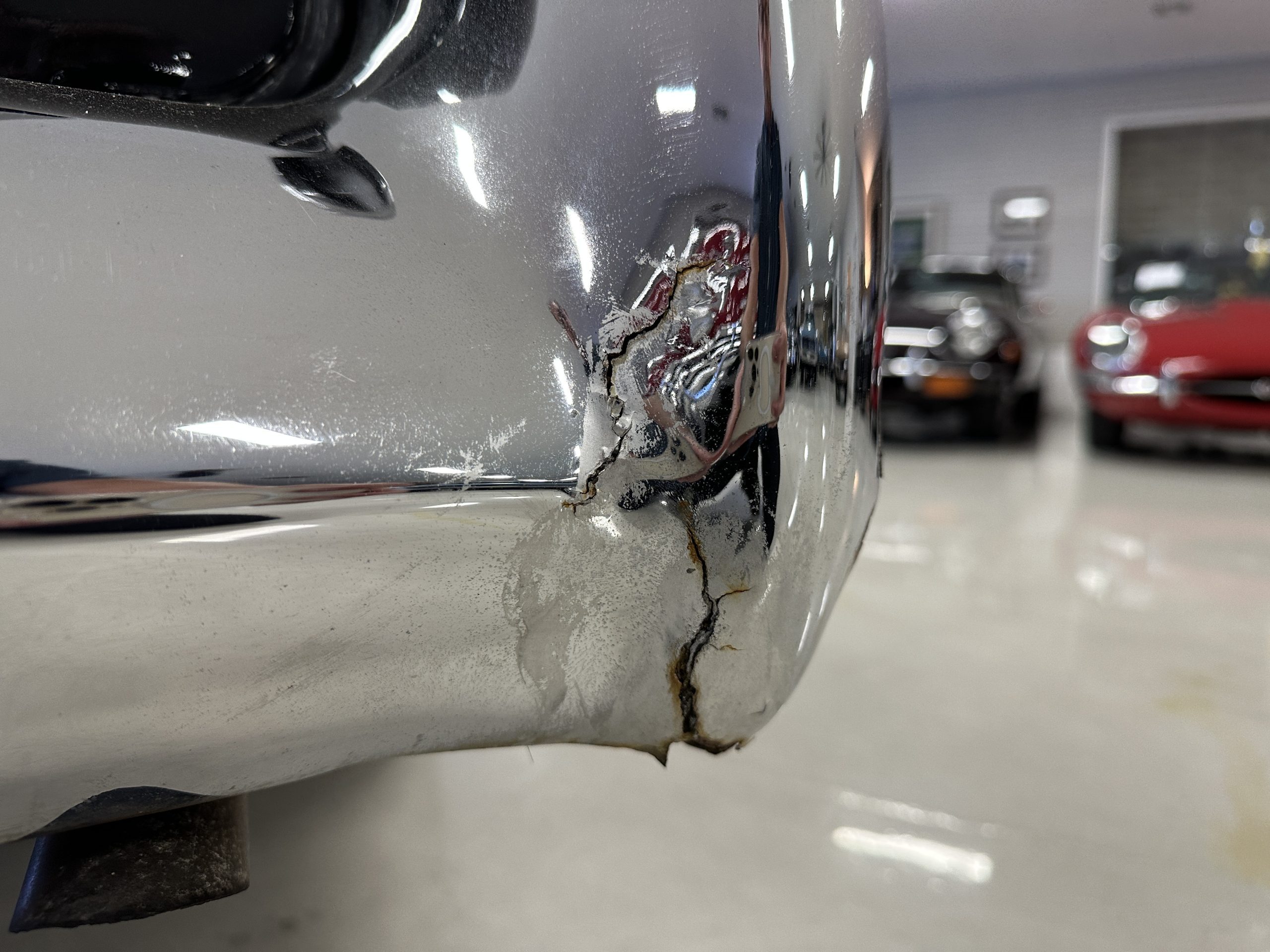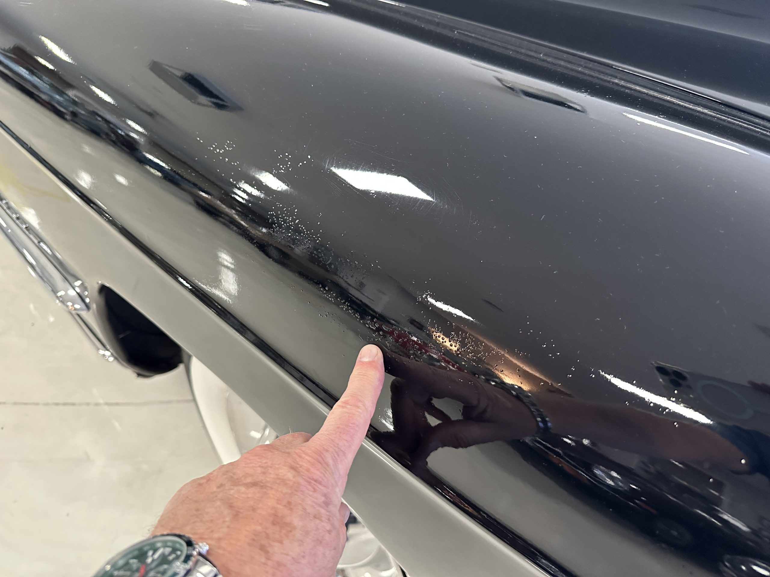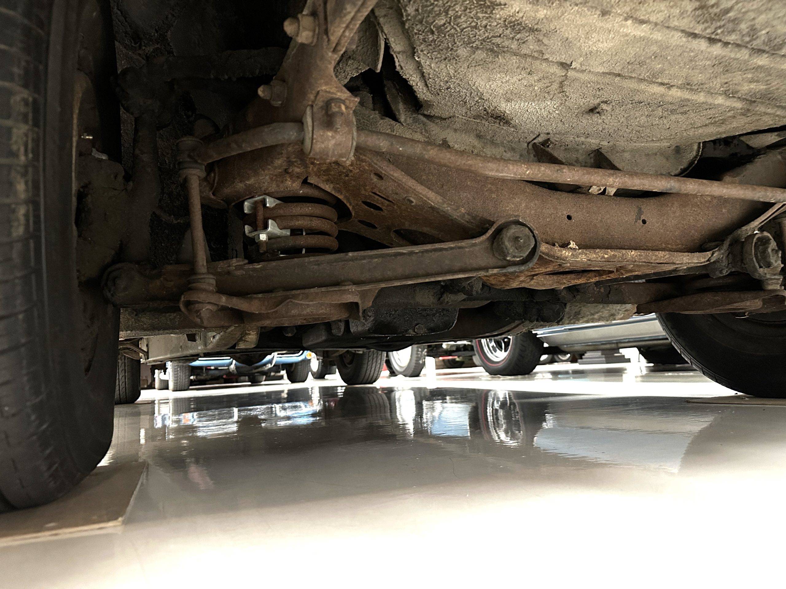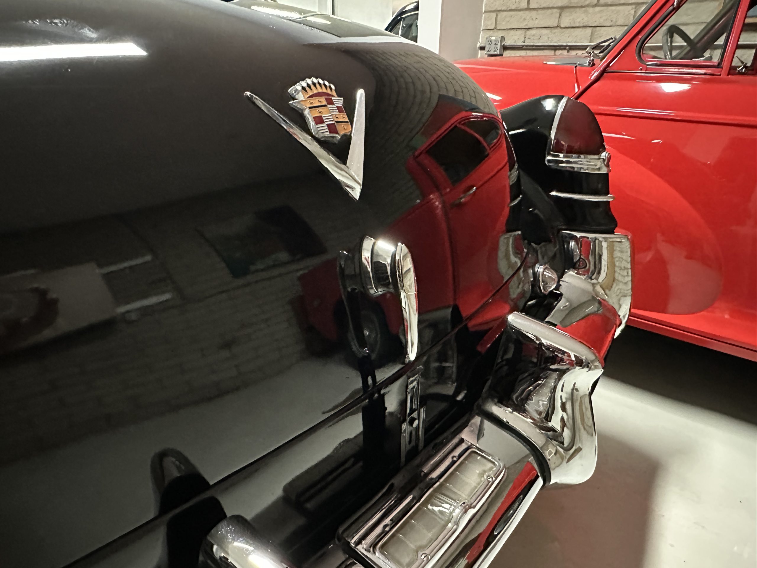 The livery is a rich Black (Paint Code 1) that is in touring condition having a very nice shine and luster. There are several paint imperfections, but she shows well overall. The body is very straight and appears to be rust free. The bumpers have been re-chromed and are in overall nice condition. The undercarriage is clean and rust-free but does show expected patina for her age and use. The trunk area is very clean and nicely detailed. Her hubcaps and wheels all show well. She has recently been fitted with Cooper white wall tires which really enhance the ride quality and they look sharp. The windows have all been tinted and the driver’s side windshield glass has a crack (but it is flat glass). The trunk latch has been replaced.