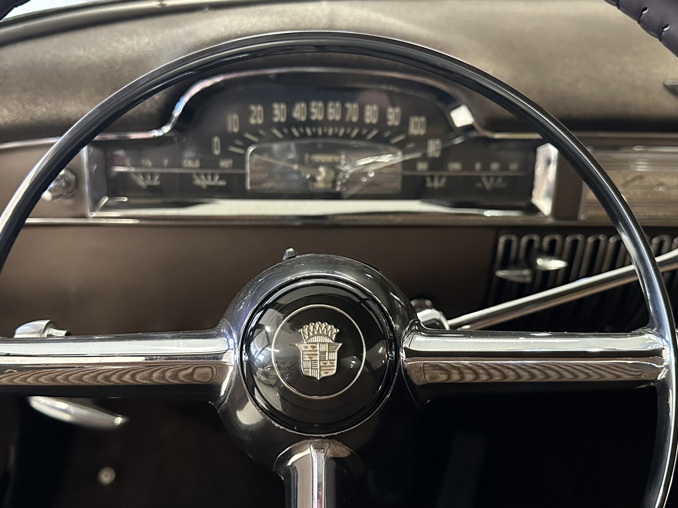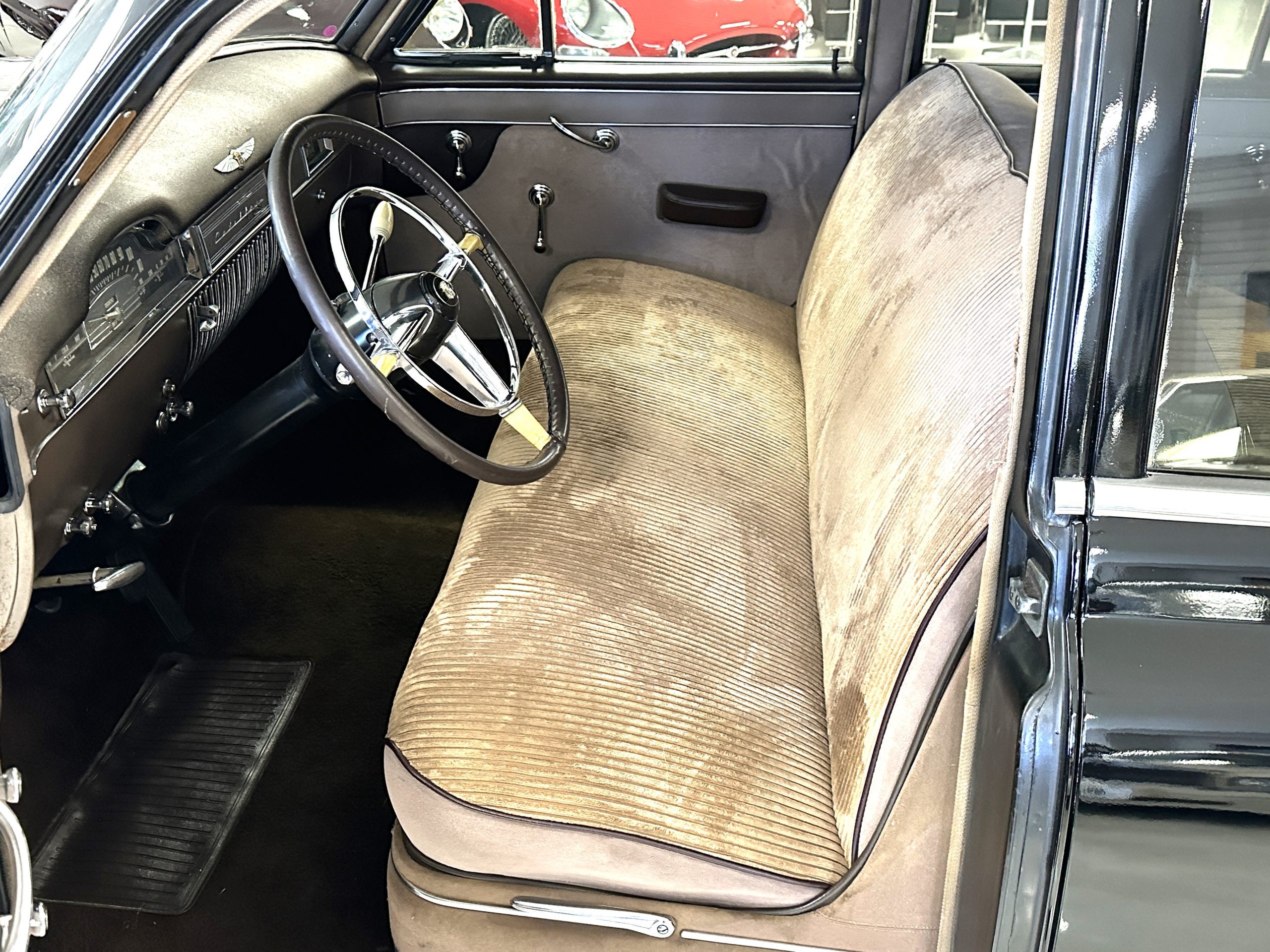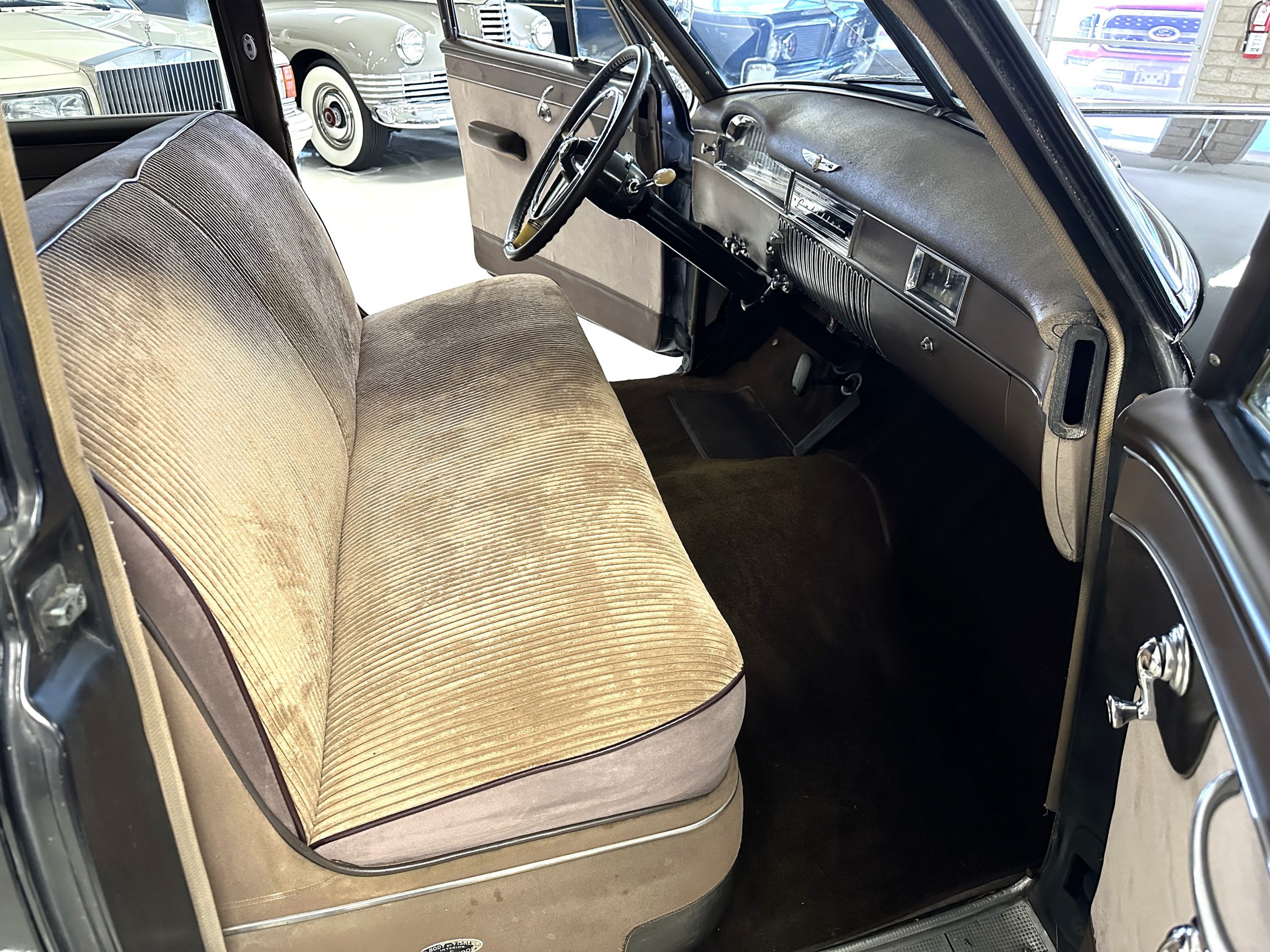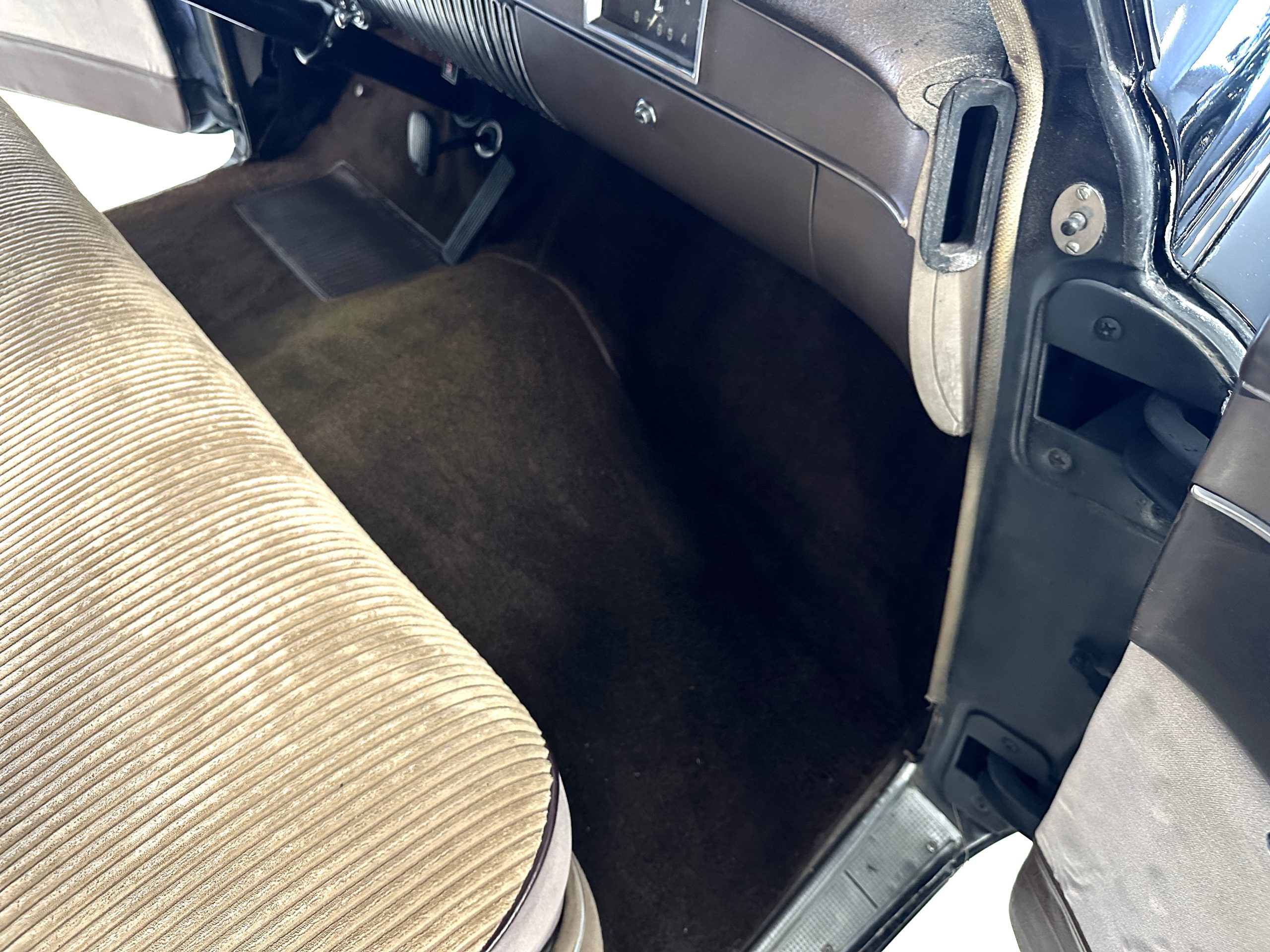 The Cadillac’s interior shows well throughout. The Tan Dual Cord and Tan Plain Broadcloth upholstery (Trim Code 38) was reupholstered several years ago and shows well with a few minor imperfections. The door panels have also been reupholstered. The headliner is original and shows very well. Her brown carpet is in nice condition and shows little wear. The original steering wheel is leather-covered, and the leather is in nice condition. Most of the control knobs are original and correct. The chrome on the dashboard is in great condition and the instruments are functioning. The clock is not functioning.