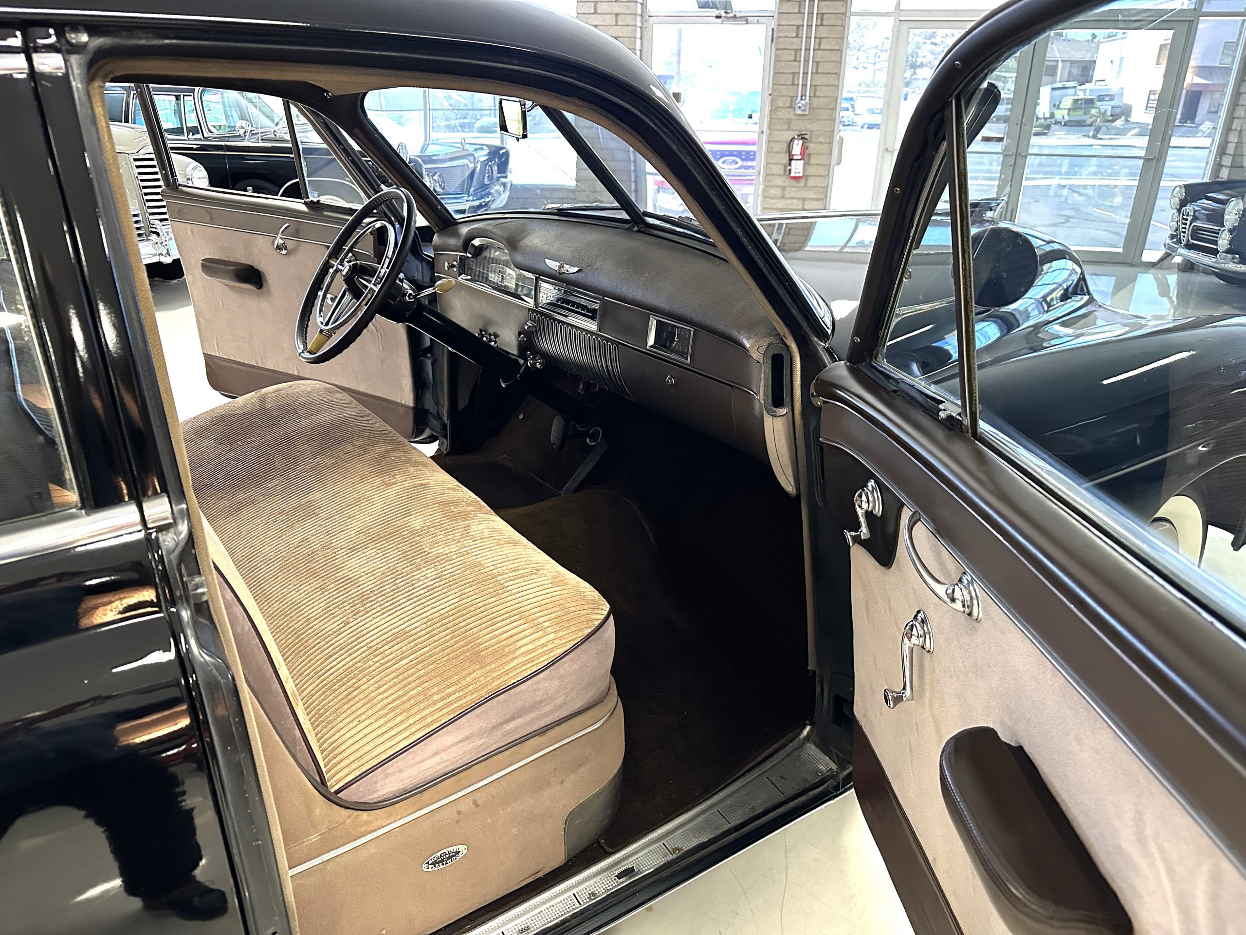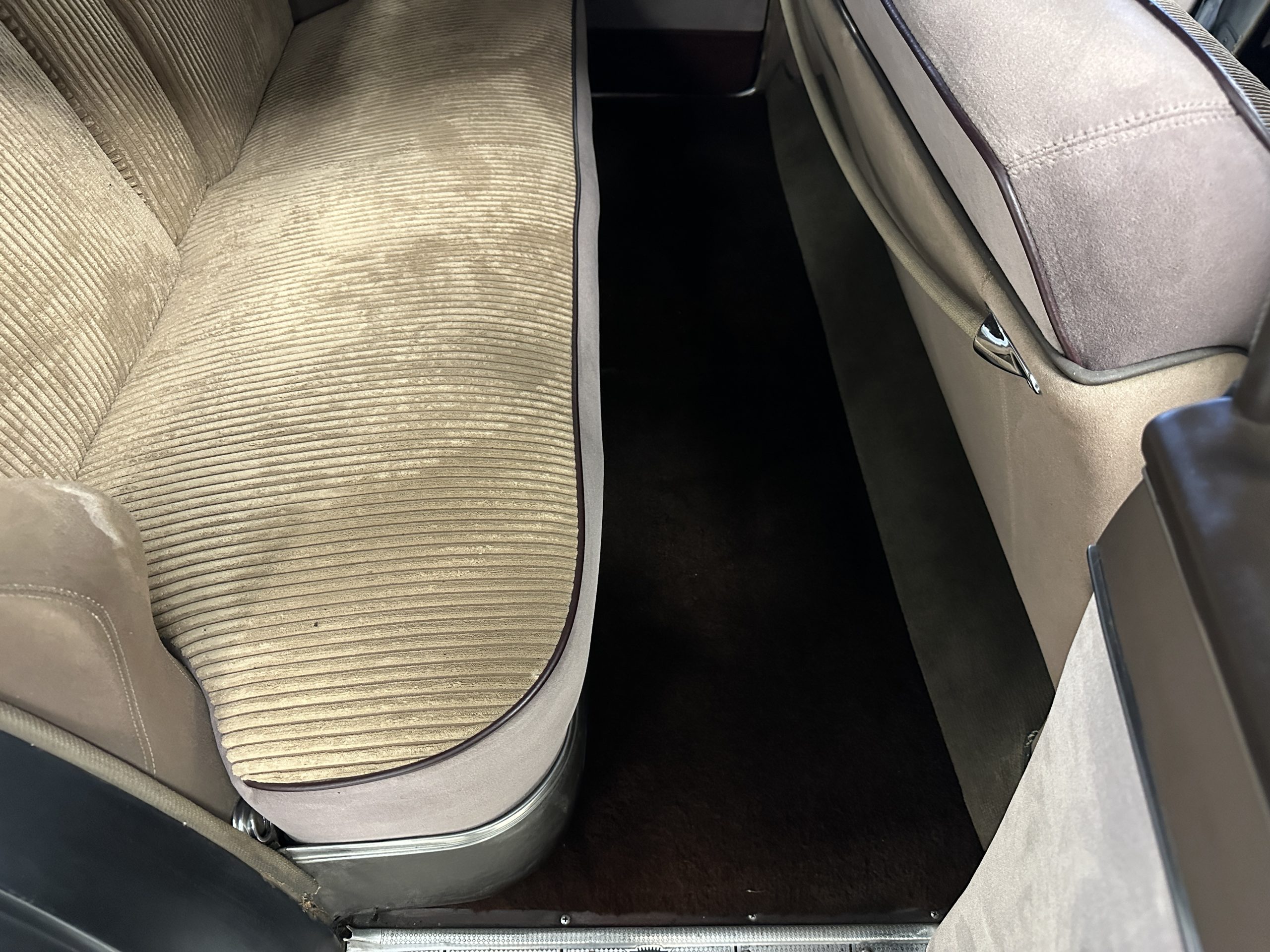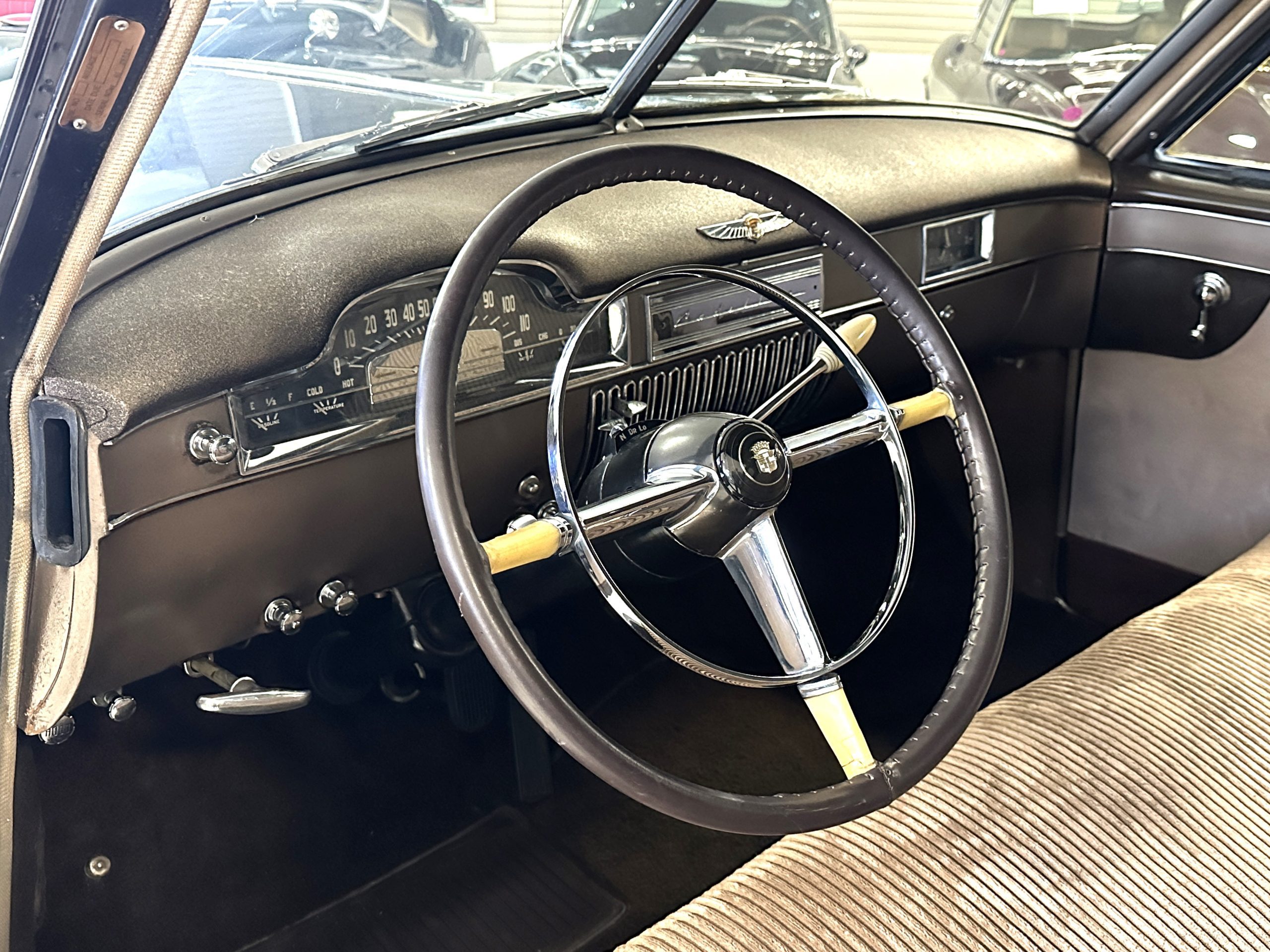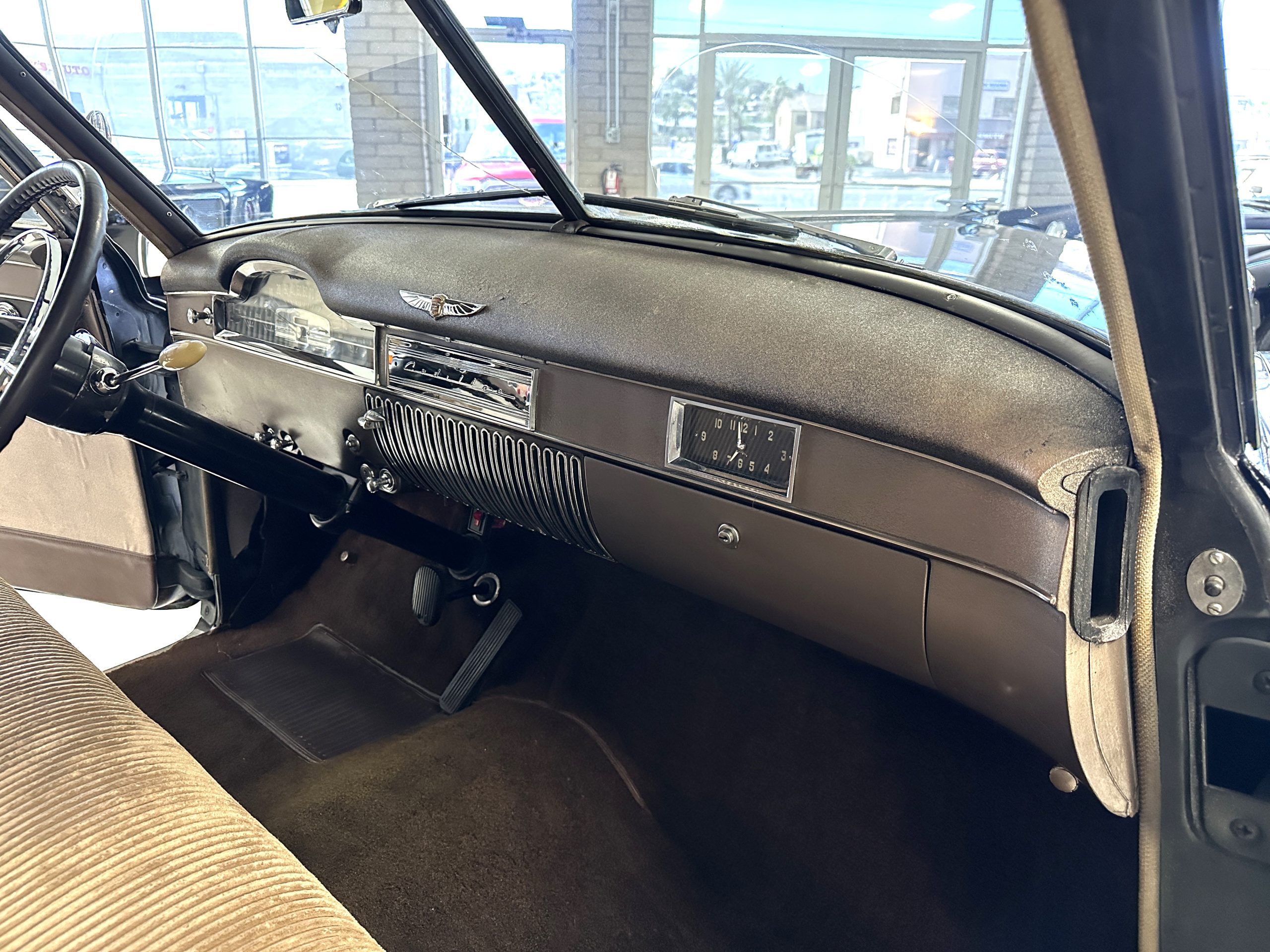 The Cadillac’s interior shows well throughout. The Tan Dual Cord and Tan Plain Broadcloth upholstery (Trim Code 38) was reupholstered several years ago and shows well with a few minor imperfections. The door panels have also been reupholstered. The headliner is original and shows very well. Her brown carpet is in nice condition and shows little wear. The original steering wheel is leather-covered, and the leather is in nice condition. Most of the control knobs are original and correct. The chrome on the dashboard is in great condition and the instruments are functioning. The clock is not functioning.
