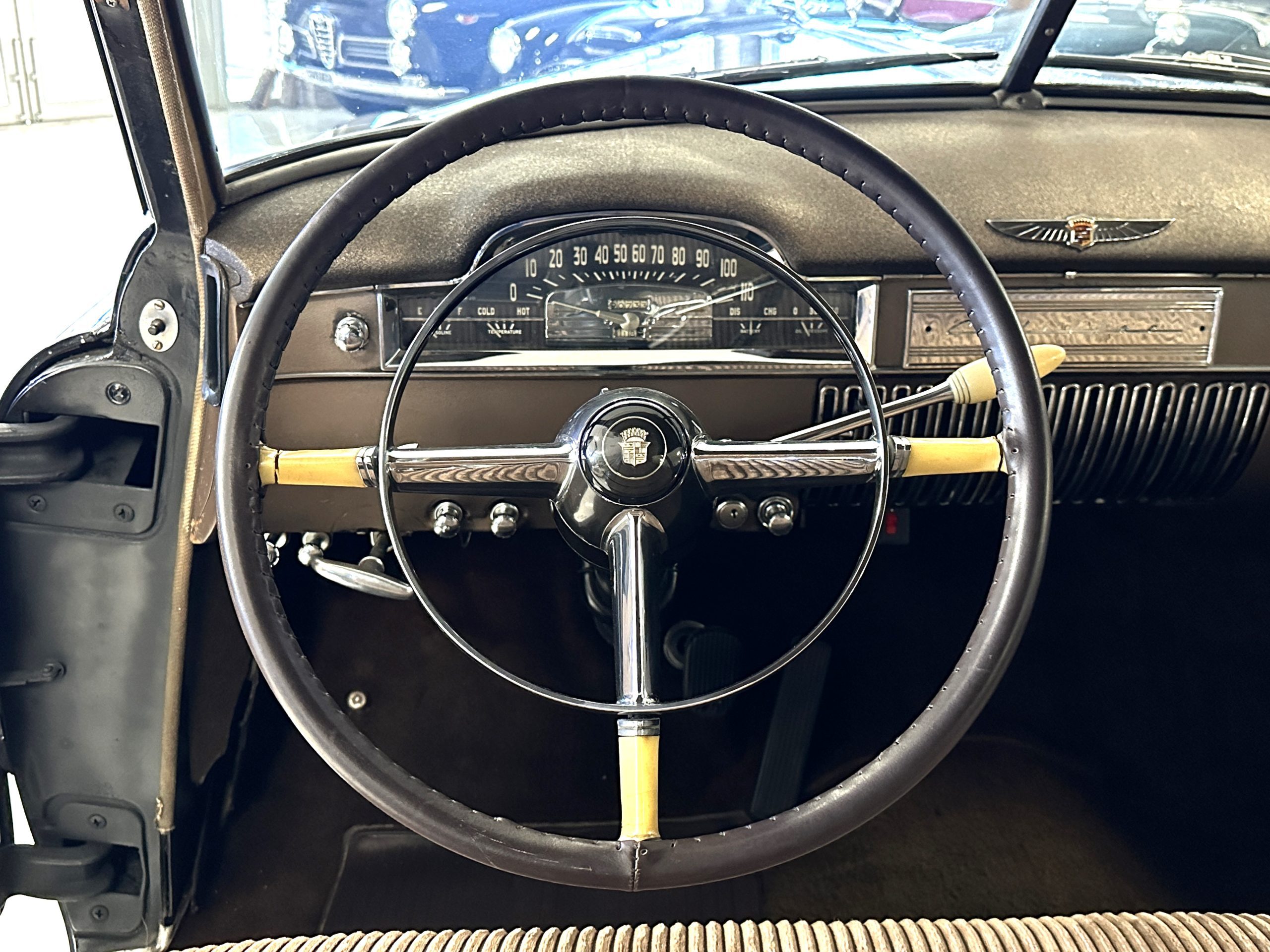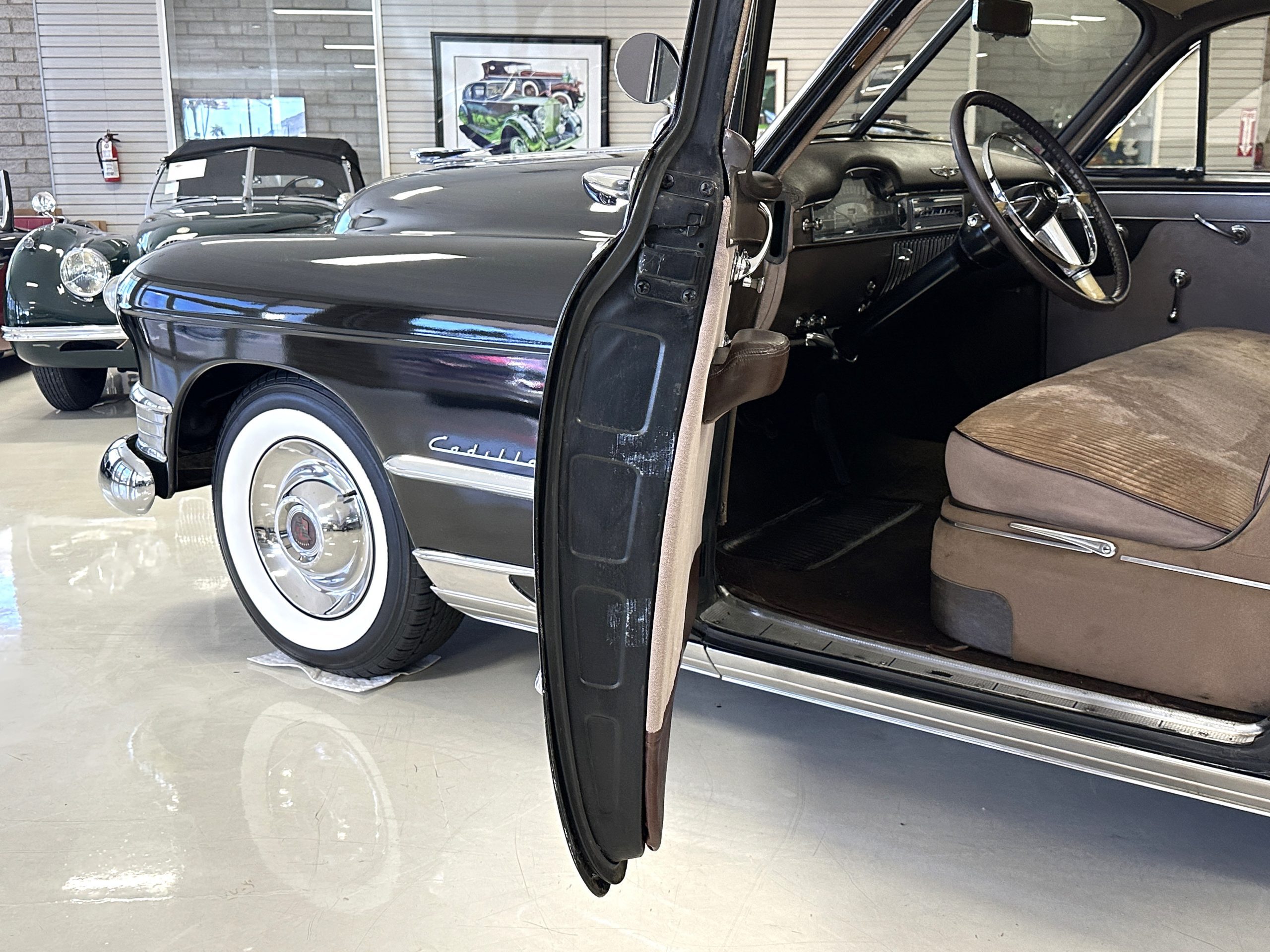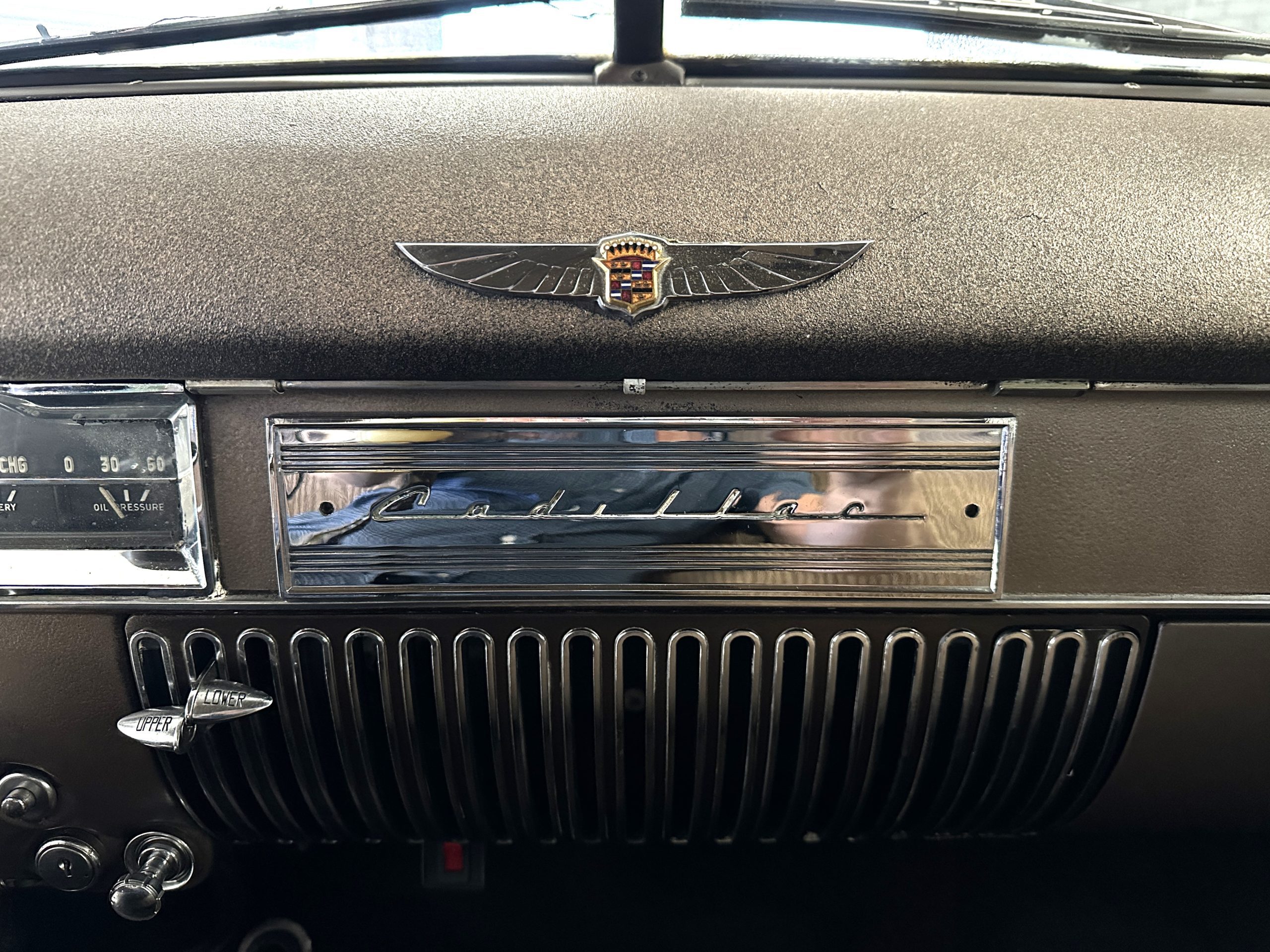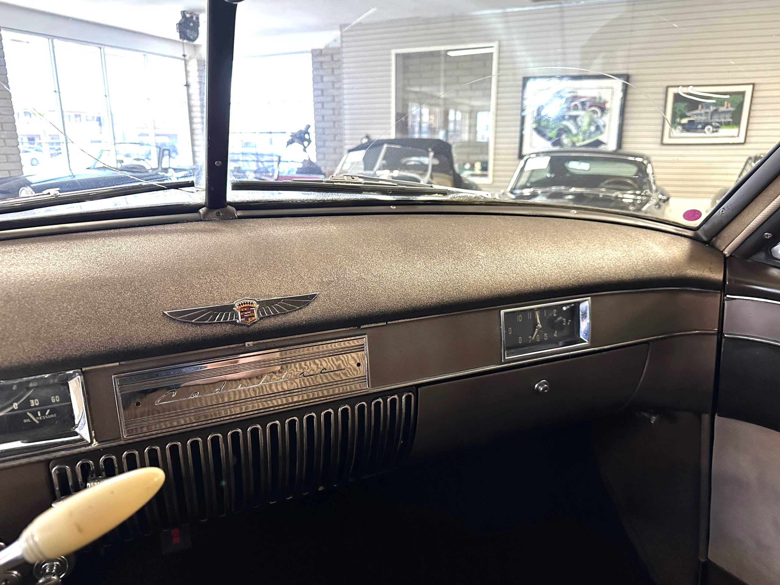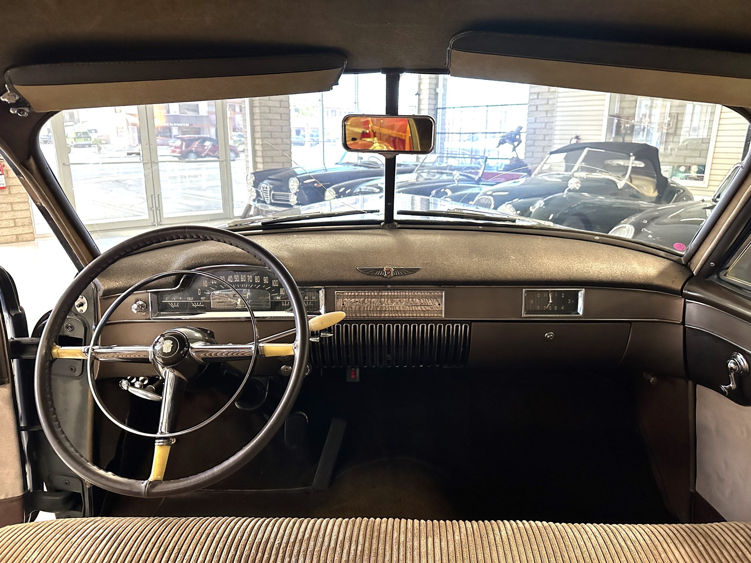 The Cadillac’s interior shows well throughout. The Tan Dual Cord and Tan Plain Broadcloth upholstery (Trim Code 38) was reupholstered several years ago and shows well with a few minor imperfections. The door panels have also been reupholstered. The headliner is original and shows very well. Her brown carpet is in nice condition and shows little wear. The original steering wheel is leather-covered, and the leather is in nice condition. Most of the control knobs are original and correct. The chrome on the dashboard is in great condition and the instruments are functioning. The clock is not functioning.