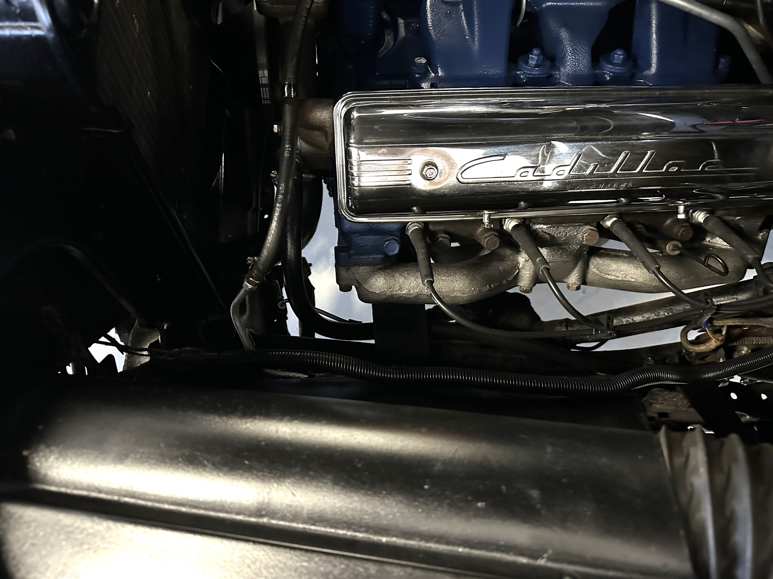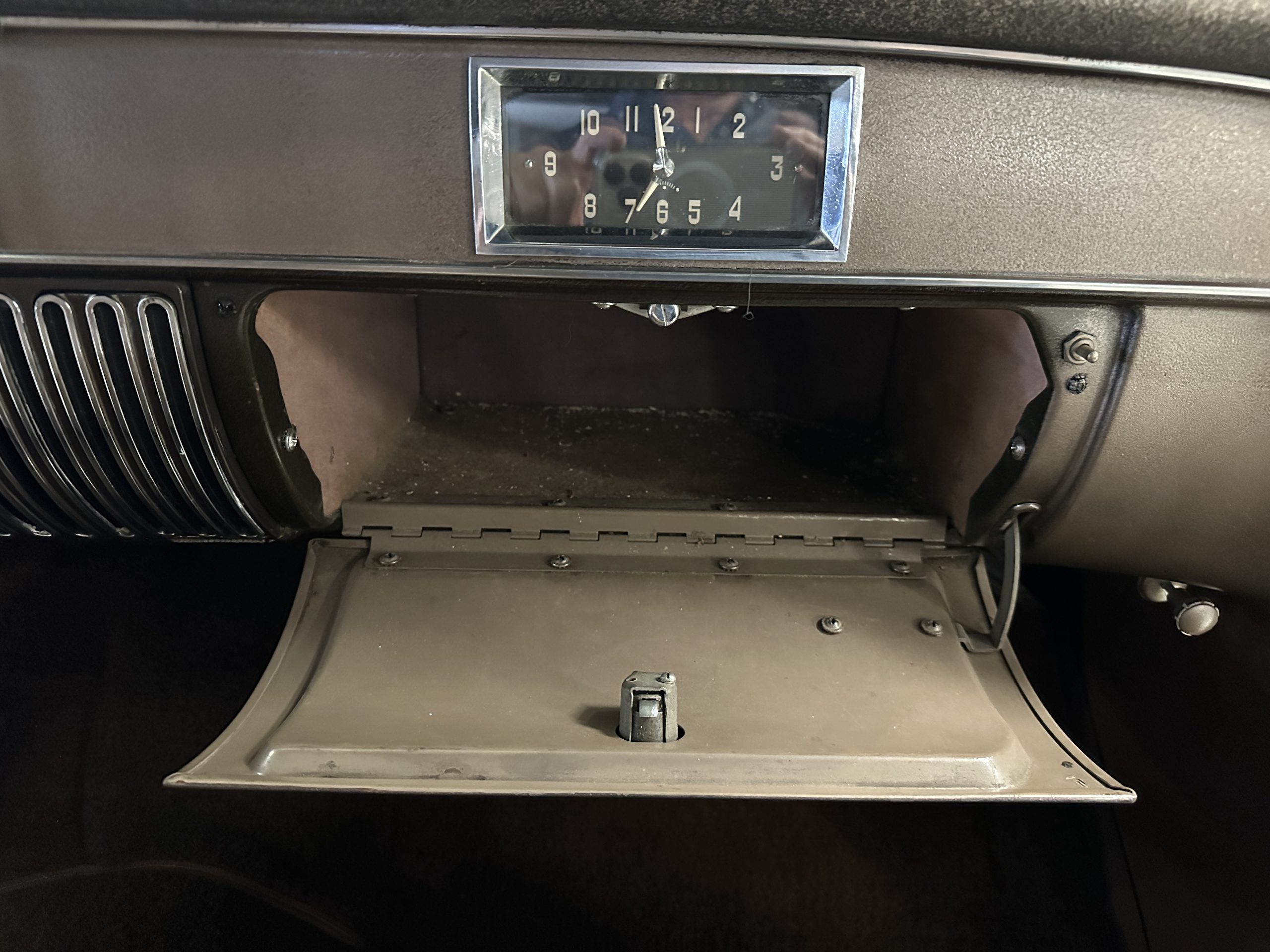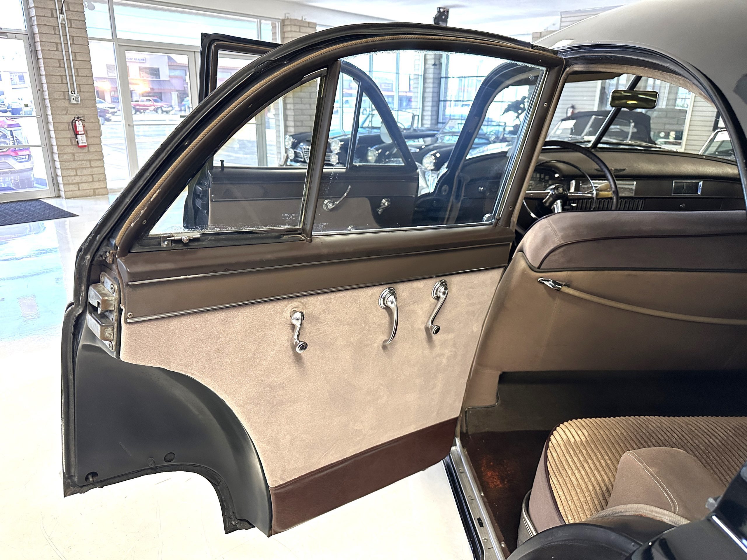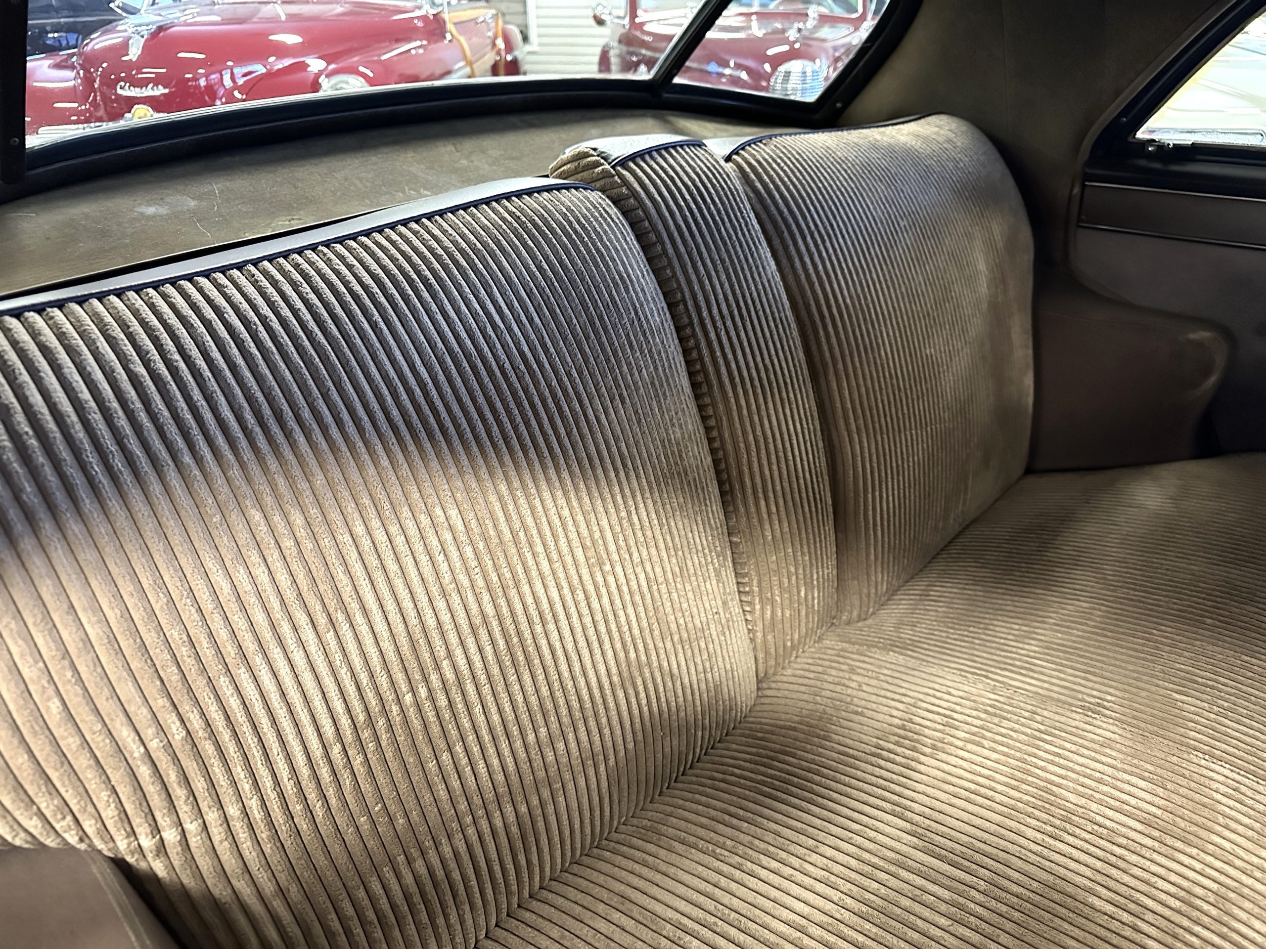 The Cadillac’s interior shows well throughout. The Tan Dual Cord and Tan Plain Broadcloth upholstery (Trim Code 38) was reupholstered several years ago and shows well with a few minor imperfections. The door panels have also been reupholstered. The headliner is original and shows very well. Her brown carpet is in nice condition and shows little wear. The original steering wheel is leather-covered, and the leather is in nice condition. Most of the control knobs are original and correct. The chrome on the dashboard is in great condition and the instruments are functioning. The clock is not functioning.