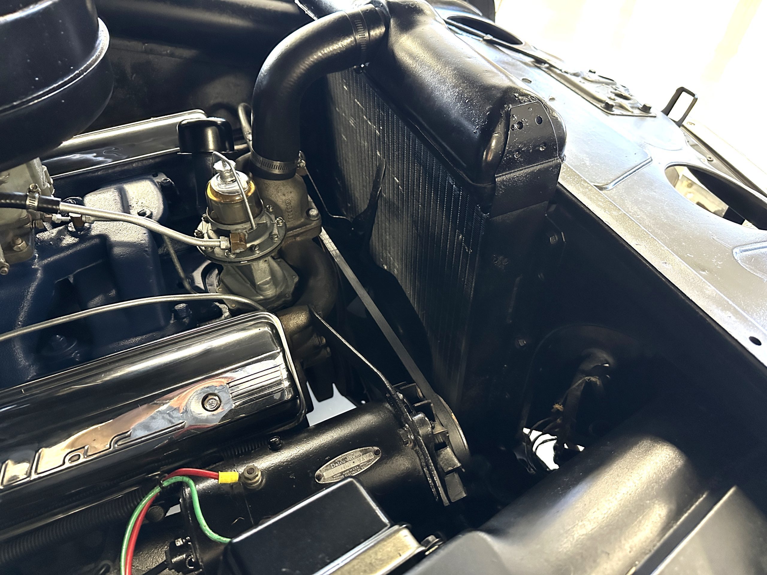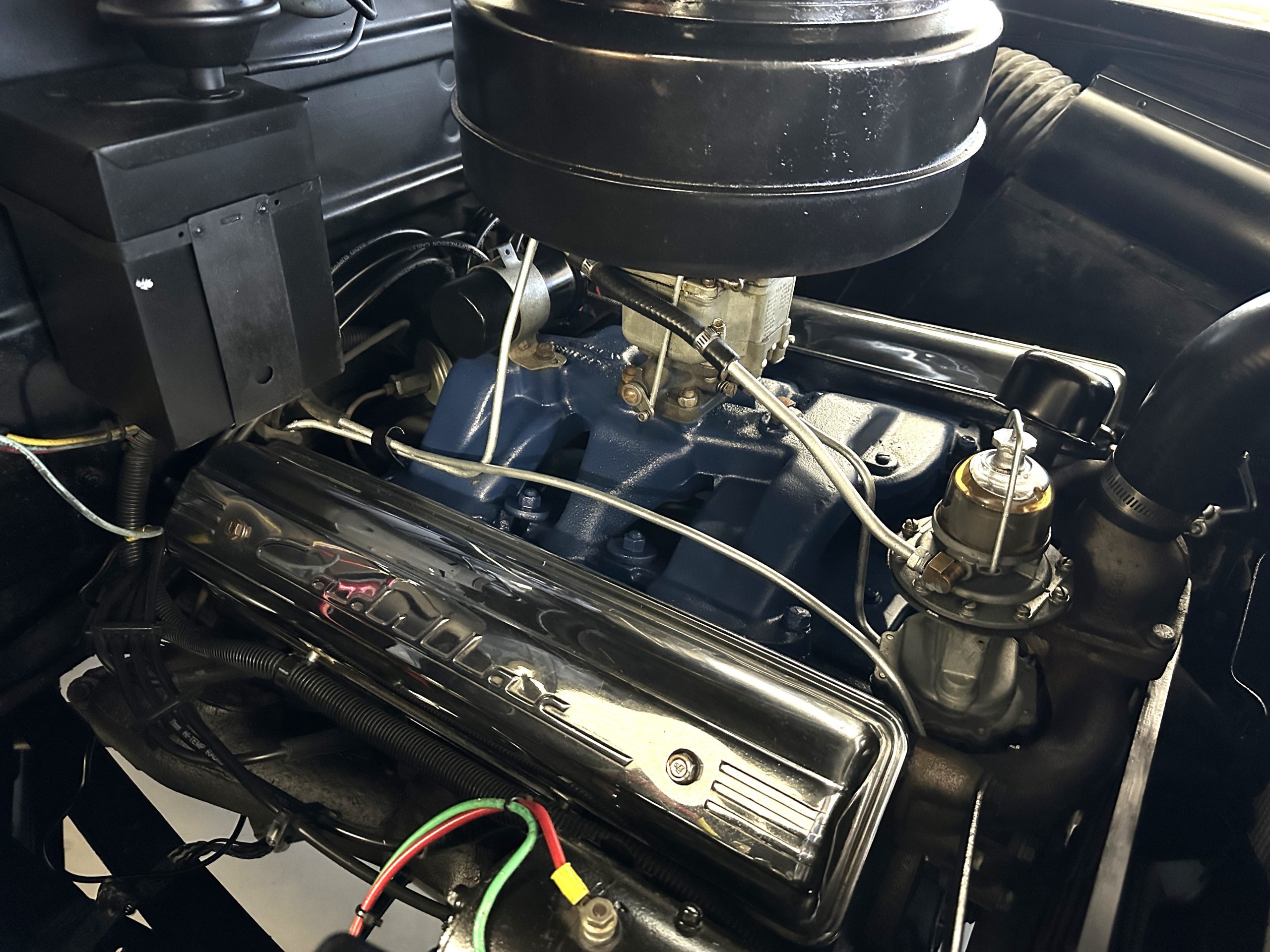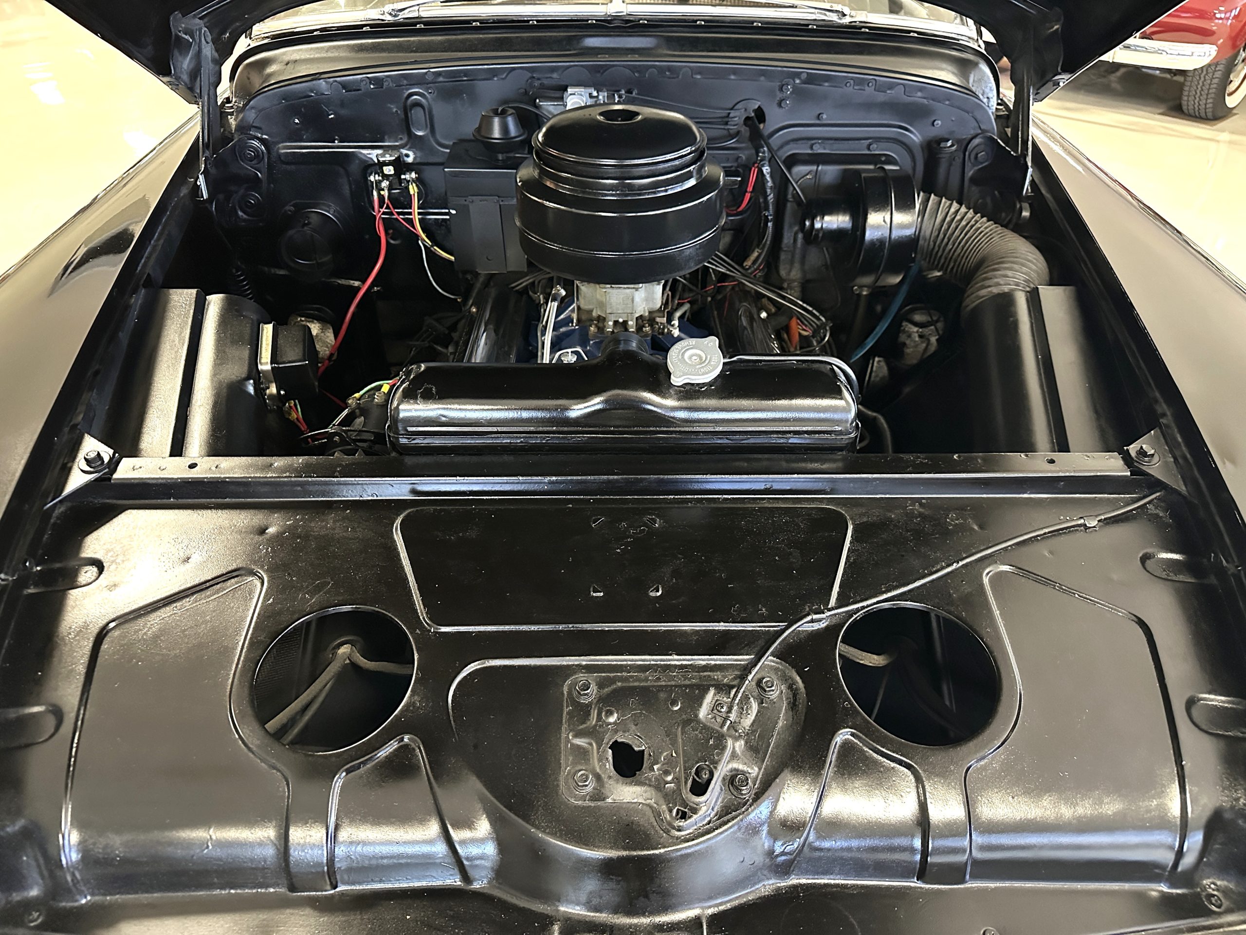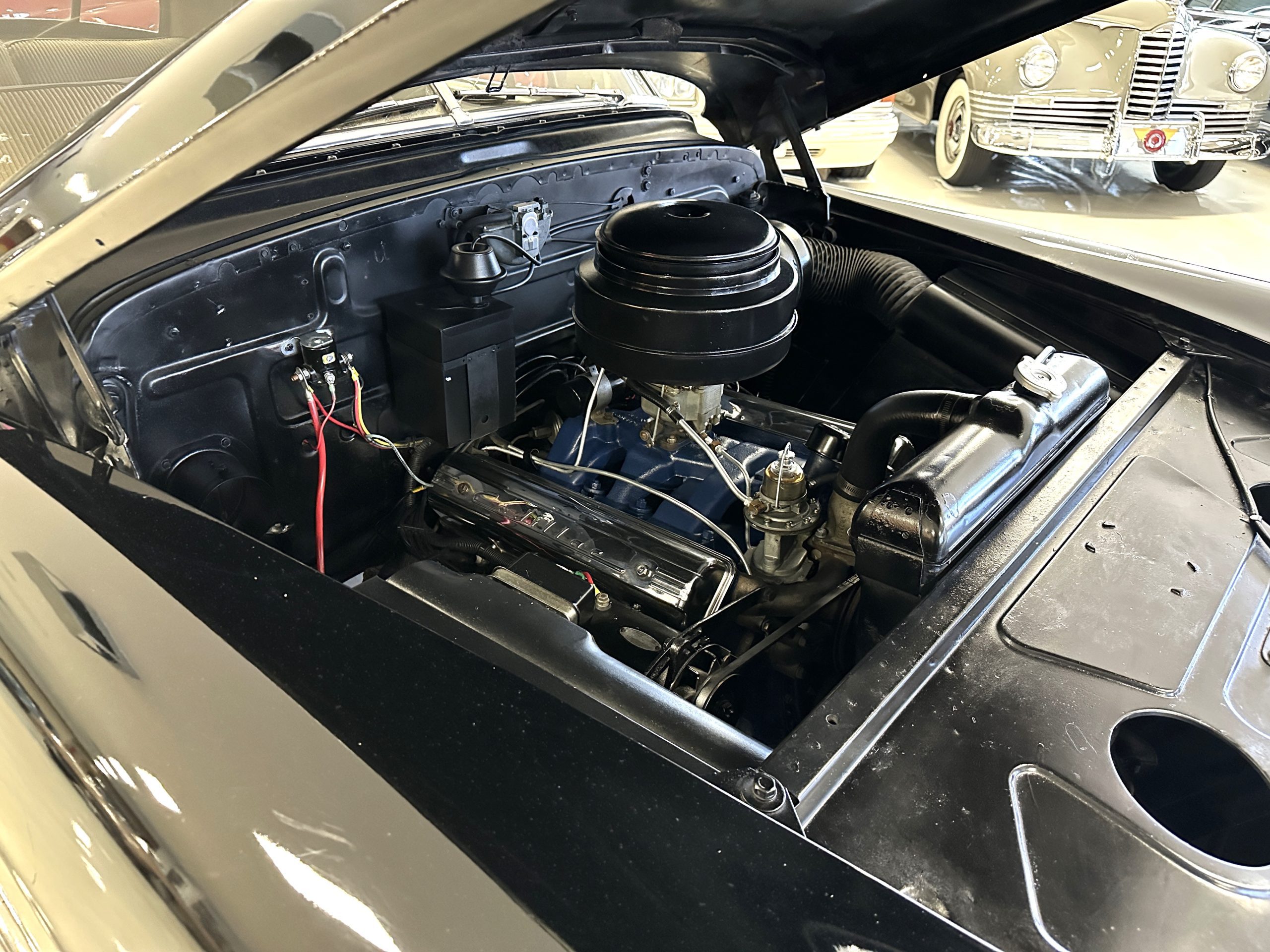 The engine compartment is very clean and nicely detailed and painted throughout. Her 331 cid Overhead Valve V-8 runs well and produces 160 hp. The power is transferred to the rear wheels through her 4-speed Hydramatic Automatic Transmission which shifts well and performs quietly.