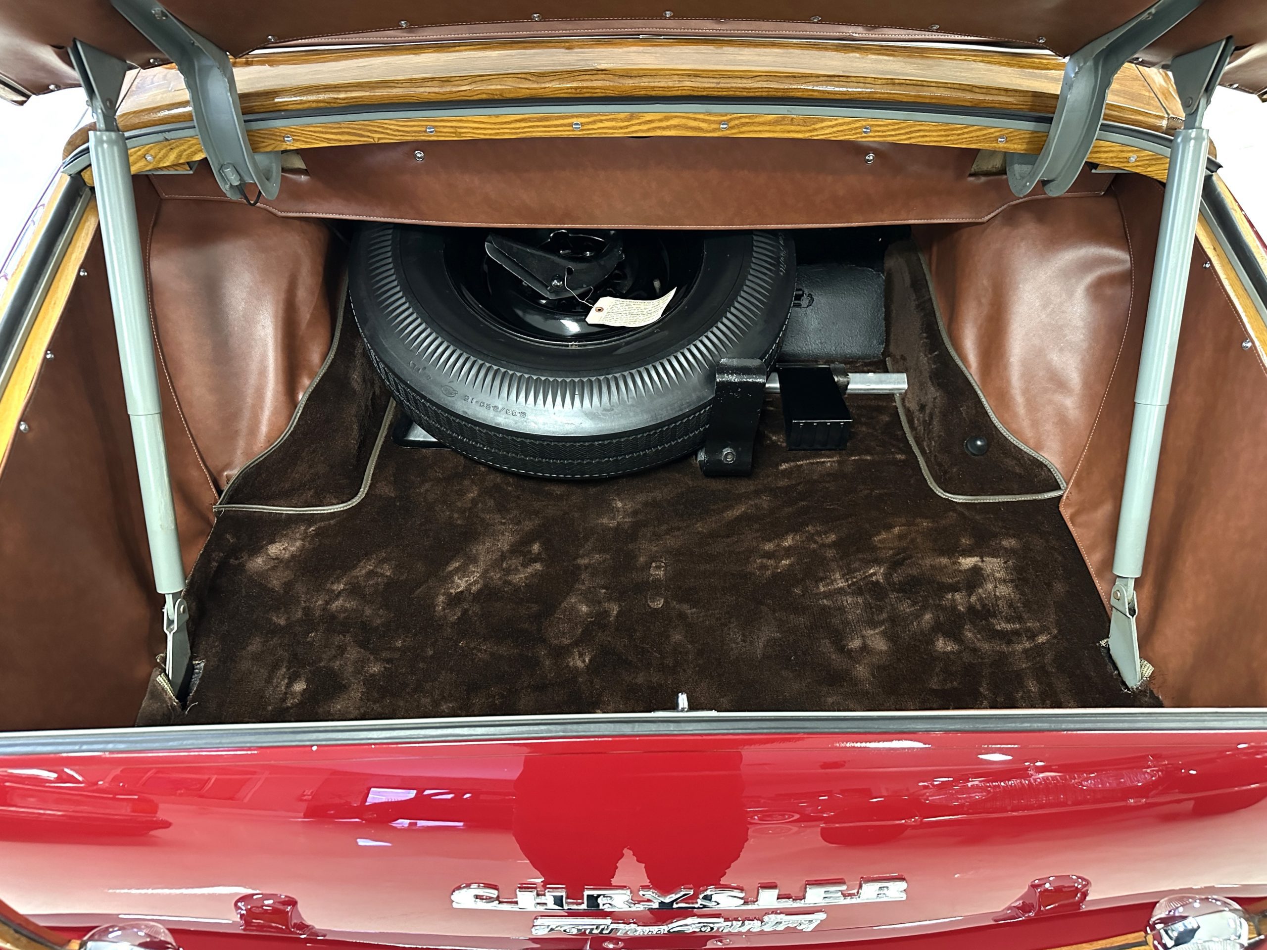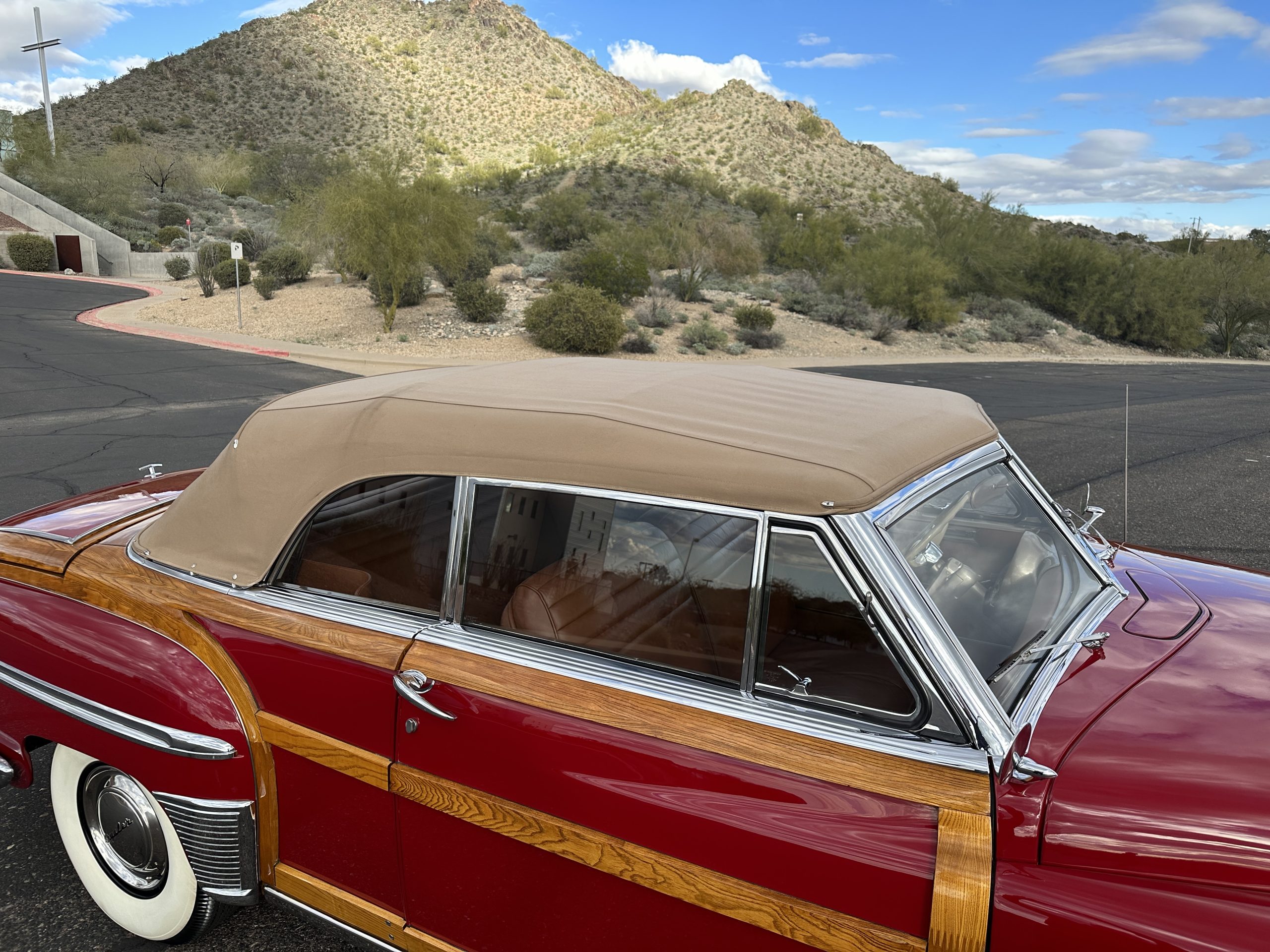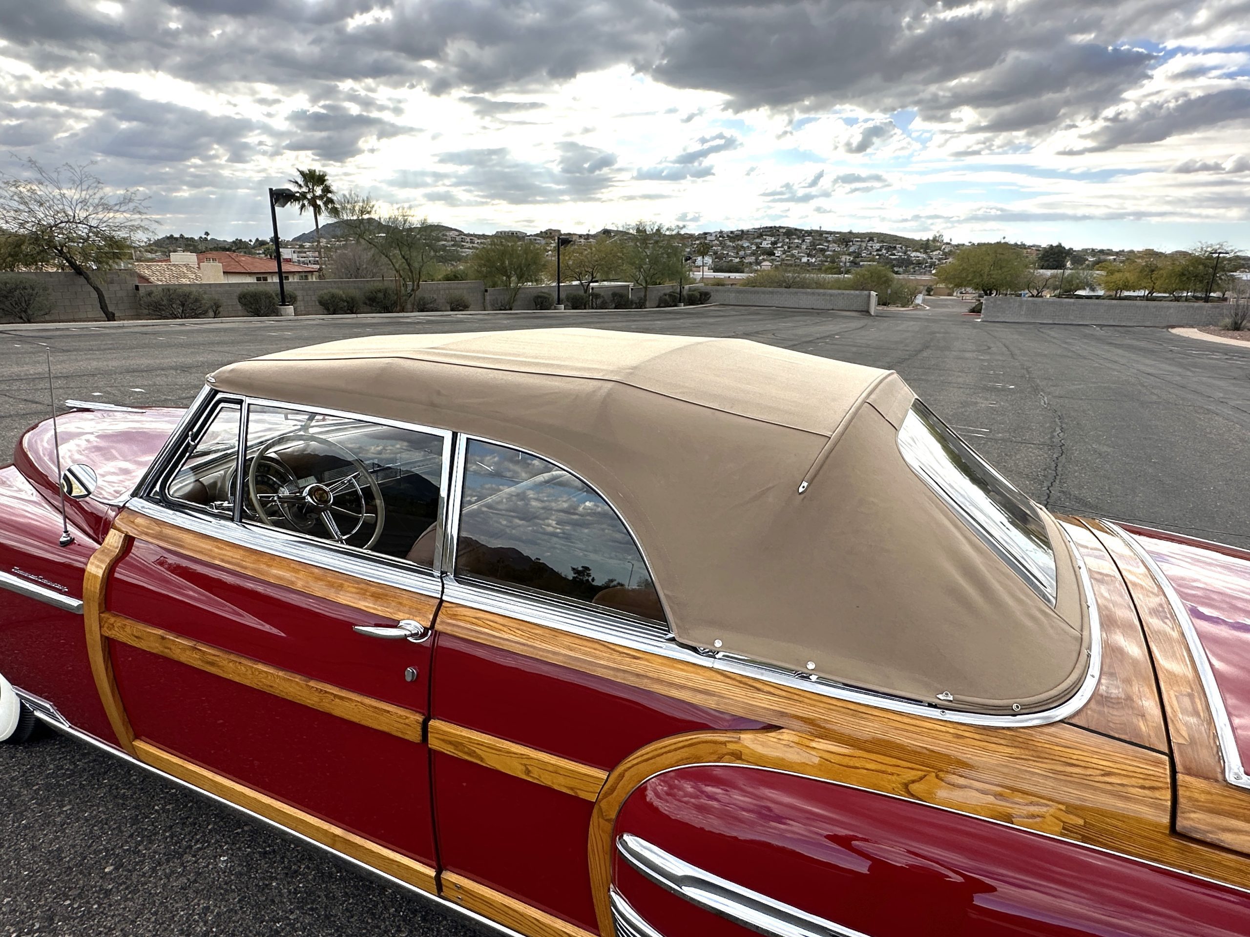 The exterior of this Chrysler is stunning. The Town and Country livery is the very rare Chrysler Pepper Red. This example is one of the only examples produced in Pepper Red, which makes her very desirable to collectors. Her paint and blonde ash framing on the exterior panels glisten and are in beautiful condition. All her finishes, including the chrome, are still in show quality condition. The tan canvas power convertible top is in excellent condition and shows very well. The power convertible top functions very well and her brown vinyl top boot is in excellent condition. Overall, the exterior is in excellent show condition.