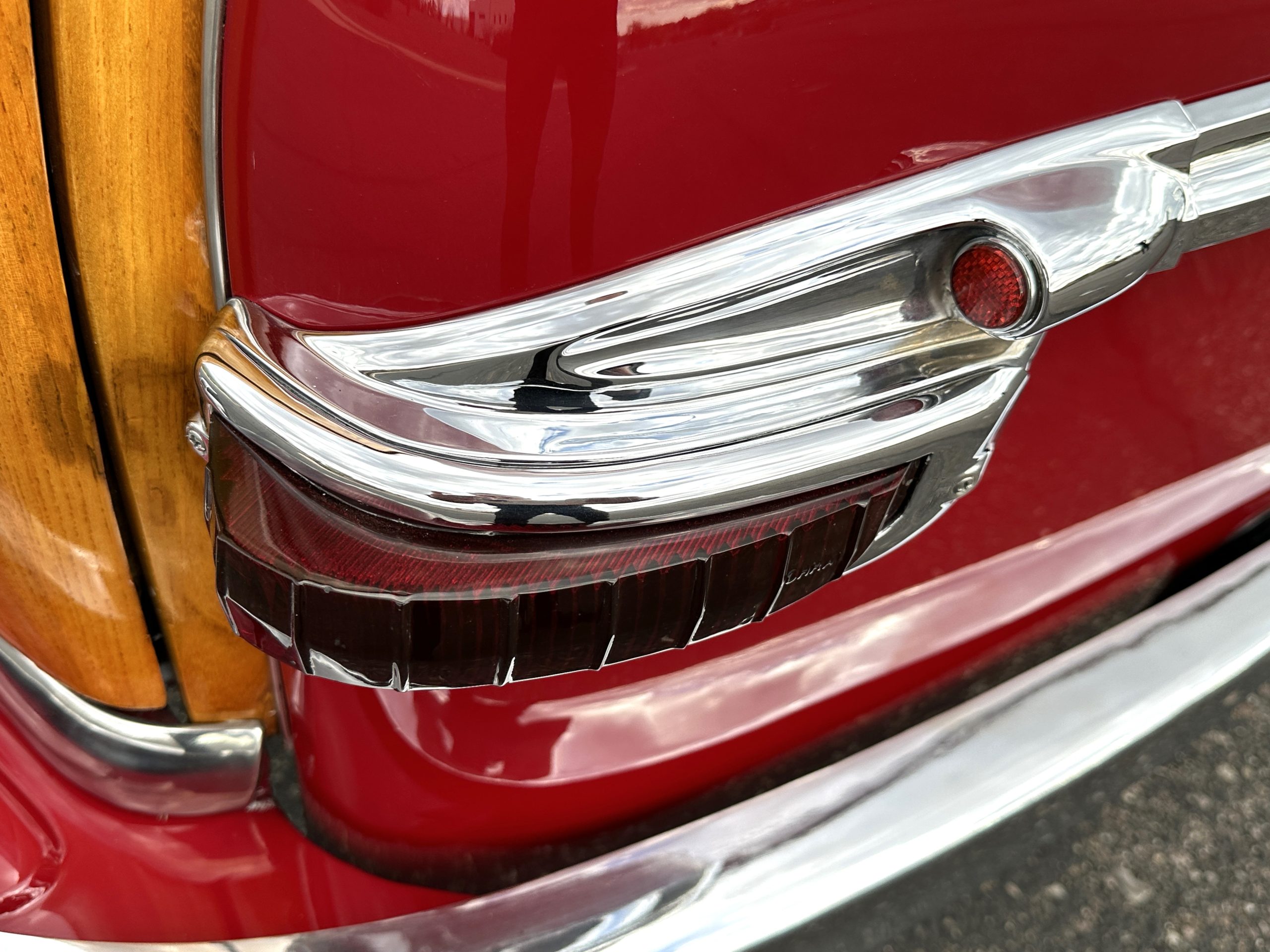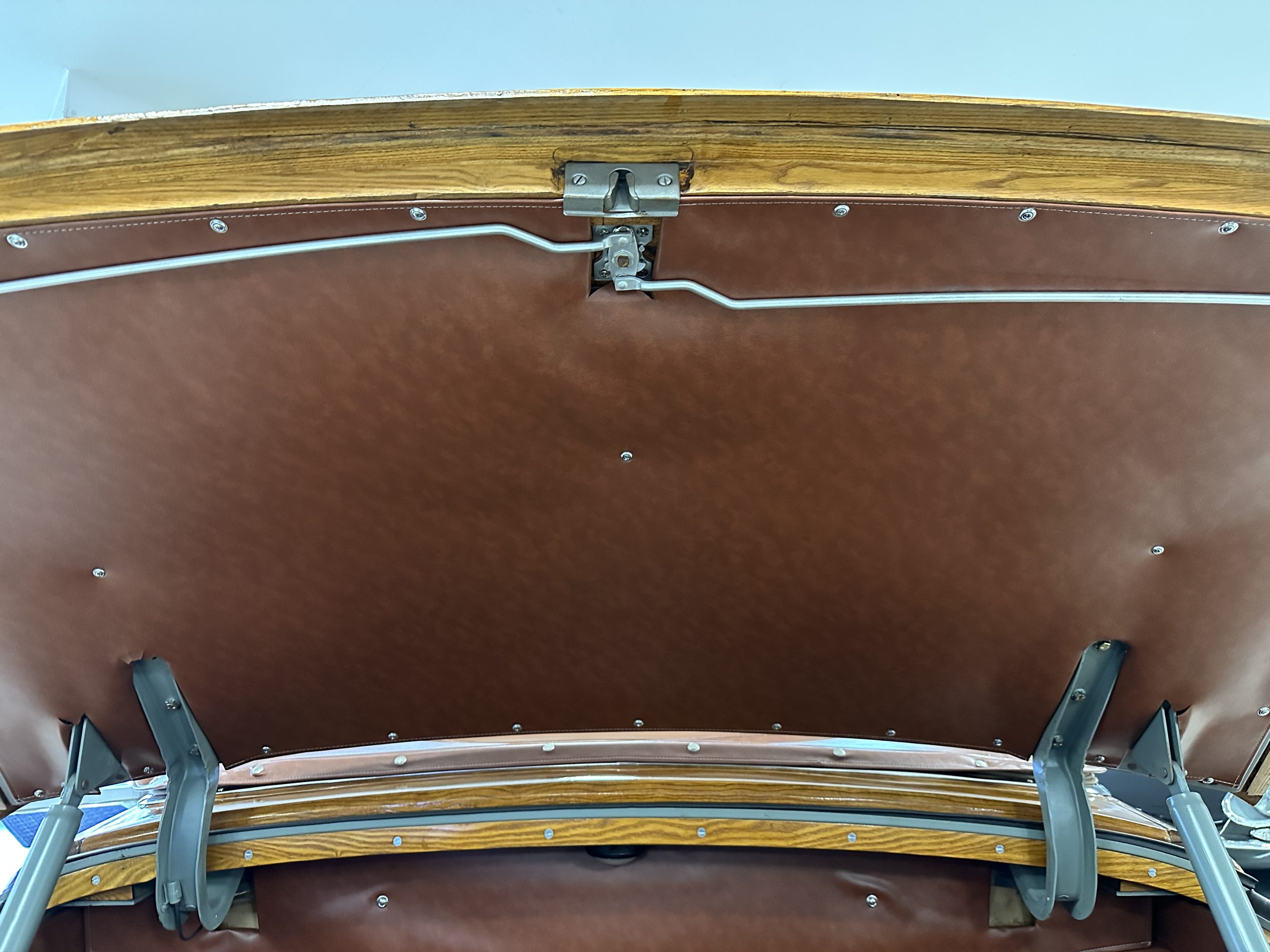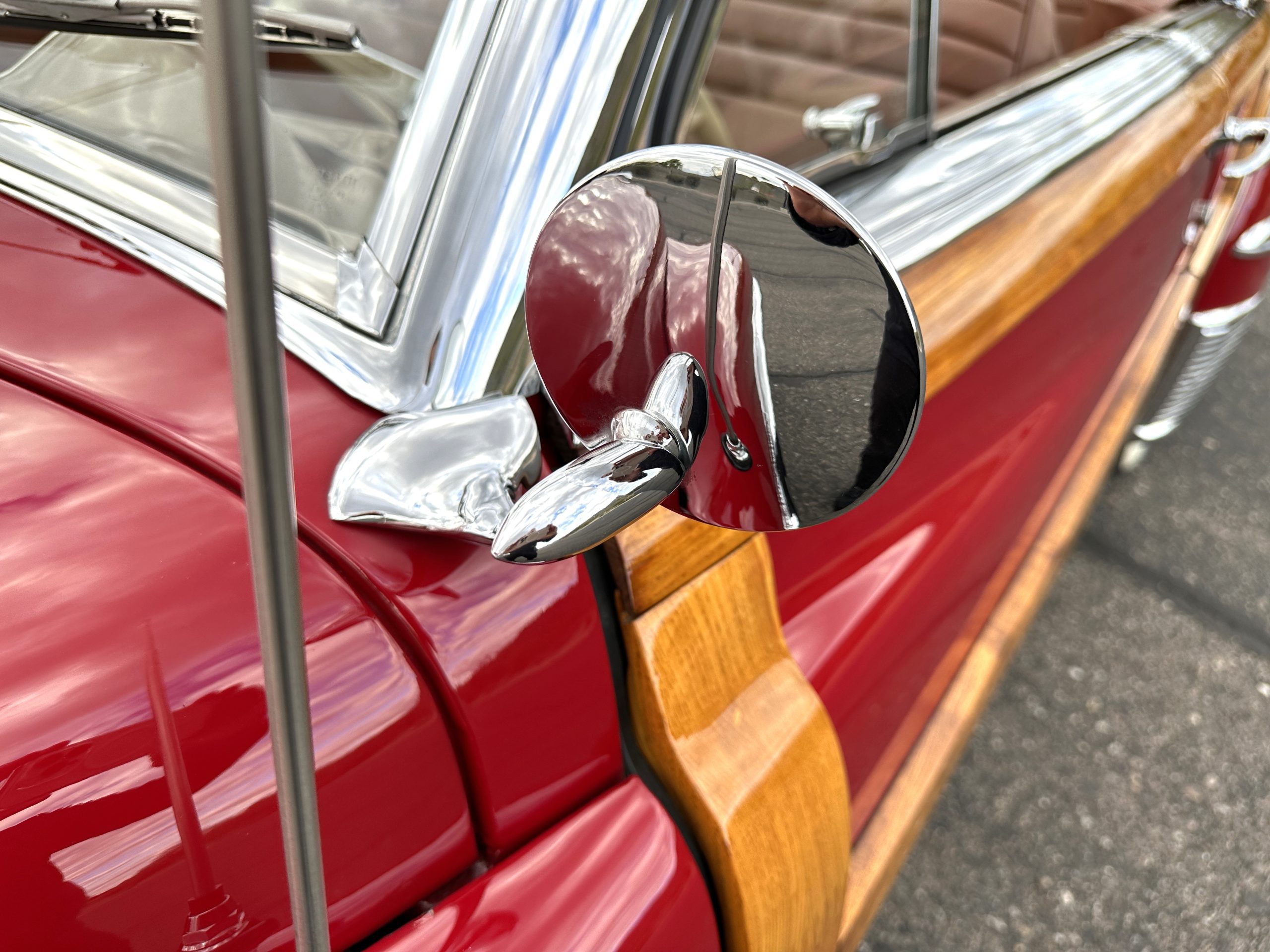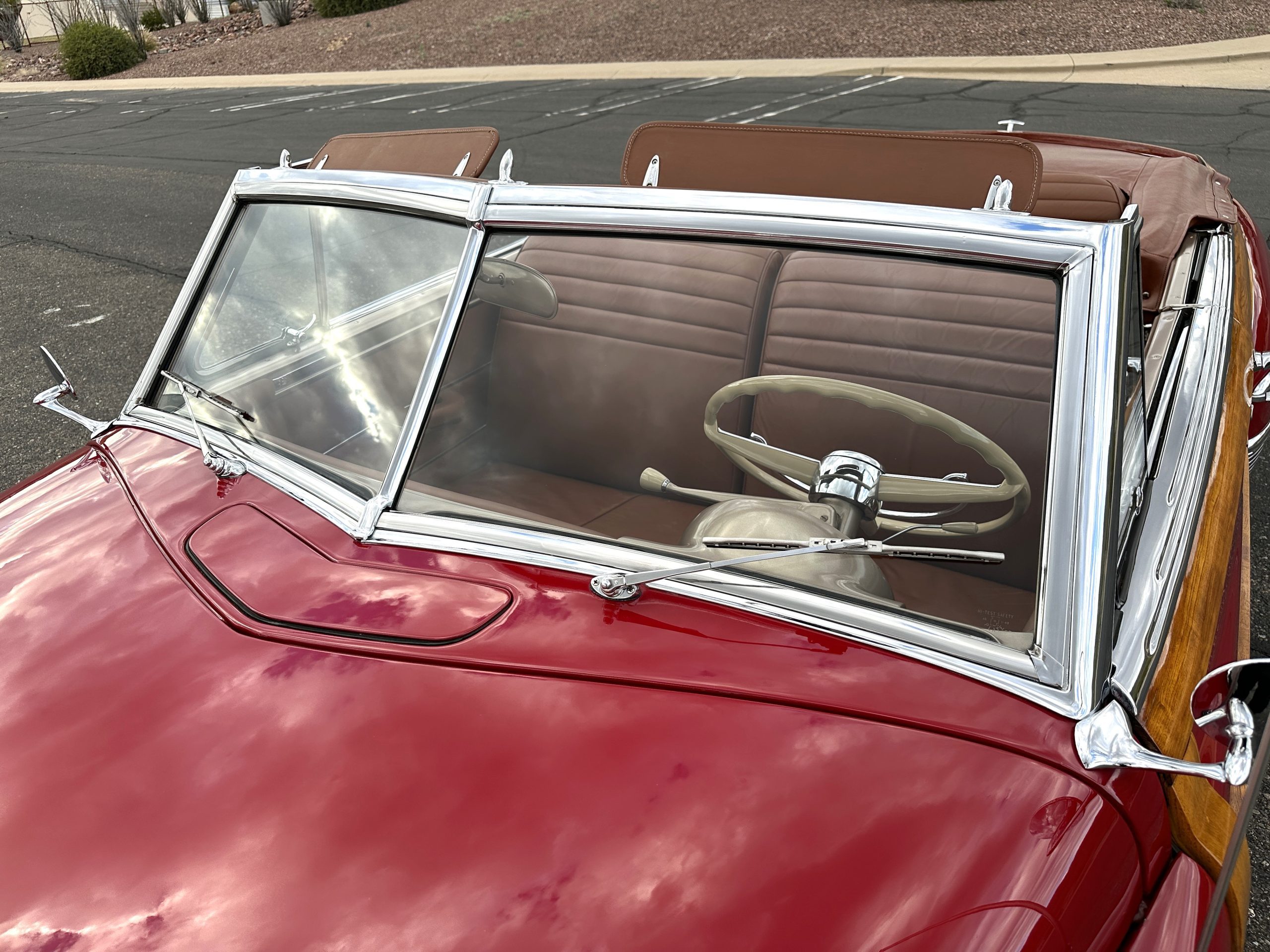 The exterior of this Chrysler is stunning. The Town and Country livery is the very rare Chrysler Pepper Red. This example is one of the only examples produced in Pepper Red, which makes her very desirable to collectors. Her paint and blonde ash framing on the exterior panels glisten and are in beautiful condition. All her finishes, including the chrome, are still in show quality condition. The tan canvas power convertible top is in excellent condition and shows very well. The power convertible top functions very well and her brown vinyl top boot is in excellent condition. Overall, the exterior is in excellent show condition.
