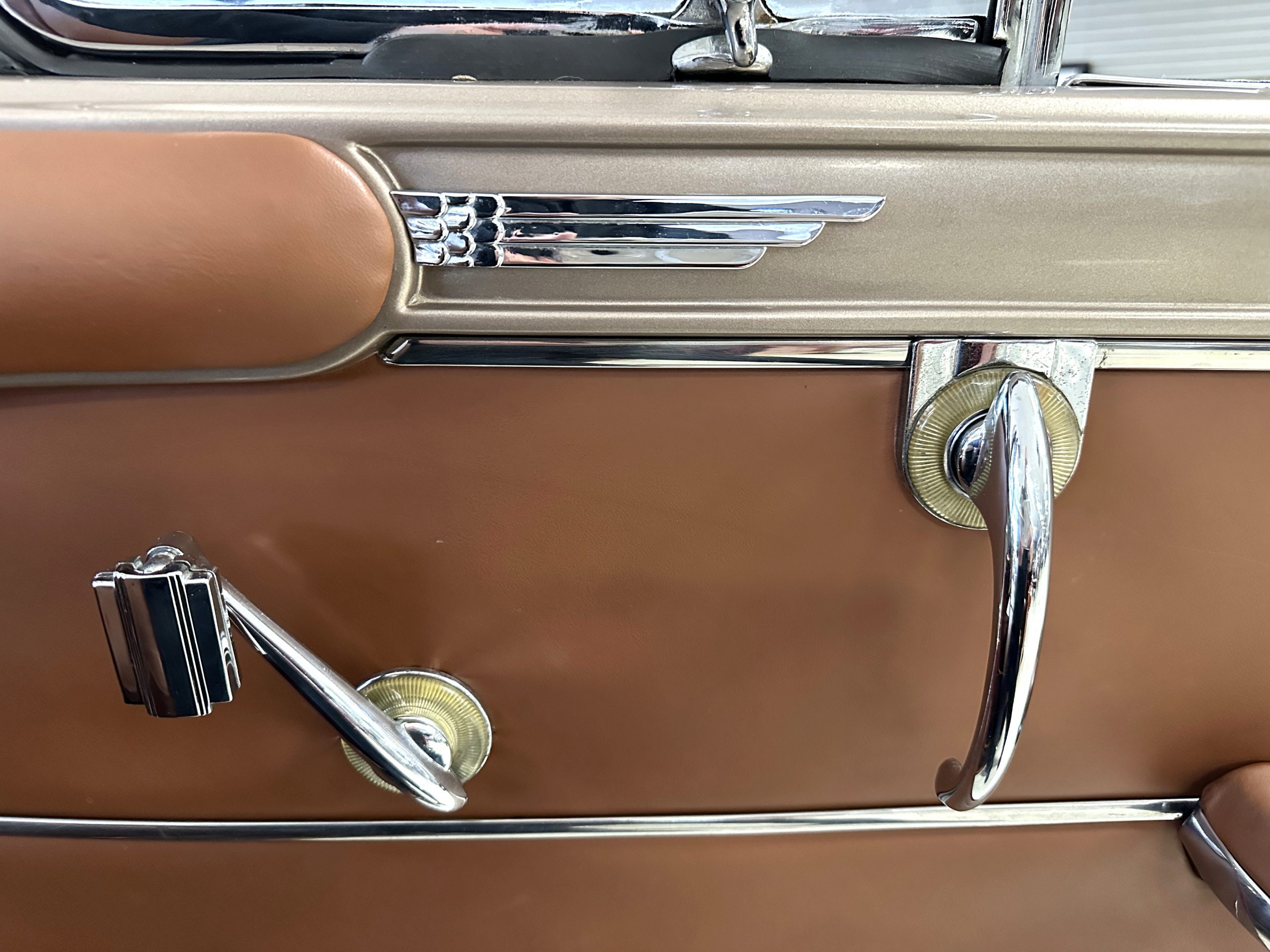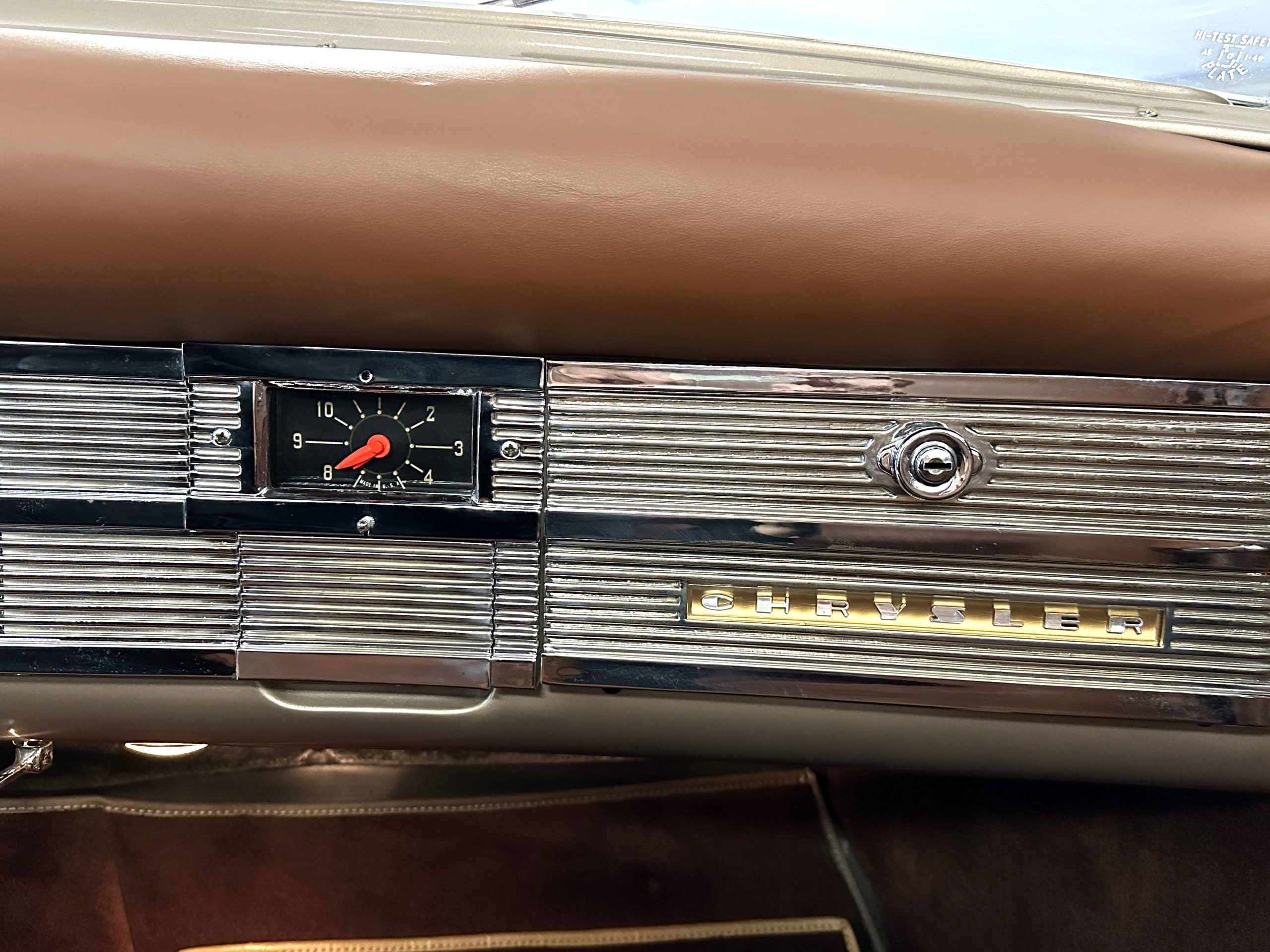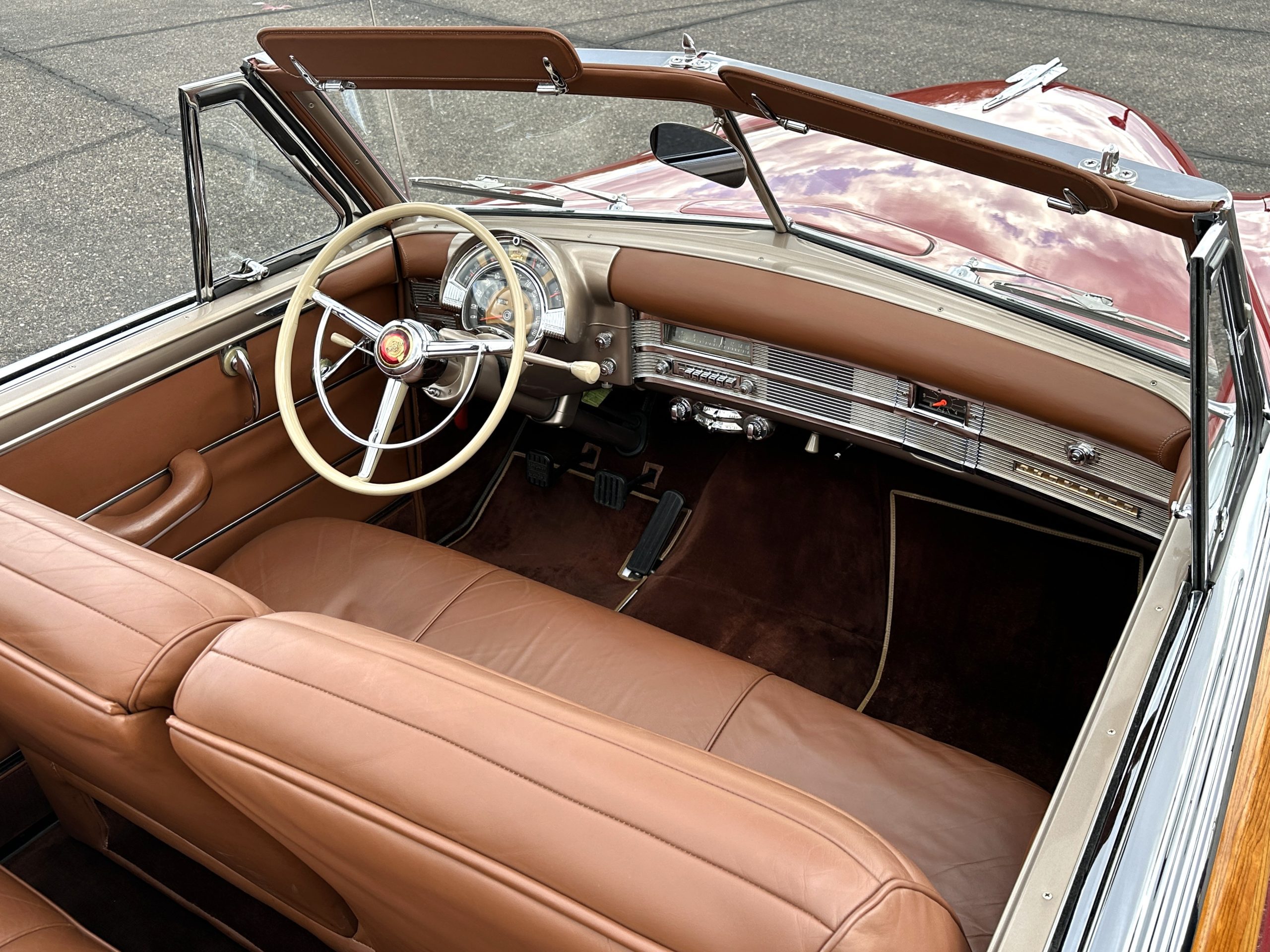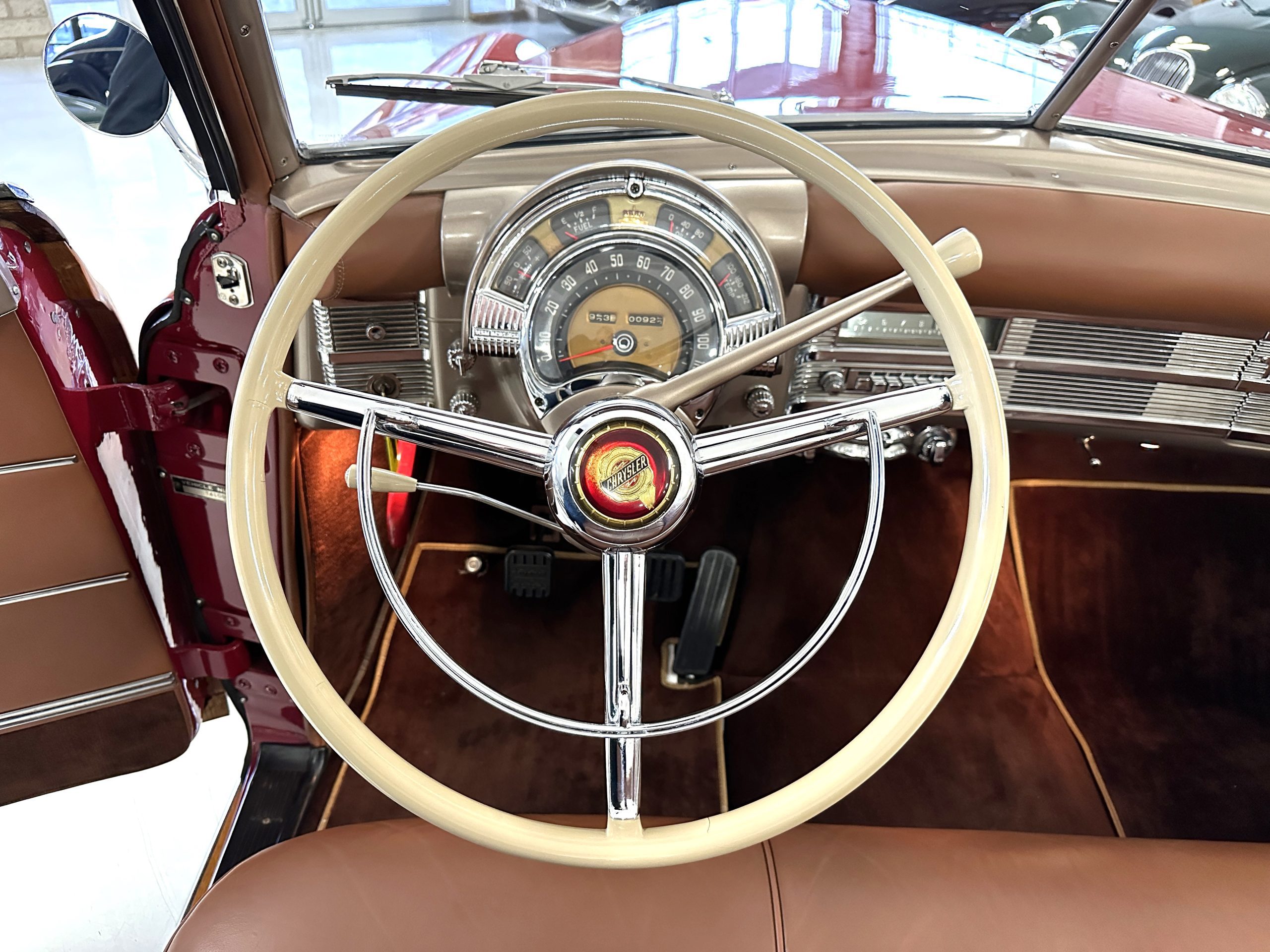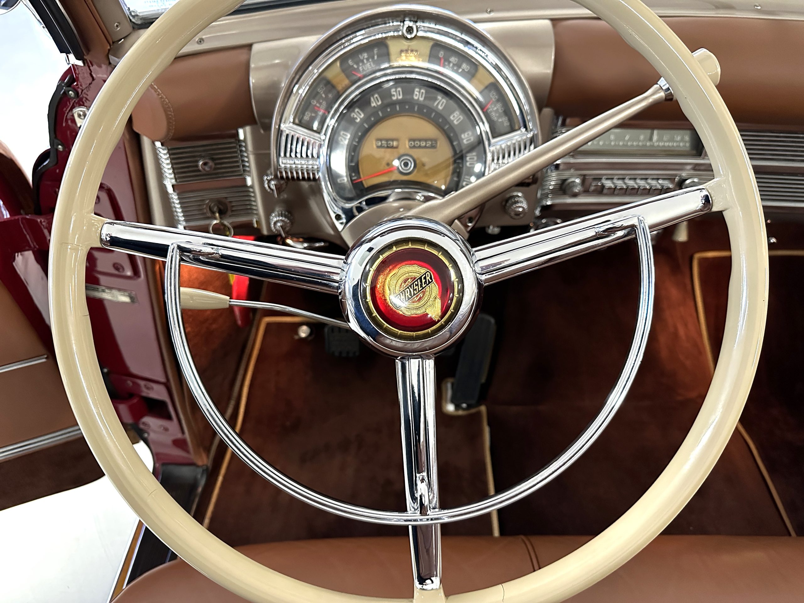 The interior is complete in Cognac Brown Leather and is complimented by beautiful brown carpeting. The leather is soft and supple, and the stunning interior shows near-new overall. The Cognac Brown leather dashboard appears as new. The Town and Country was the first production car to feature a “padded dash”. The steering wheel and gauges are all stunningly designed and in beautiful condition. The speedometer is non-functioning as is the clock, but overall, the interior is in near-new condition. We are hoping to repair the speedometer.