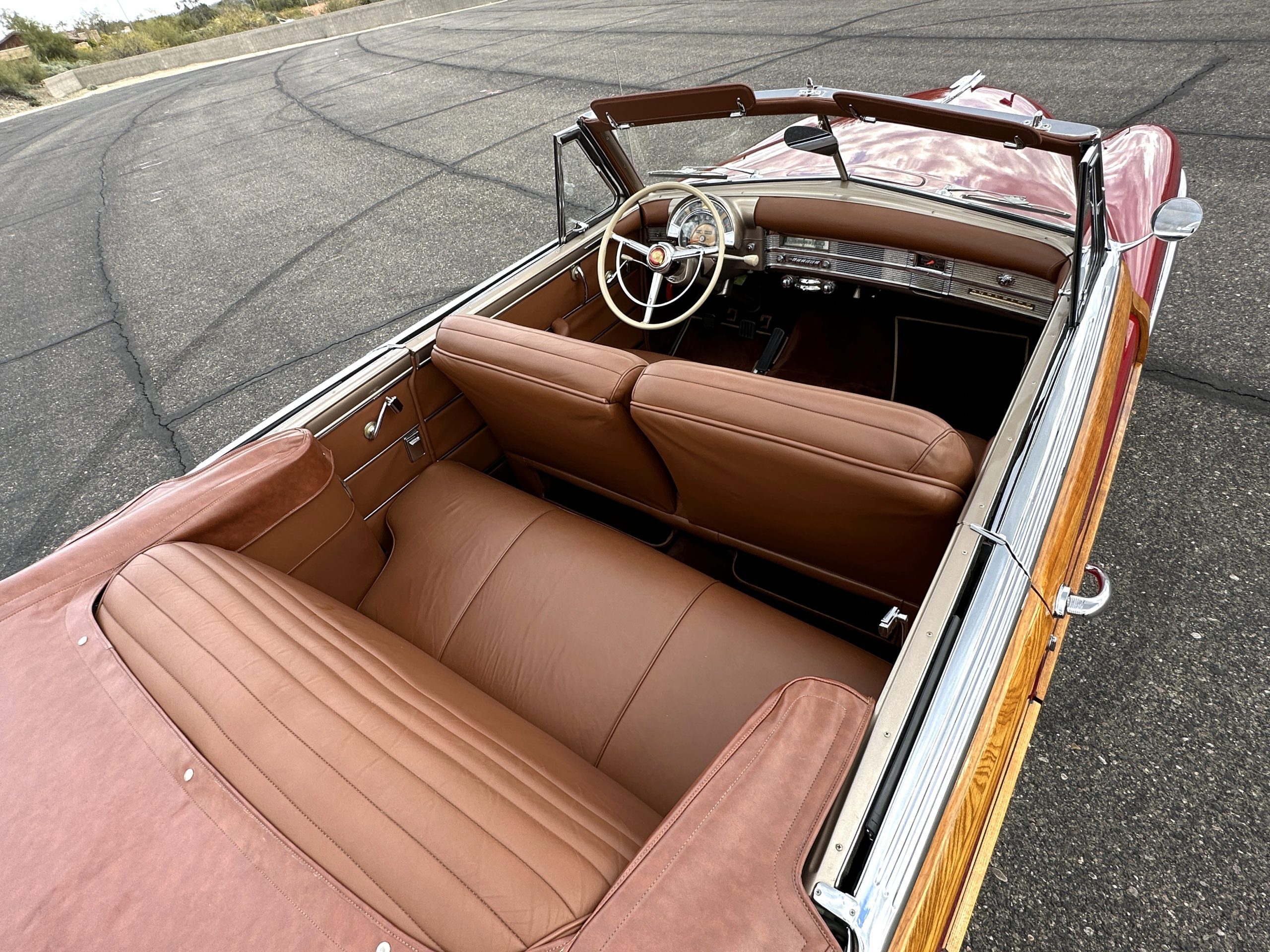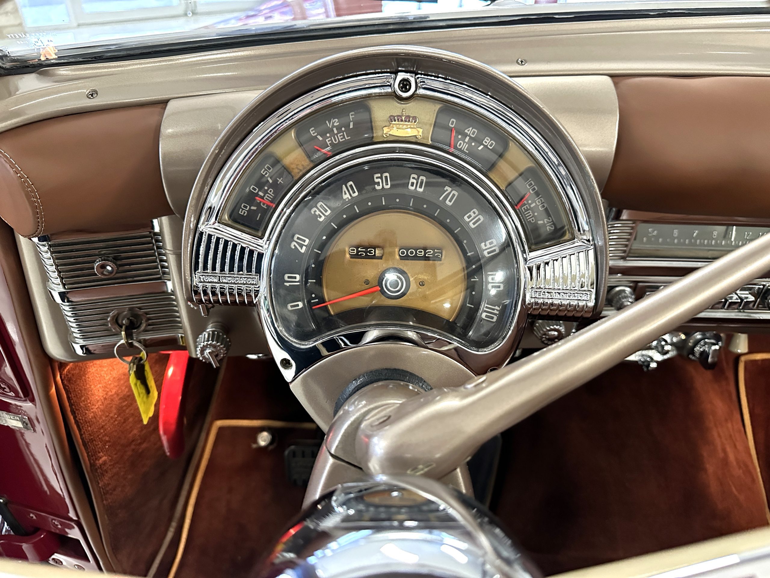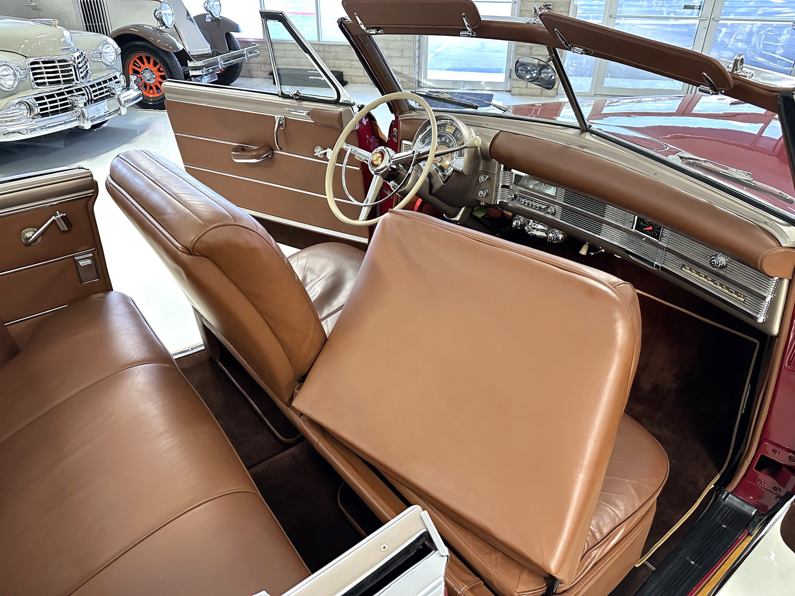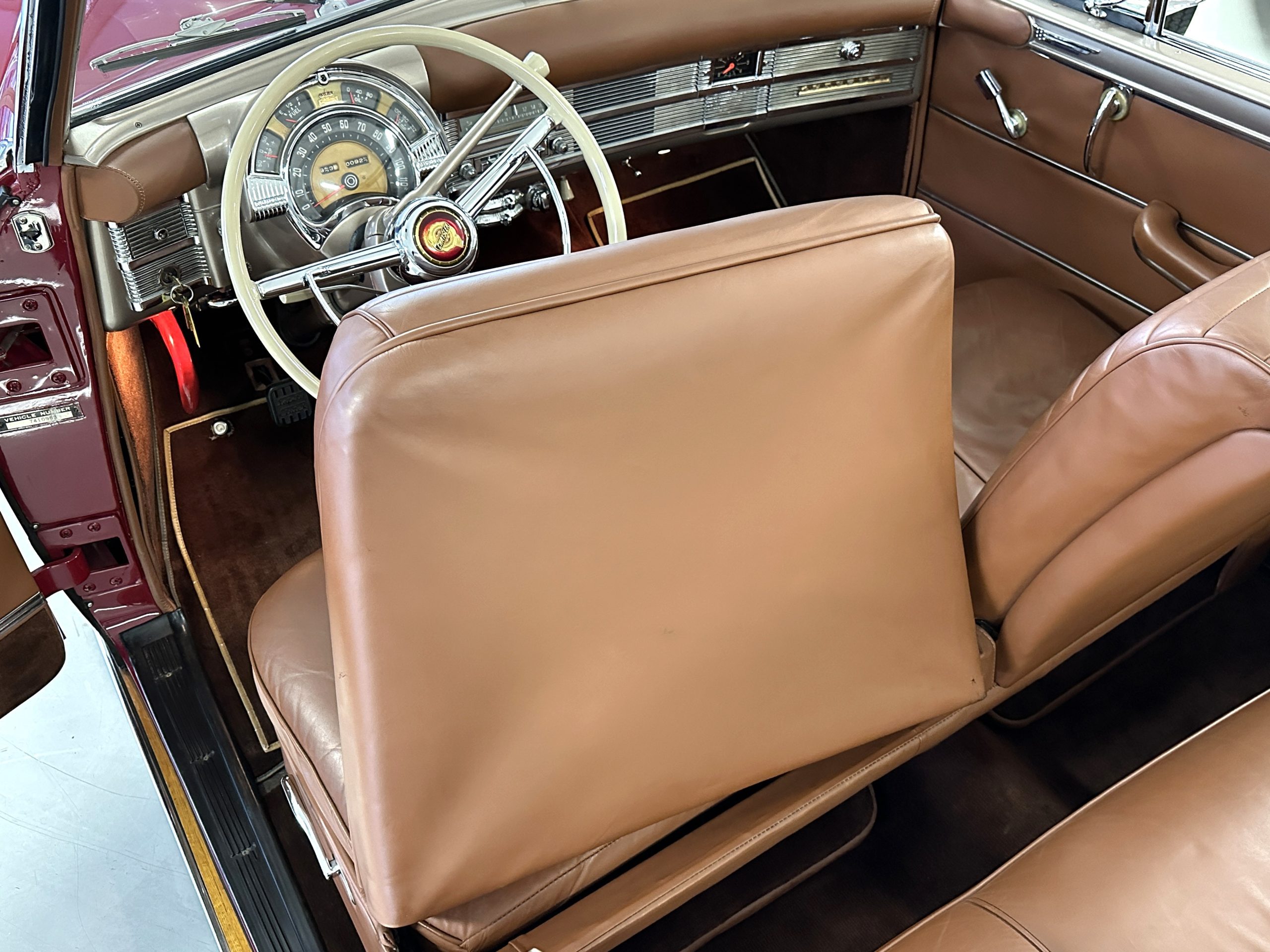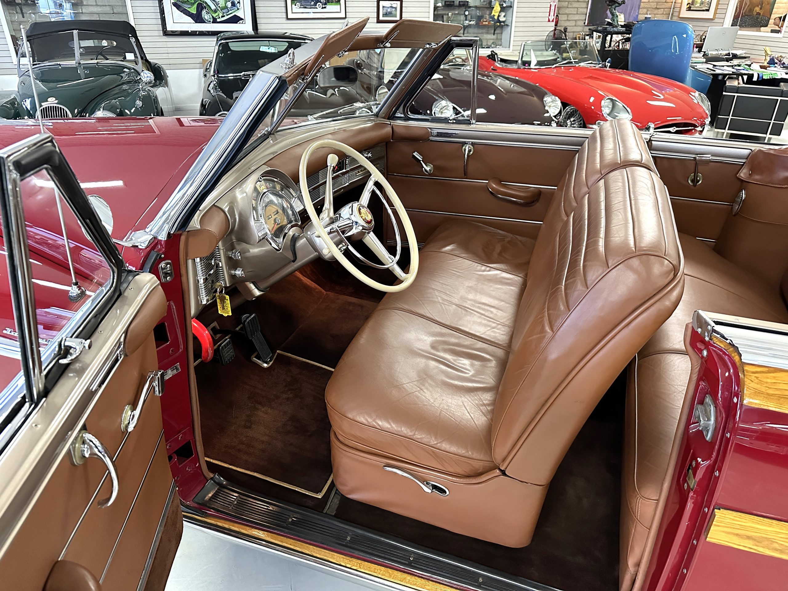 The interior is complete in Cognac Brown Leather and is complimented by beautiful brown carpeting. The leather is soft and supple, and the stunning interior shows near-new overall. The Cognac Brown leather dashboard appears as new. The Town and Country was the first production car to feature a “padded dash”. The steering wheel and gauges are all stunningly designed and in beautiful condition. The speedometer is non-functioning as is the clock, but overall, the interior is in near-new condition. We are hoping to repair the speedometer.