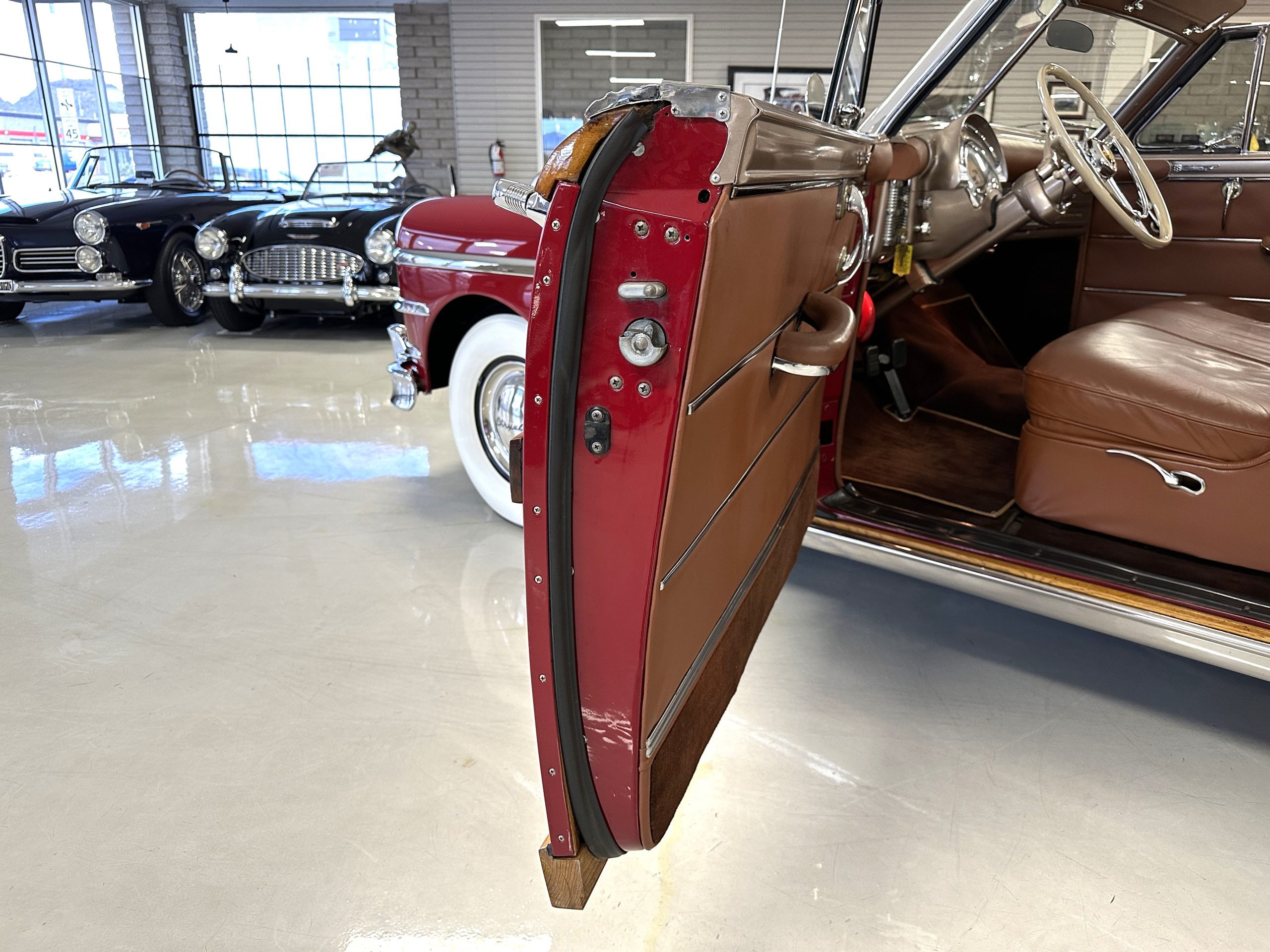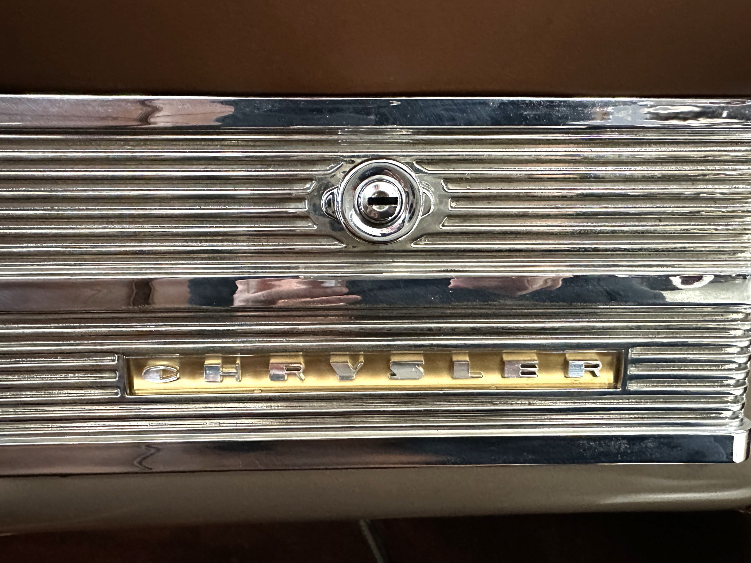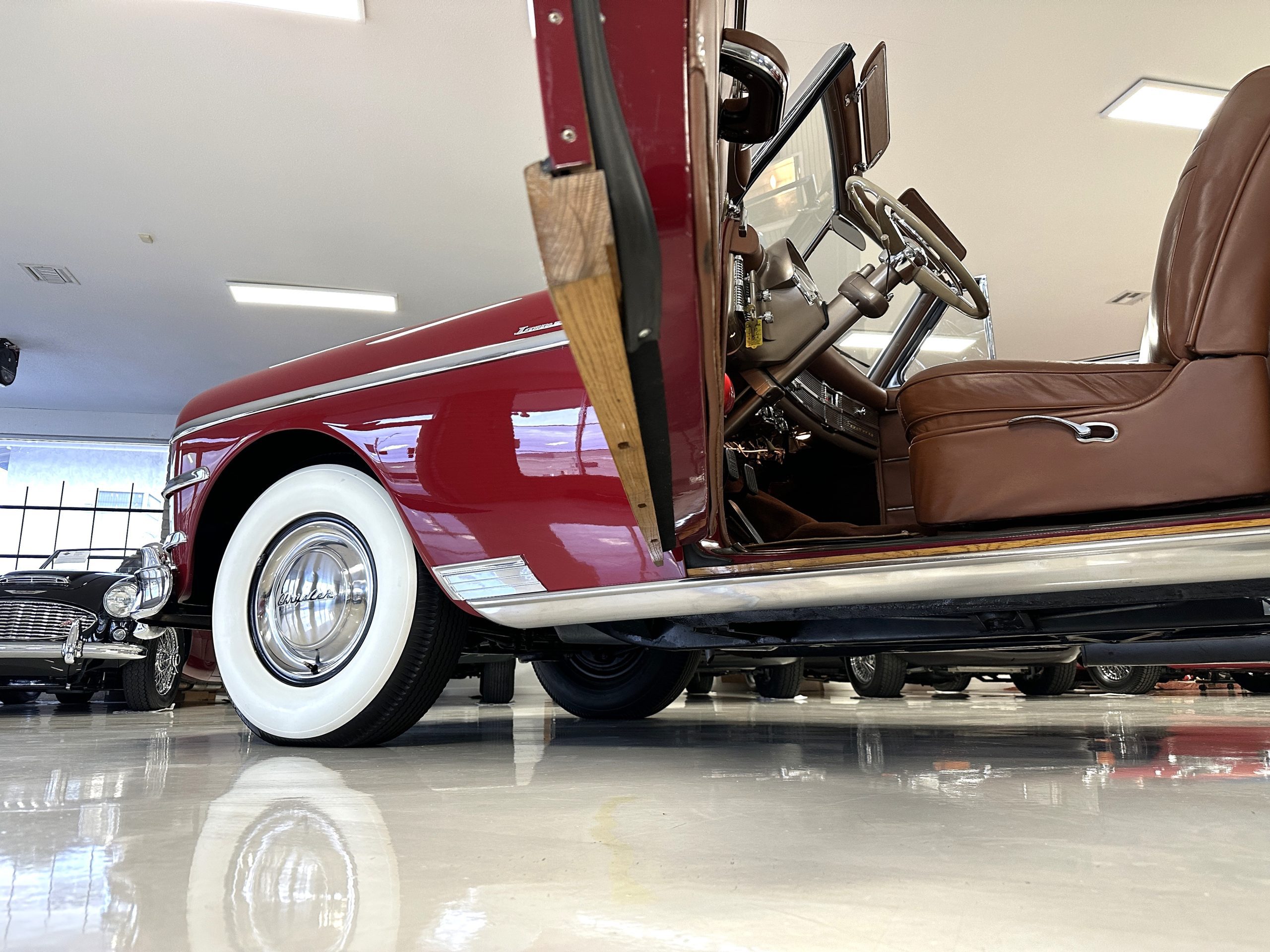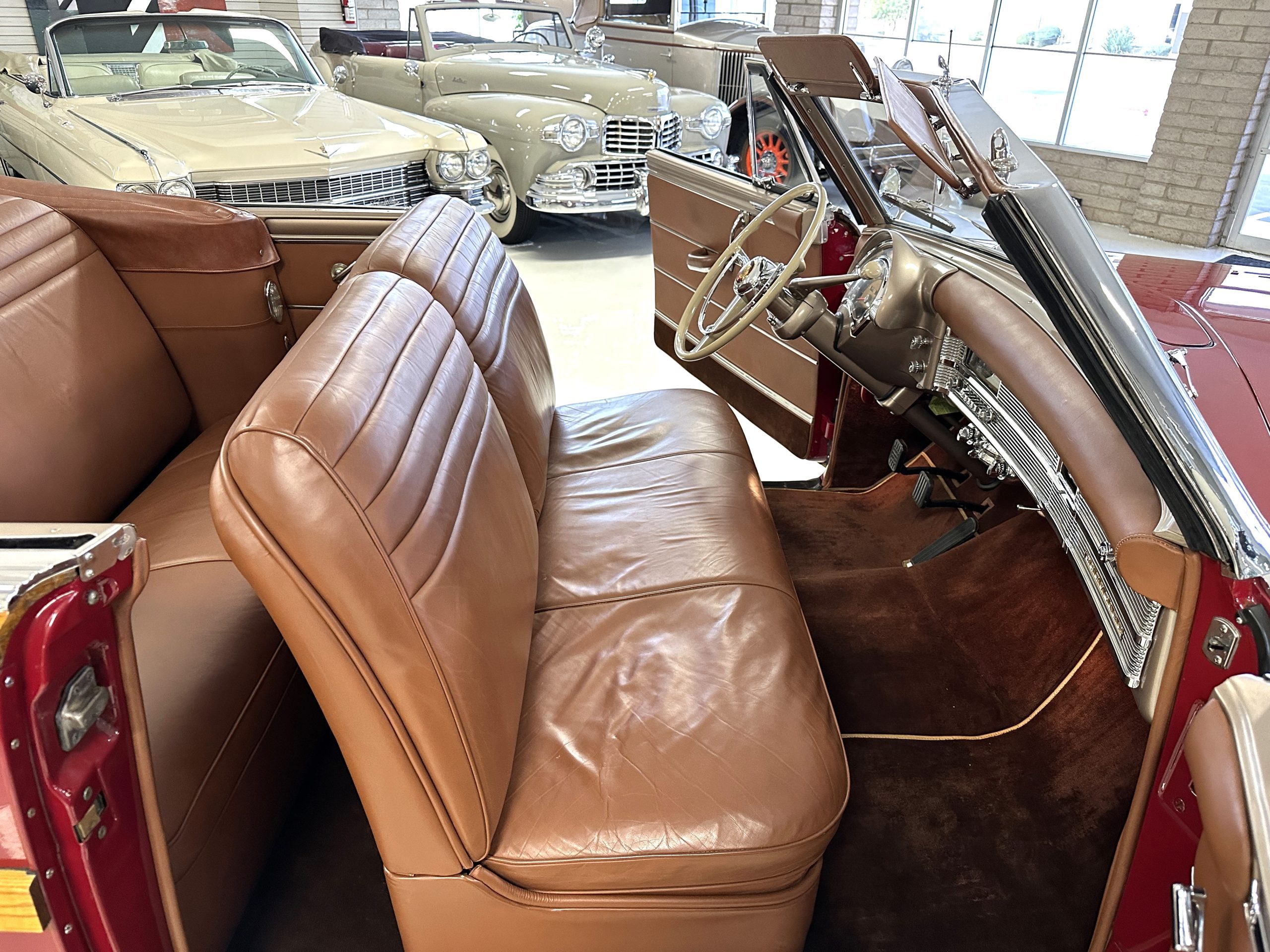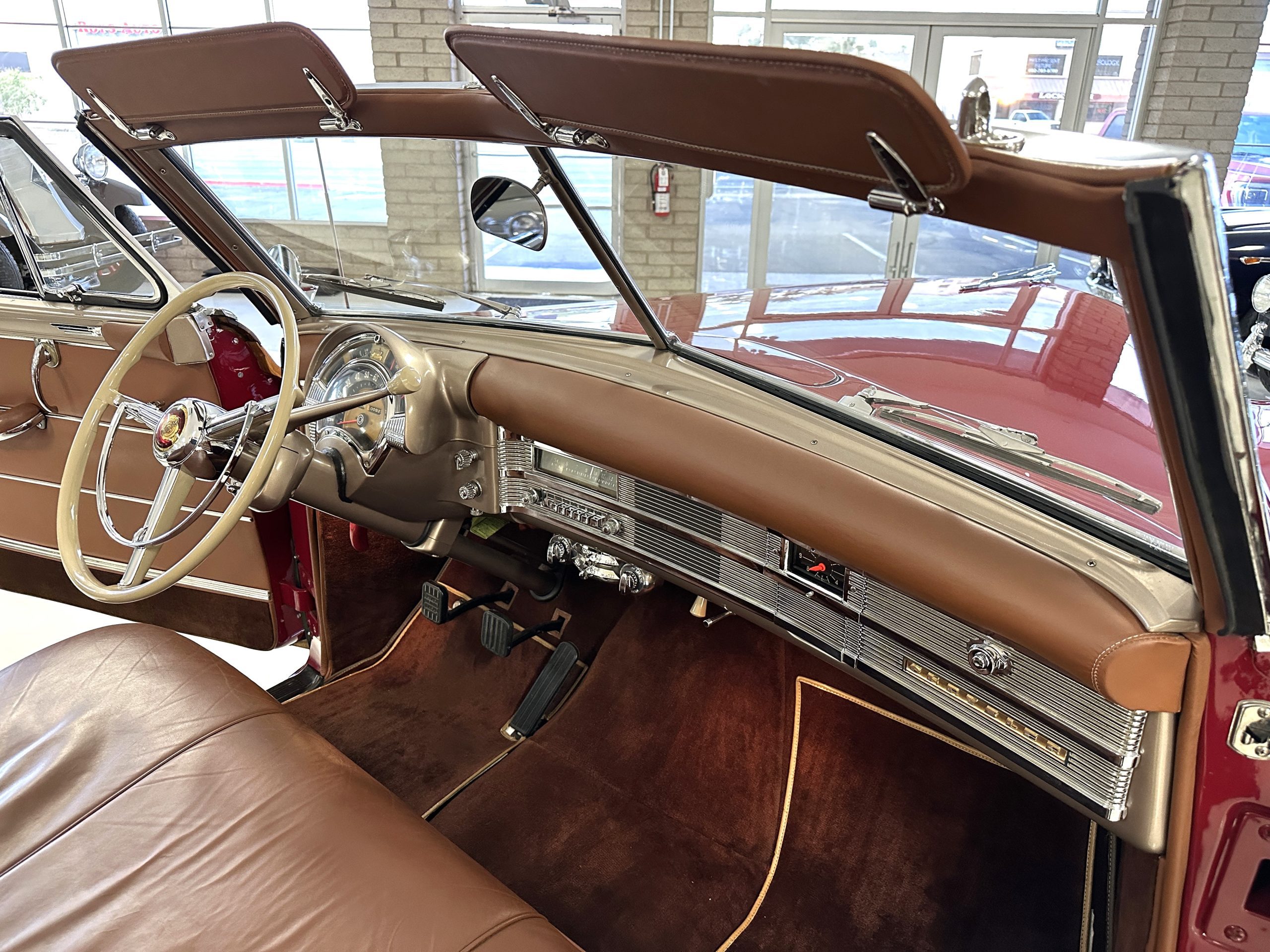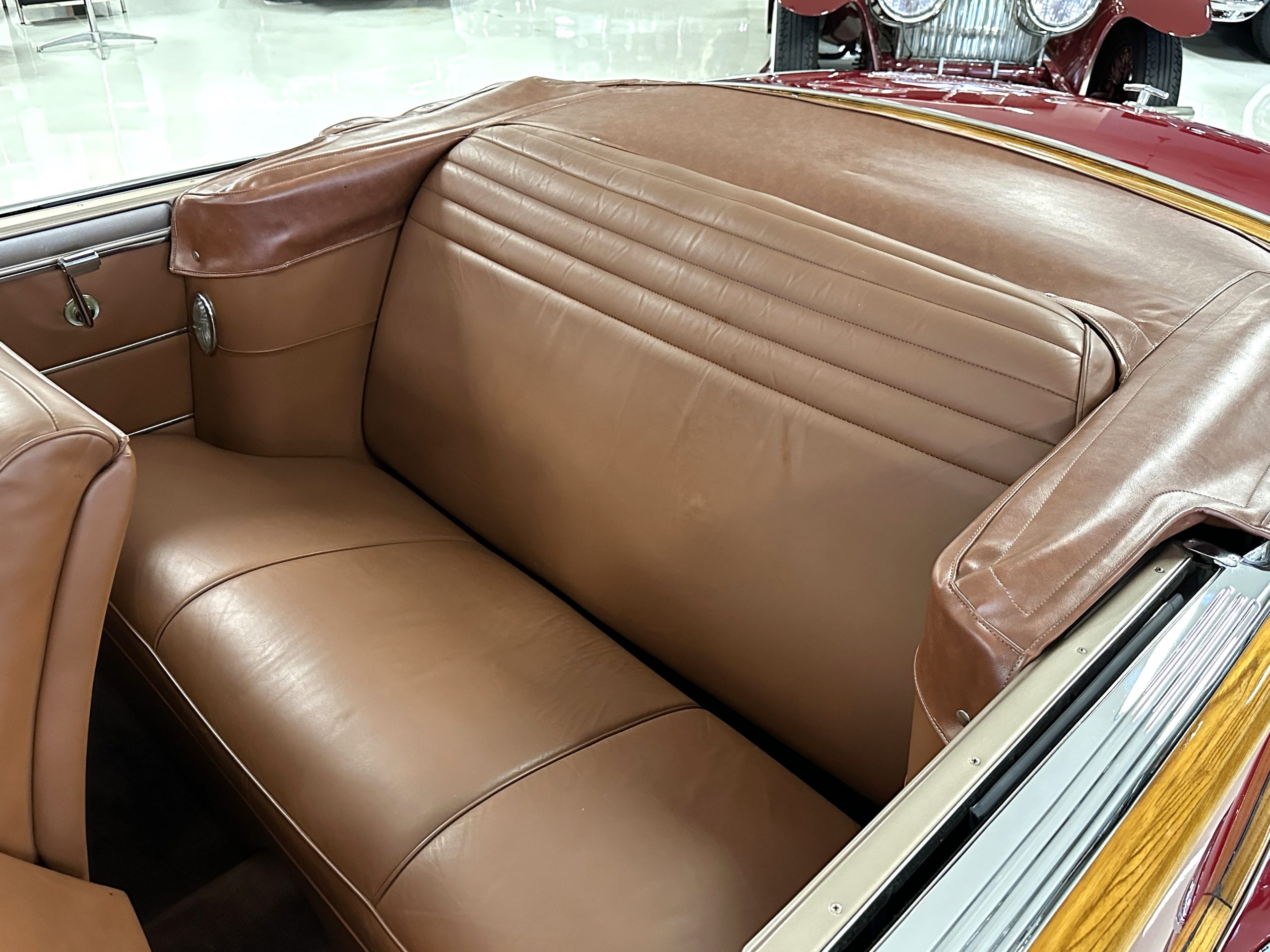 The interior is complete in Cognac Brown Leather and is complimented by beautiful brown carpeting. The leather is soft and supple, and the stunning interior shows near-new overall. The Cognac Brown leather dashboard appears as new. The Town and Country was the first production car to feature a “padded dash”. The steering wheel and gauges are all stunningly designed and in beautiful condition. The speedometer is non-functioning as is the clock, but overall, the interior is in near-new condition. We are hoping to repair the speedometer.