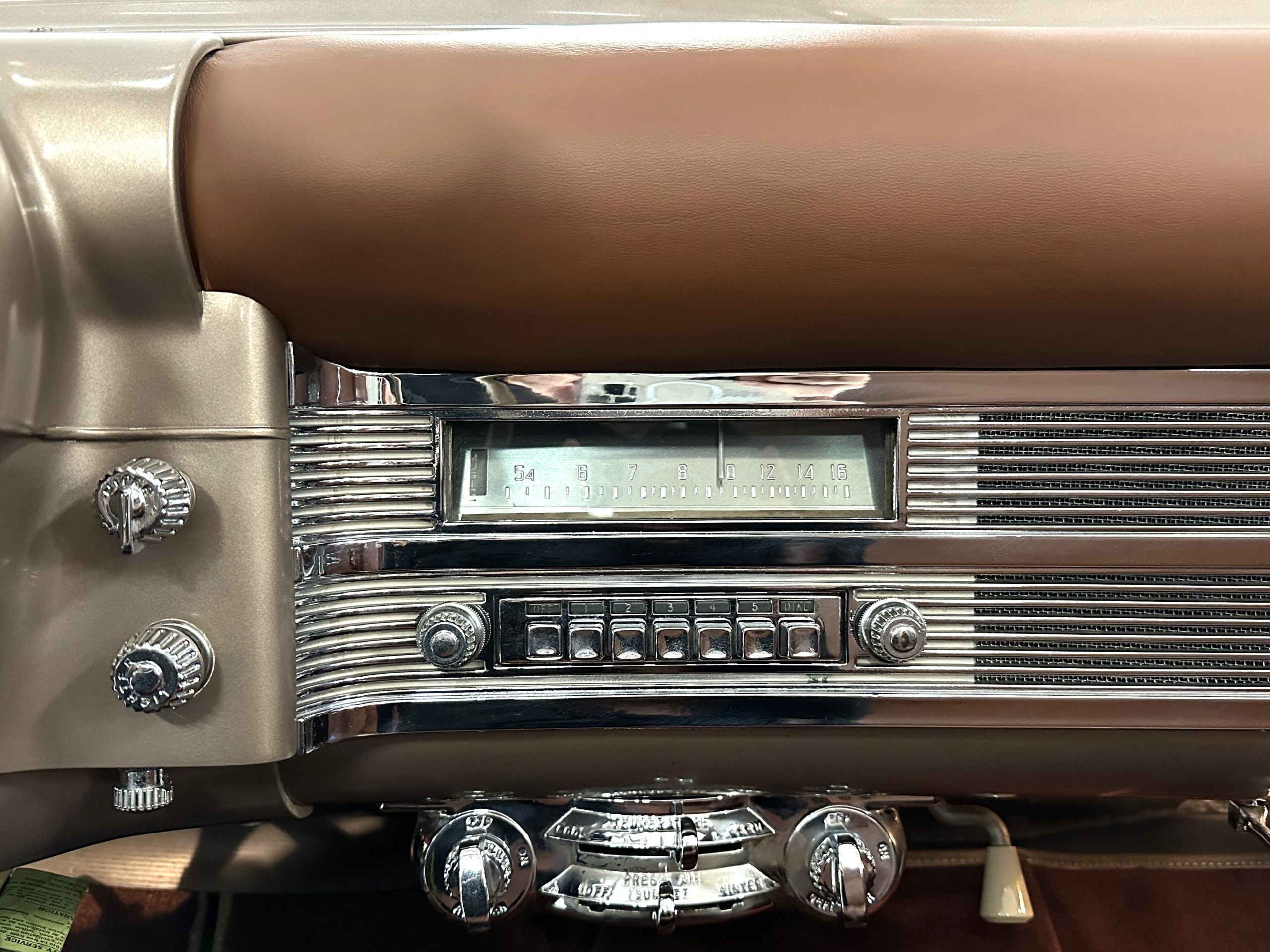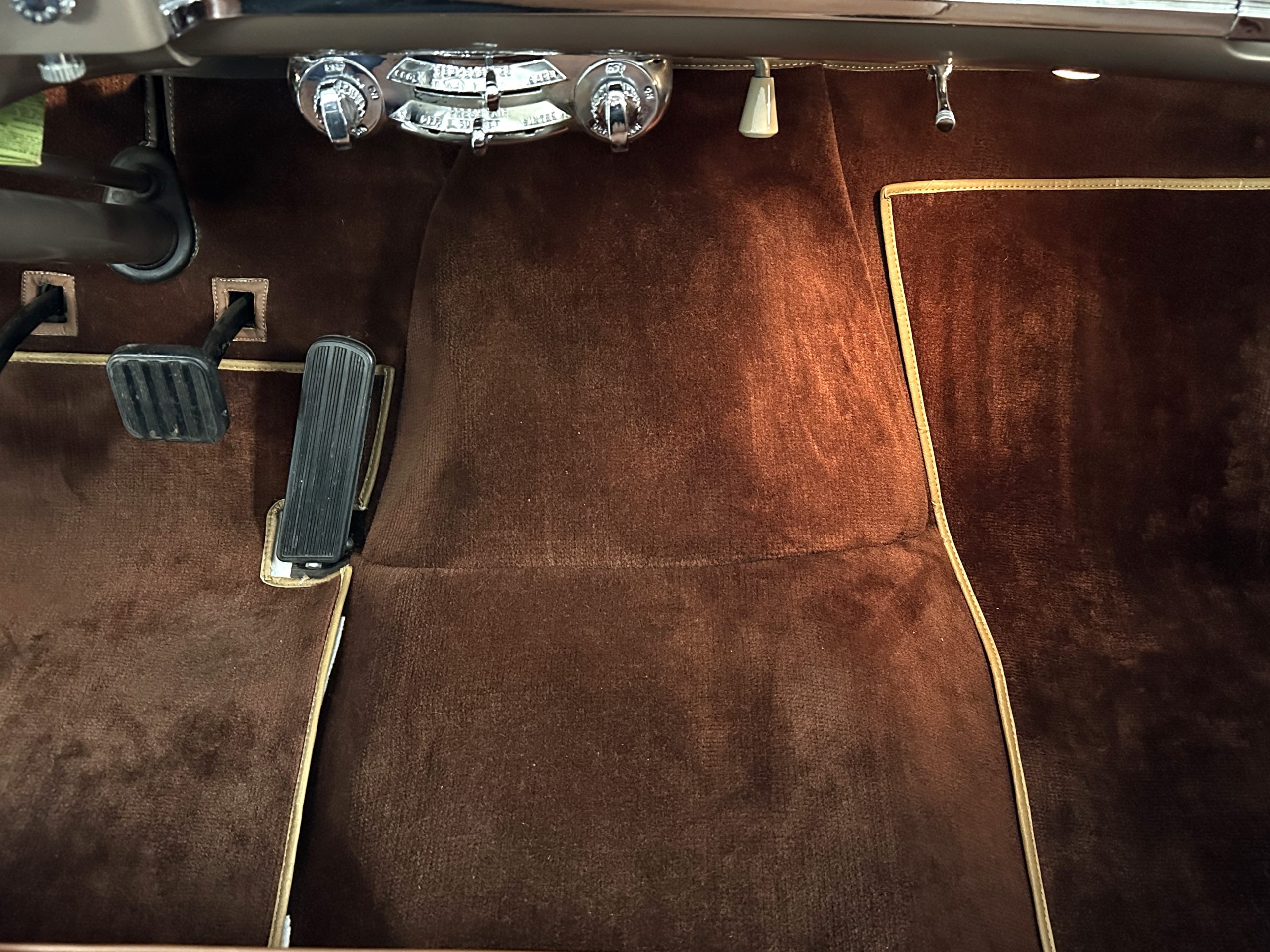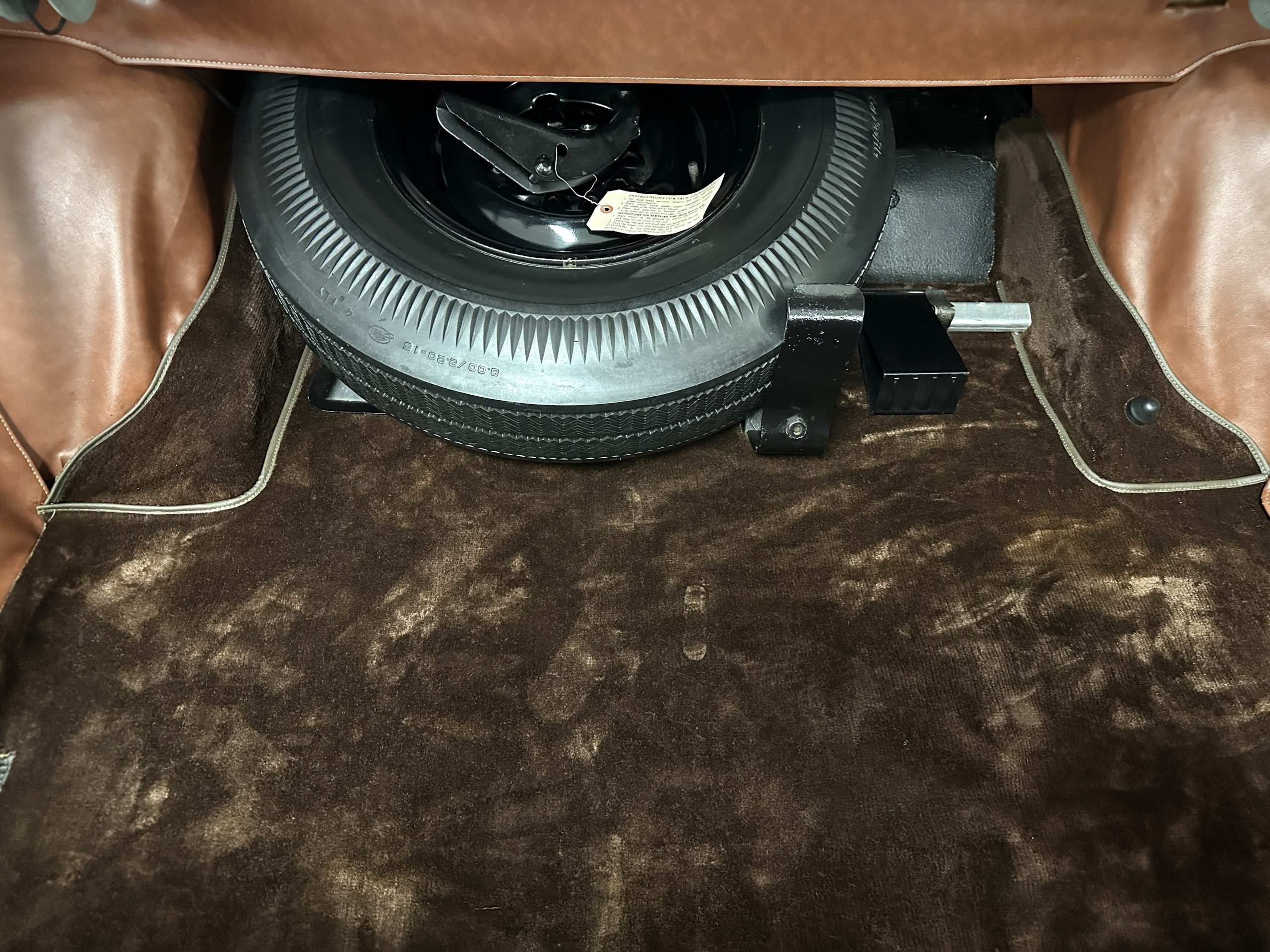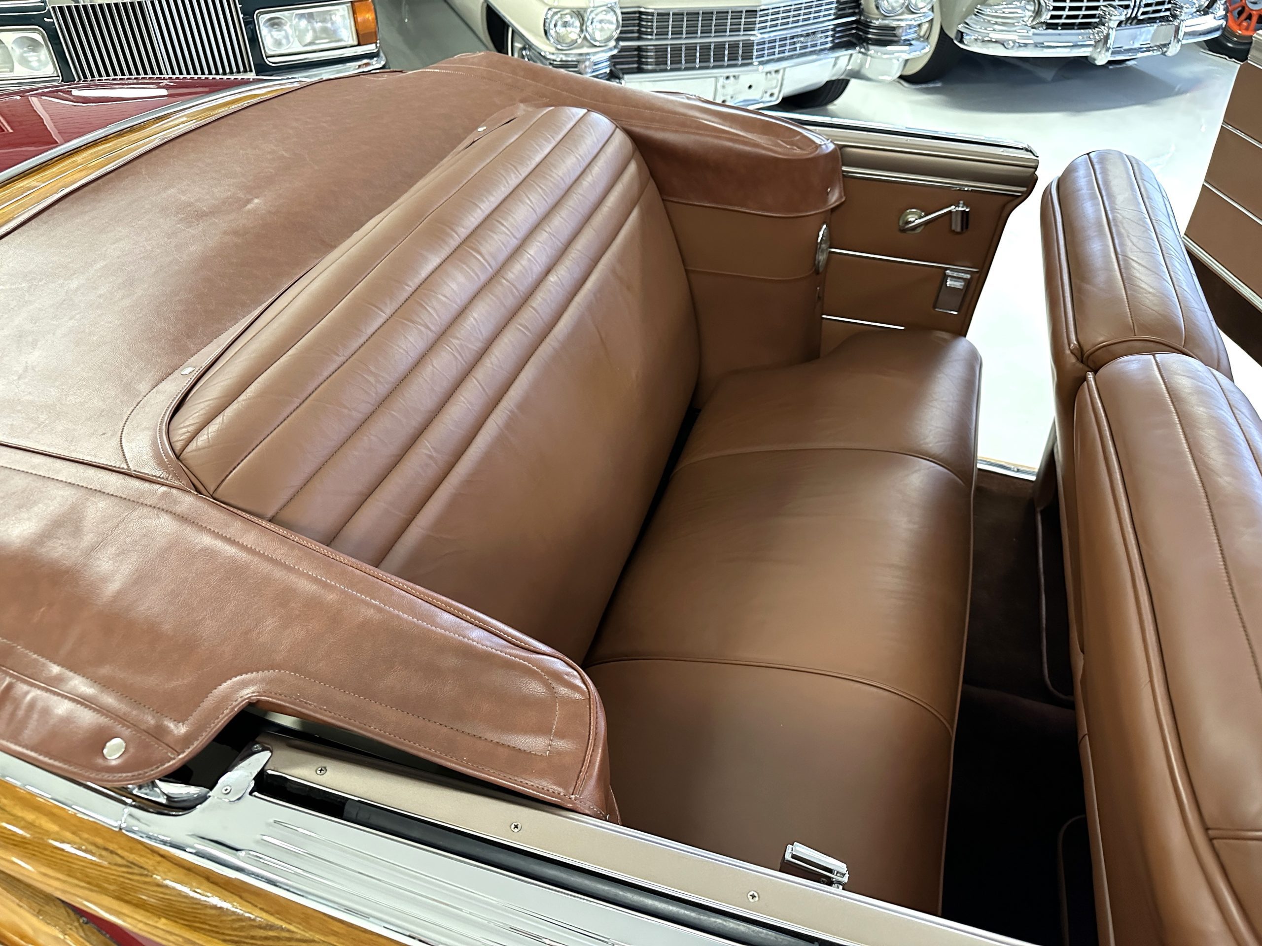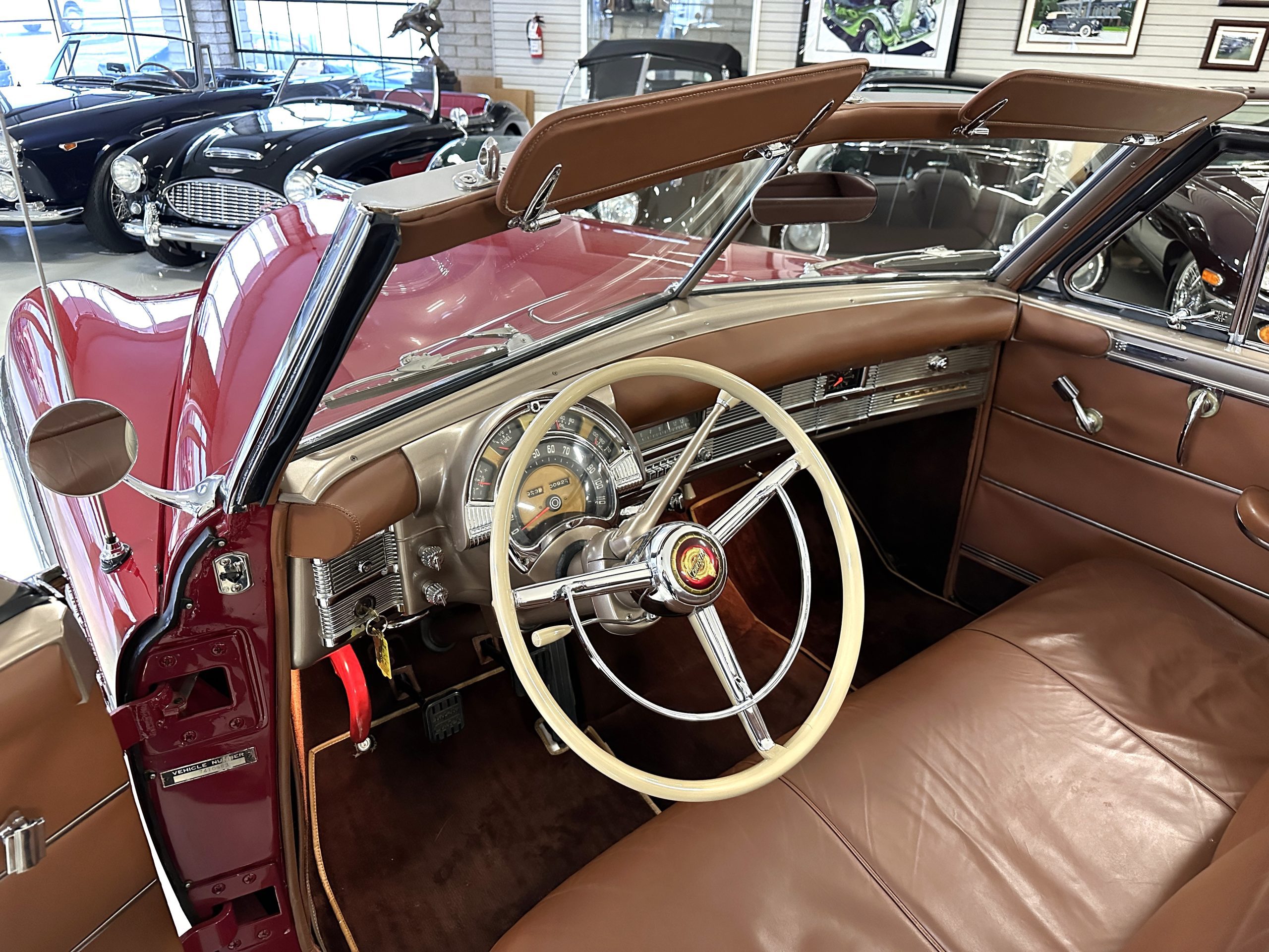 The interior is complete in Cognac Brown Leather and is complimented by beautiful brown carpeting. The leather is soft and supple, and the stunning interior shows near-new overall. The Cognac Brown leather dashboard appears as new. The Town and Country was the first production car to feature a “padded dash”. The steering wheel and gauges are all stunningly designed and in beautiful condition. The speedometer is non-functioning as is the clock, but overall, the interior is in near-new condition. We are hoping to repair the speedometer.